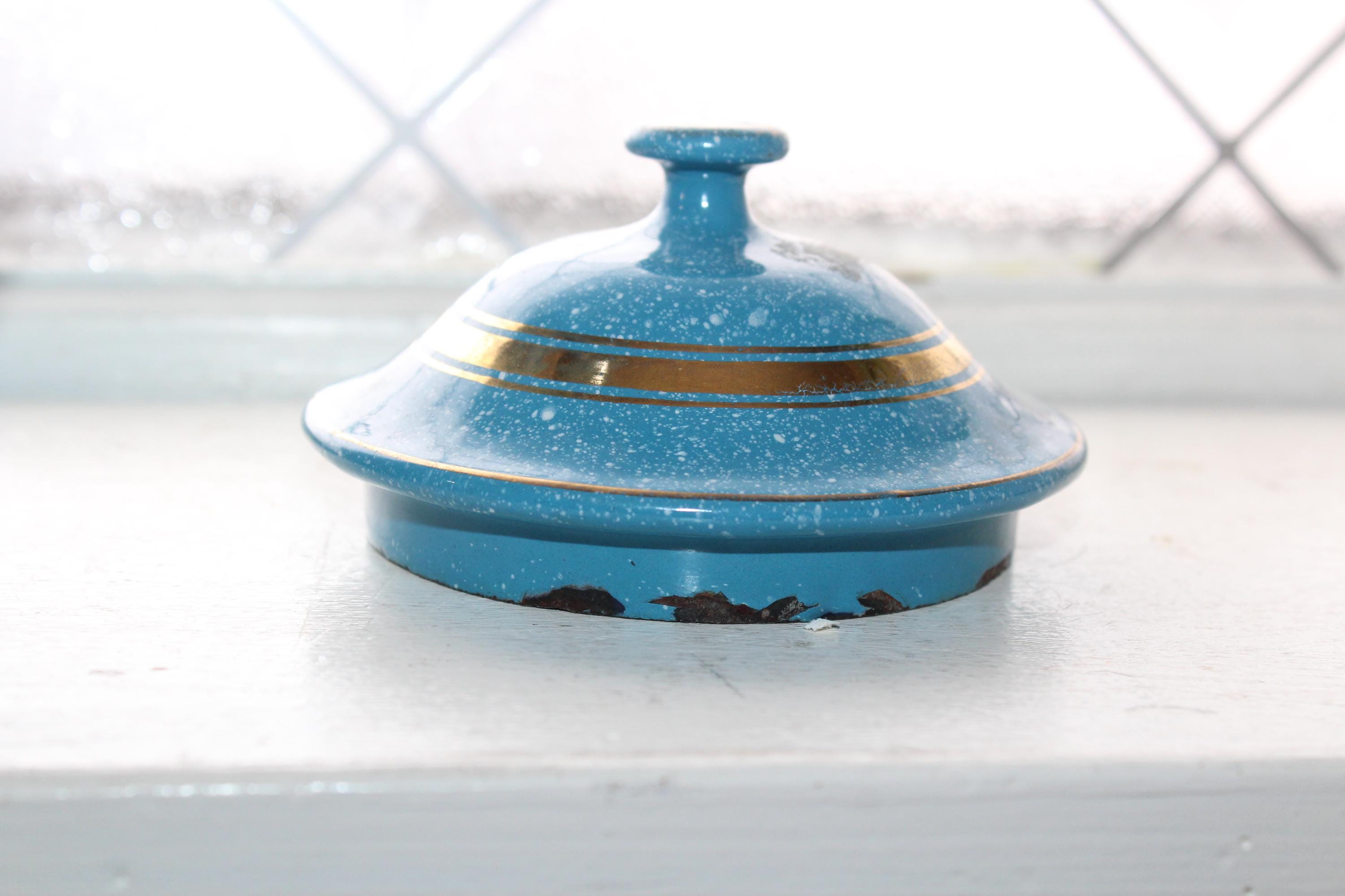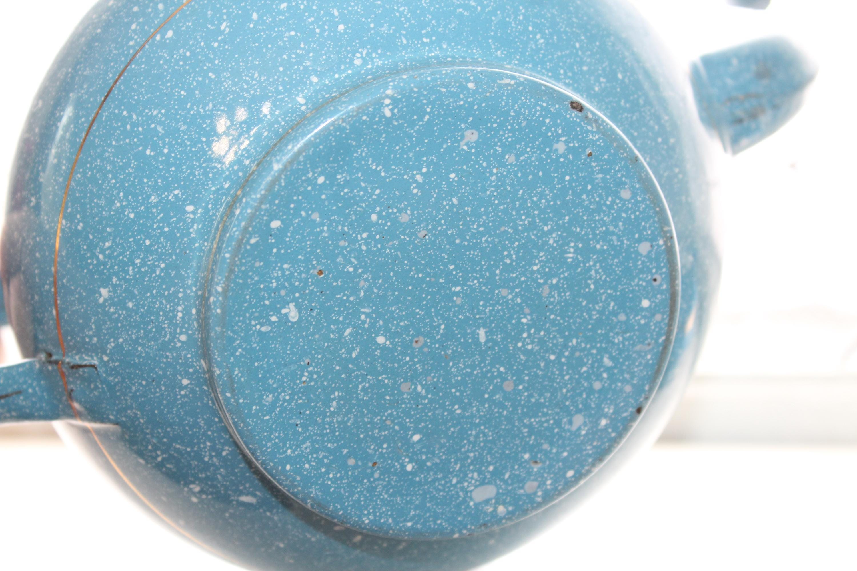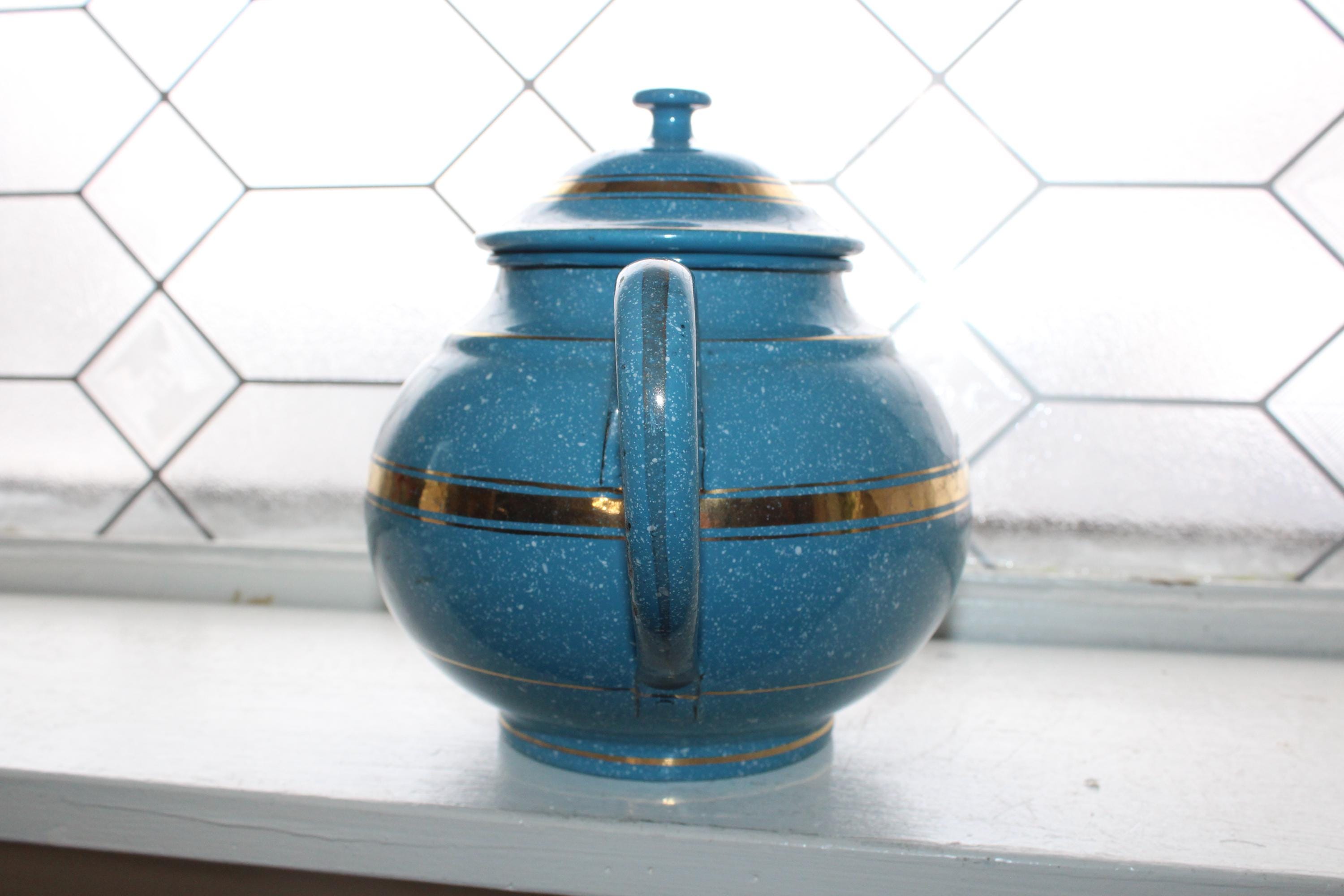 Antique robin's egg blue speckled enamelware metal teapot with gold trim, great for display in a country kitchen. This little charmer measures 10" from handle to spout and 7" high. It has some wear as shown in the photos but displays very well. Enjoy!