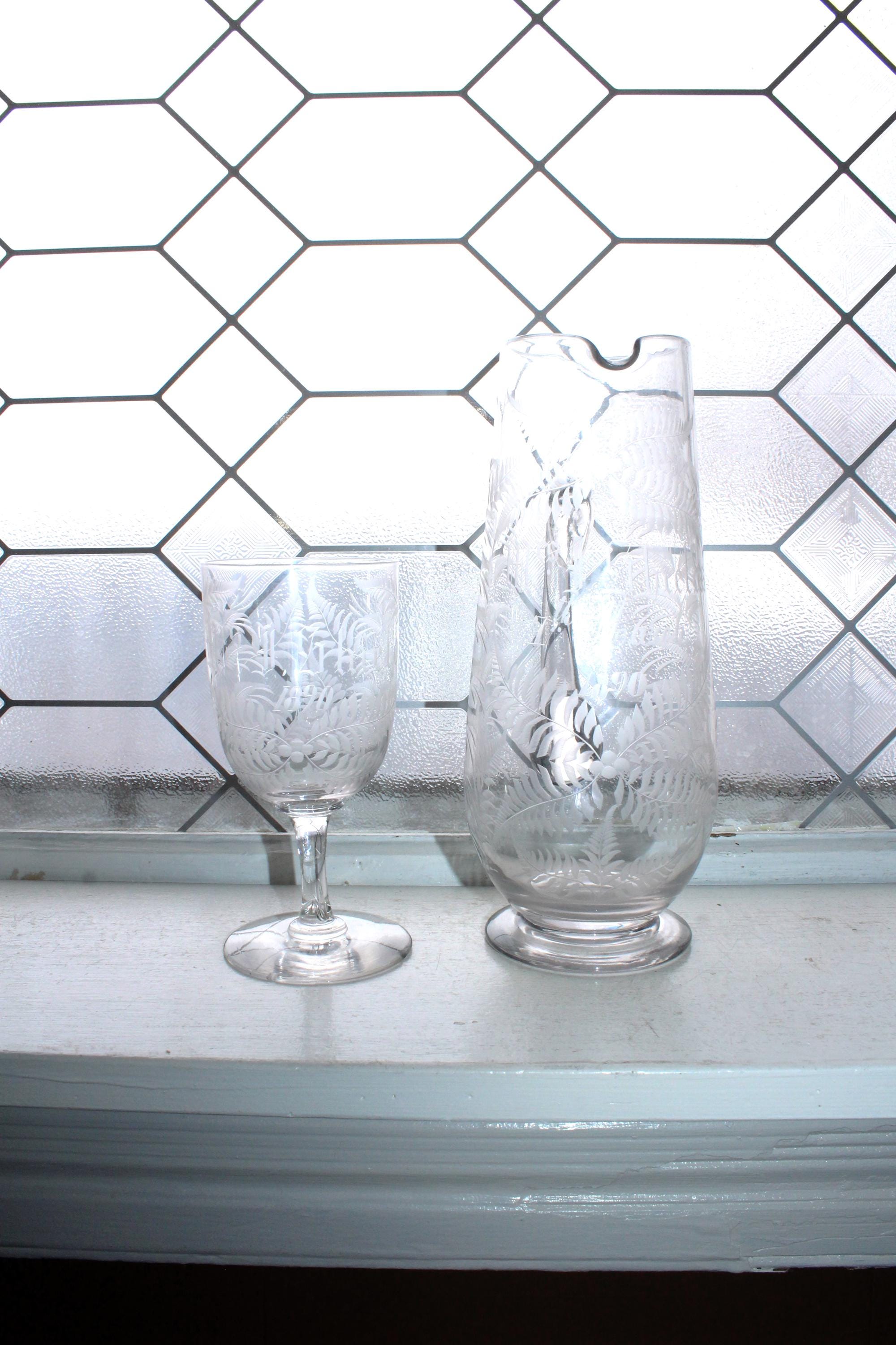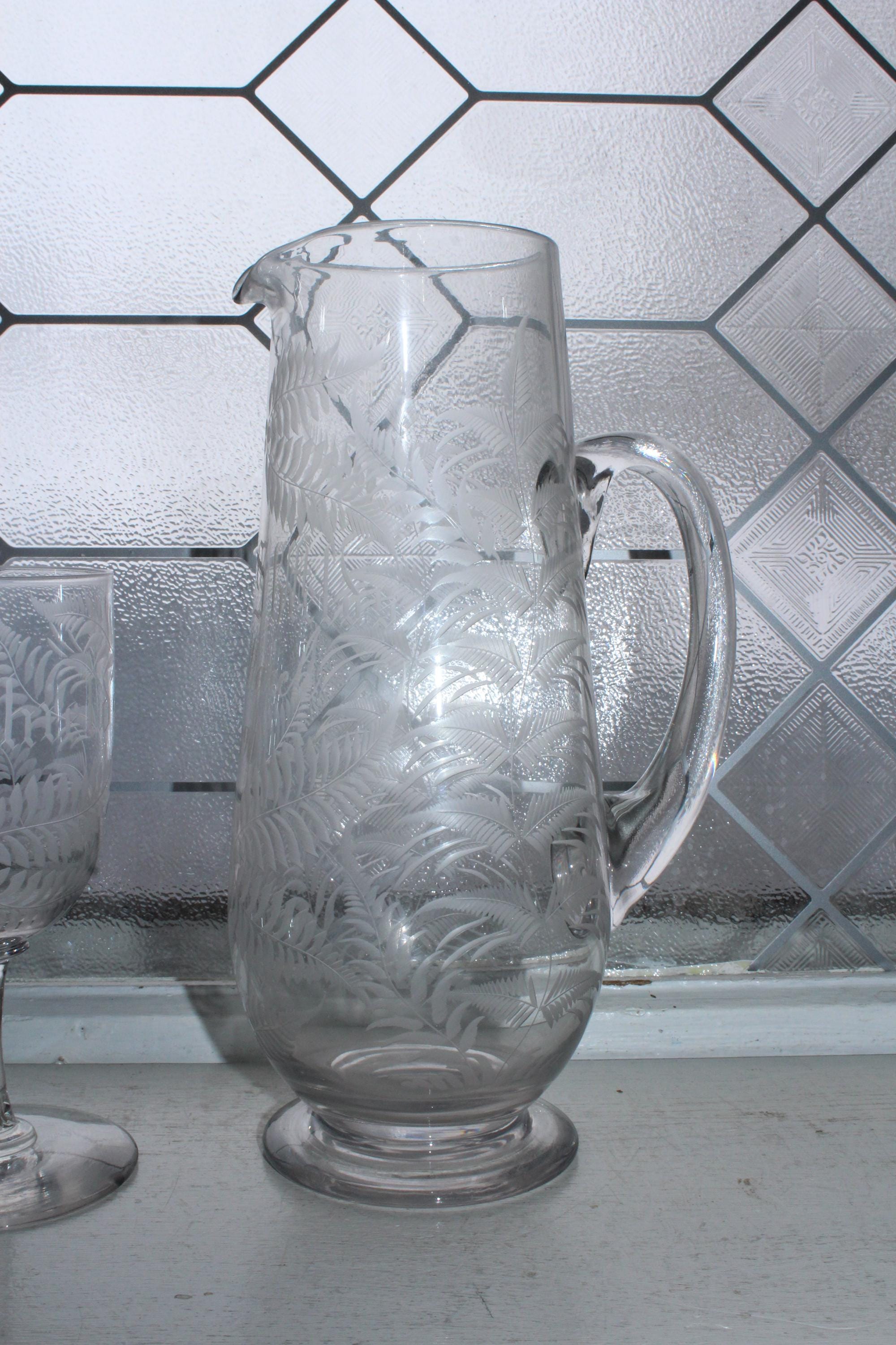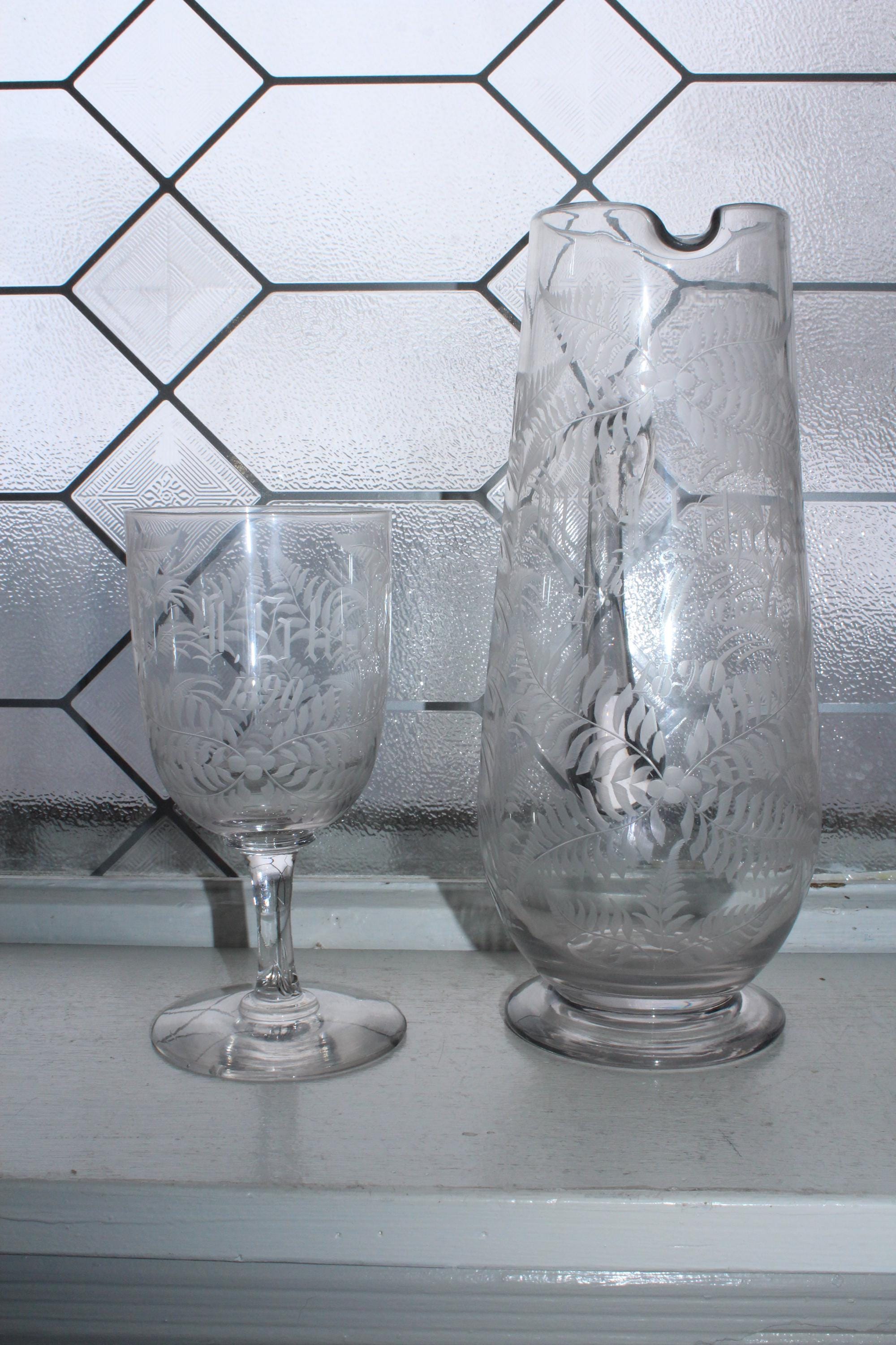 This is an antique one of a kind Victorian engraved clear glass water jug and a matching goblet. It reads "Mrs. F Shields 7th March, 1890" with intricate ferns and is just wonderful! The pitcher is 9" high. No chips or cracks in the pitcher but the goblet does have some base rim chips. It displays very well. Enjoy!