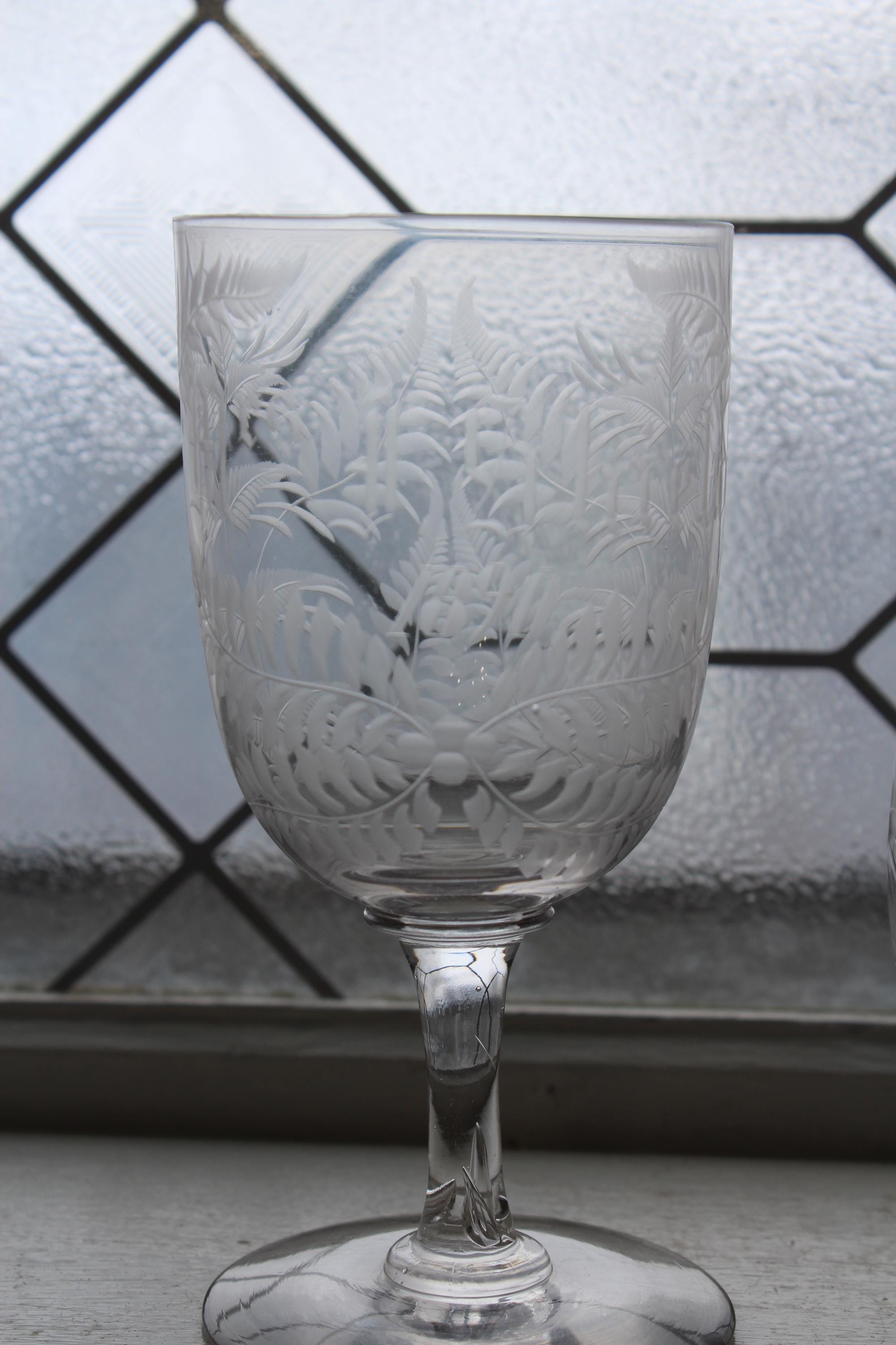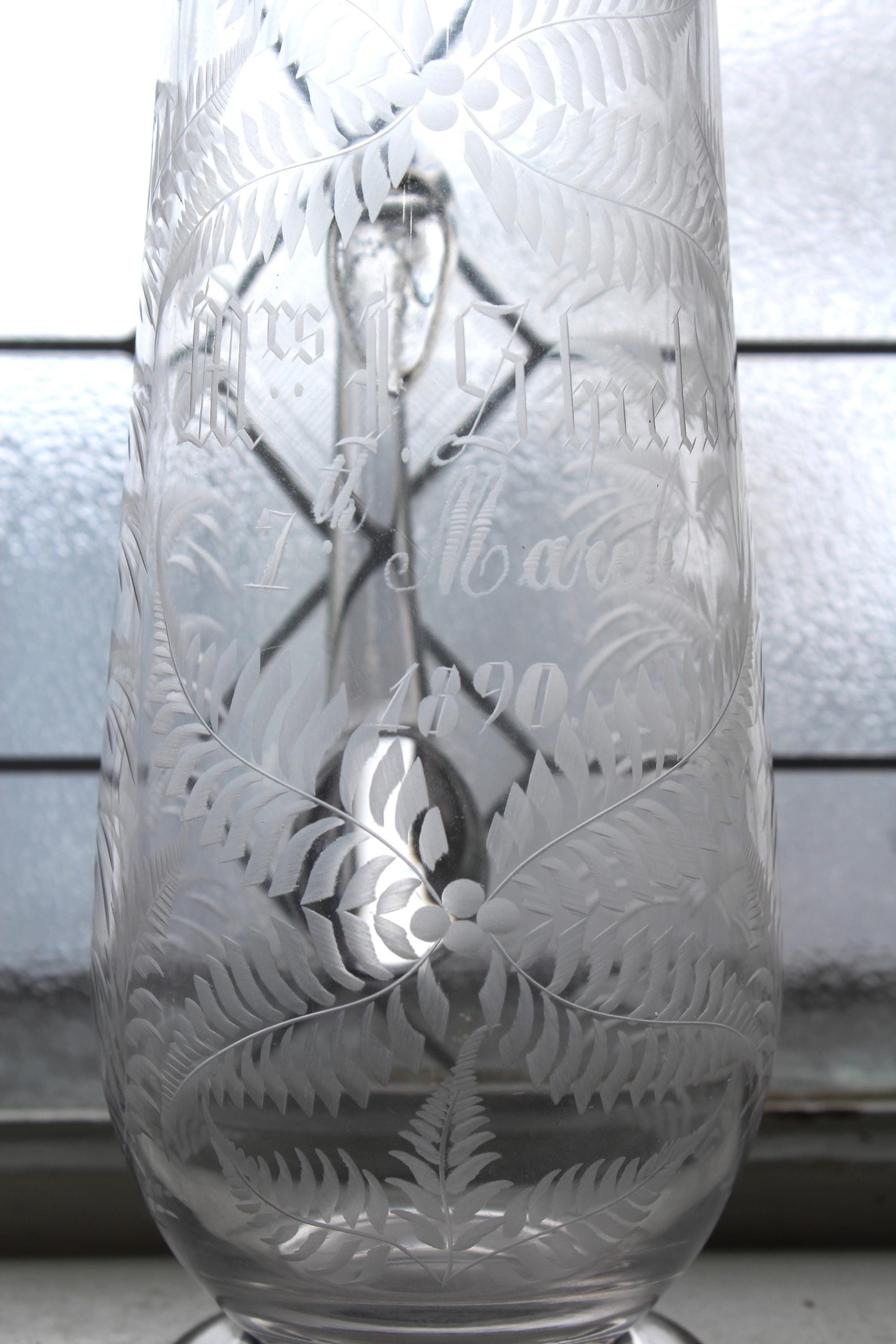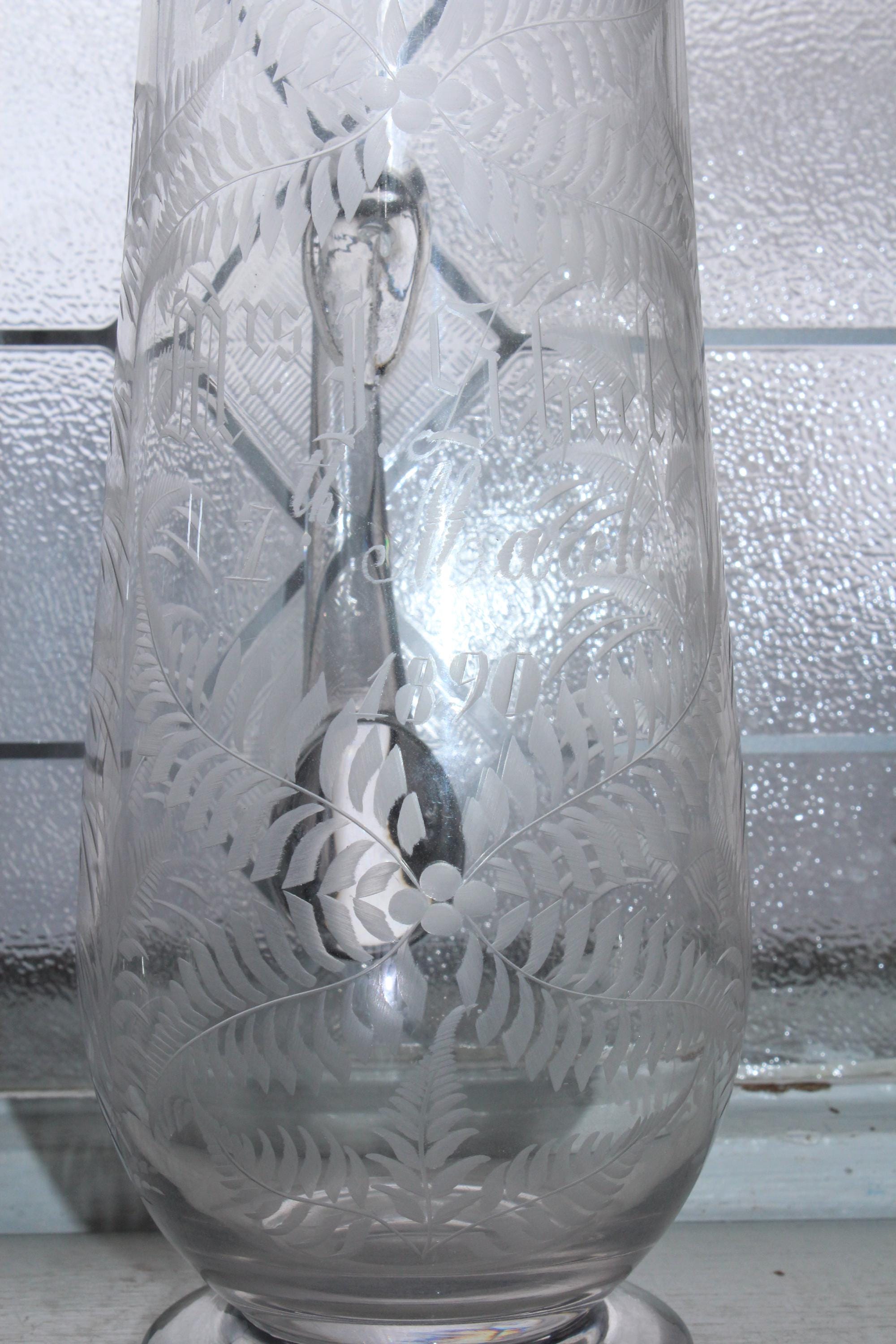 This is an antique one of a kind Victorian engraved clear glass water jug and a matching goblet. It reads "Mrs. F Shields 7th March, 1890" with intricate ferns and is just wonderful! The pitcher is 9" high. No chips or cracks in the pitcher but the goblet does have some base rim chips. It displays very well. Enjoy!