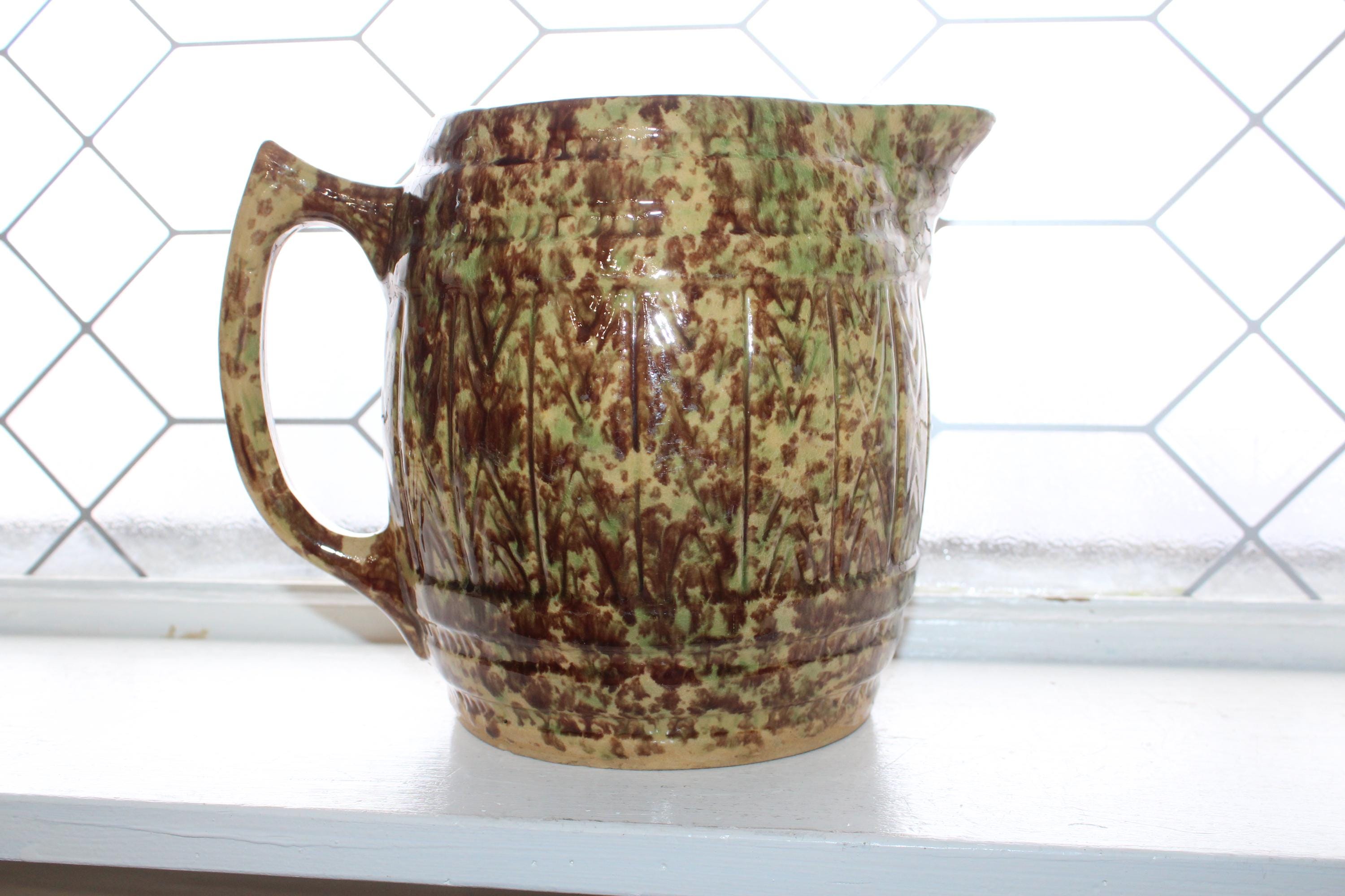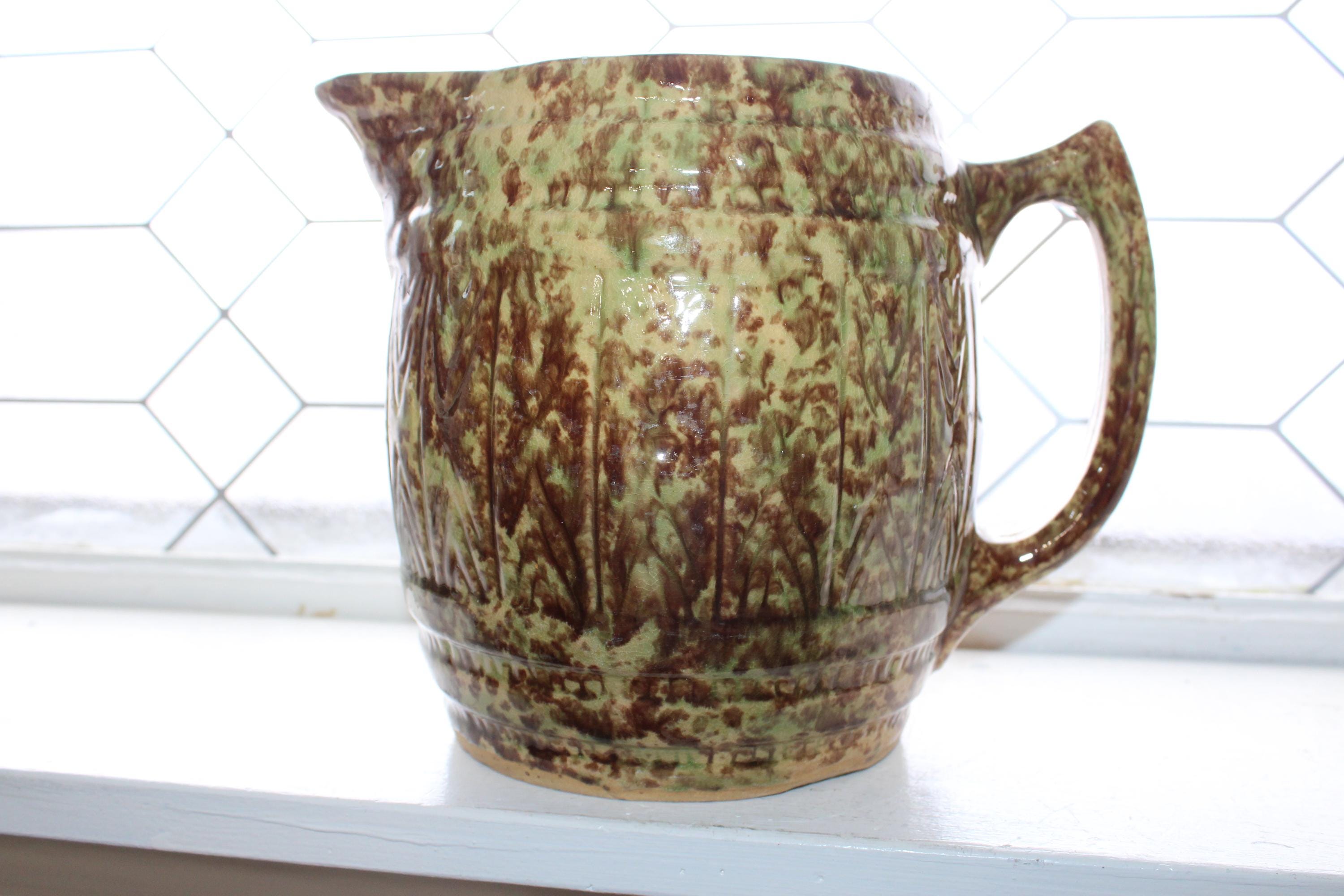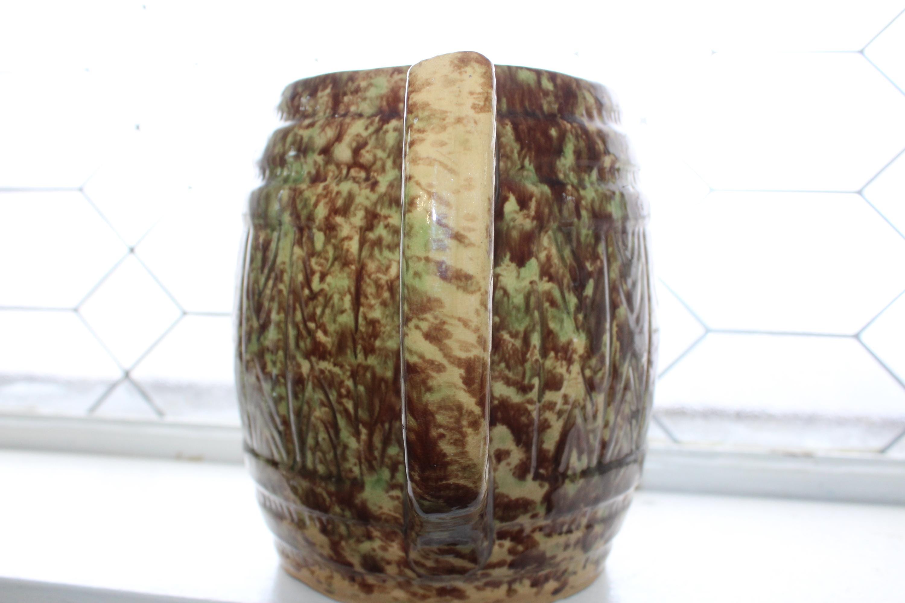 Large antique Morton Pottery brown and green on yellowware spongeware barrel pitcher with Woodland glaze, in good condition. This stoneware pitcher measures 7 1/2" high, weighs 3 3/4 lbs. and has minor base rim wear, great for use or display in a country kitchen. Enjoy!