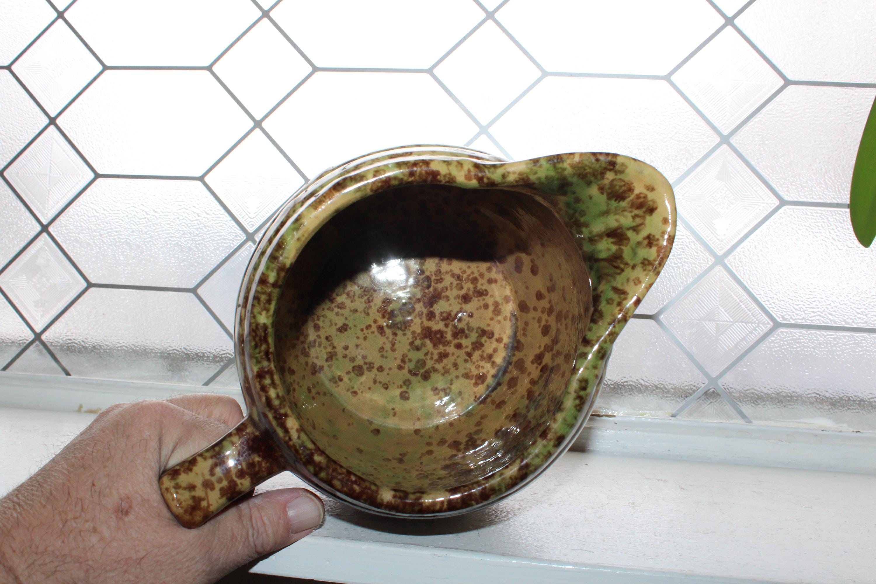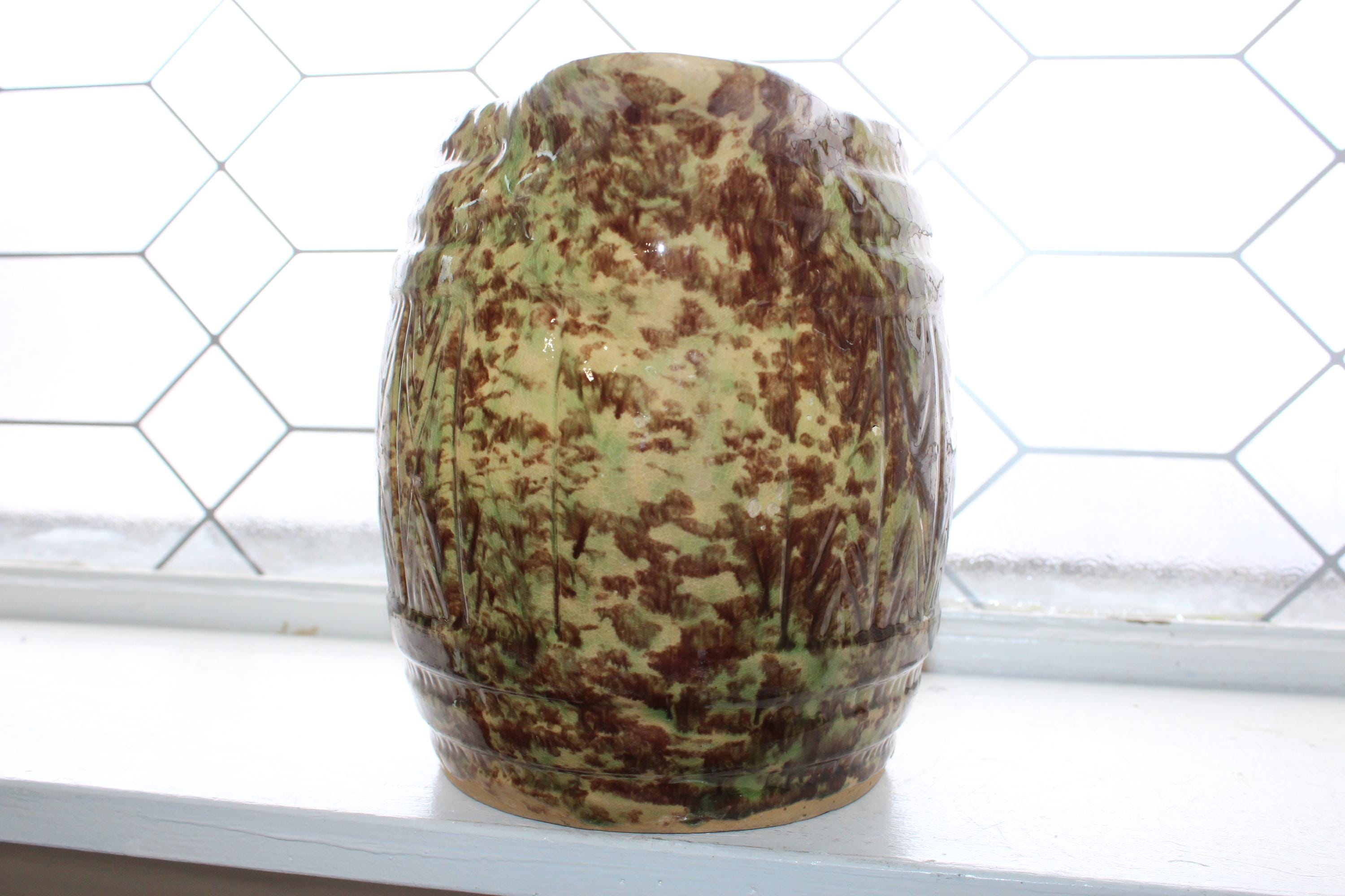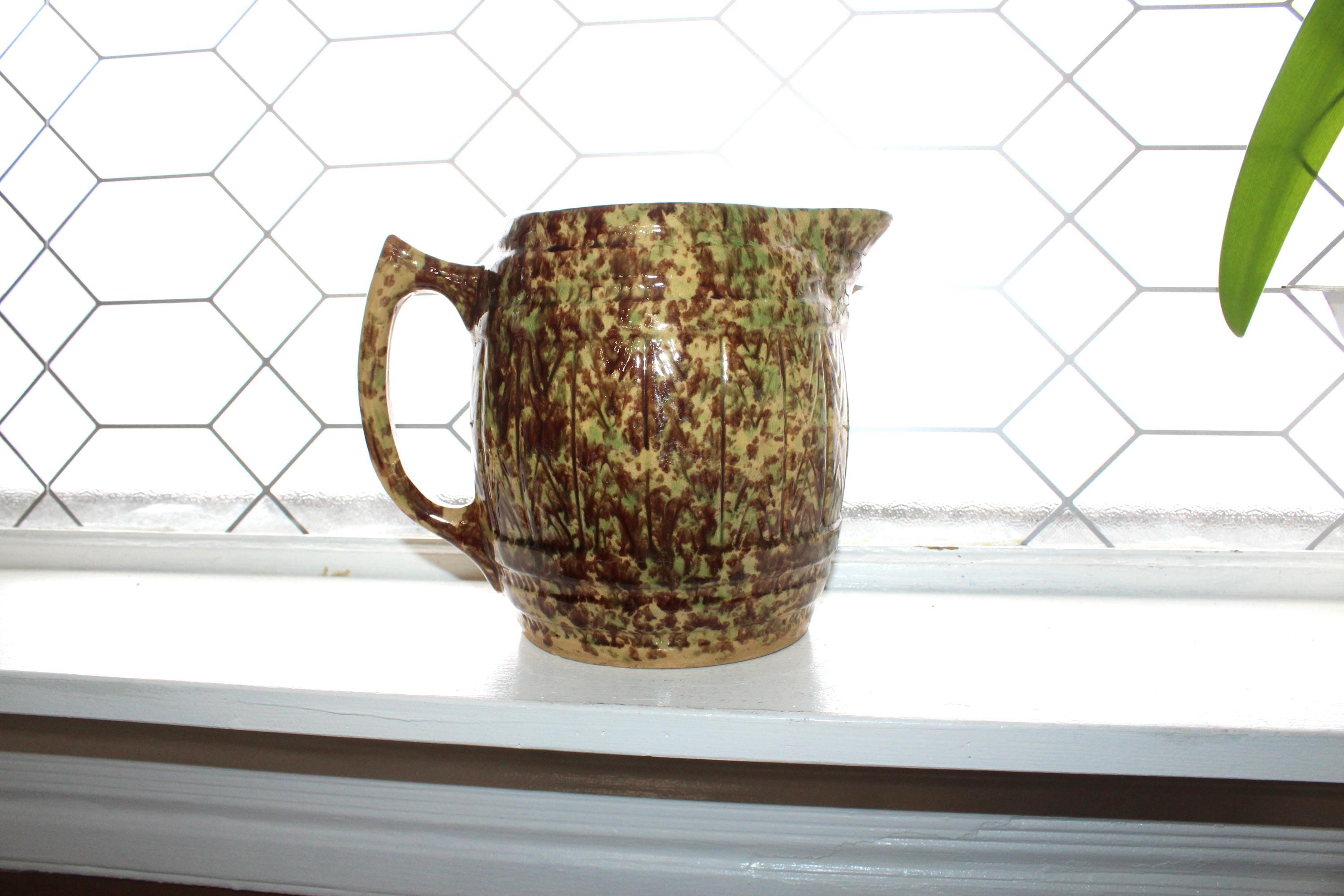 Large antique Morton Pottery brown and green on yellowware spongeware barrel pitcher with Woodland glaze, in good condition. This stoneware pitcher measures 7 1/2" high, weighs 3 3/4 lbs. and has minor base rim wear, great for use or display in a country kitchen. Enjoy!