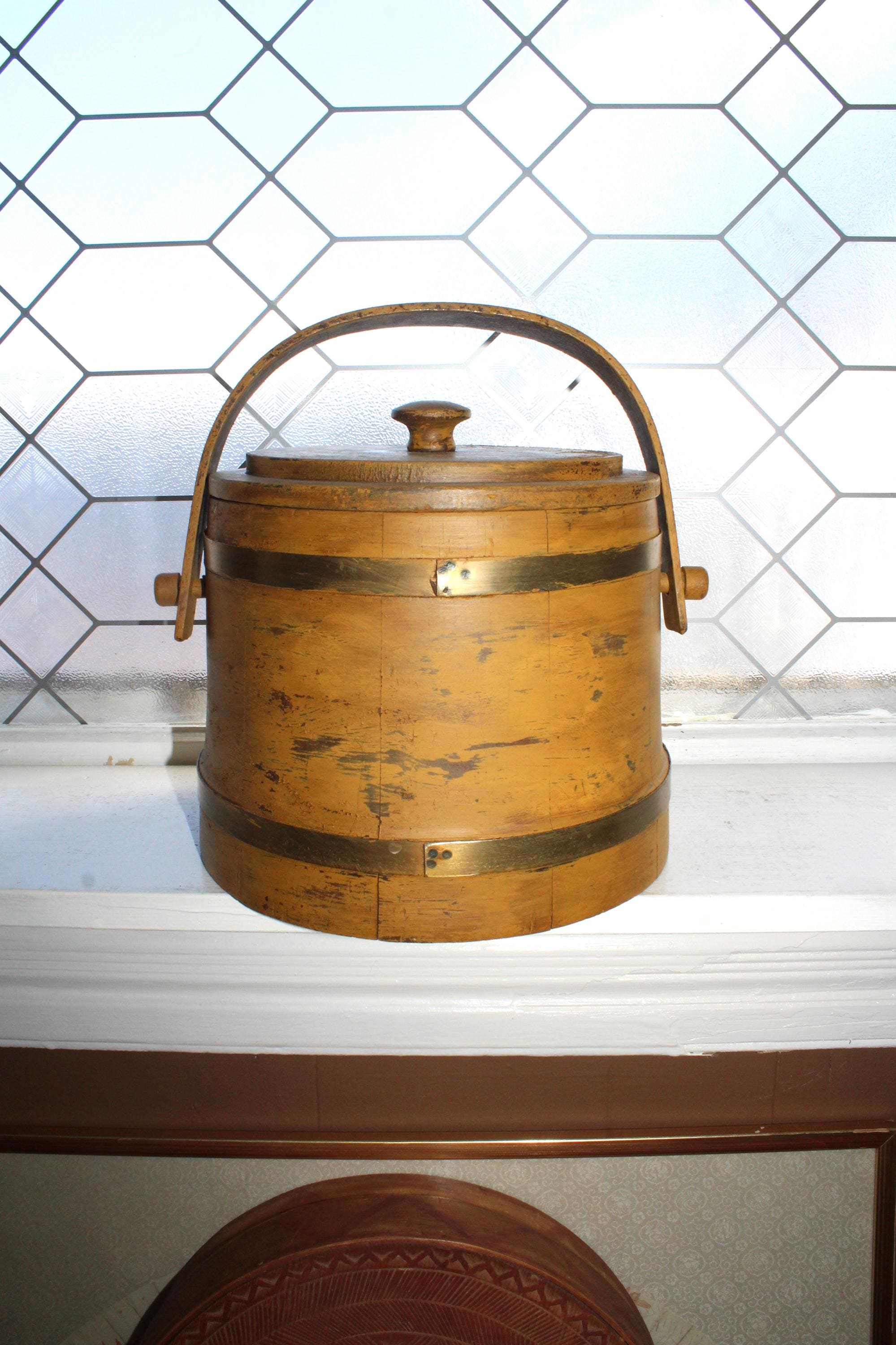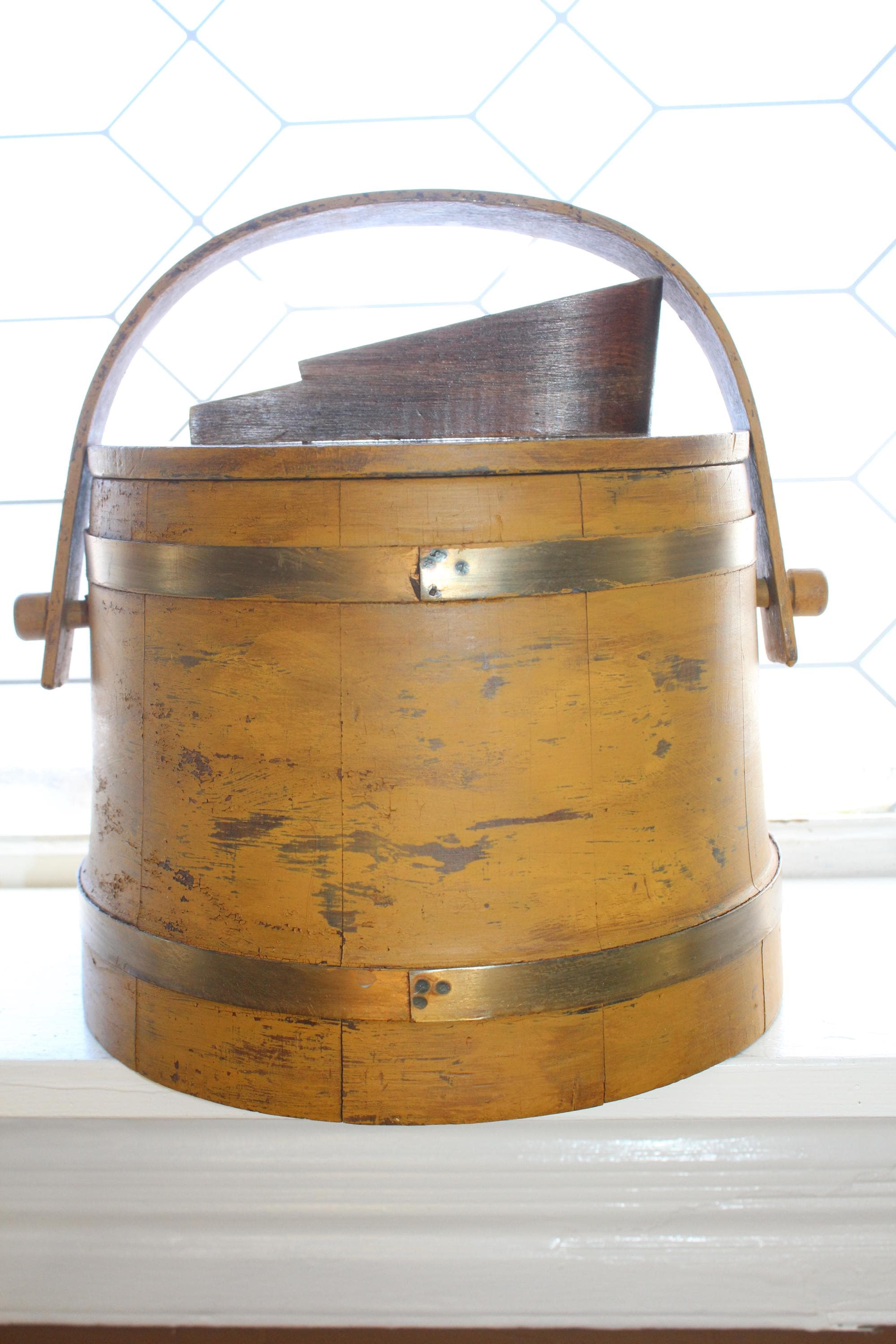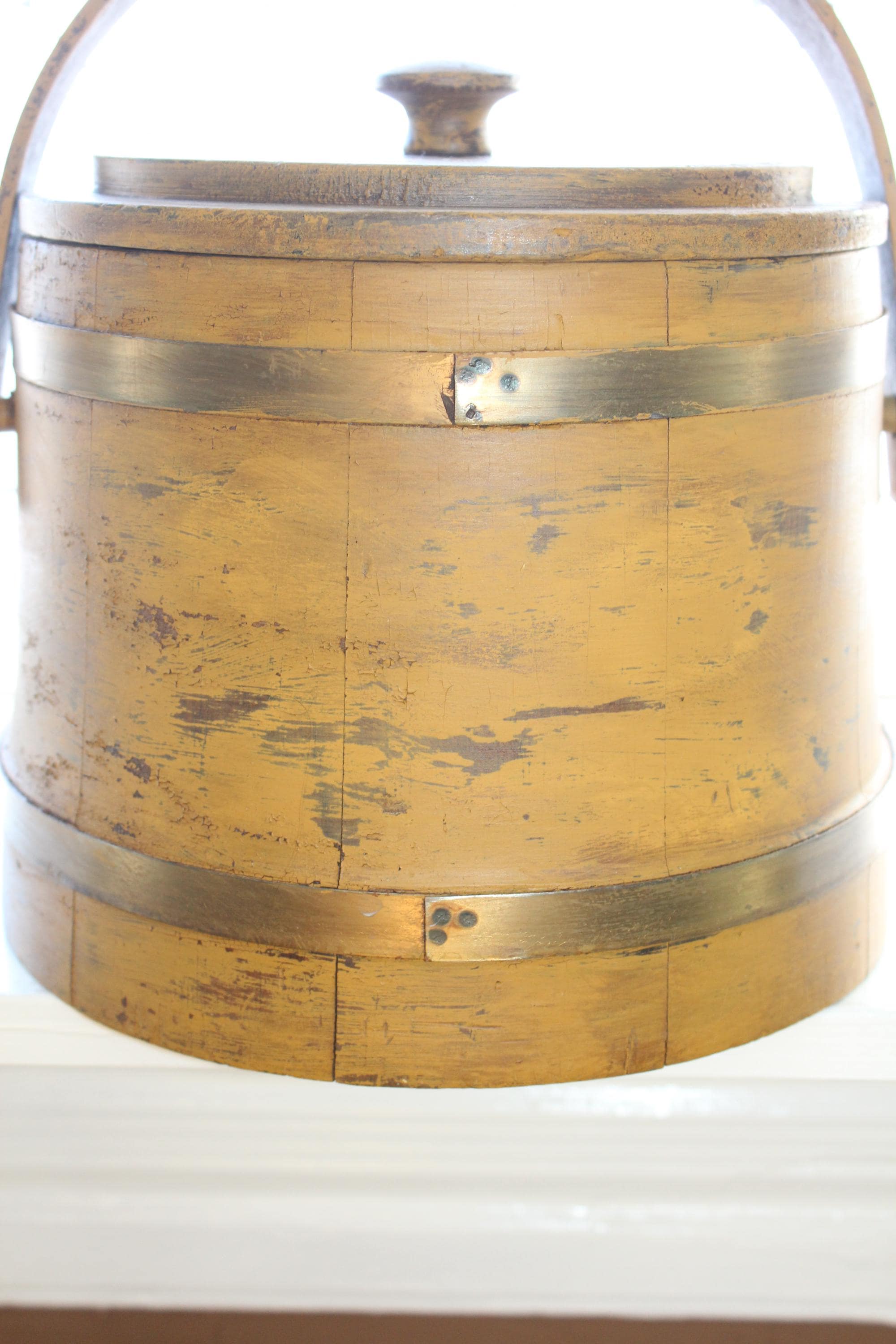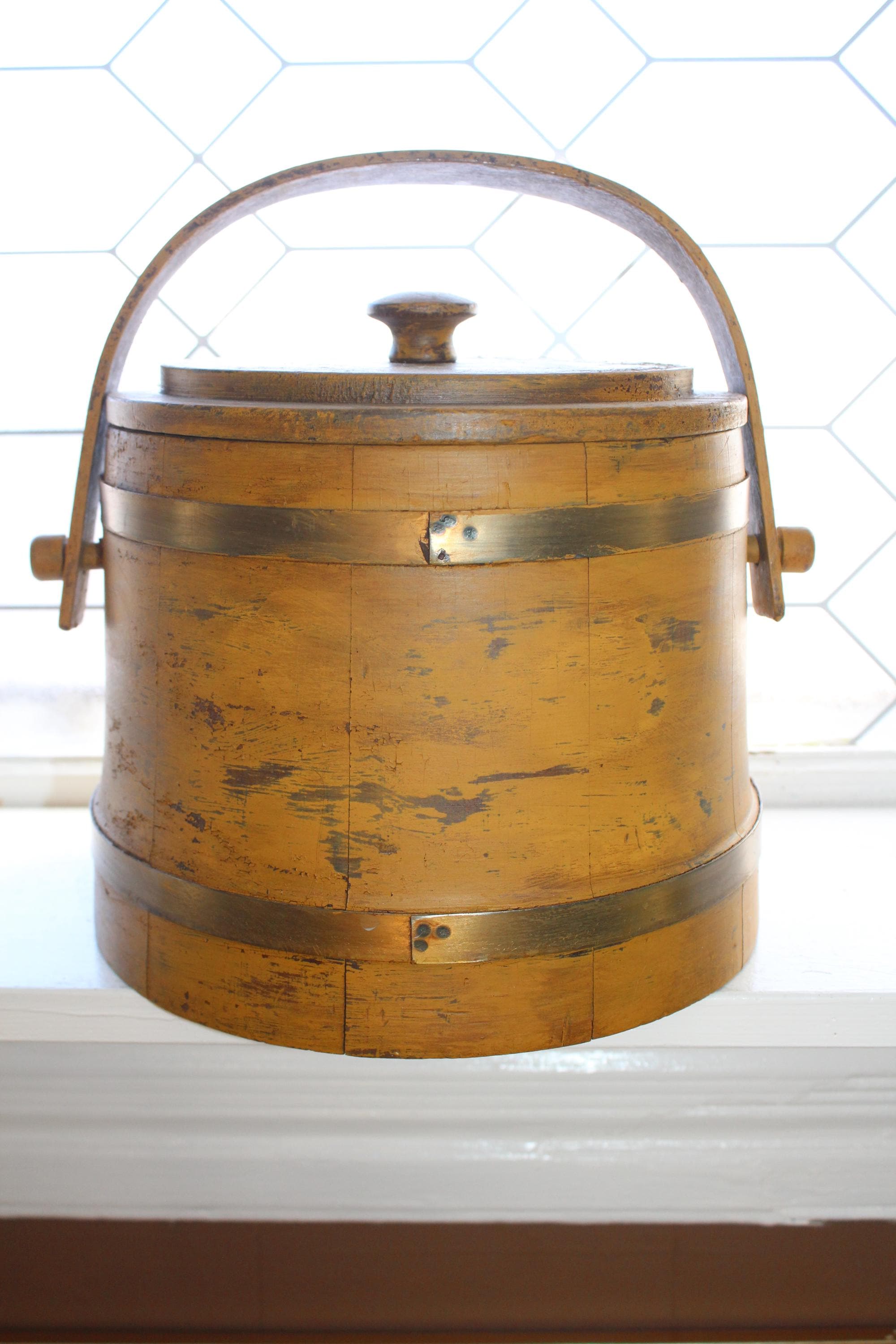 Vintage mustard yellow painted wooden firkin or sugar bucket/shoe shine kit with wood stave construction, wooden swing handle, and lid, in very good condition. The bucket measures 7 1/4" high at the rim x 8" wide at the top and displays very well. I purchased this at an estate auction in the Red River Valley of North Dakota. Enjoy!