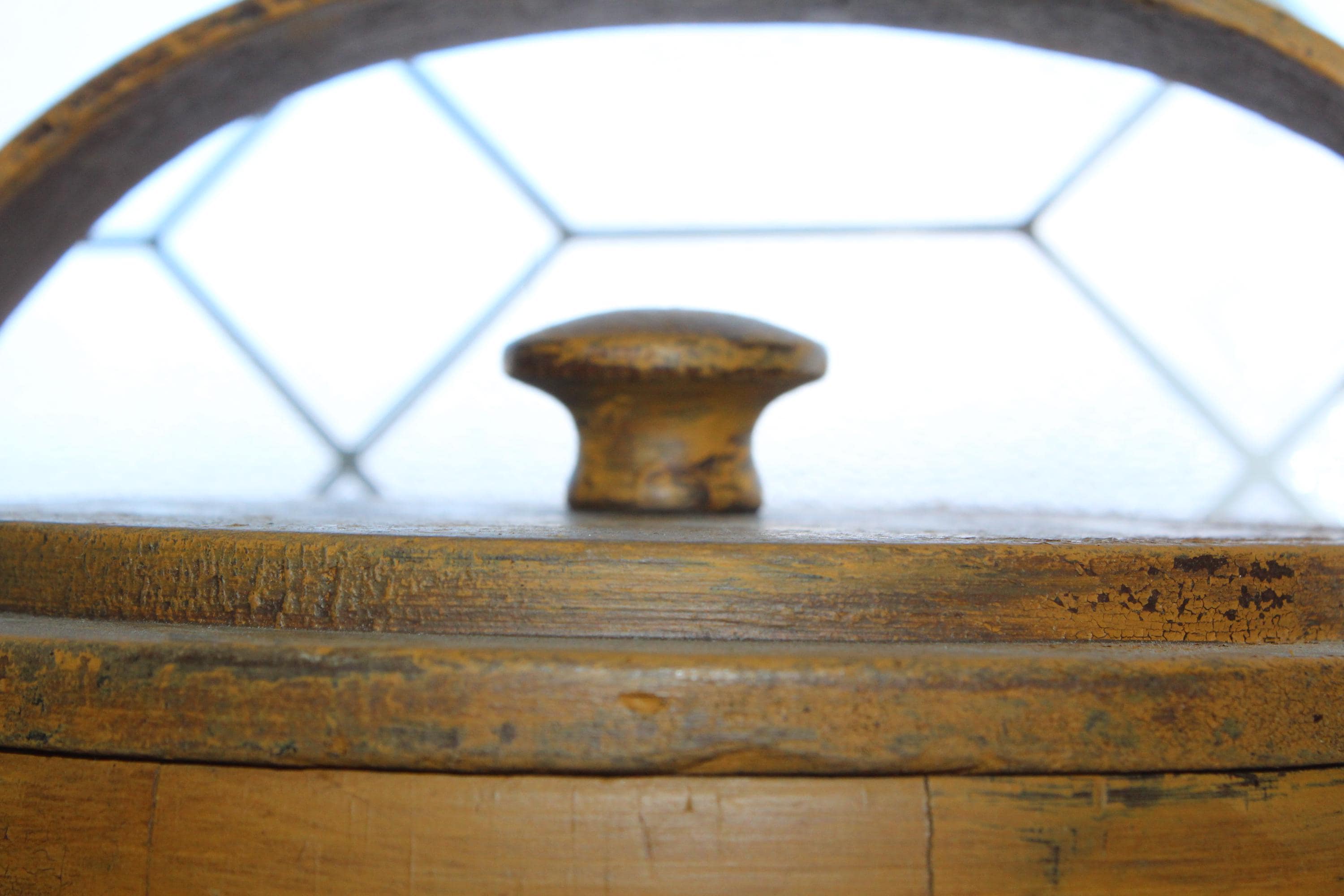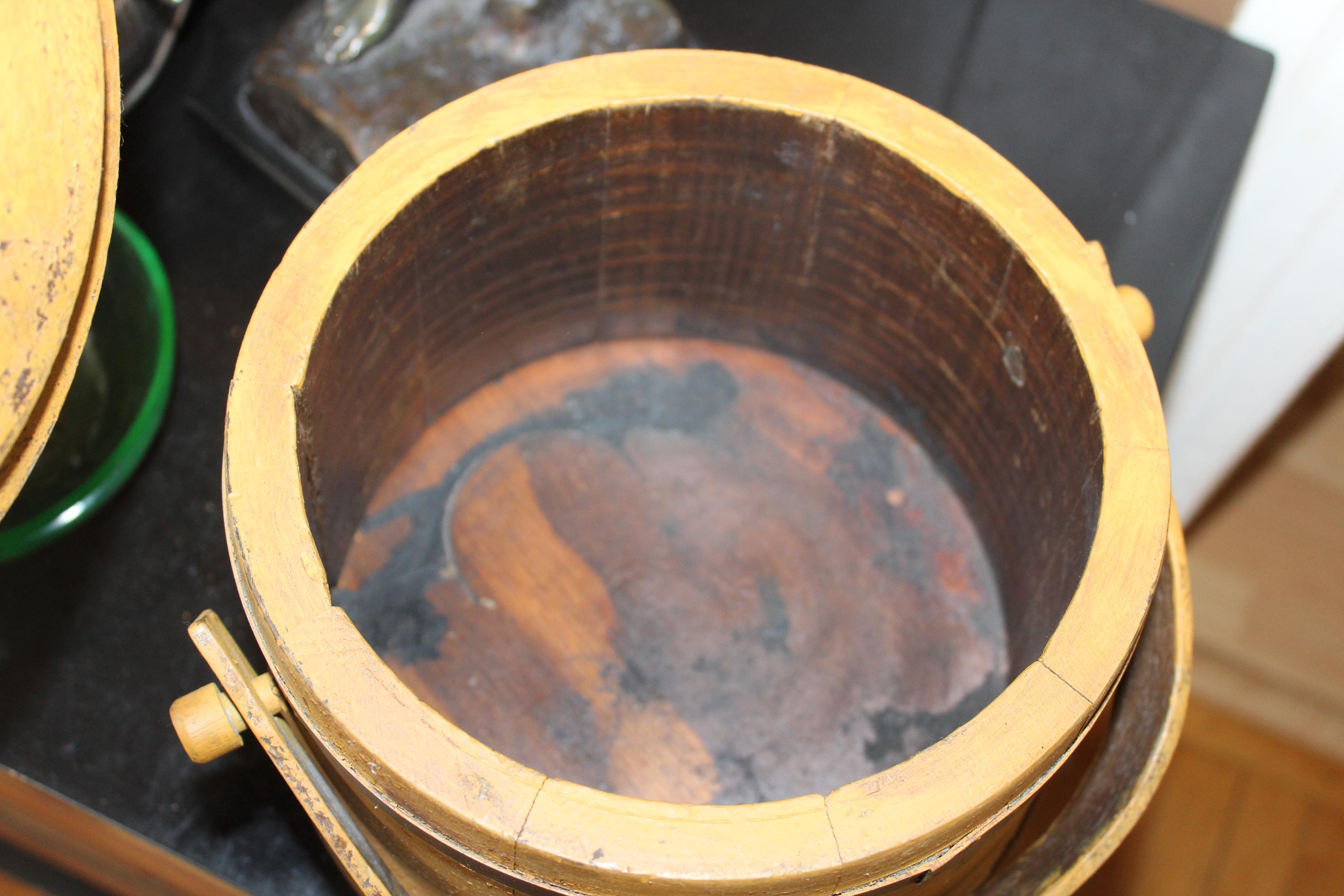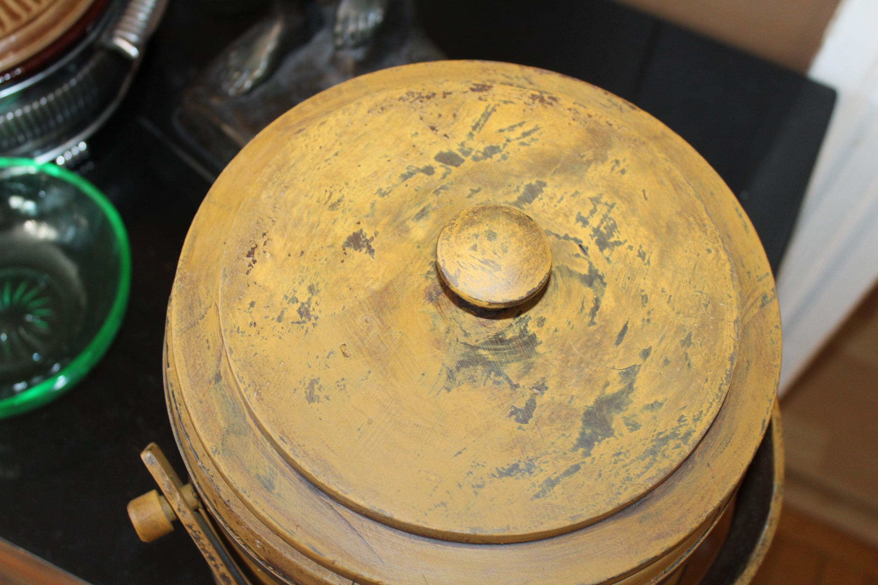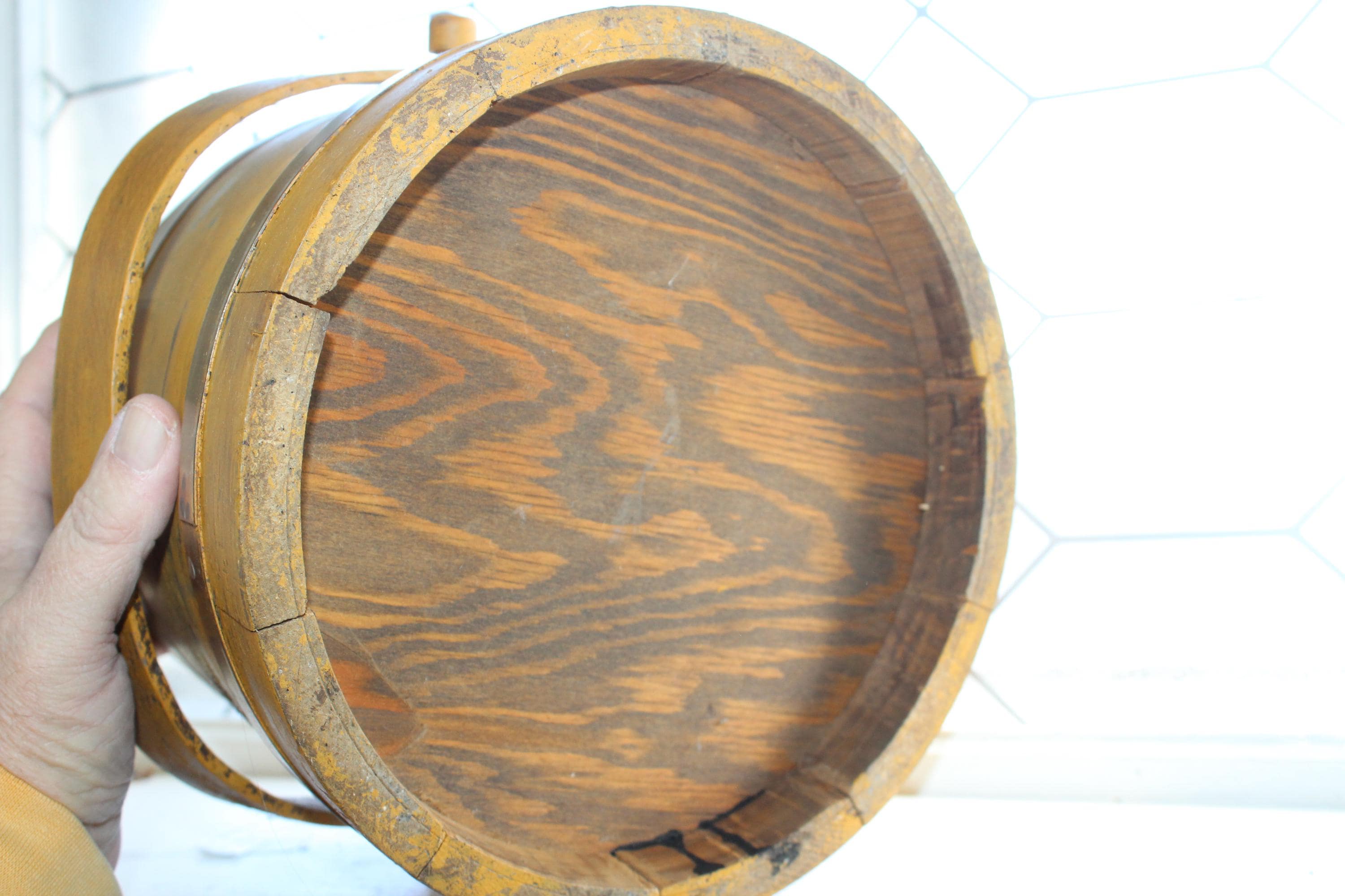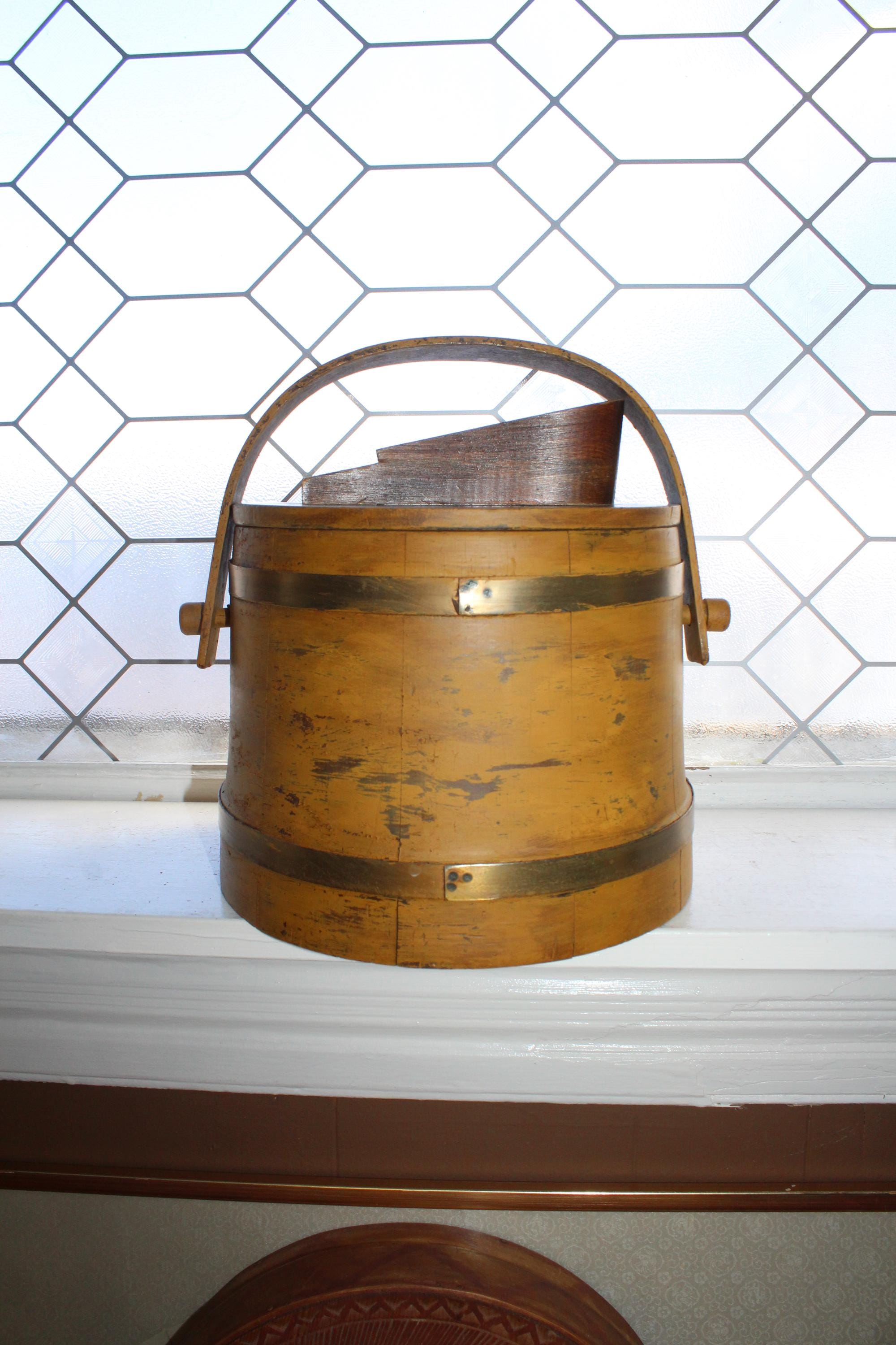 Vintage mustard yellow painted wooden firkin or sugar bucket/shoe shine kit with wood stave construction, wooden swing handle, and lid, in very good condition. The bucket measures 7 1/4" high at the rim x 8" wide at the top and displays very well. I purchased this at an estate auction in the Red River Valley of North Dakota. Enjoy!