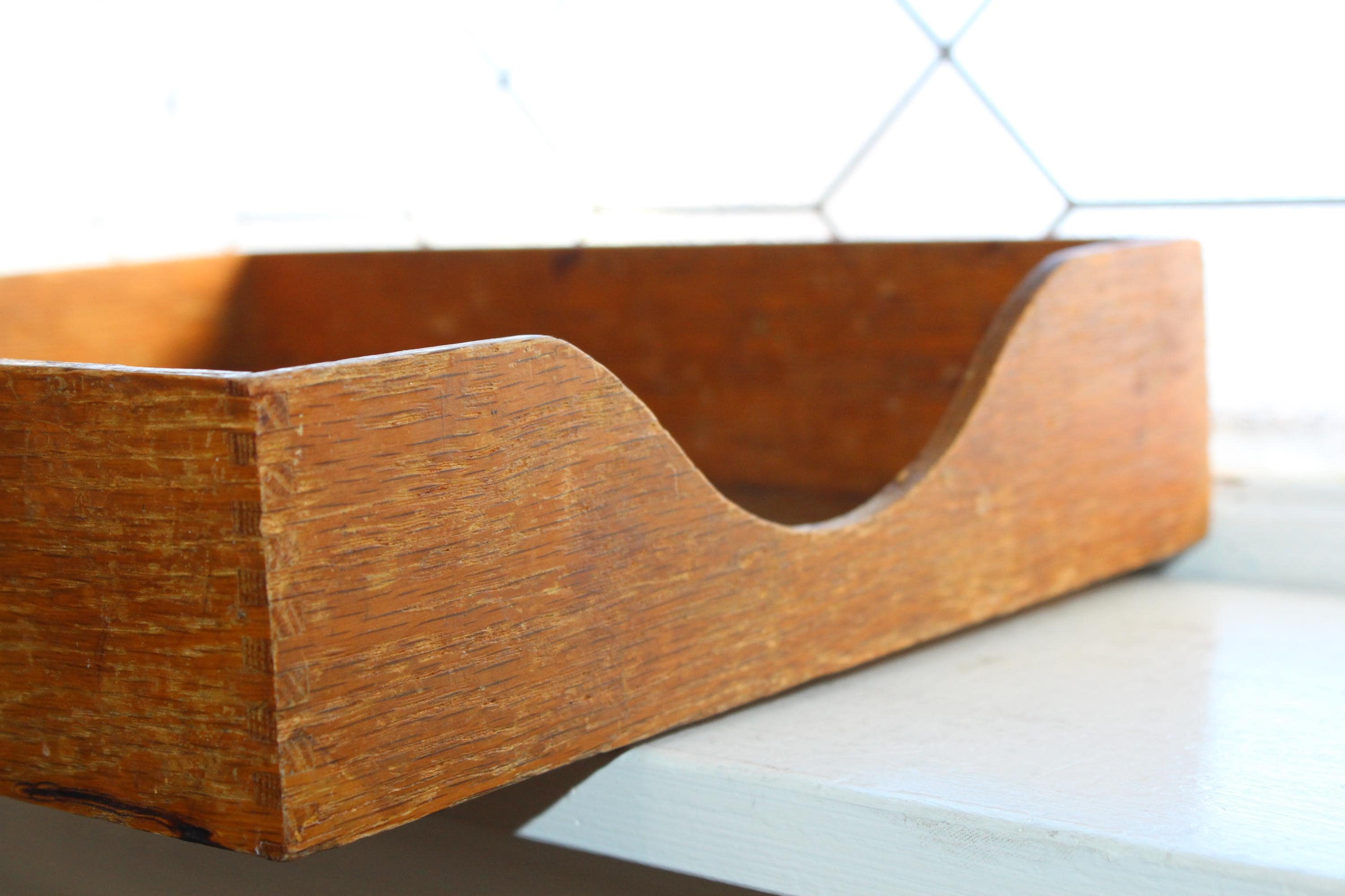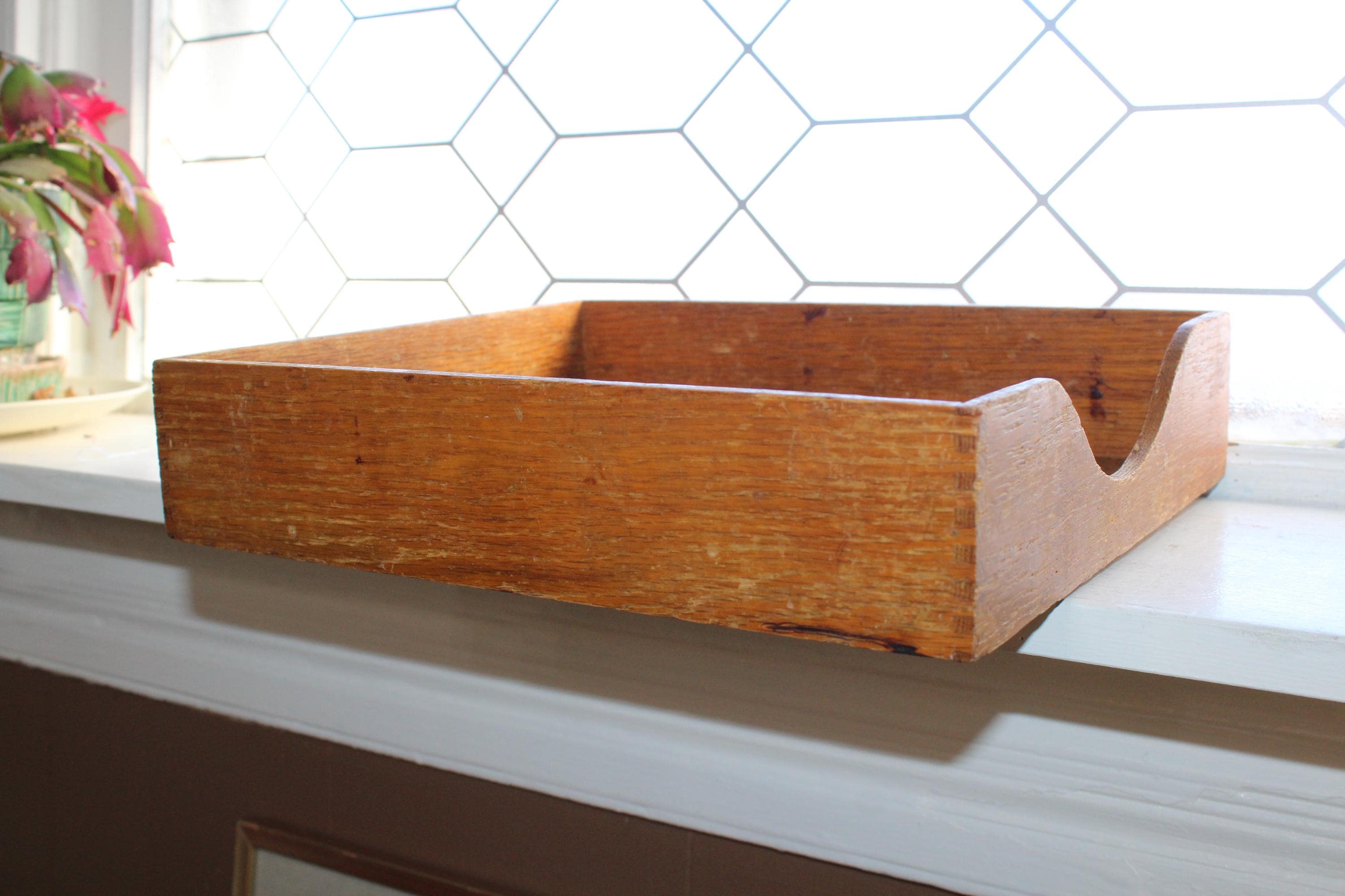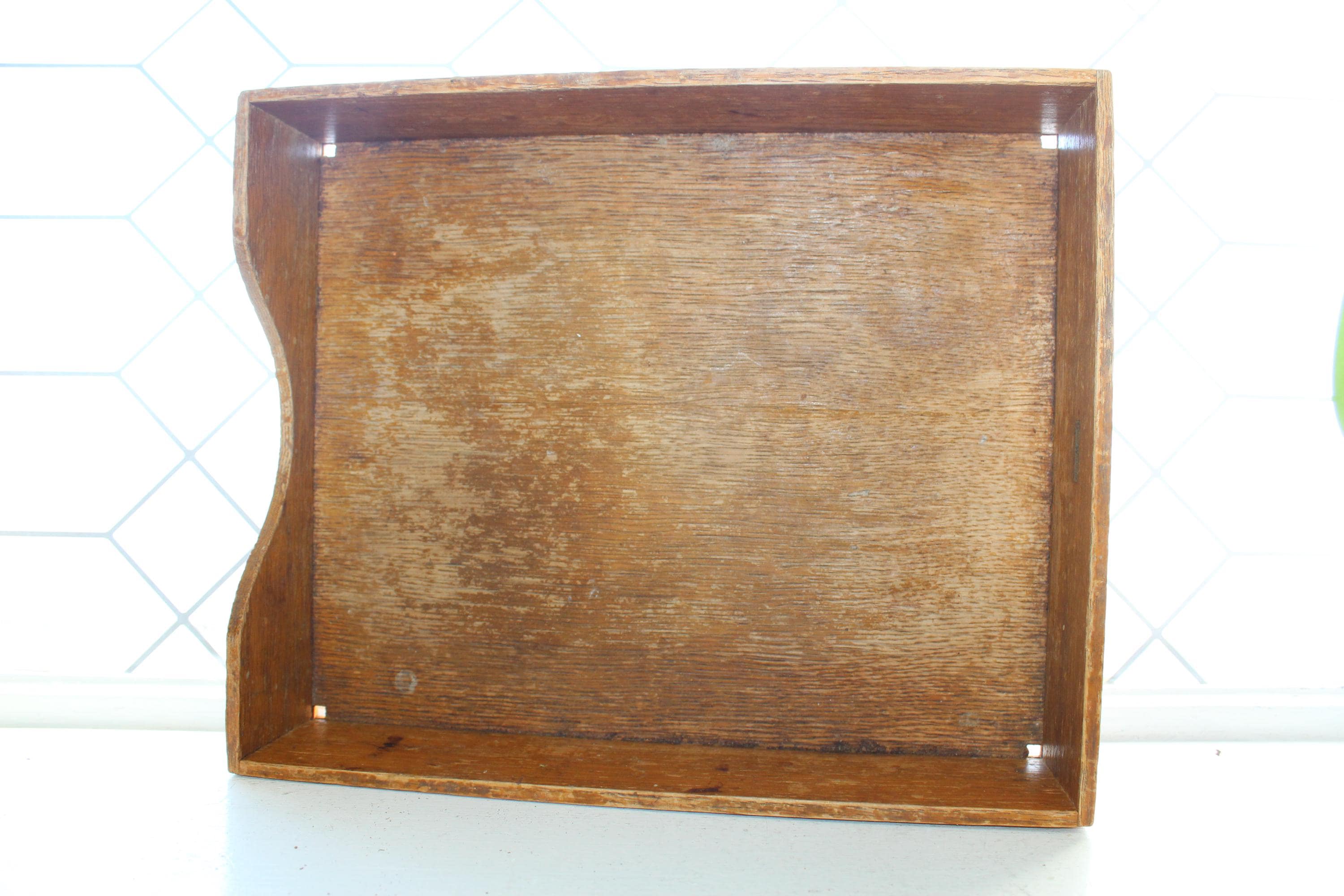 Vintage Mid Century Globe Wernicke wooden paper tray, great for retro desk storage. It measures 12 1/2" x 10 1/4" x 2 3/4" high, displays well and looks good in a retro office. Enjoy!