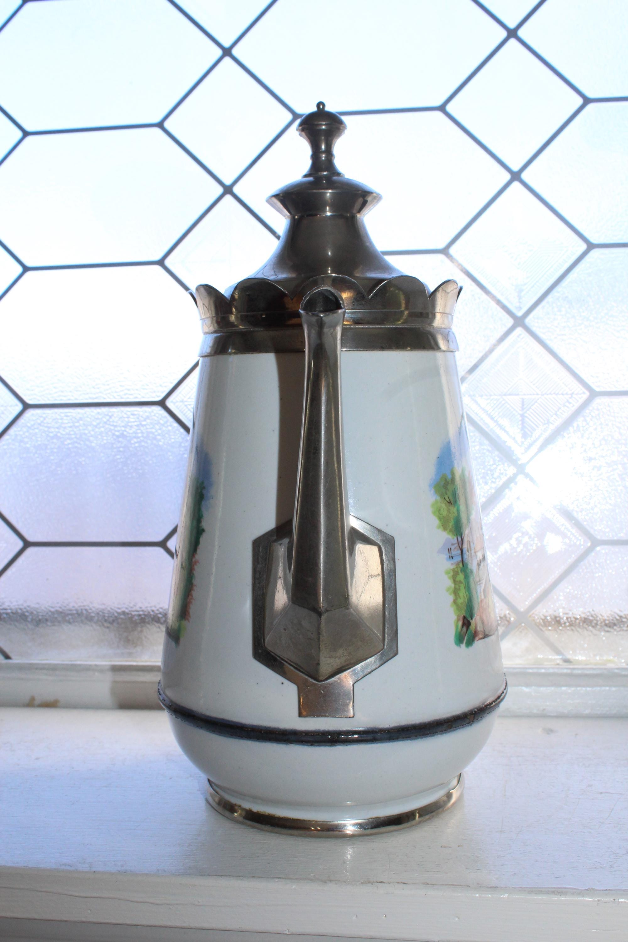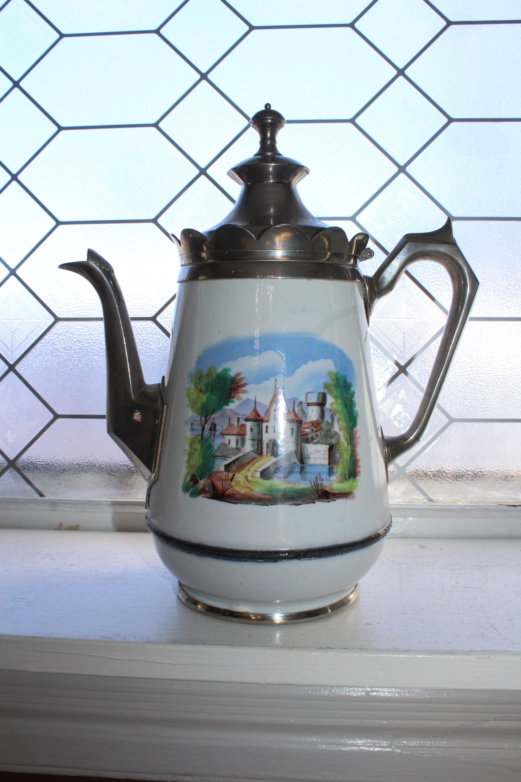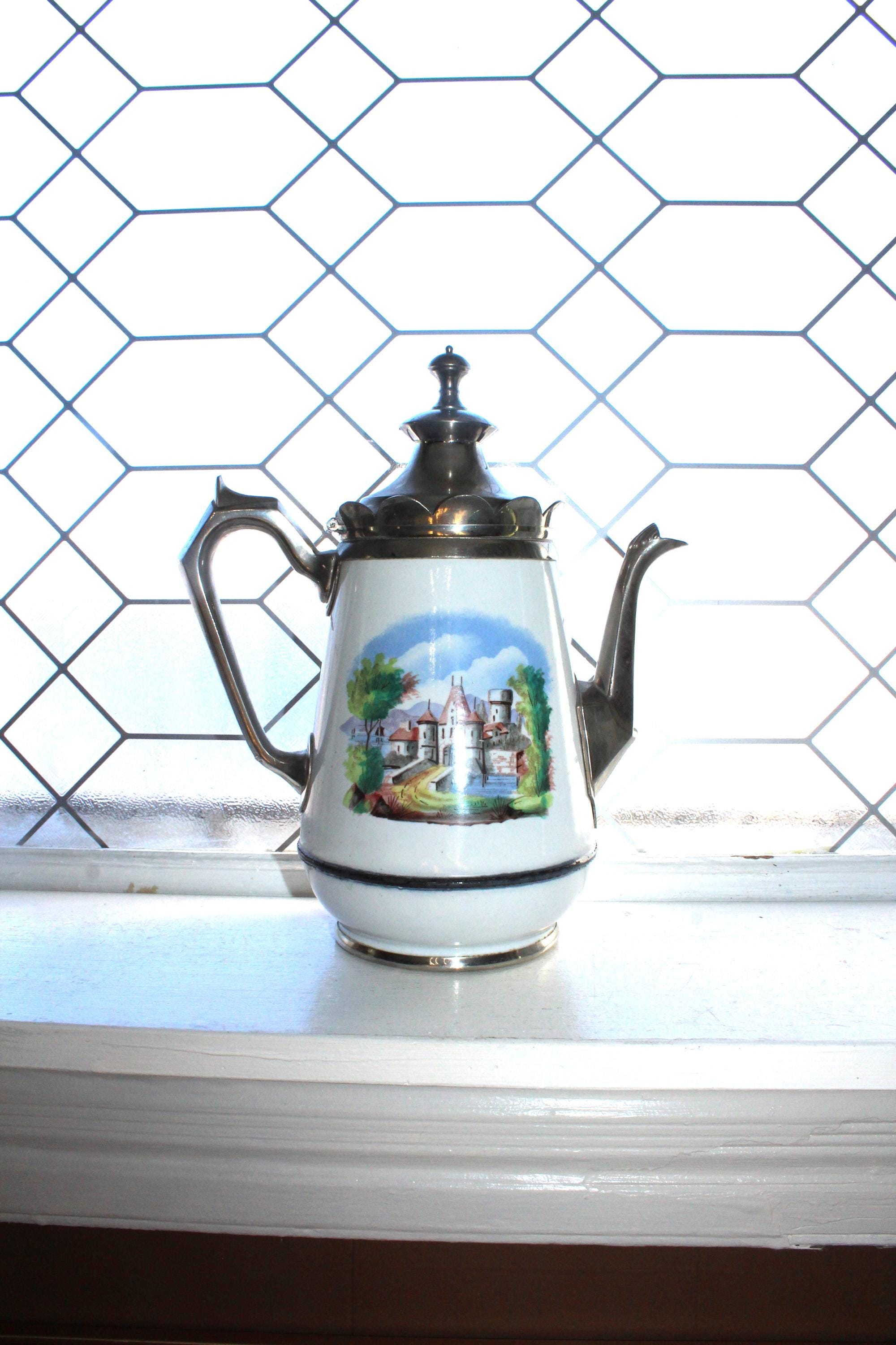 Antique late 1800s white enamelware / agateware / graniteware and silverplate goose neck coffee pot with bridge and castle decoration on both sides, made by Manning Bowman circa 1885. It measures 10 1/2" high and is a perfect addition to a country home. It displays very well, in very good condition as shown in the photos. Enjoy!