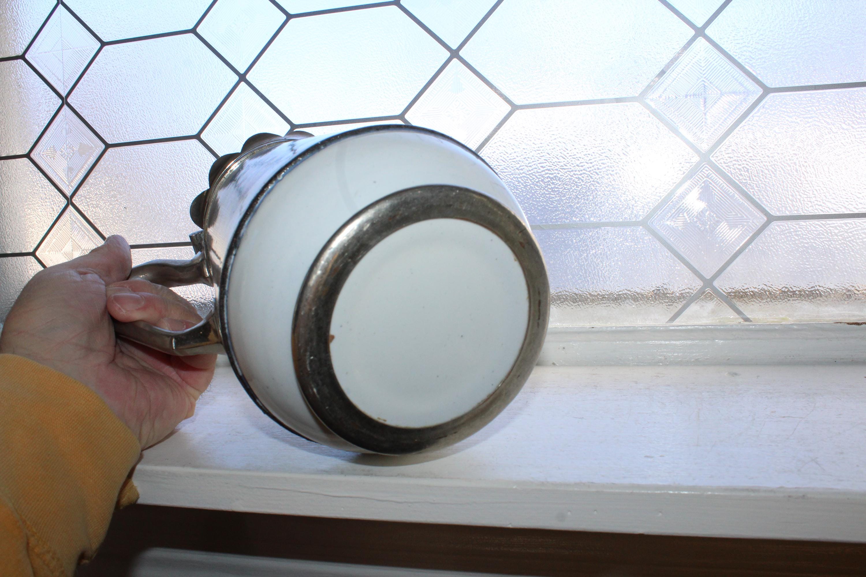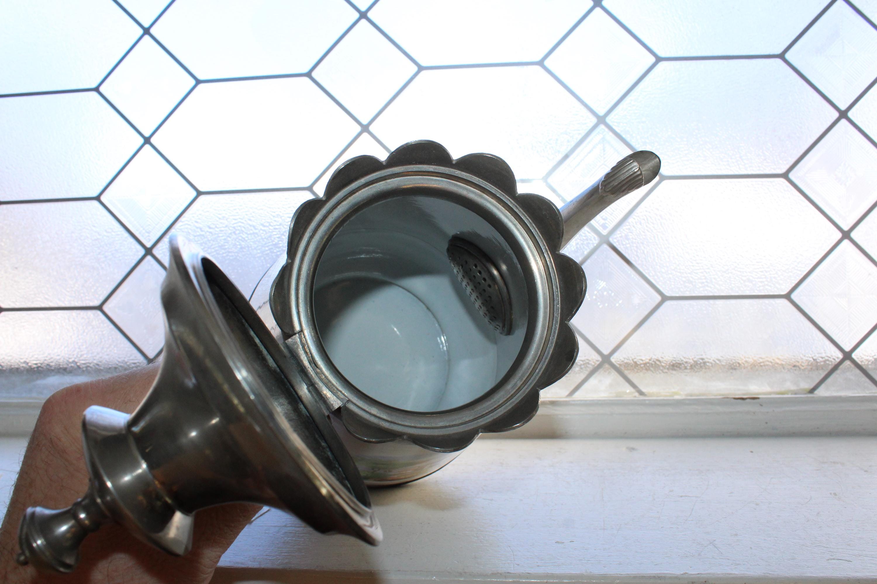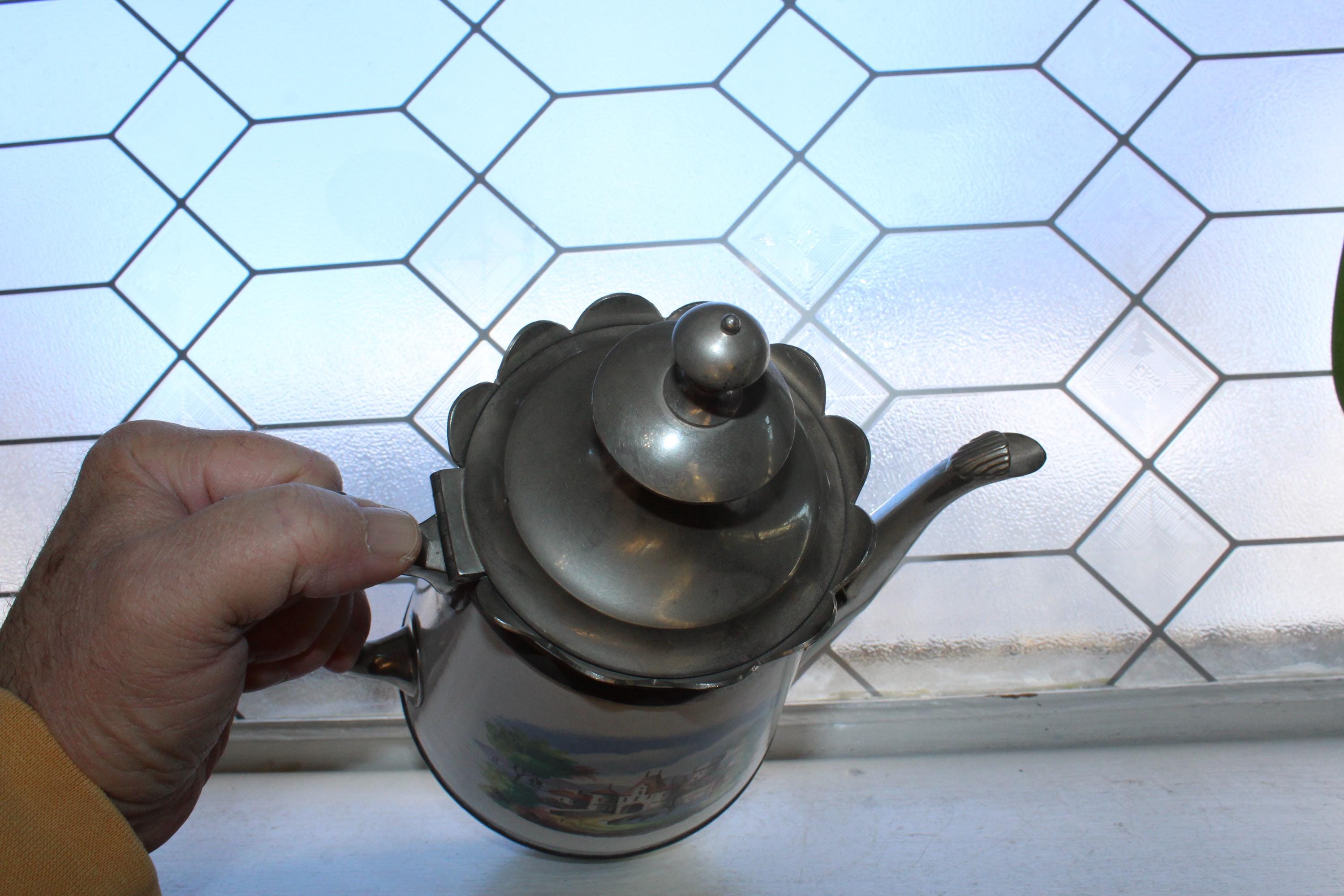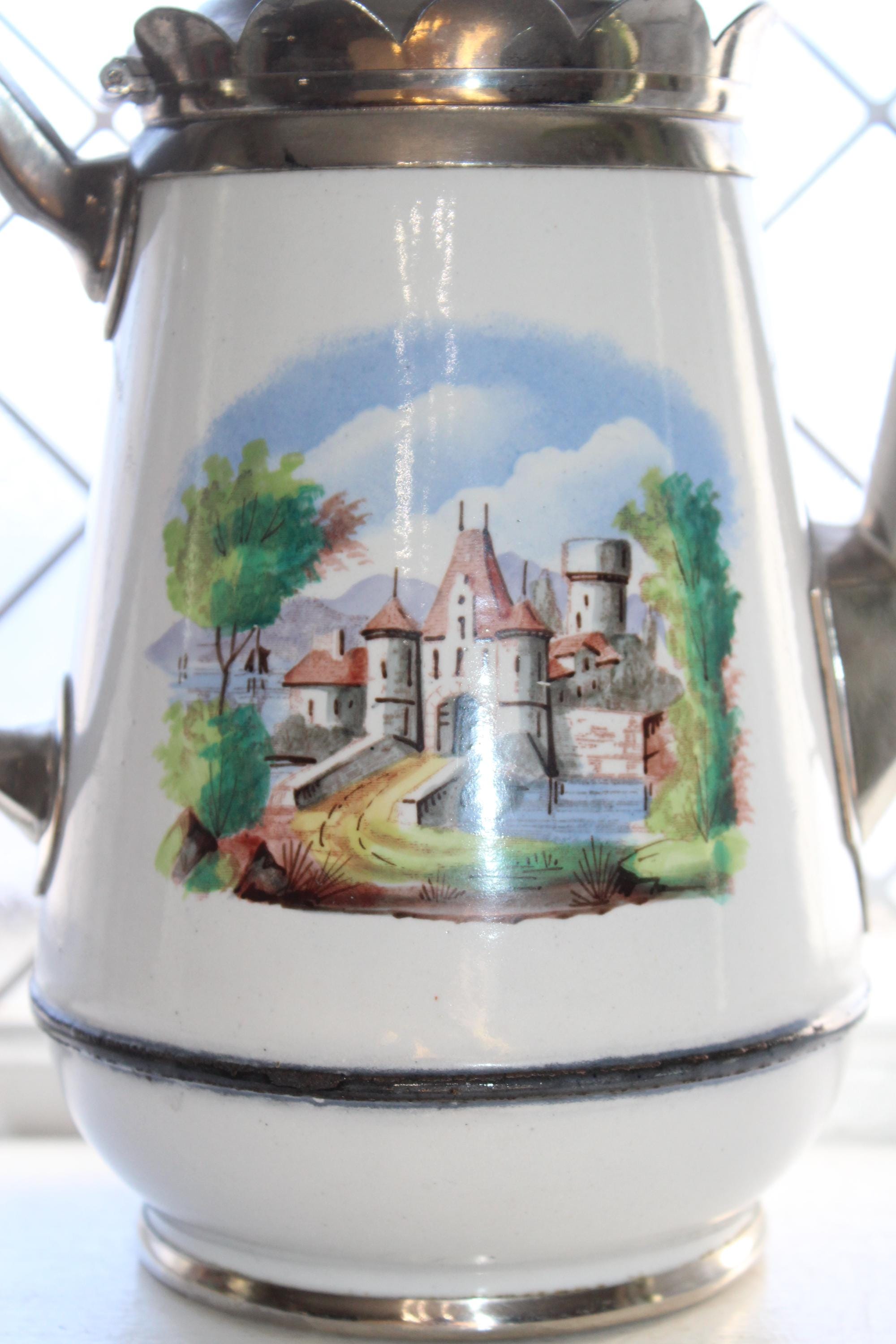 Antique late 1800s white enamelware / agateware / graniteware and silverplate goose neck coffee pot with bridge and castle decoration on both sides, made by Manning Bowman circa 1885. It measures 10 1/2" high and is a perfect addition to a country home. It displays very well, in very good condition as shown in the photos. Enjoy!