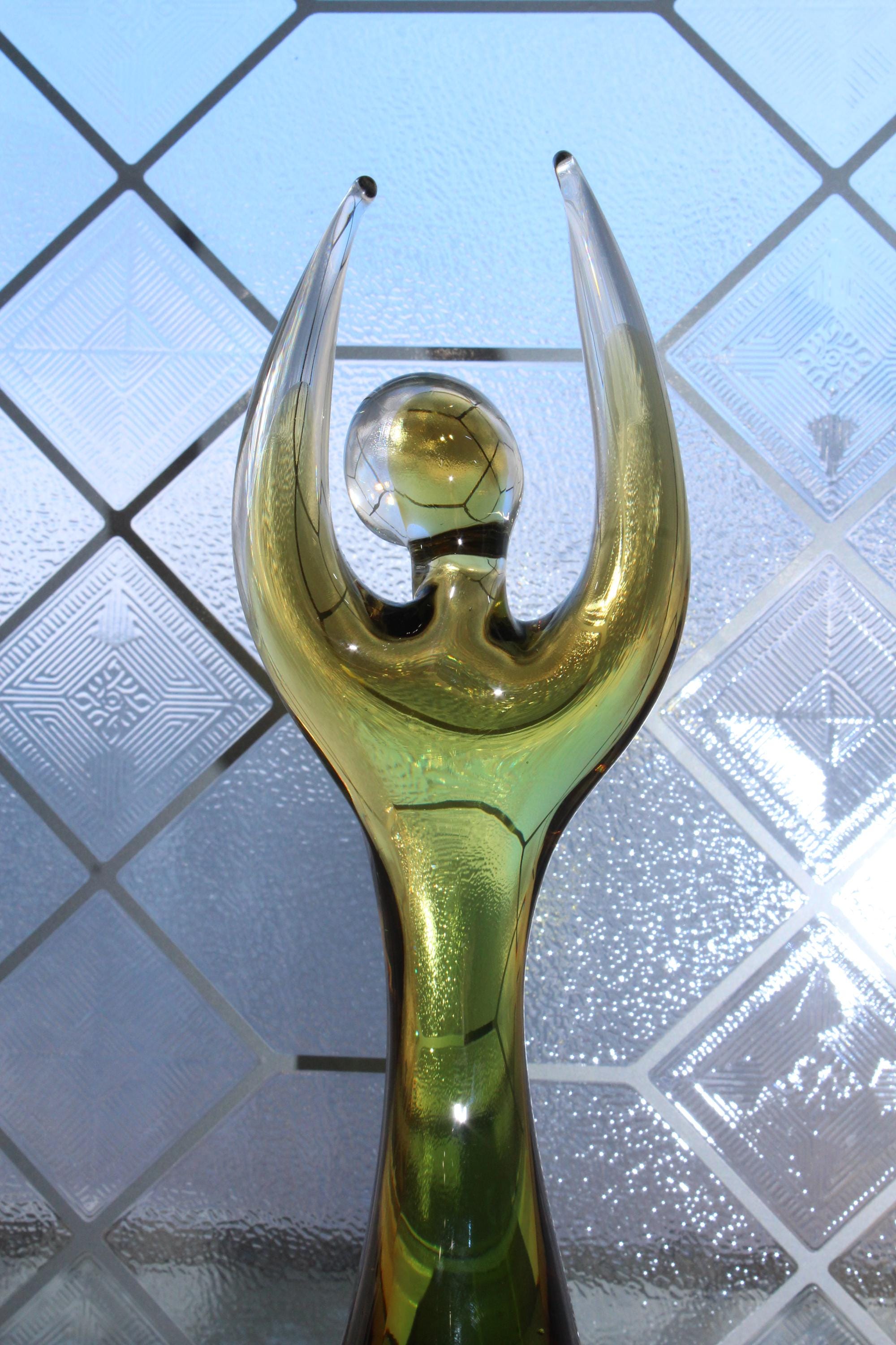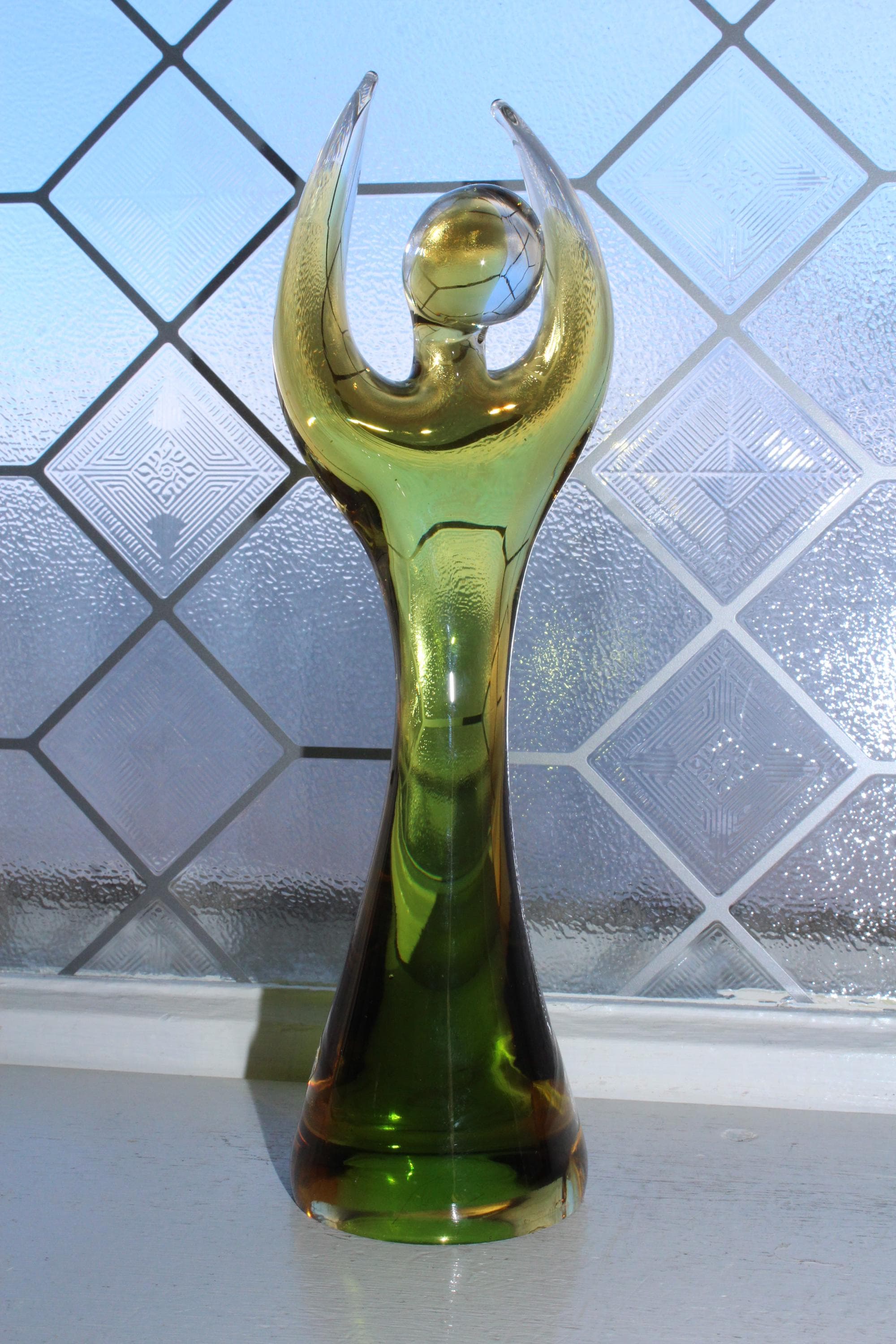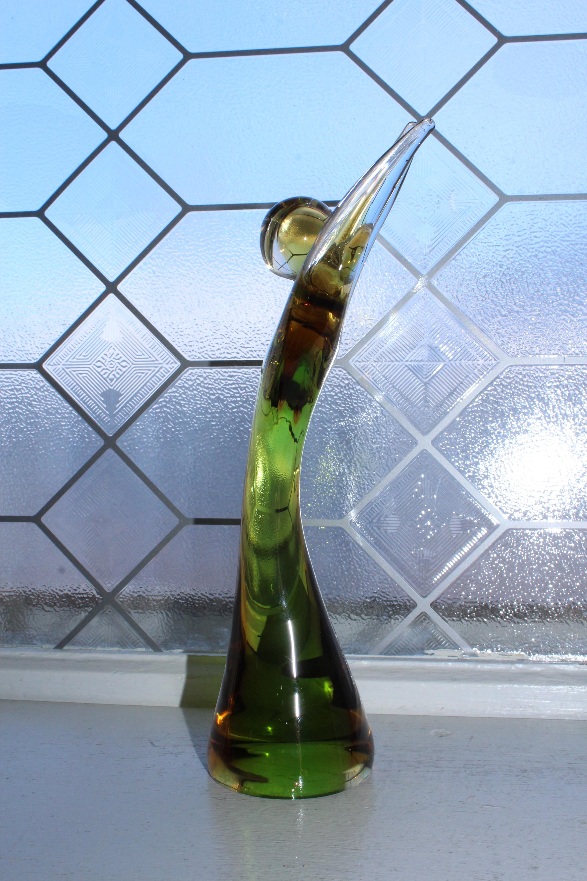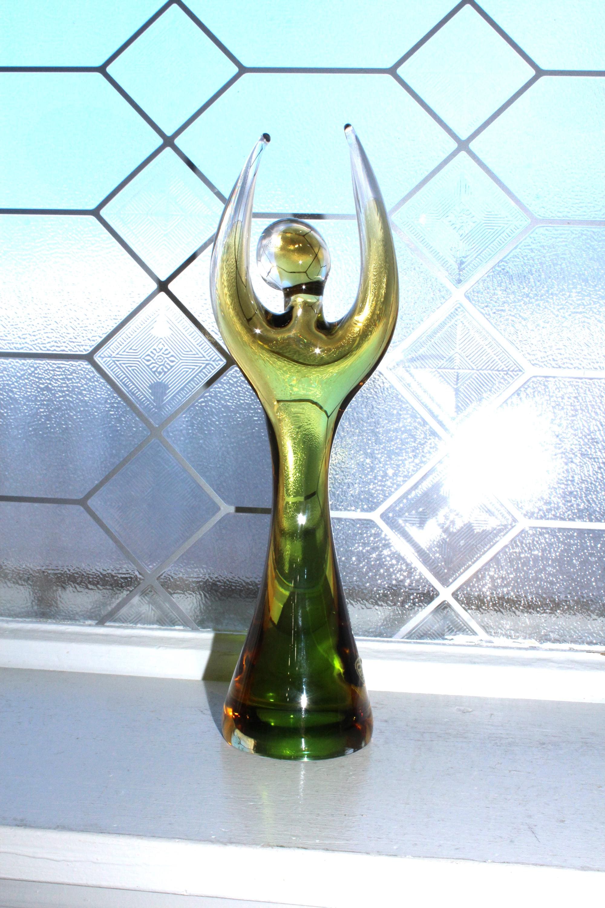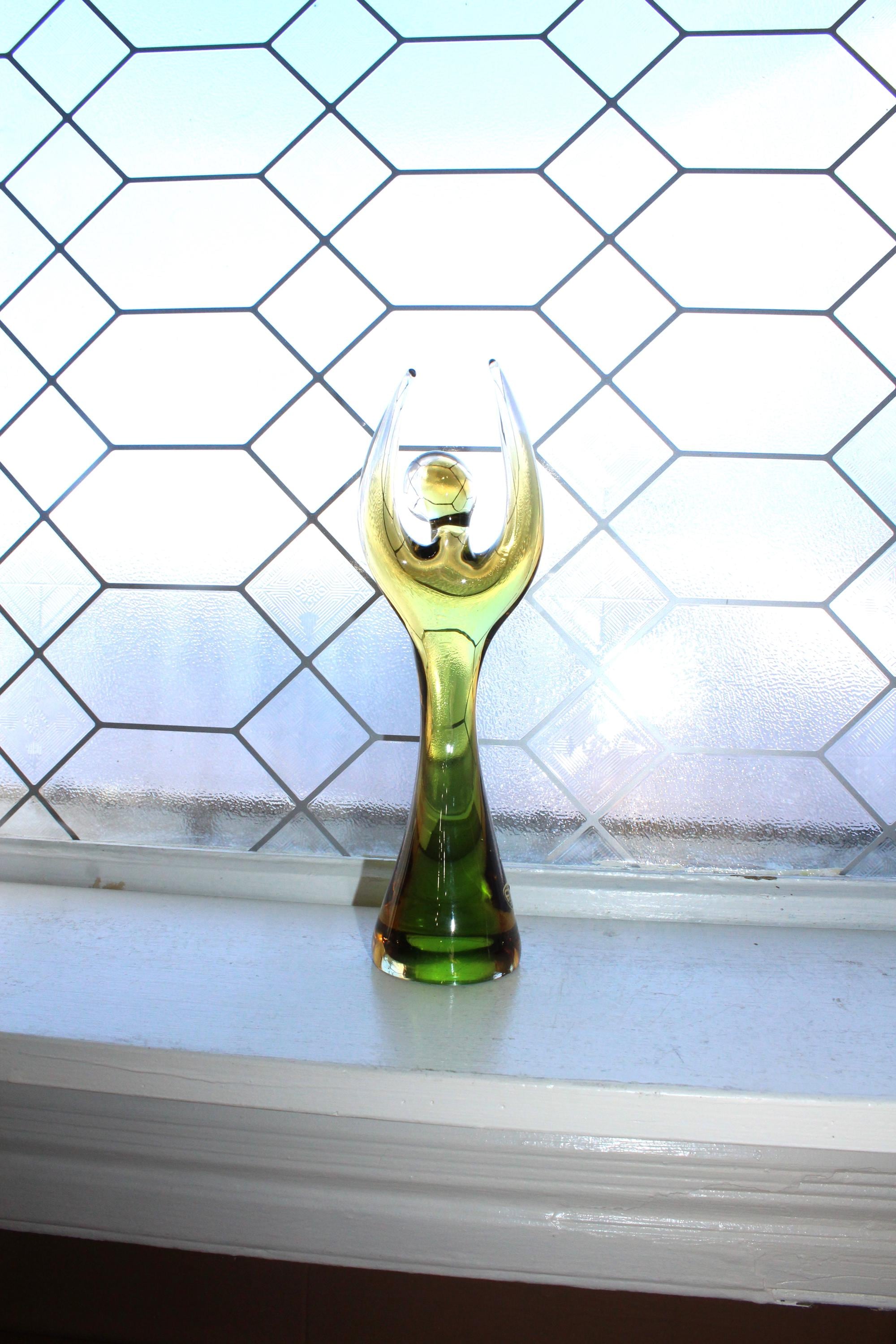 Beautiful FM Konstglas Ronneby Sweden art glass figurine of a green person with arms raised, in excellent condition. The figure measures 9 1/2" high and weighs 1 3/4 lbs. This Scandinavian beauty makes a perfect gift or addition to a collection. Enjoy!