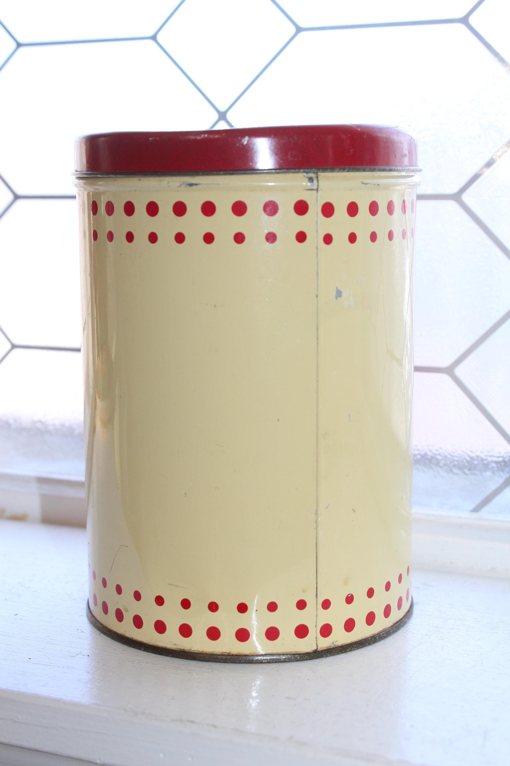 Vintage 1930s Nash Coffee tin featuring a paper label on a tin with bands of red dots on a cream base, with red lid. The tin measures 7 1/4" high x 5" in diameter and looks great. Enjoy!
