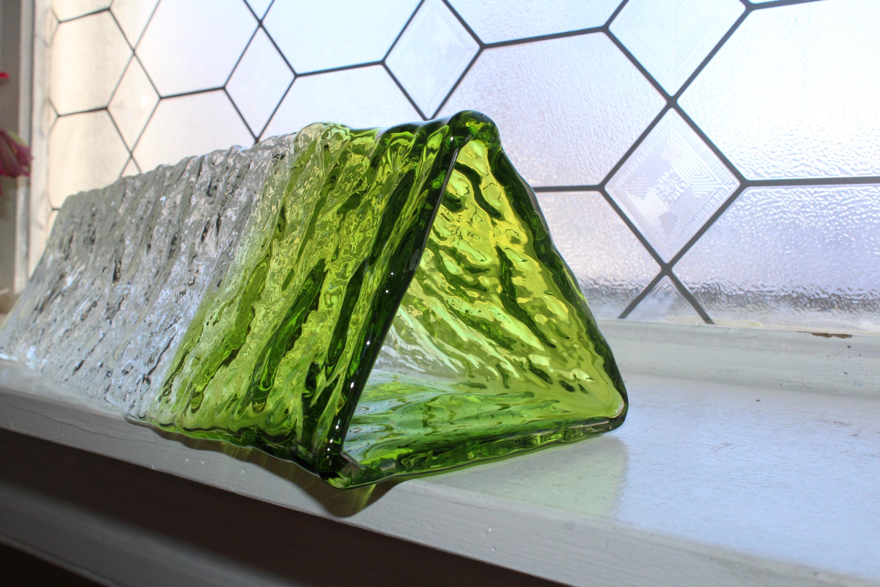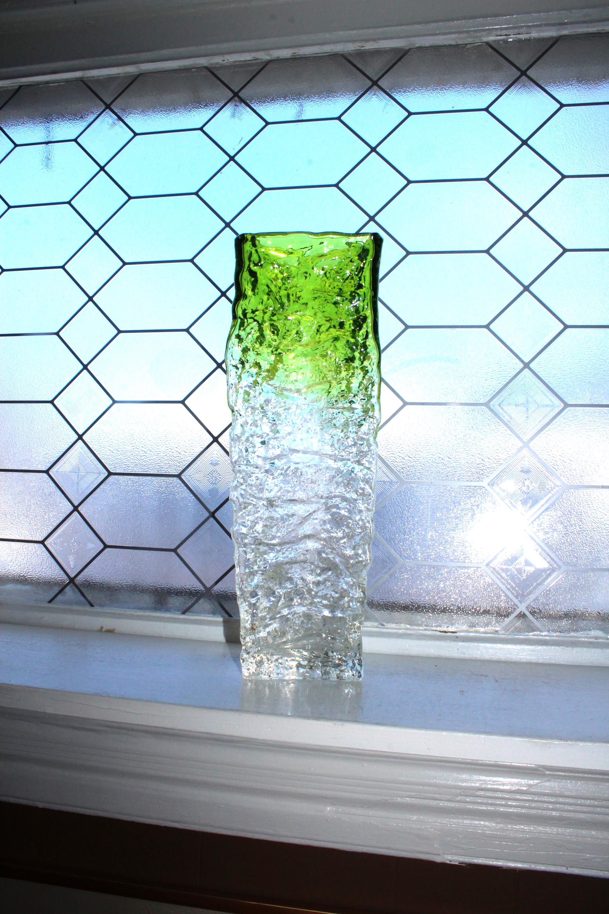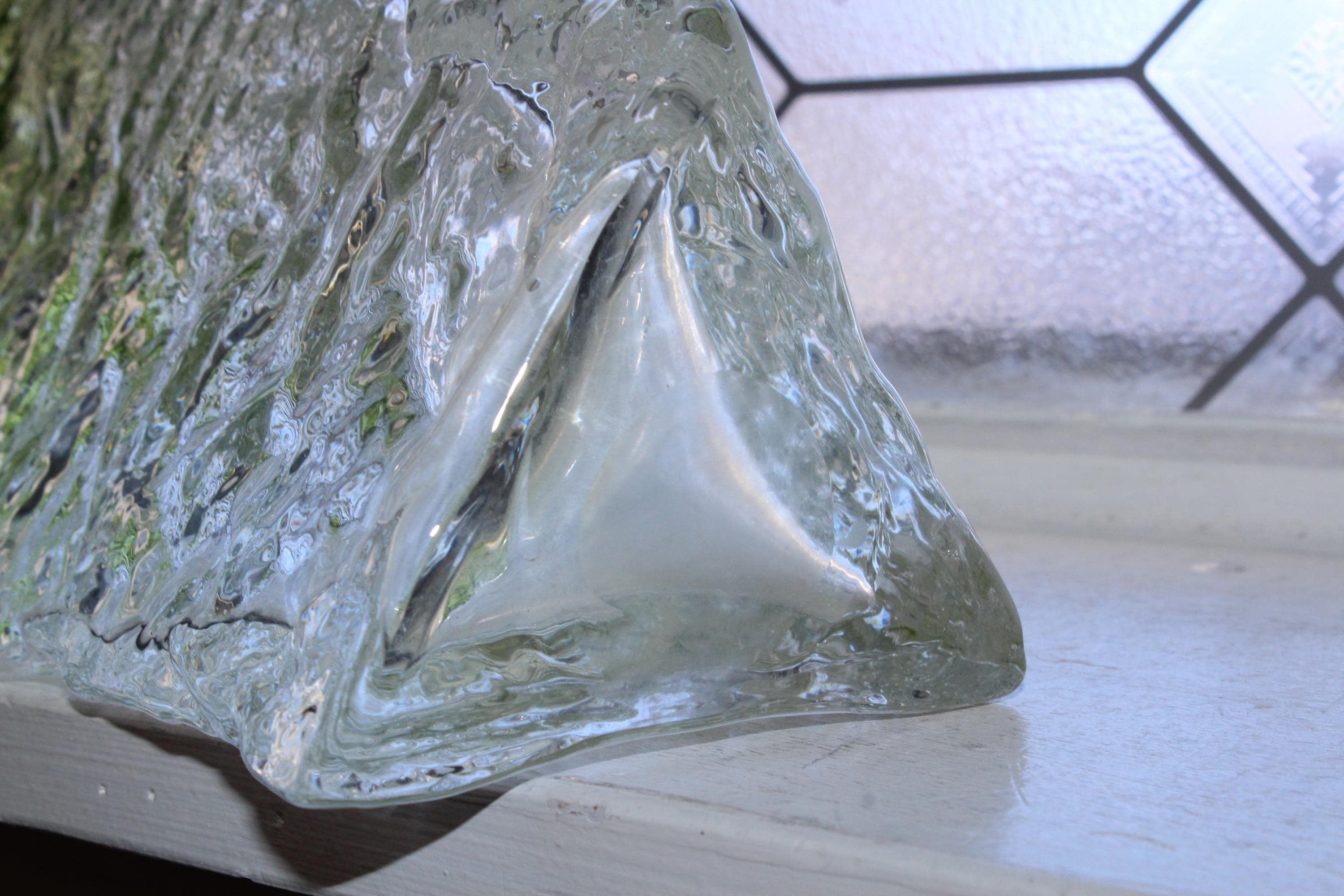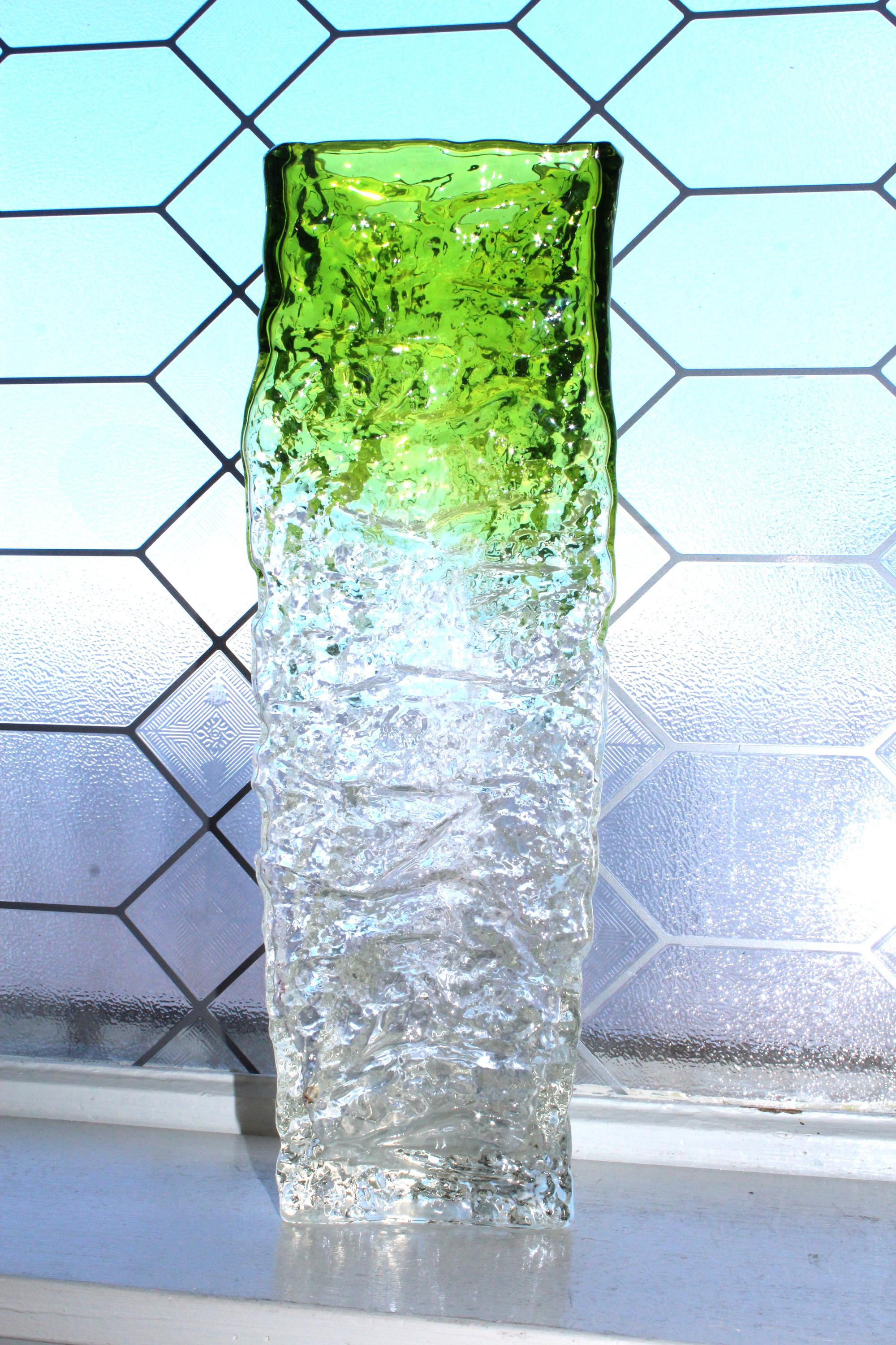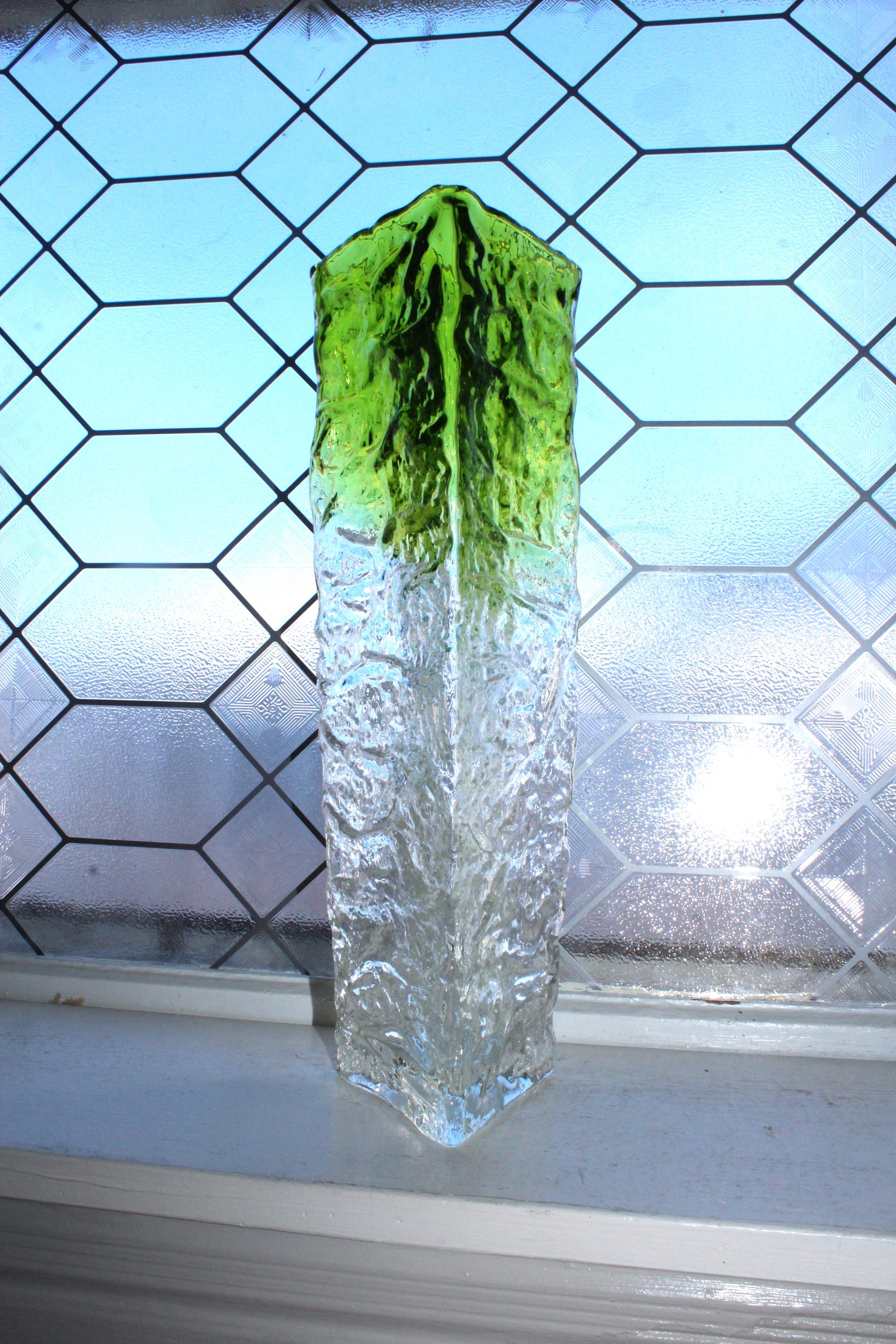 This is a large vintage Kumela Glass Finland Kallio textured glass triangle bark vase in green and clear, designed by Kaj Blomqvist. It is gorgeous and in excellent condition. The vase measures 14" high and weighs 4 1/2 lbs. No chips or cracks. This Scandinavian beauty displays very well. Enjoy!