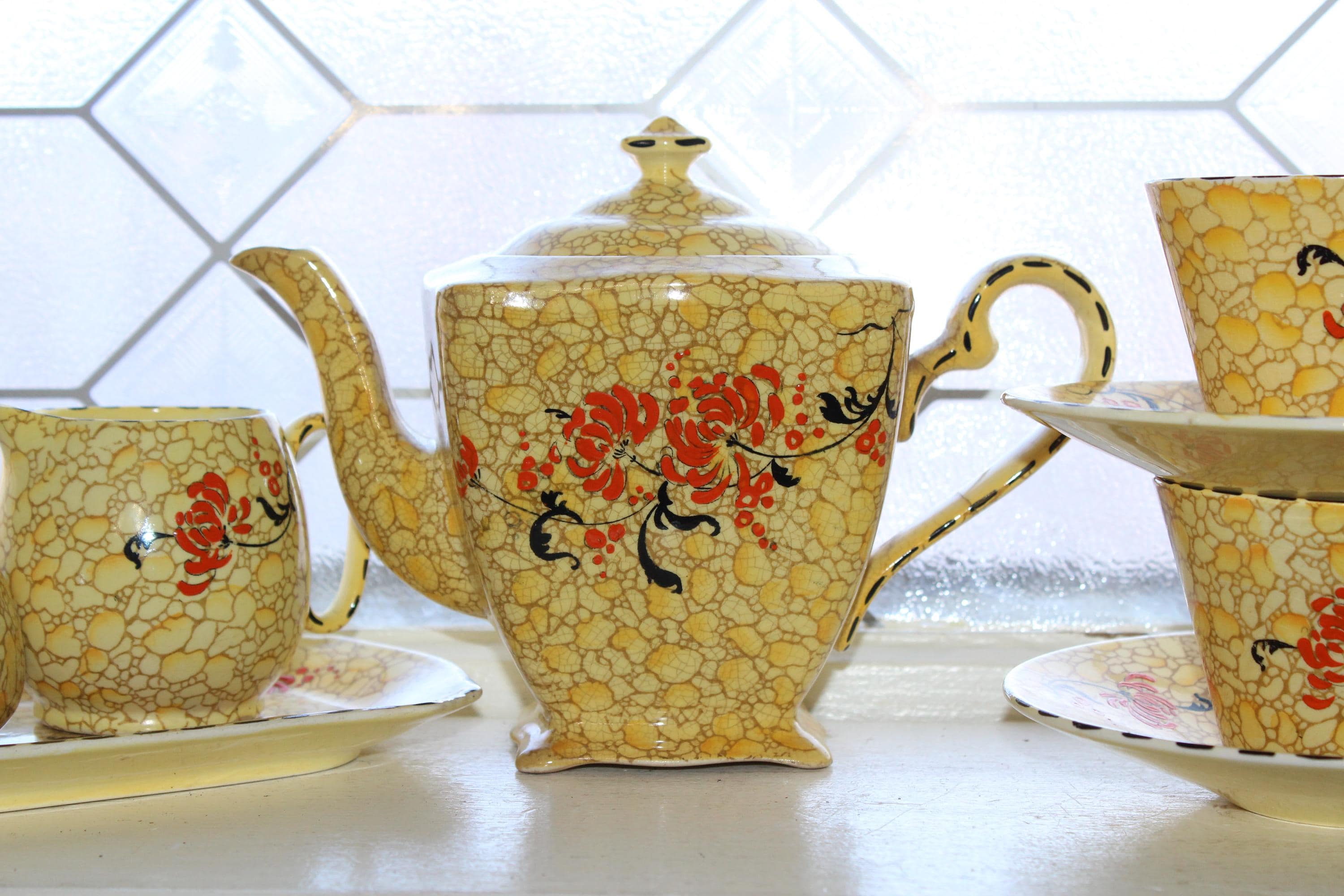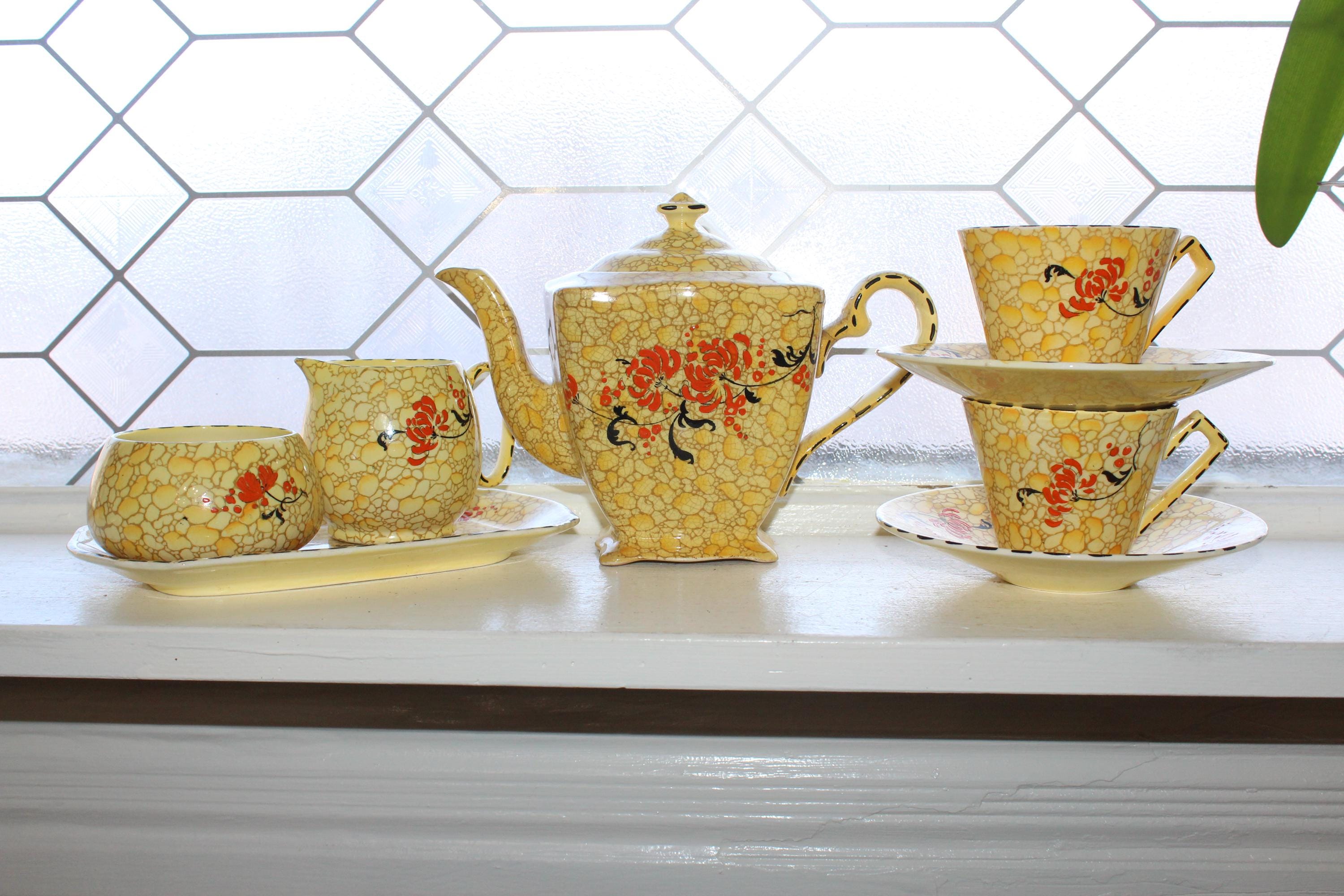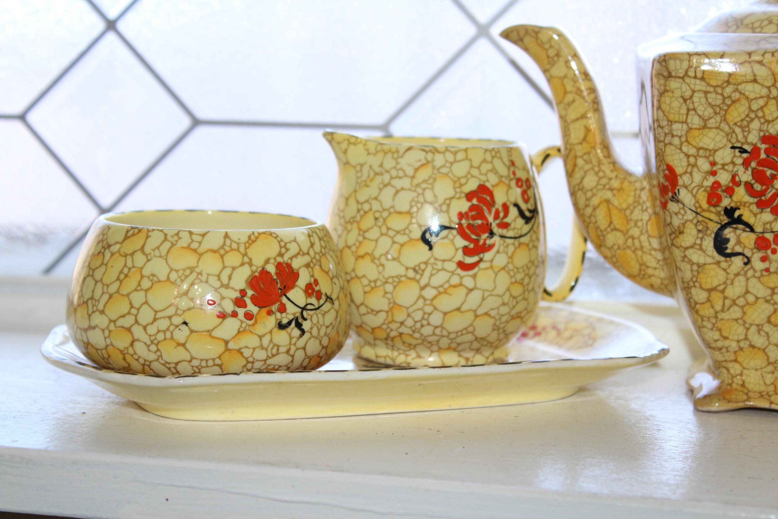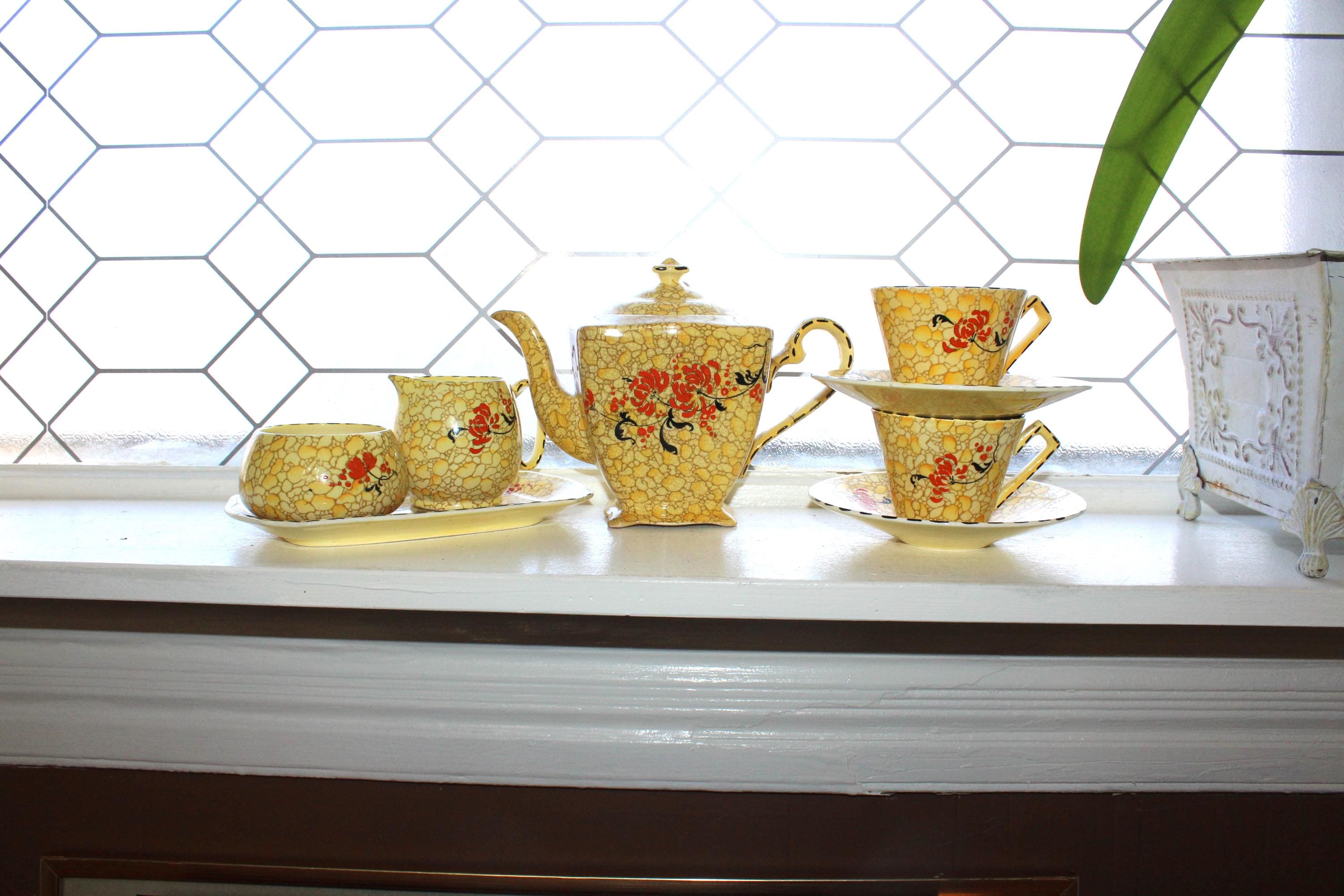 Vintage Royal Winton Grimwades yellow pebble chintz tea set. The set includes a teapot with lid, creamer, sugar, tray, 2 cups and 2 saucers. The teapot has damage as shown in the photos, and the sugar has interior discoloring, no other issues, displays very well. Enjoy!