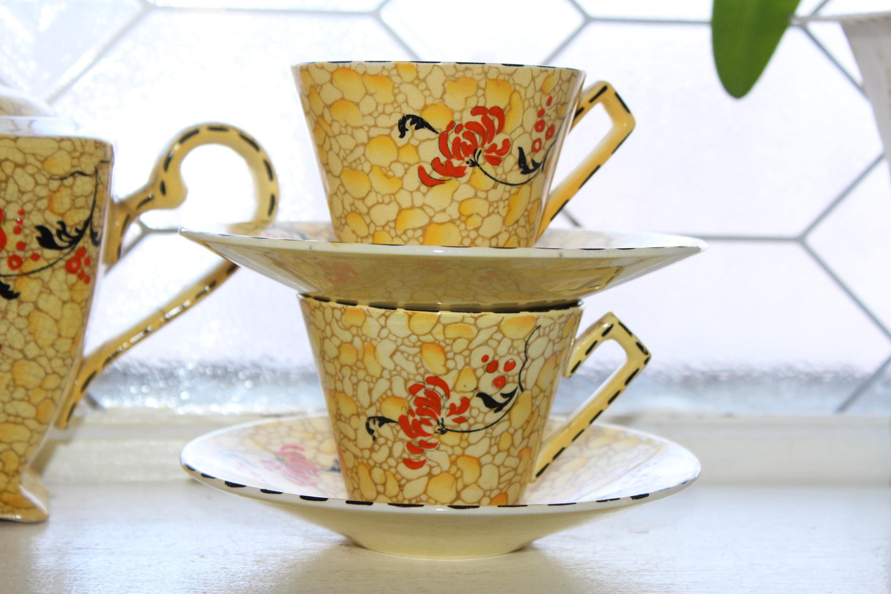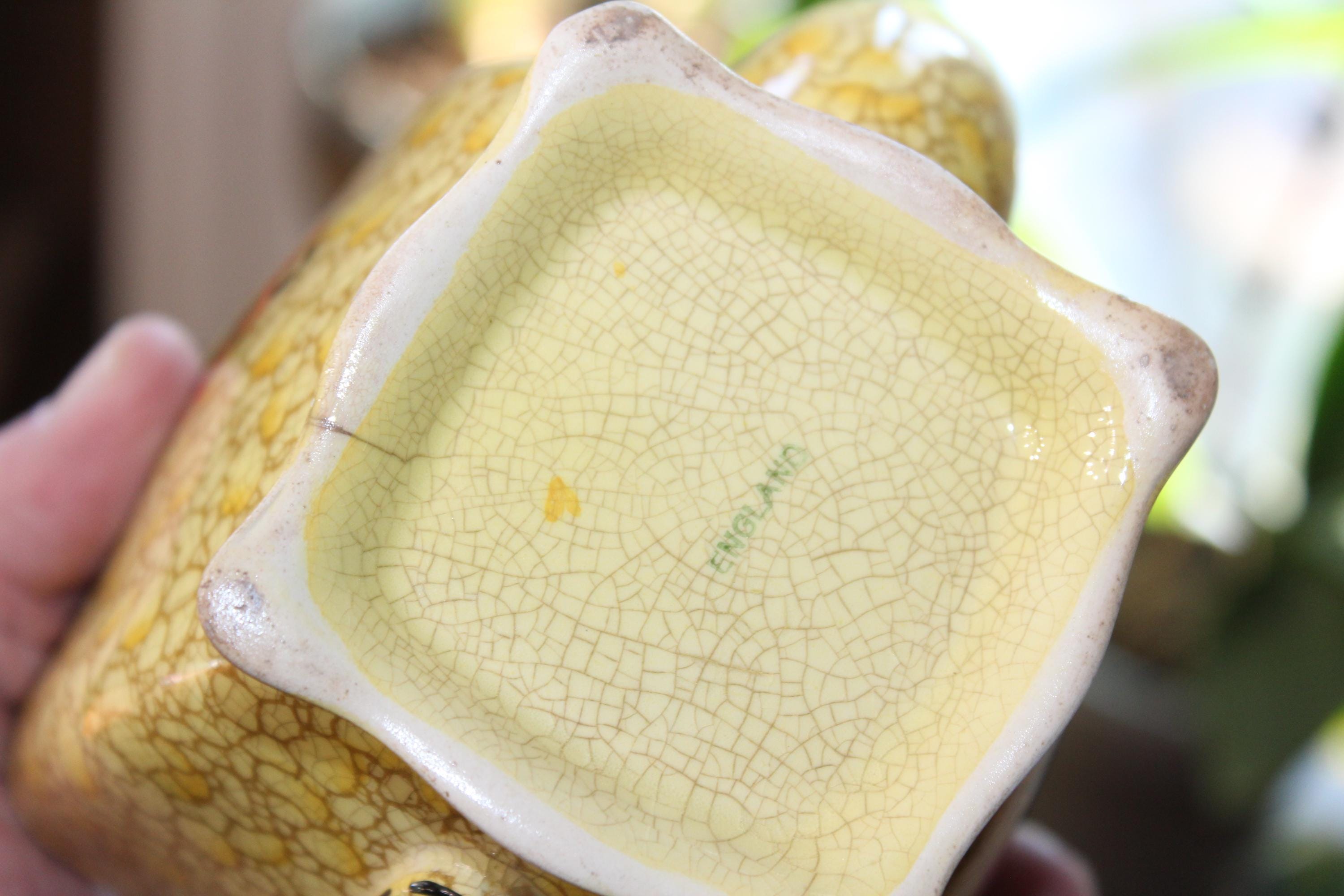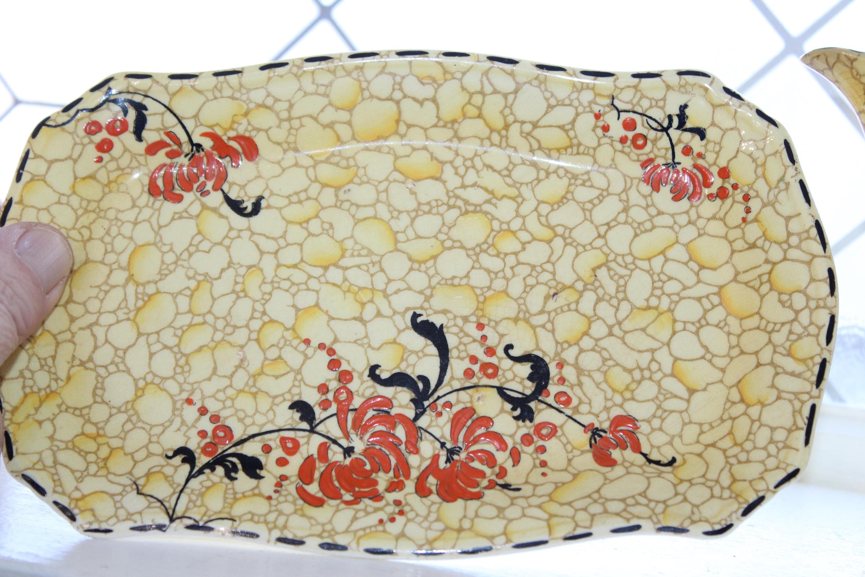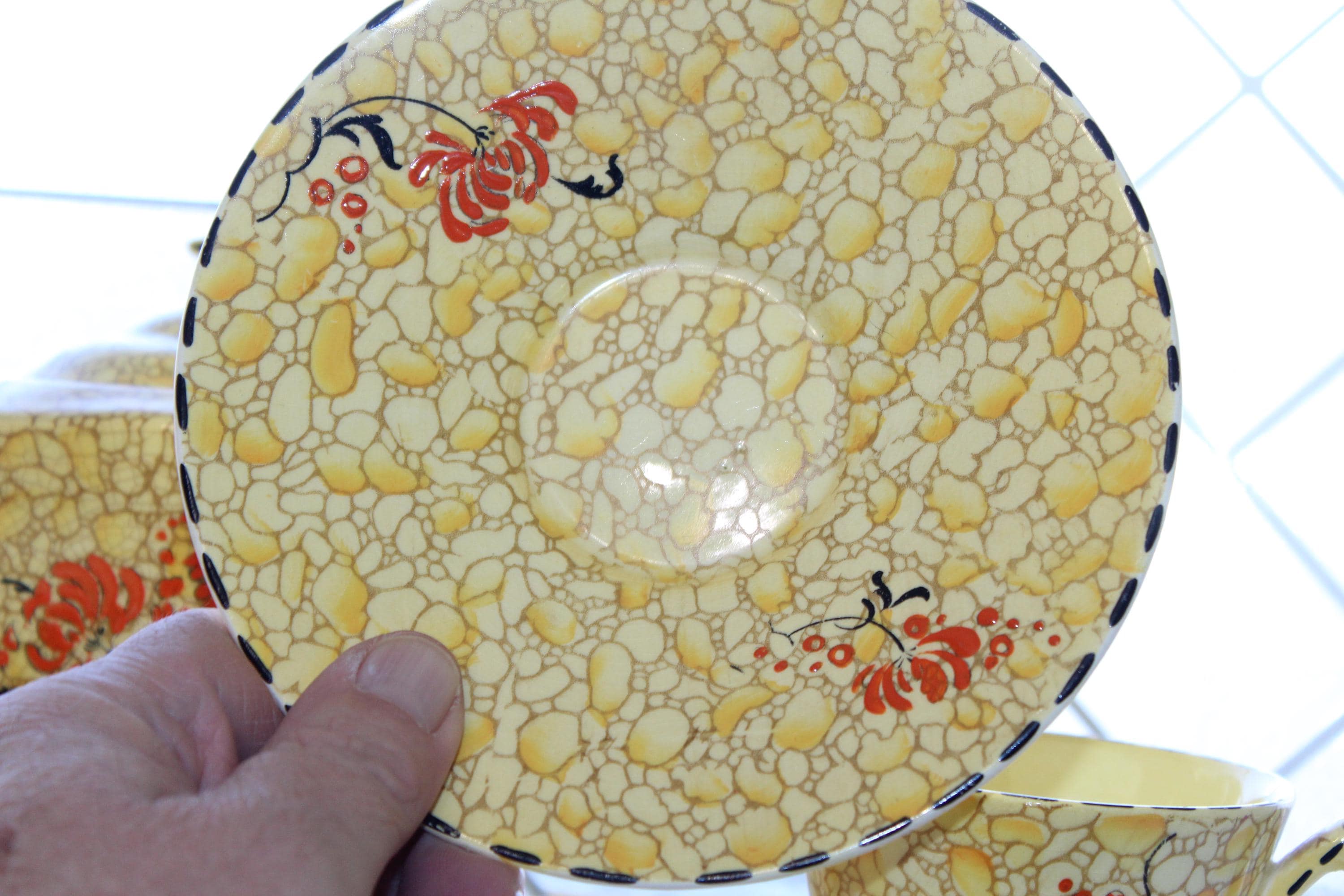 Vintage Royal Winton Grimwades yellow pebble chintz tea set. The set includes a teapot with lid, creamer, sugar, tray, 2 cups and 2 saucers. The teapot has damage as shown in the photos, and the sugar has interior discoloring, no other issues, displays very well. Enjoy!