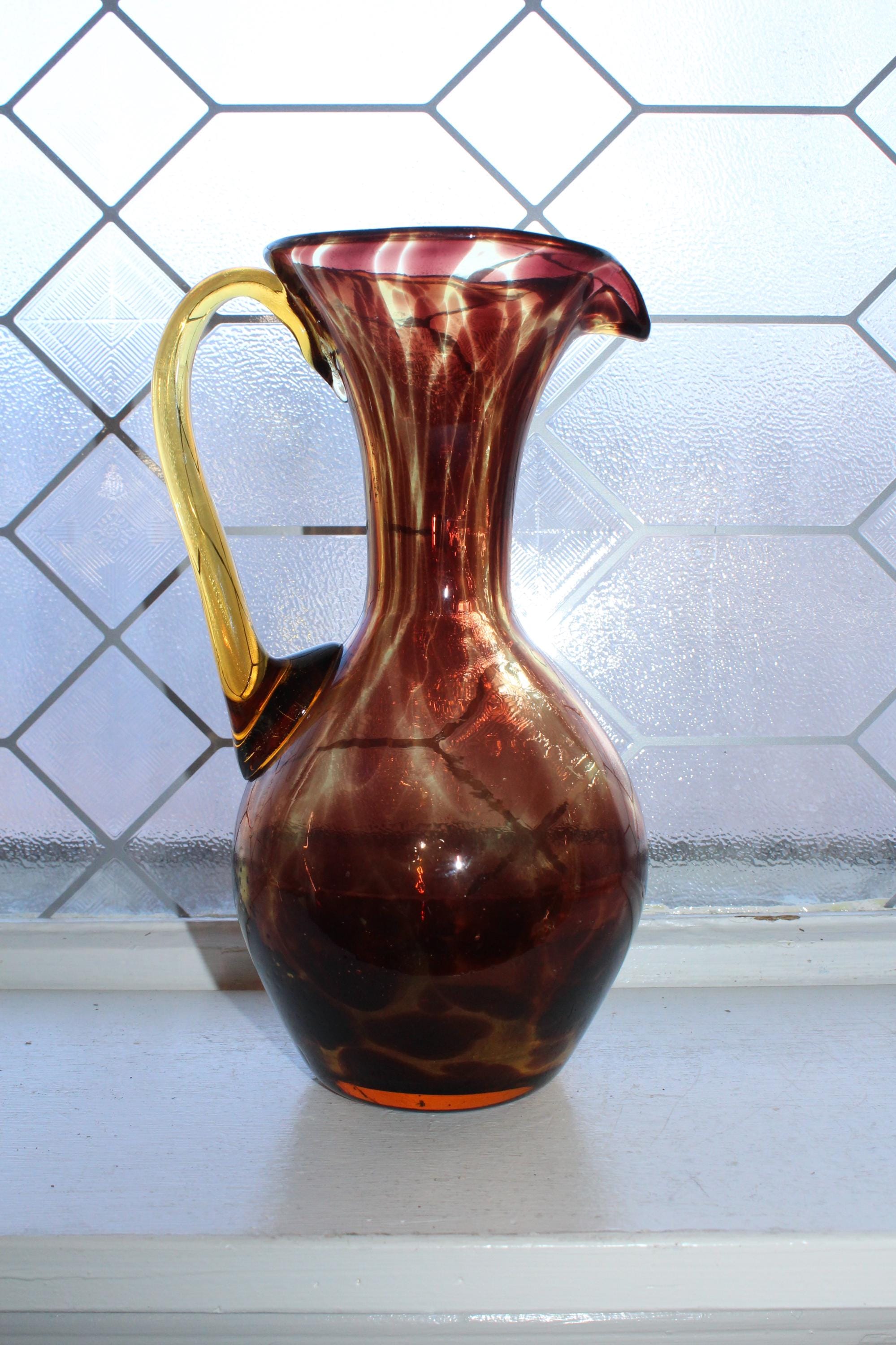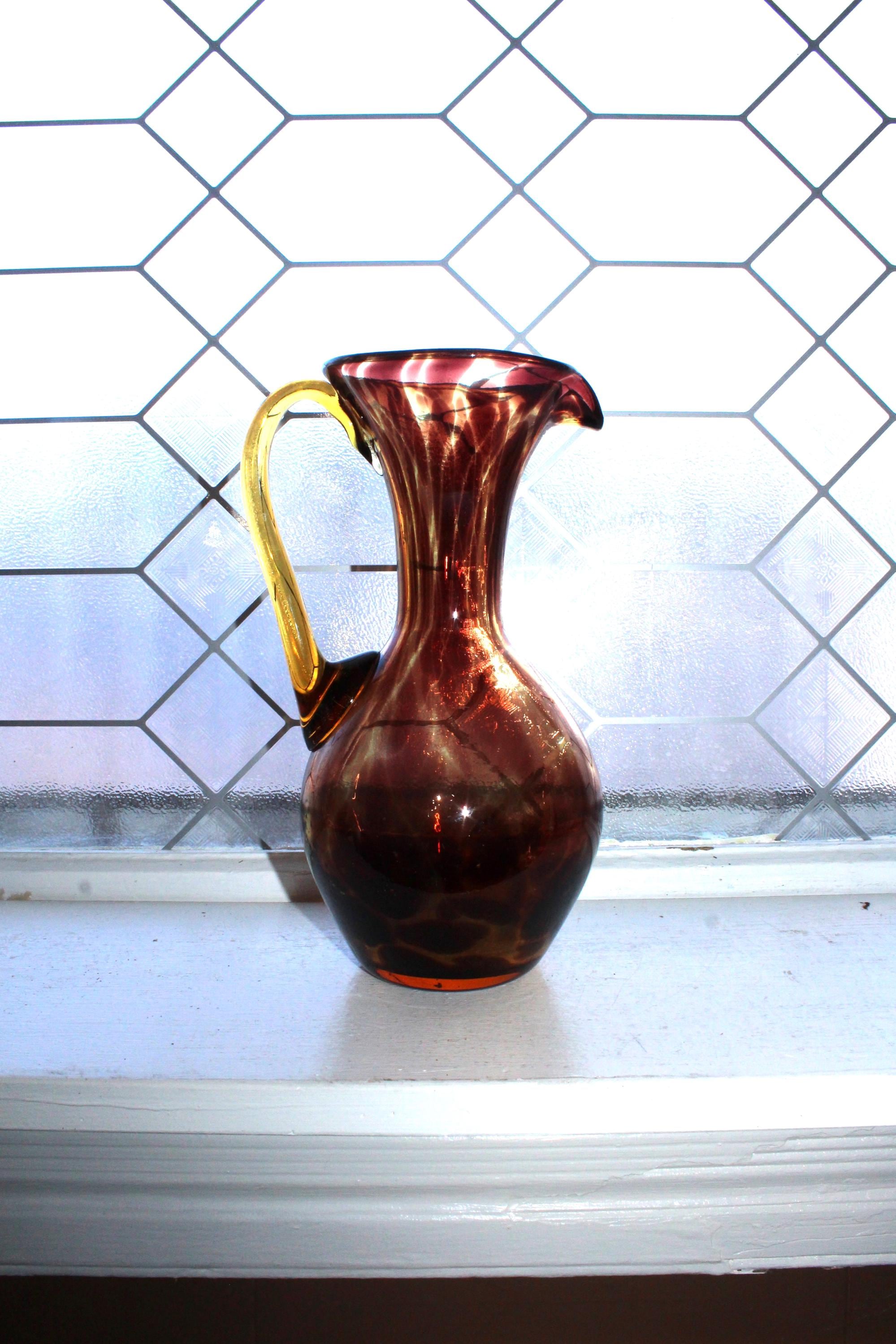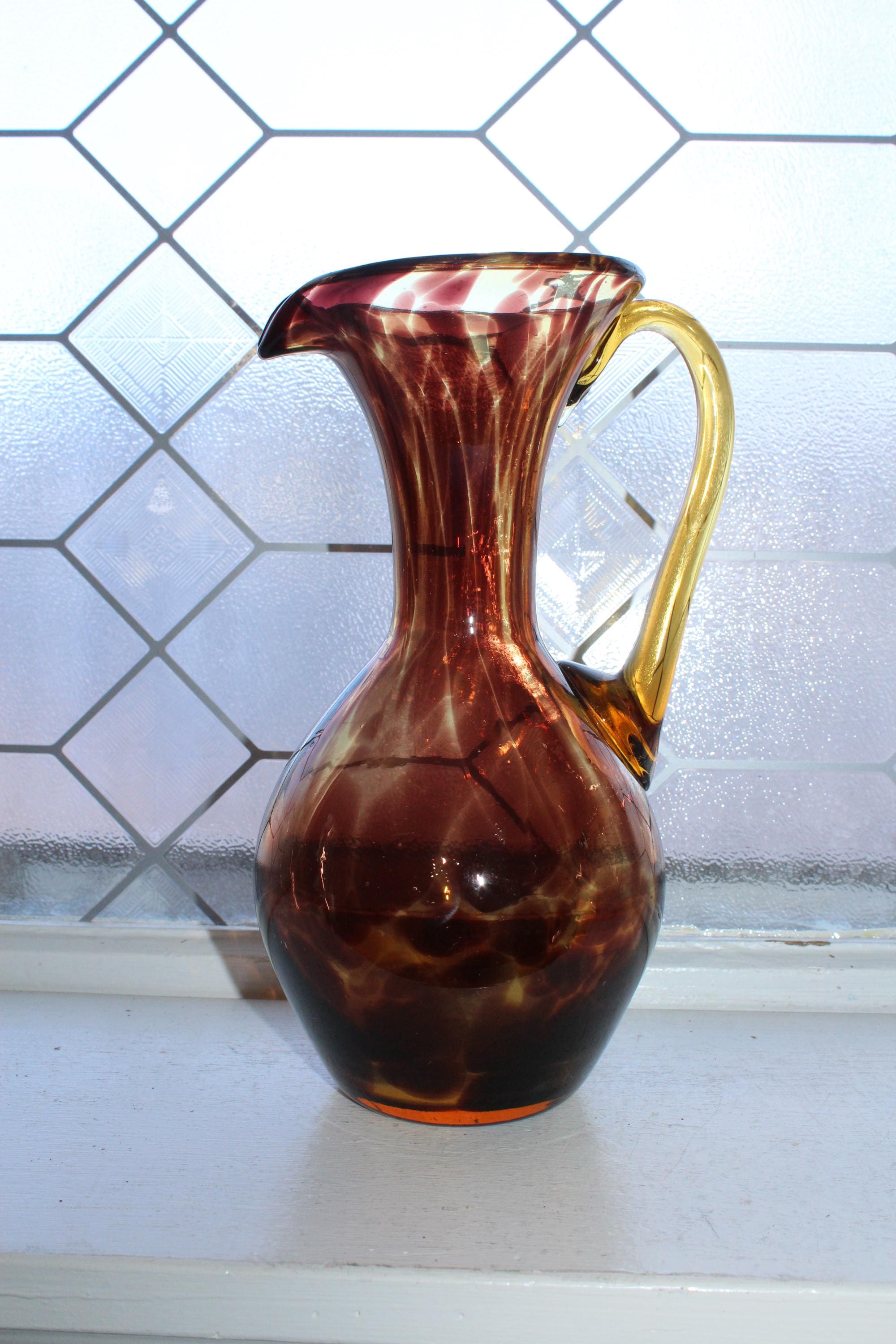 Vintage Mid Century tortoise shell art glass pitcher with applied amber glass handle, in good condition and perfect for martinis. The pitcher measures 9" high and has no chips or cracks, just some age appropriate minor wear. It displays very well. Enjoy!