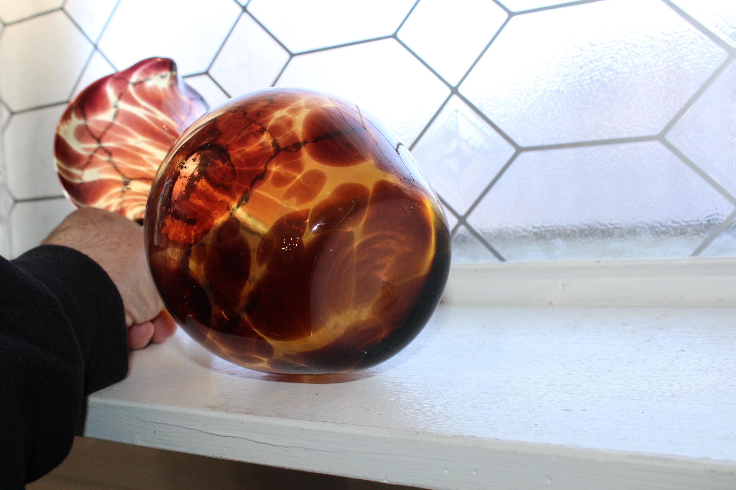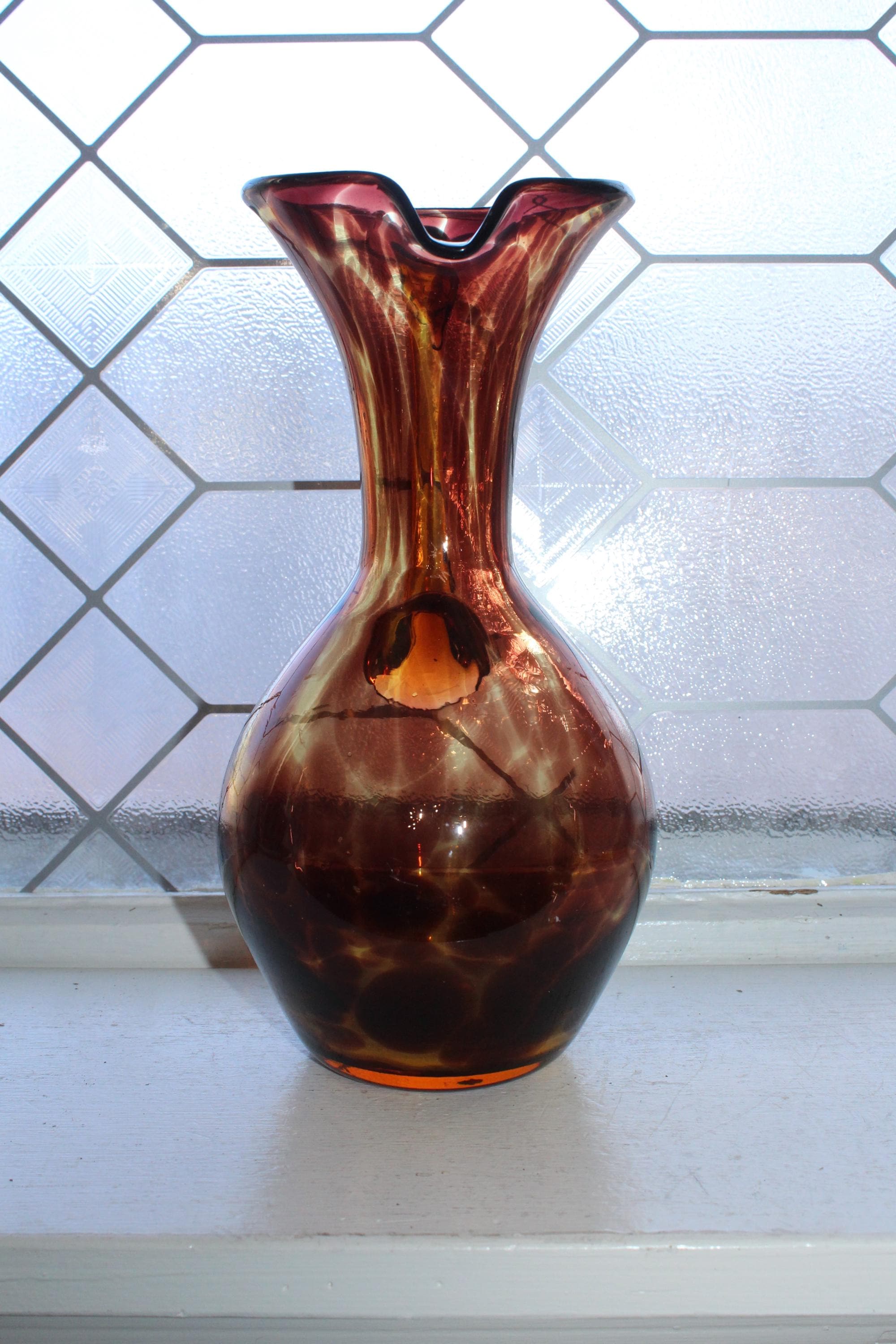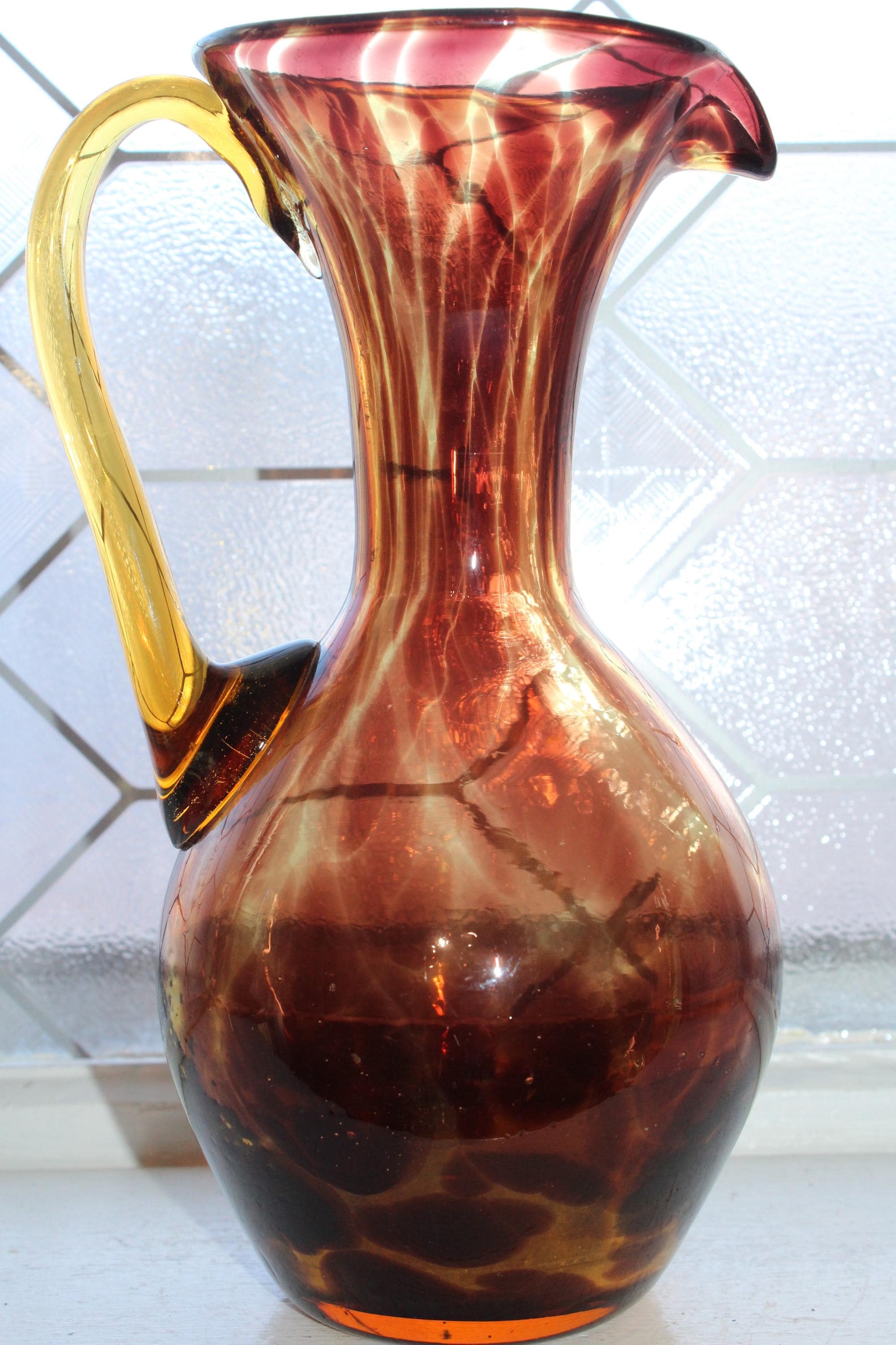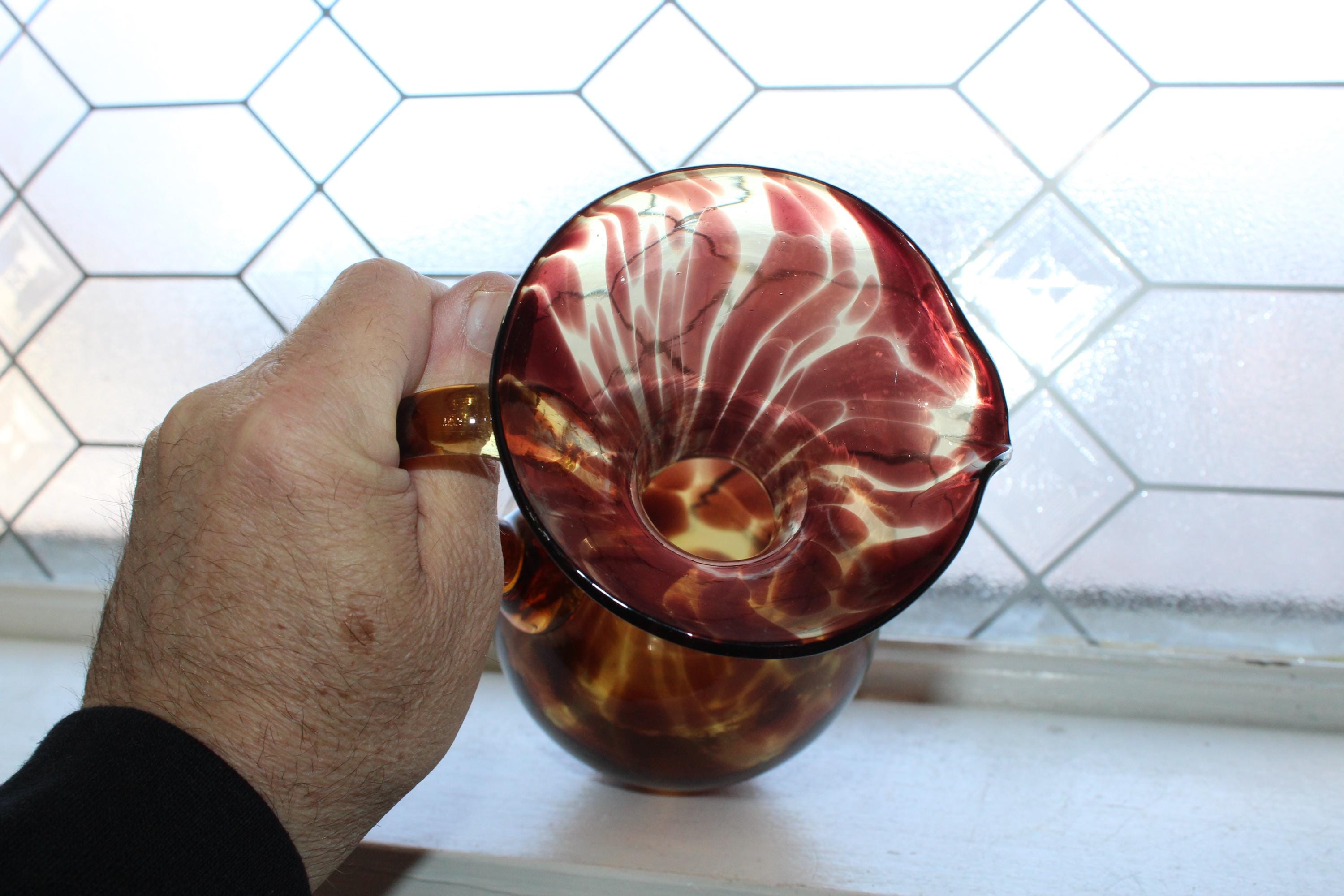 Vintage Mid Century tortoise shell art glass pitcher with applied amber glass handle, in good condition and perfect for martinis. The pitcher measures 9" high and has no chips or cracks, just some age appropriate minor wear. It displays very well. Enjoy!