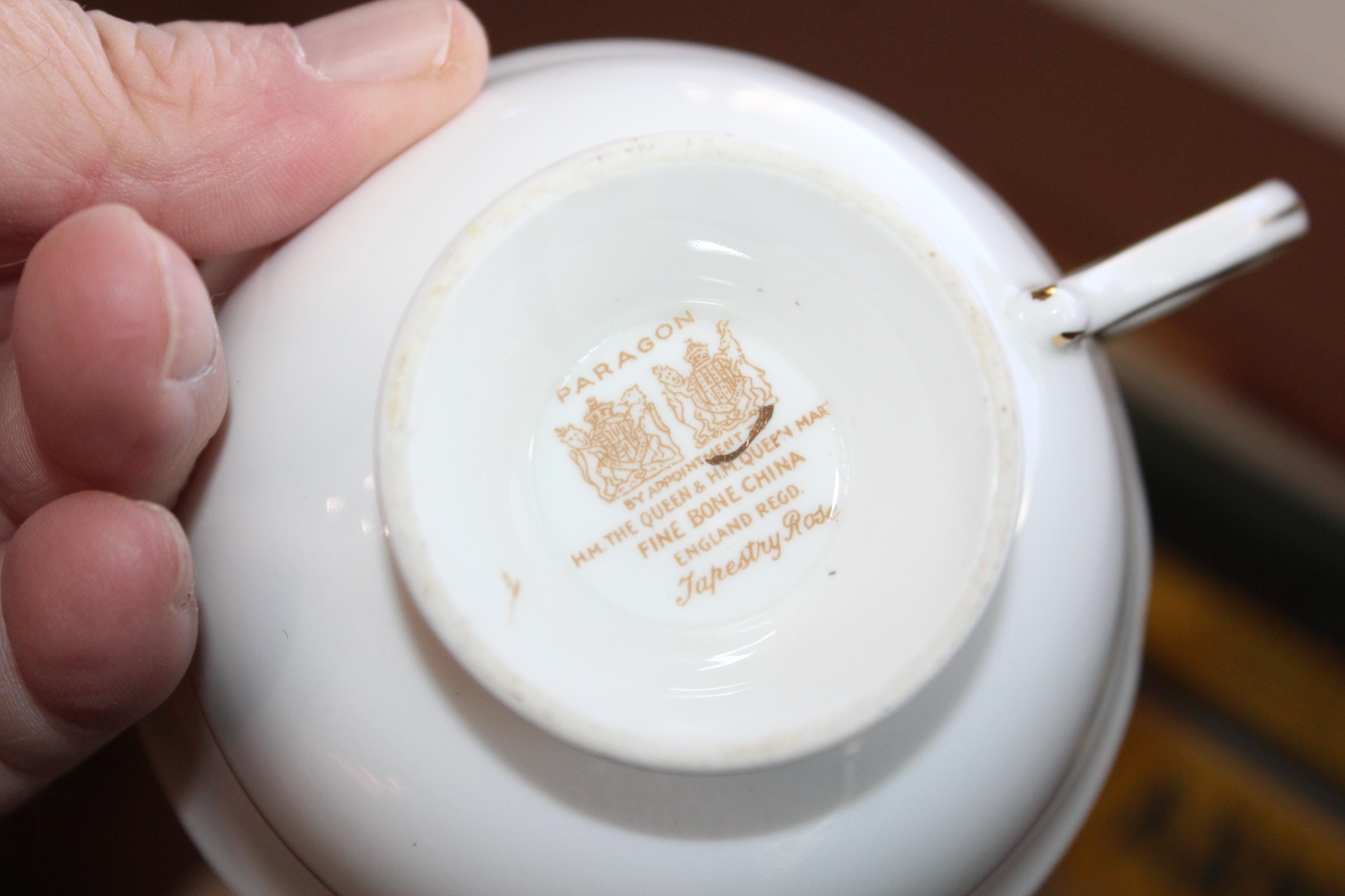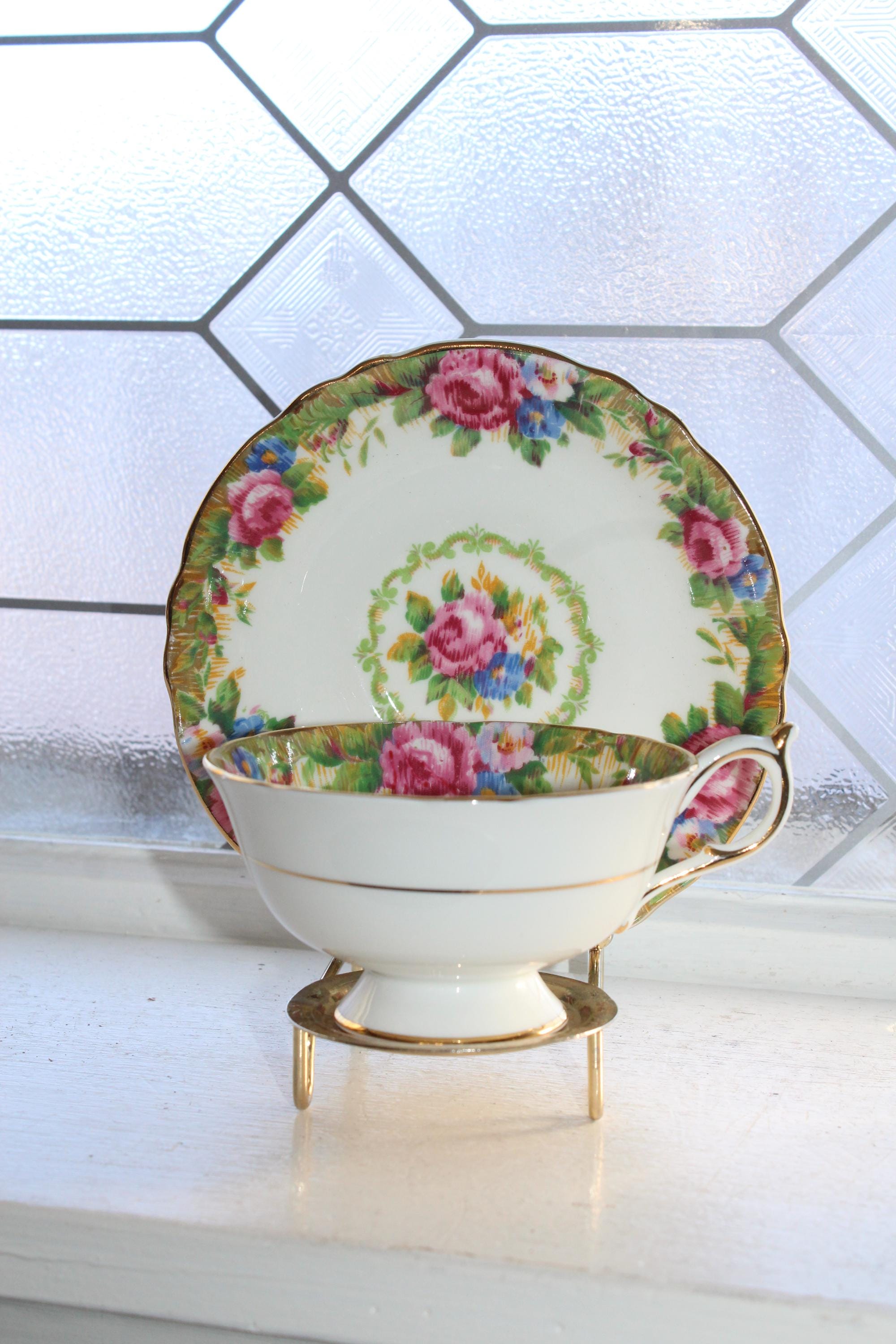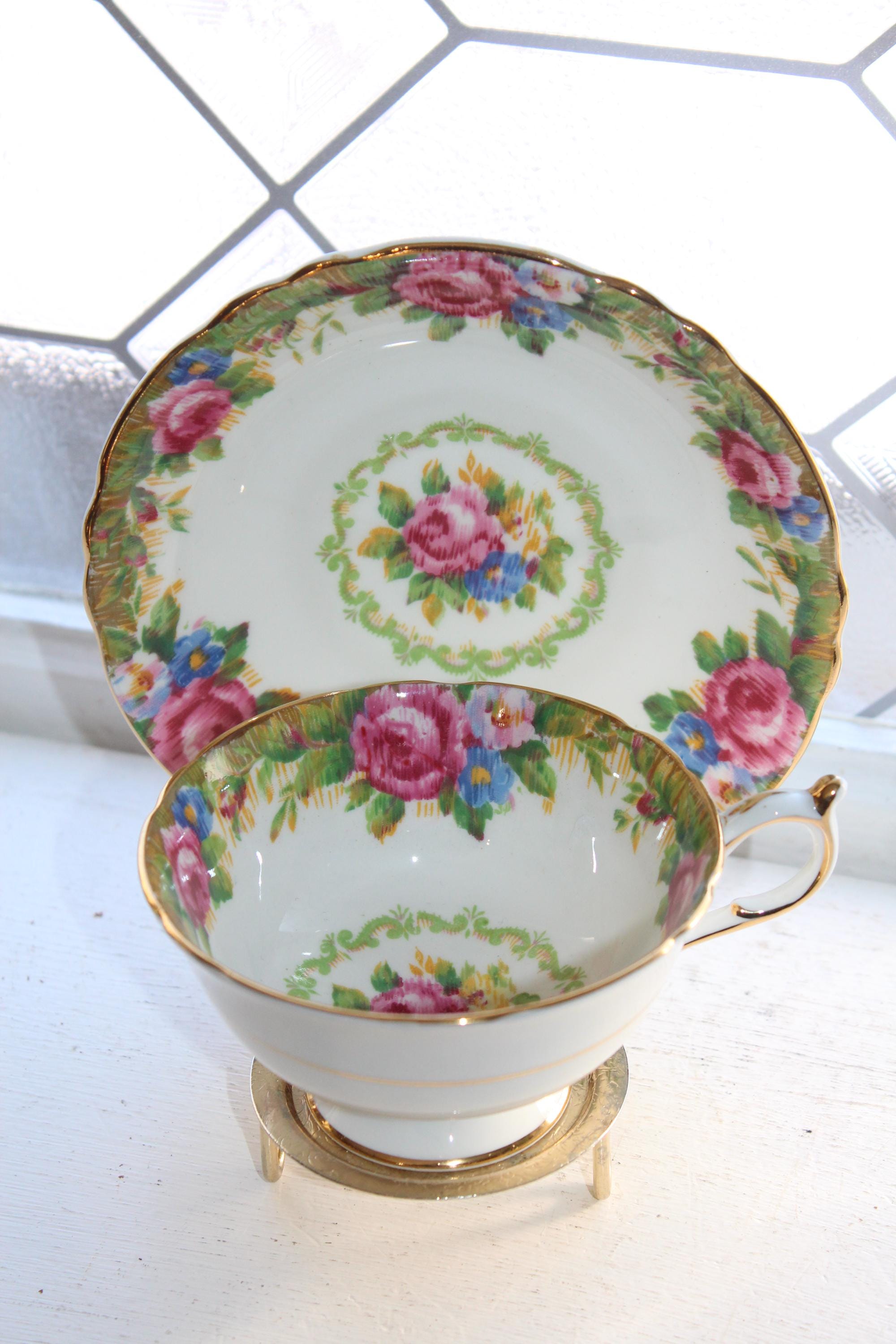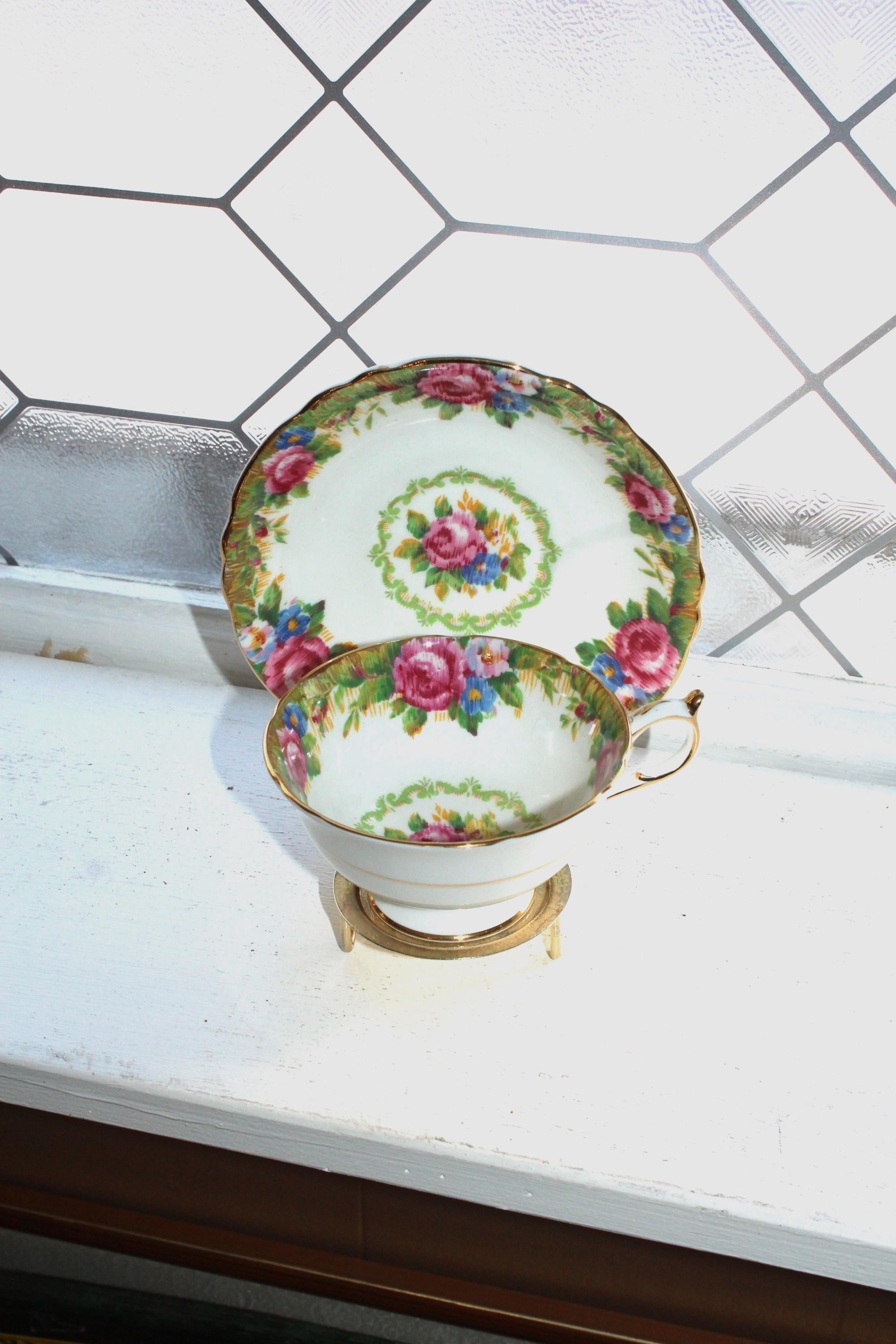 This vintage Paragon fine bone china tea cup and saucer set is just gorgeous! Made in England with a double warrant, it is in excellent condition and features the beautiful Tapestry Rose pattern. The cup measures 2 1/8" high x 4" in diameter and the saucer measures 5 1/2" in diameter. There are no chips or cracks and it displays well. Enjoy!