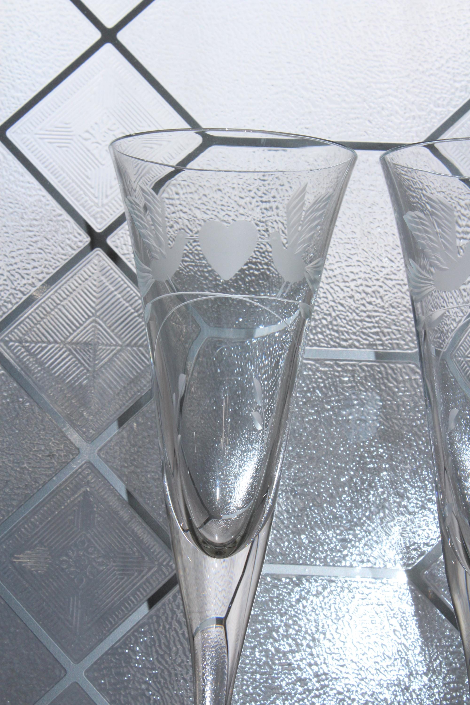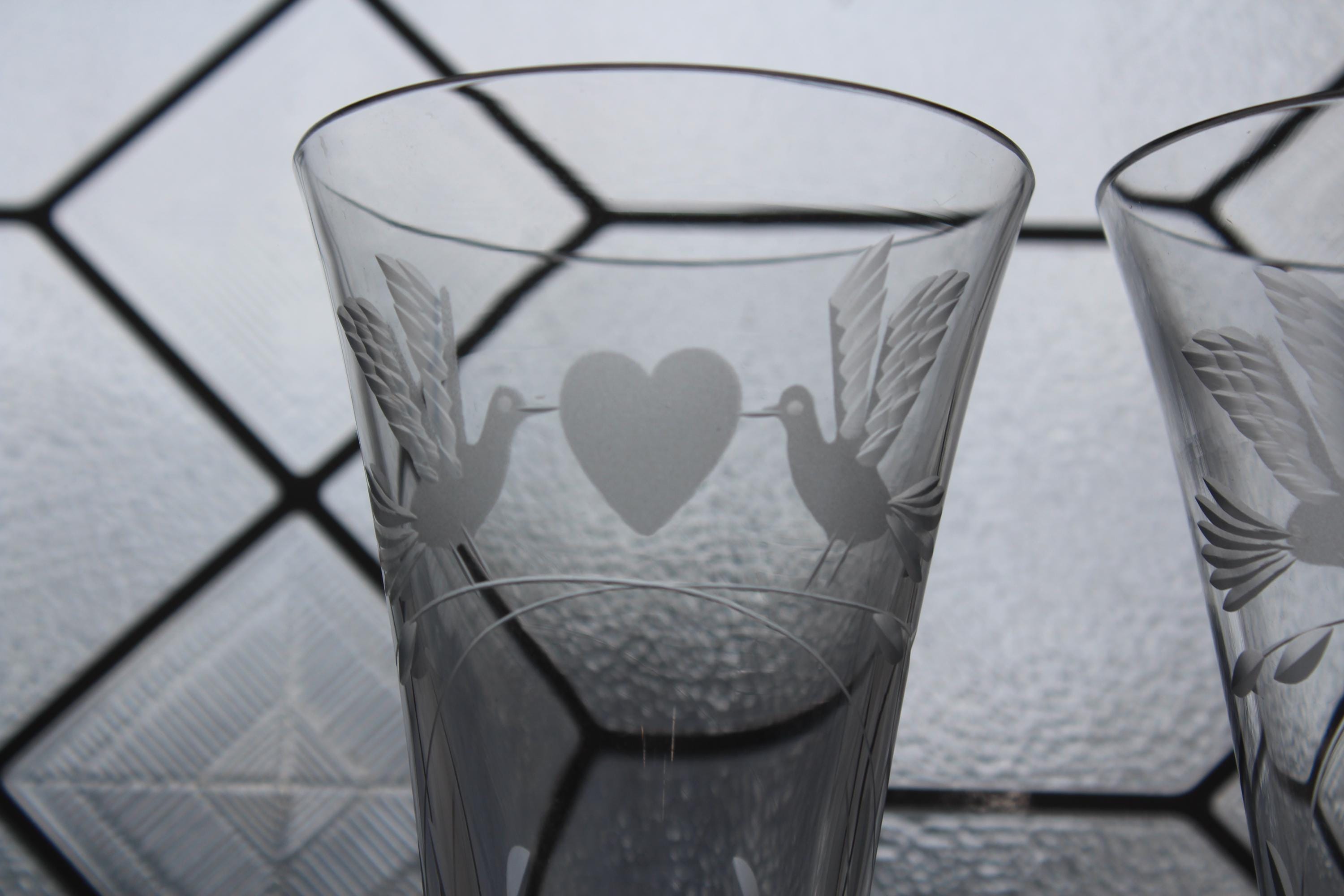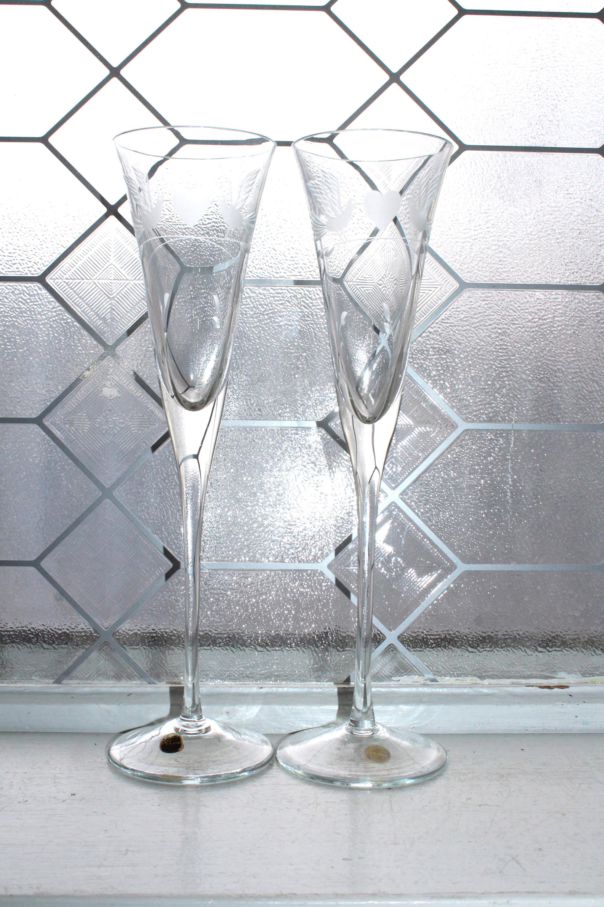 Pair of large vintage Colony Forever pattern European hand cut and mouth blown crystal champagne toasting flutes/glasses featuring love birds and hearts, in excellent condition. Each glass measures 11 1/4" high. No chips or cracks, perfect for use or display. Enjoy!