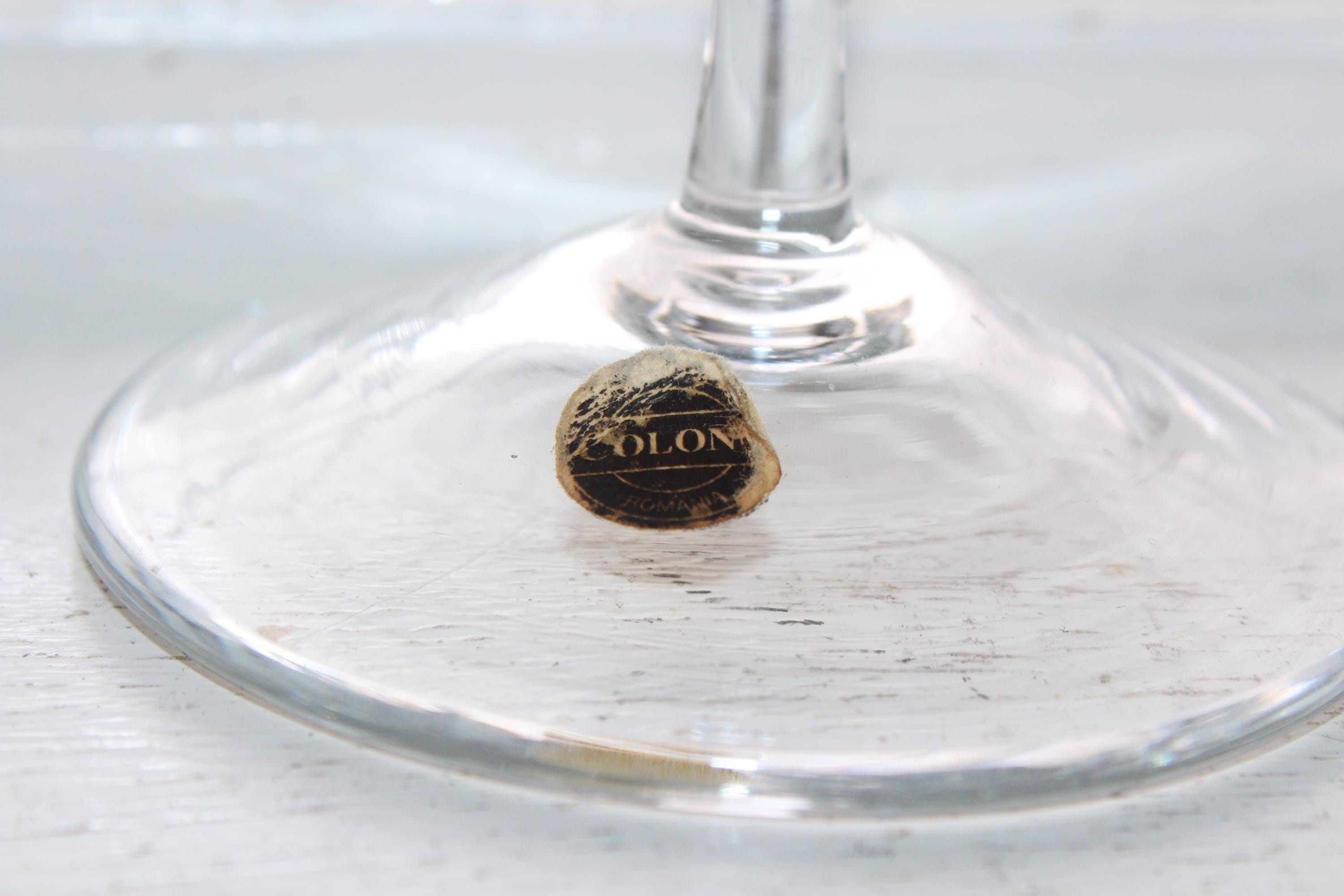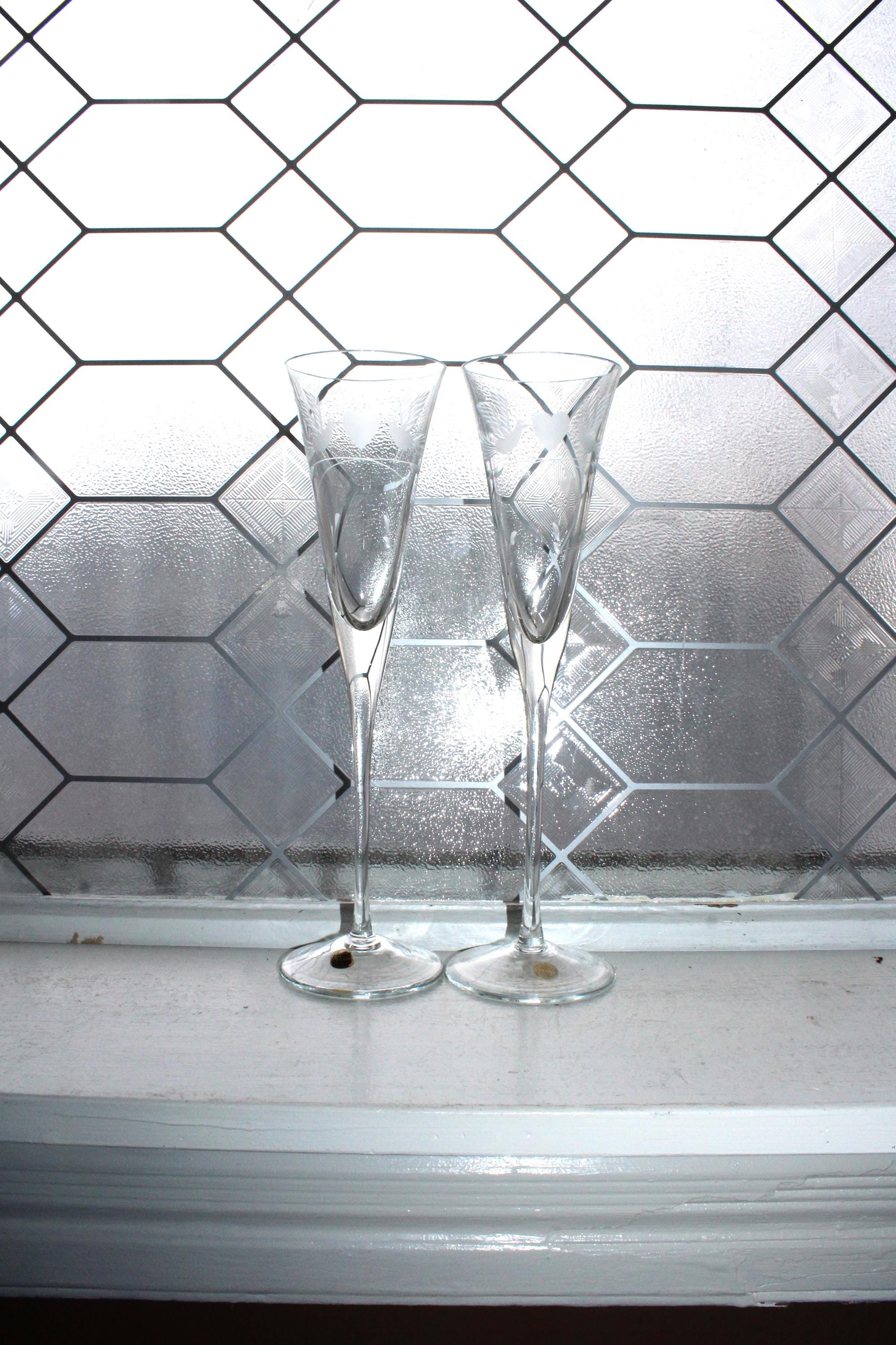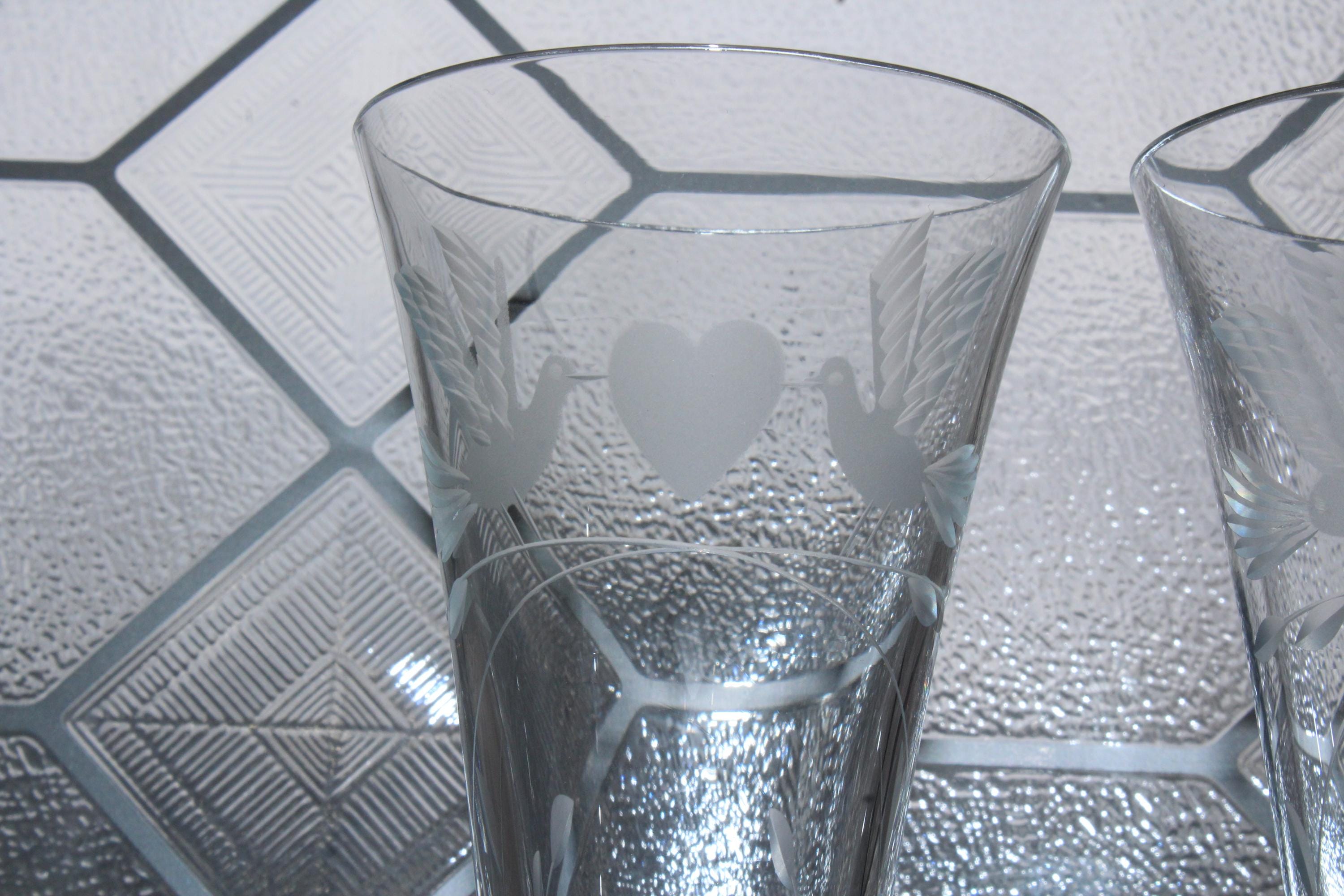 Pair of large vintage Colony Forever pattern European hand cut and mouth blown crystal champagne toasting flutes/glasses featuring love birds and hearts, in excellent condition. Each glass measures 11 1/4" high. No chips or cracks, perfect for use or display. Enjoy!