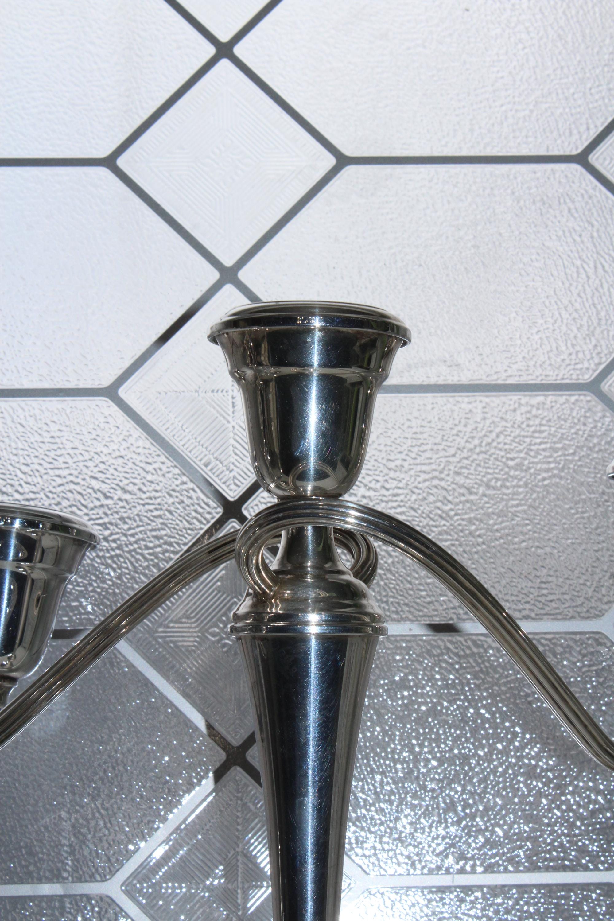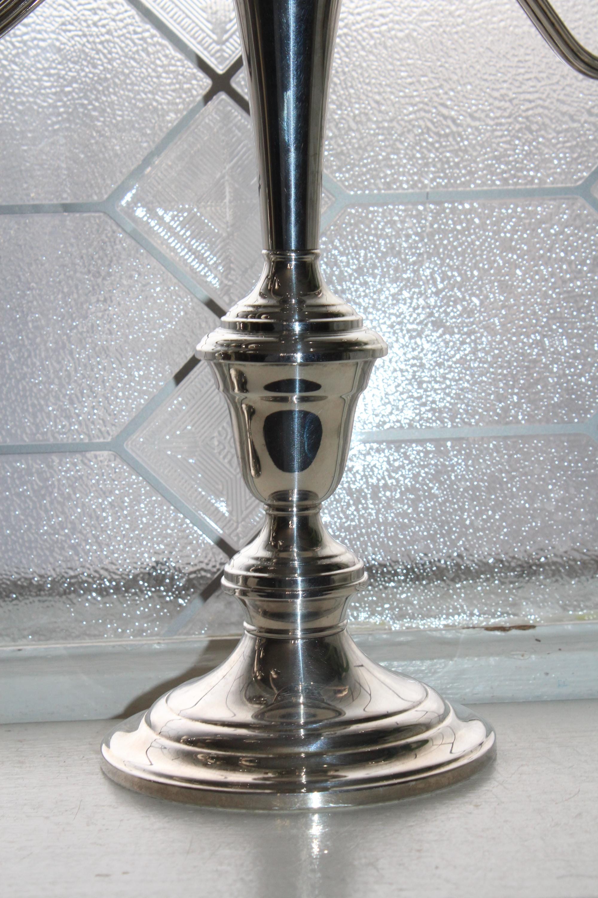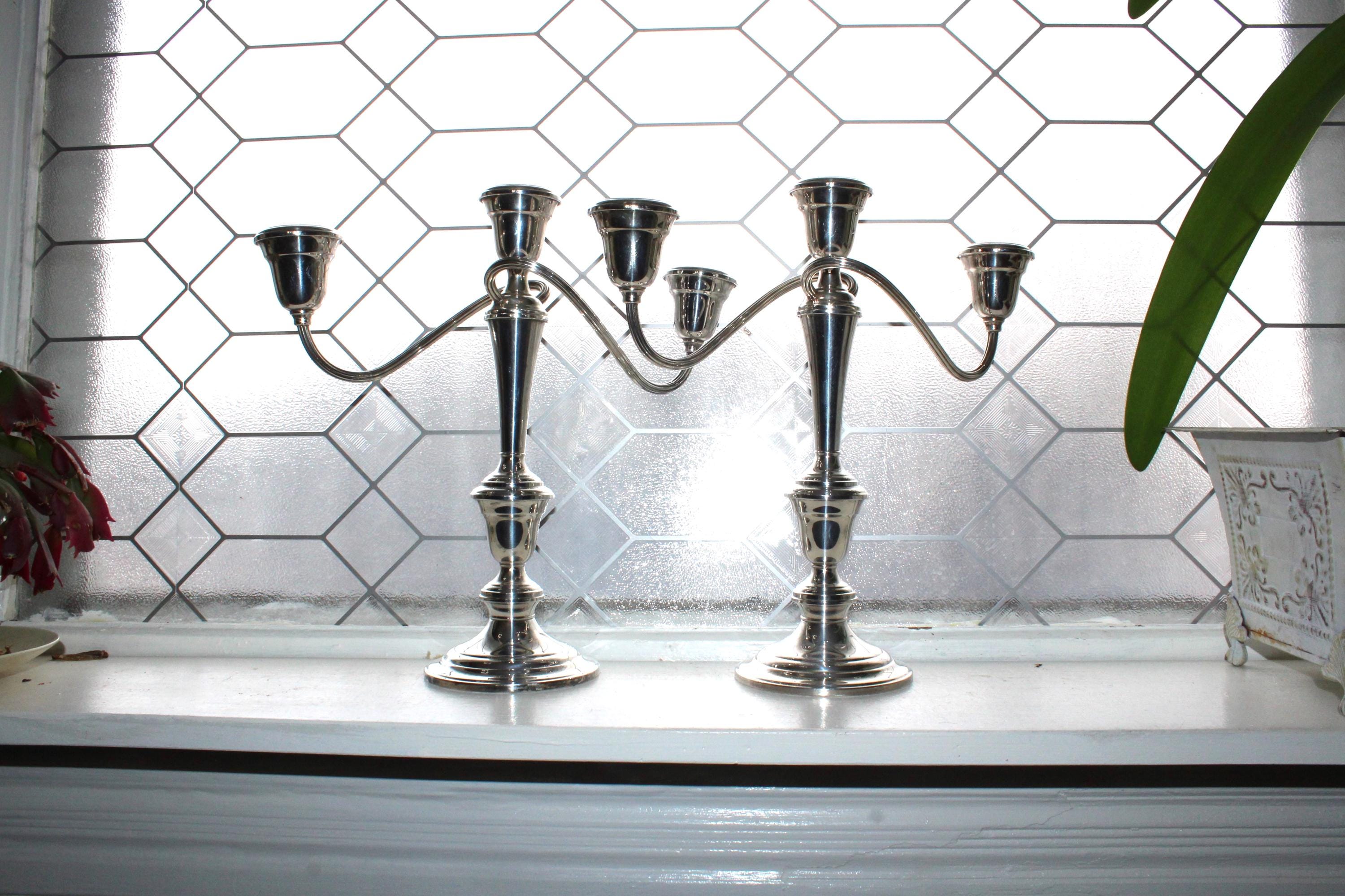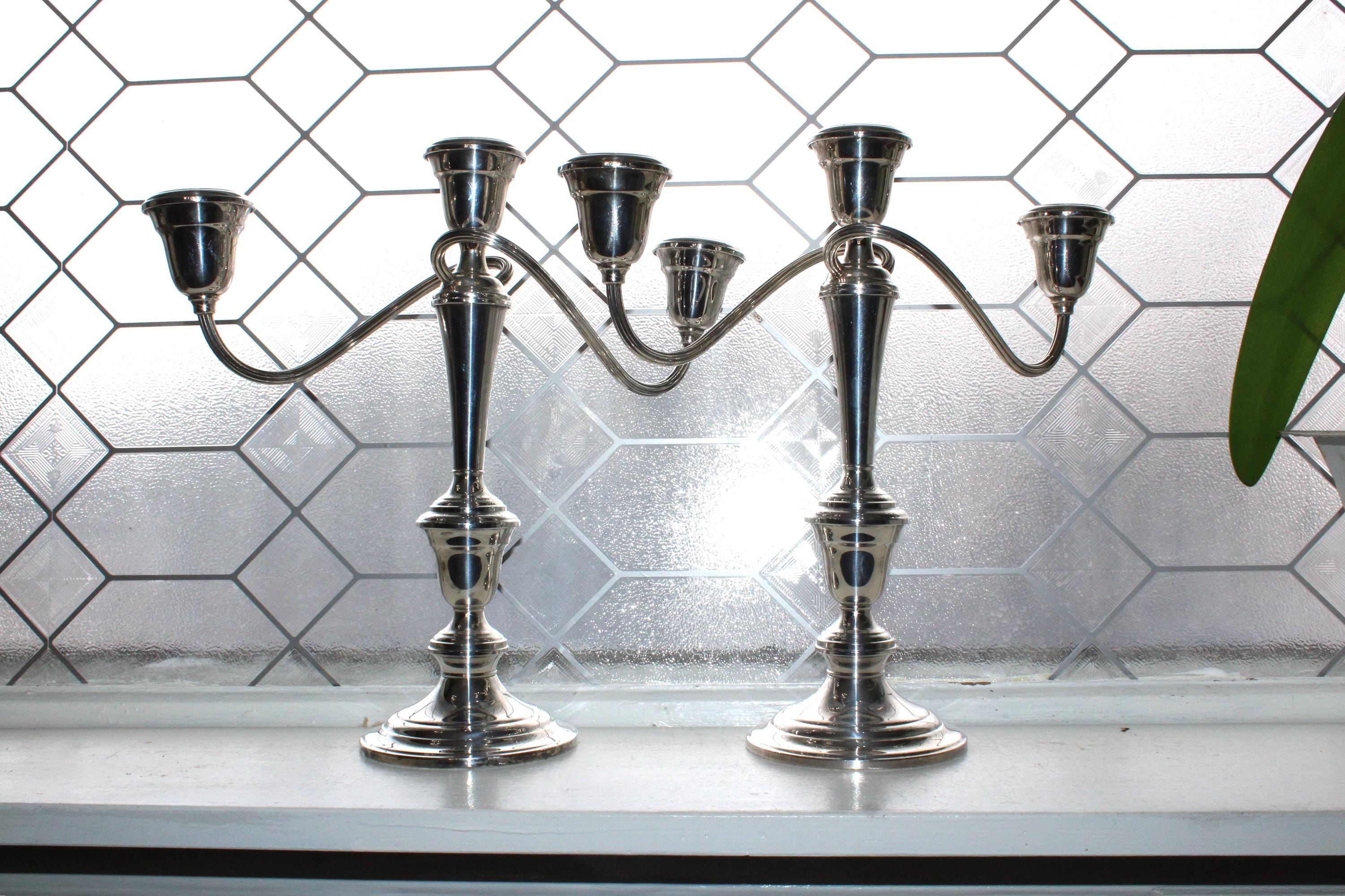 This is a beautiful vintage pair of Gorham Colony silverplate 3 light candelabra YC3032 with twist arms, in excellent condition. Each one has 4 parts that can be unscrewed for different heights. They measure 12 1/4" high and 13" wide, and they weigh 2 1/2 lbs. each. Perfect for use or display. Enjoy!