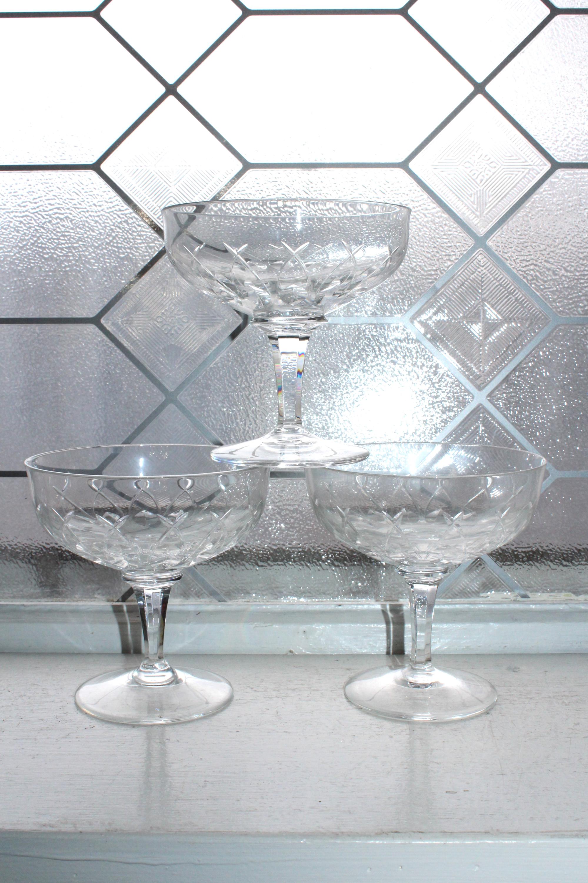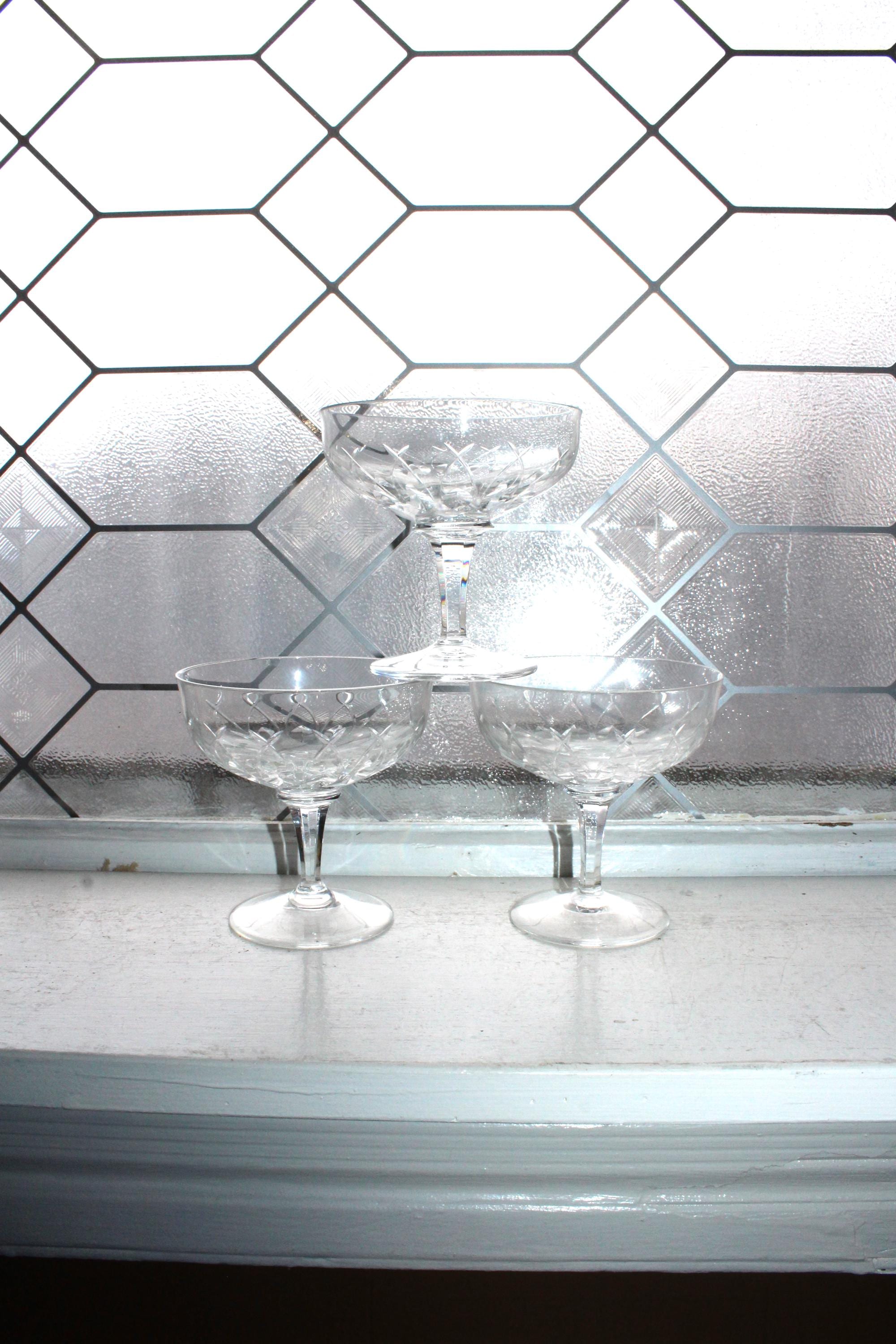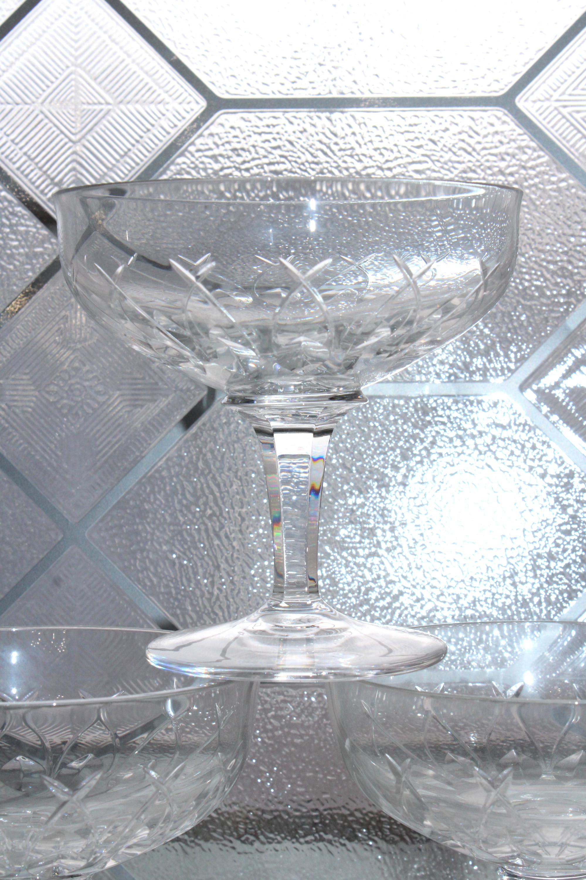 Set of 3 crystal Colette by Josair champagne glasses, in excellent condition. Each glass measures 4" high x 4" wide at the top. They are signed on the underside. No chips or cracks, perfect for use or display. I also have other matching pieces available in separate listings. Enjoy!