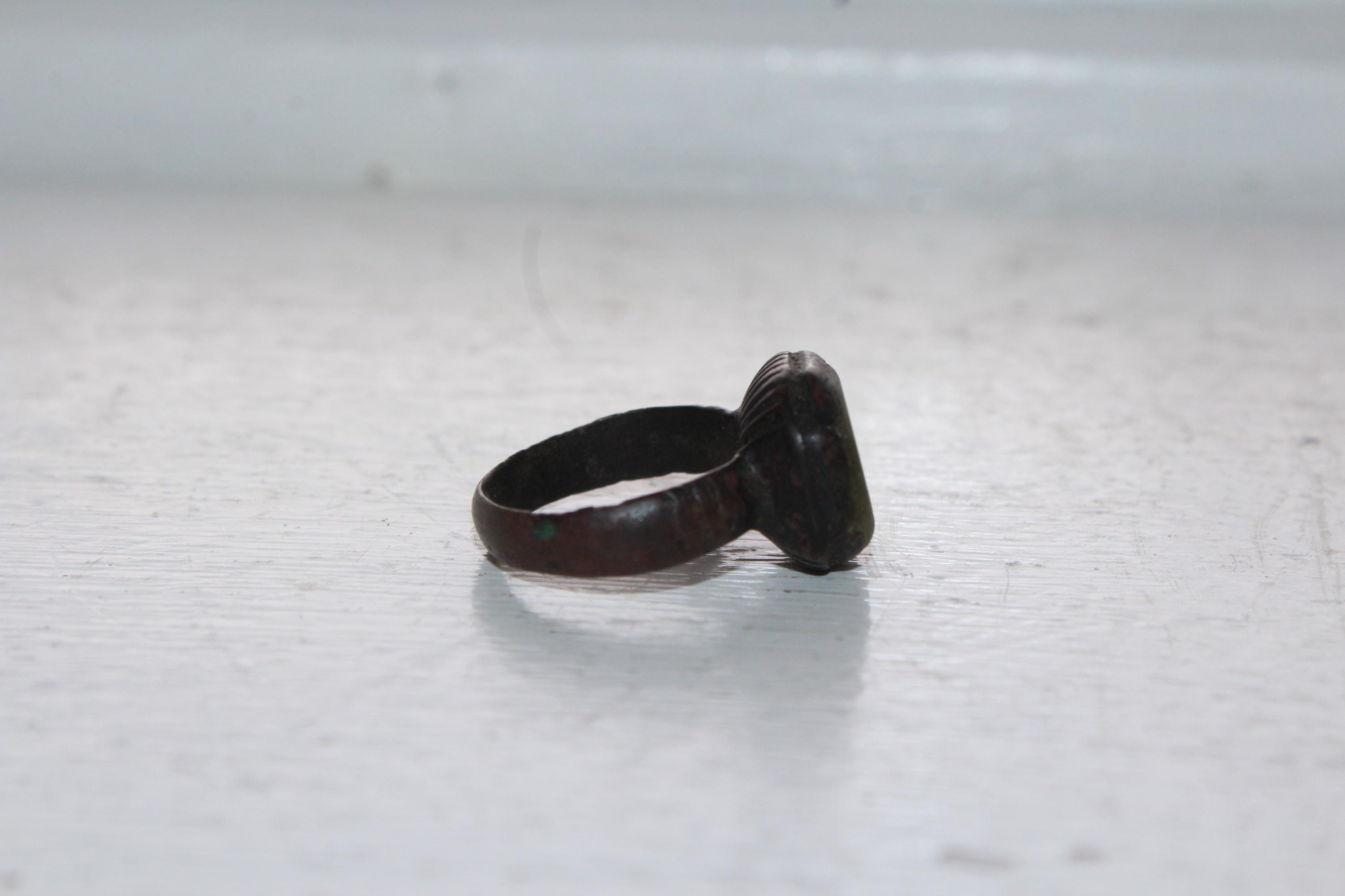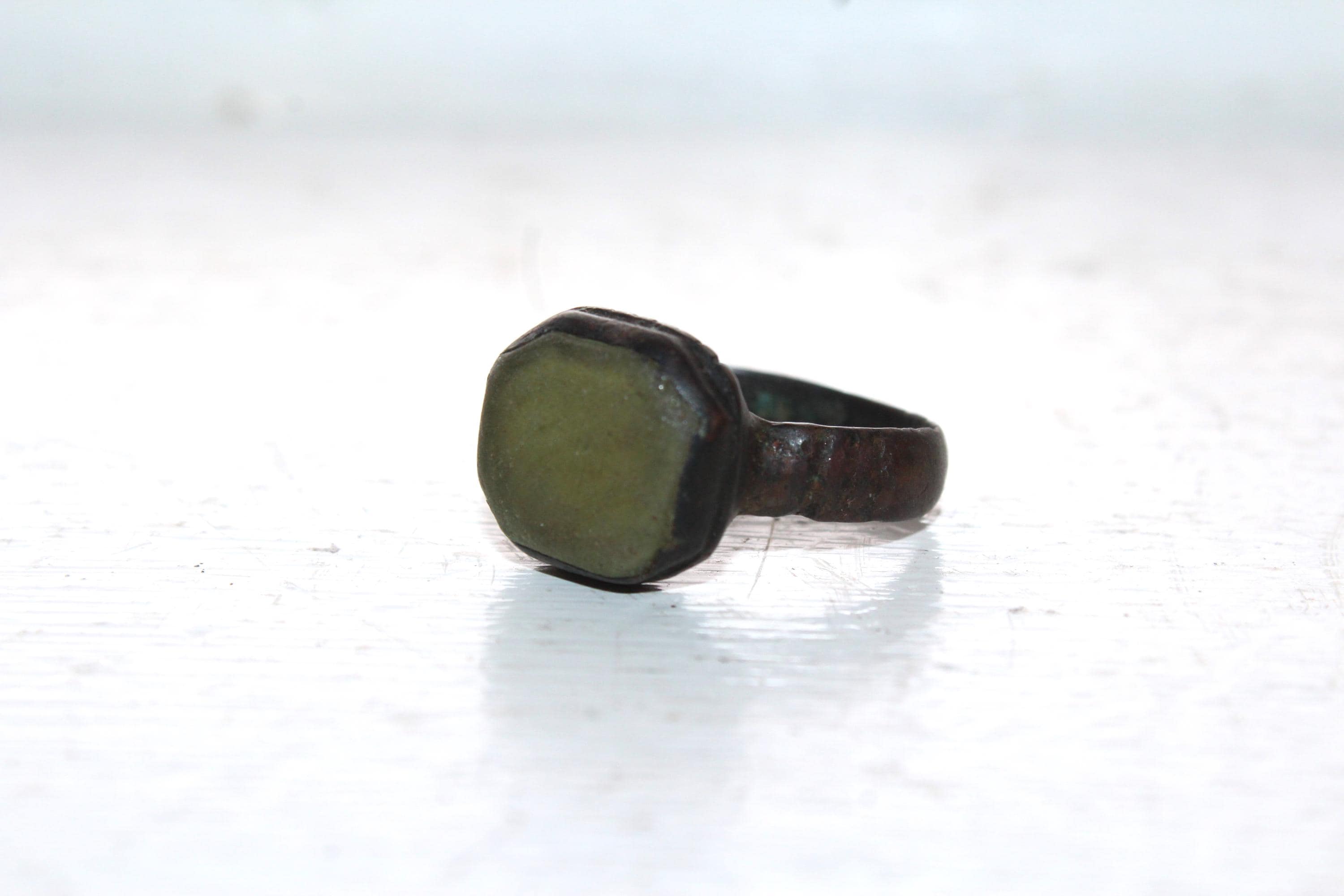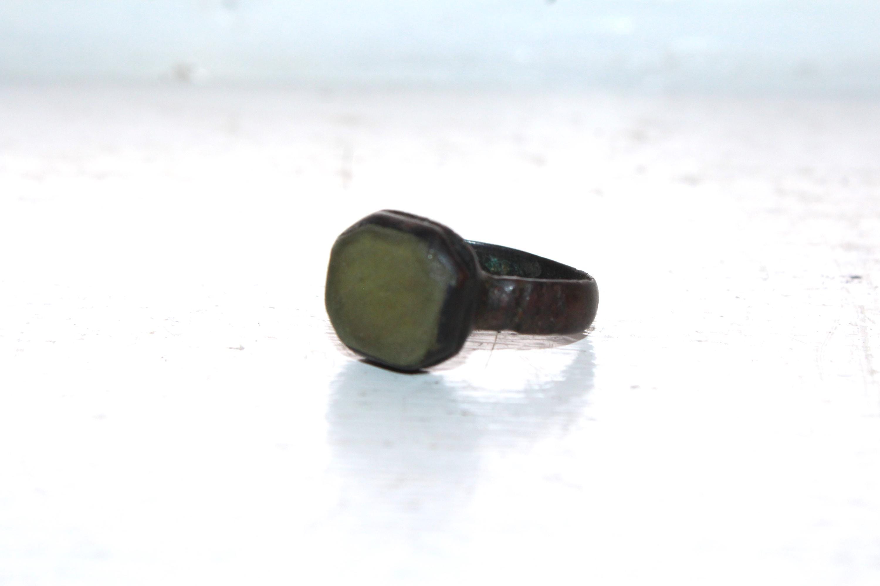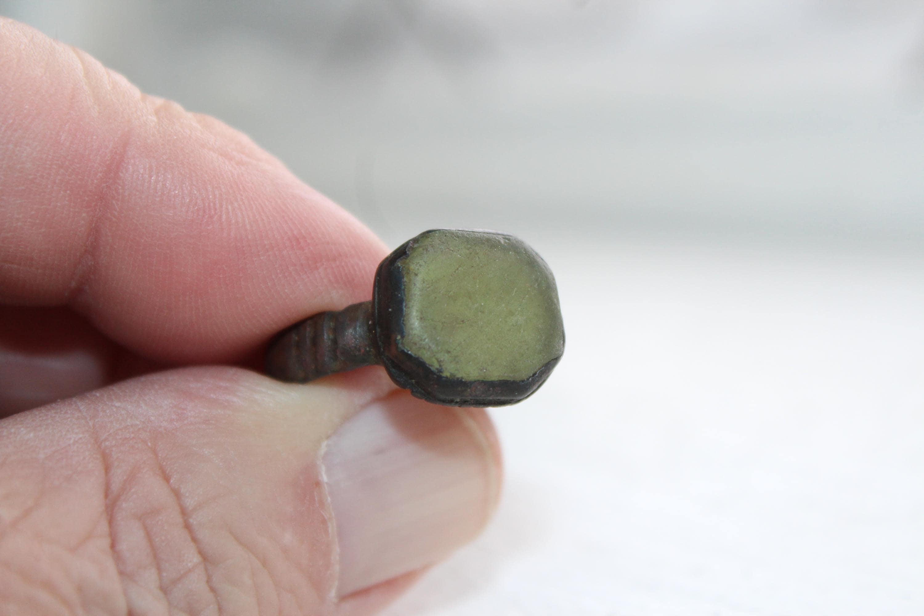 This is an authentic ancient medieval bronze signet ring with yellow stone, circa pre-1700s, dug in northern England. It is made of a bronze alloy and features a narrow, recessed, octagonal bezel setting. The stone in the bezel is likely a glass or resin inlay, which was common in medieval rings. The metal has a dark patina, which is a natural result of age and excavation, and is part of its historical value. Selling as found, I have not tried to clean it. The stone measures 1/2" x 3/8". The ring portion measures 5/8" x 3/4". I do not know the size. Enjoy!