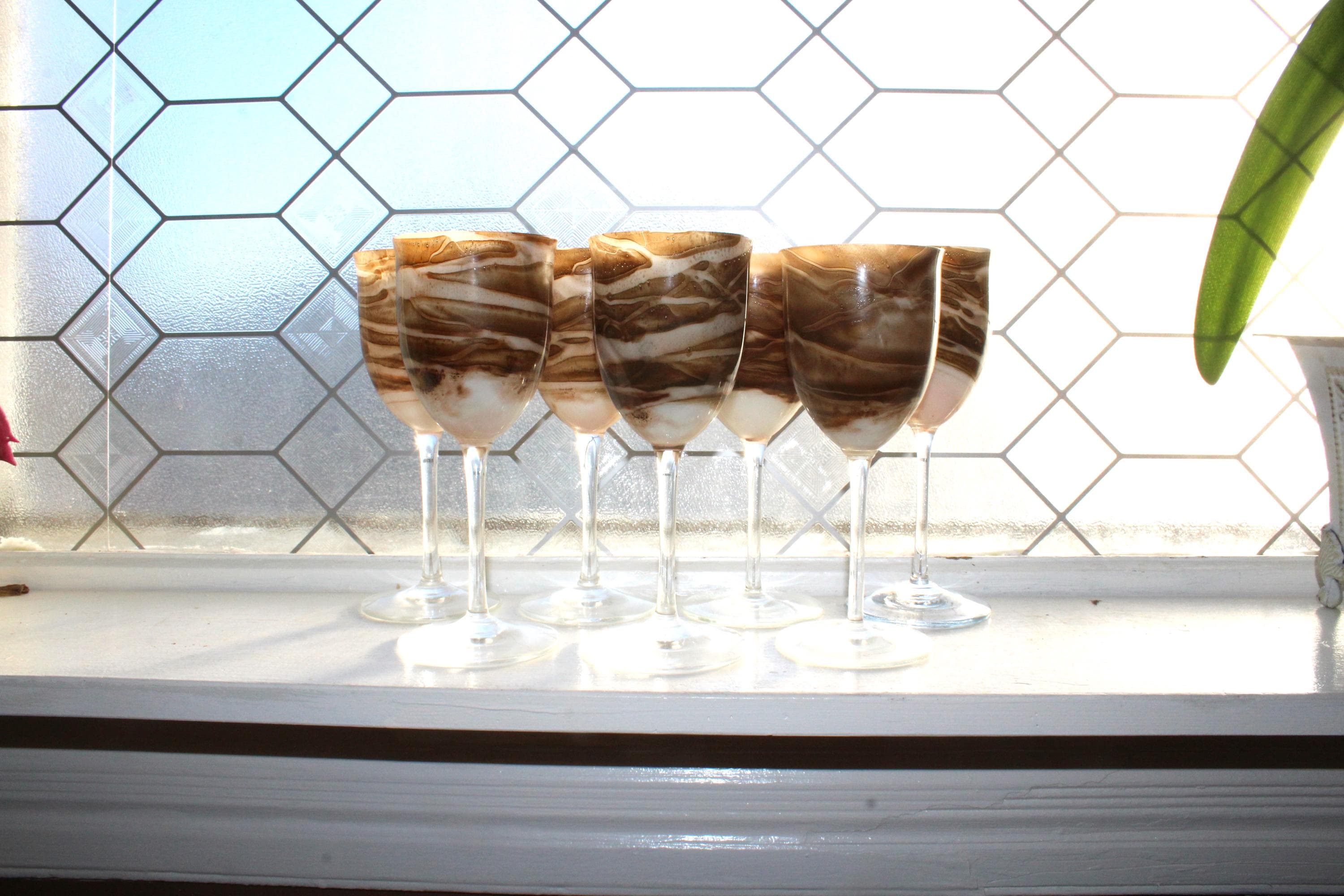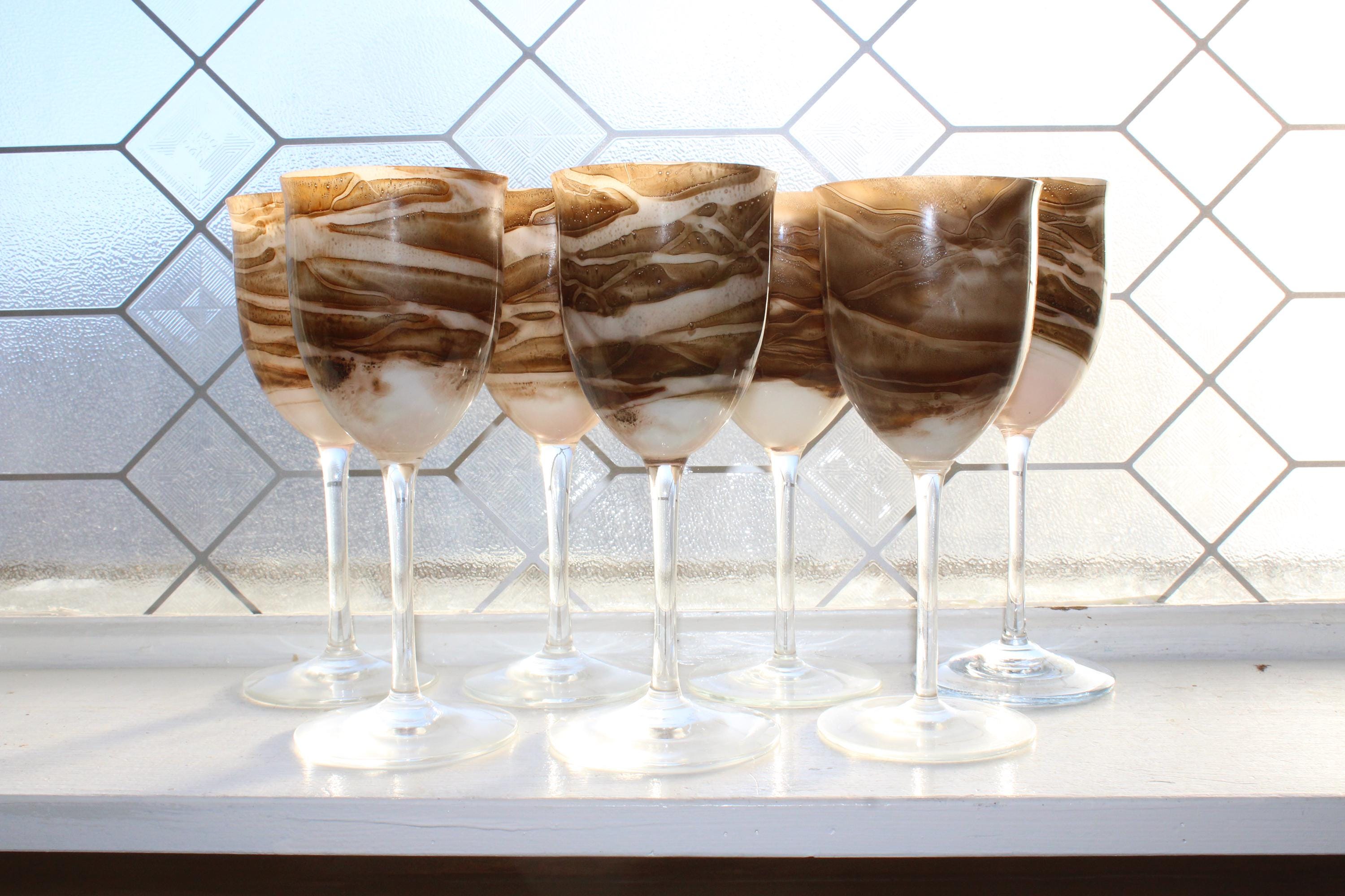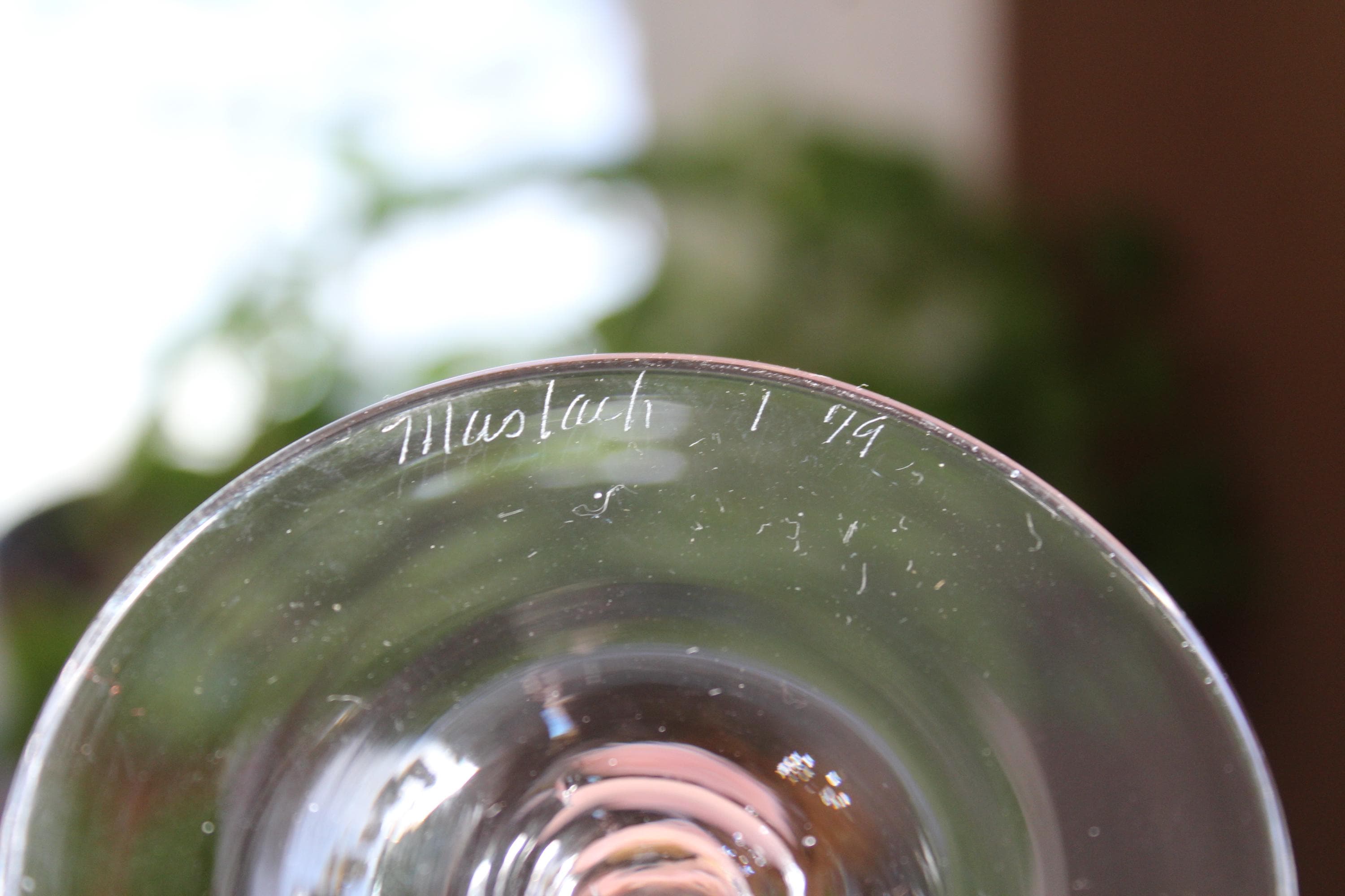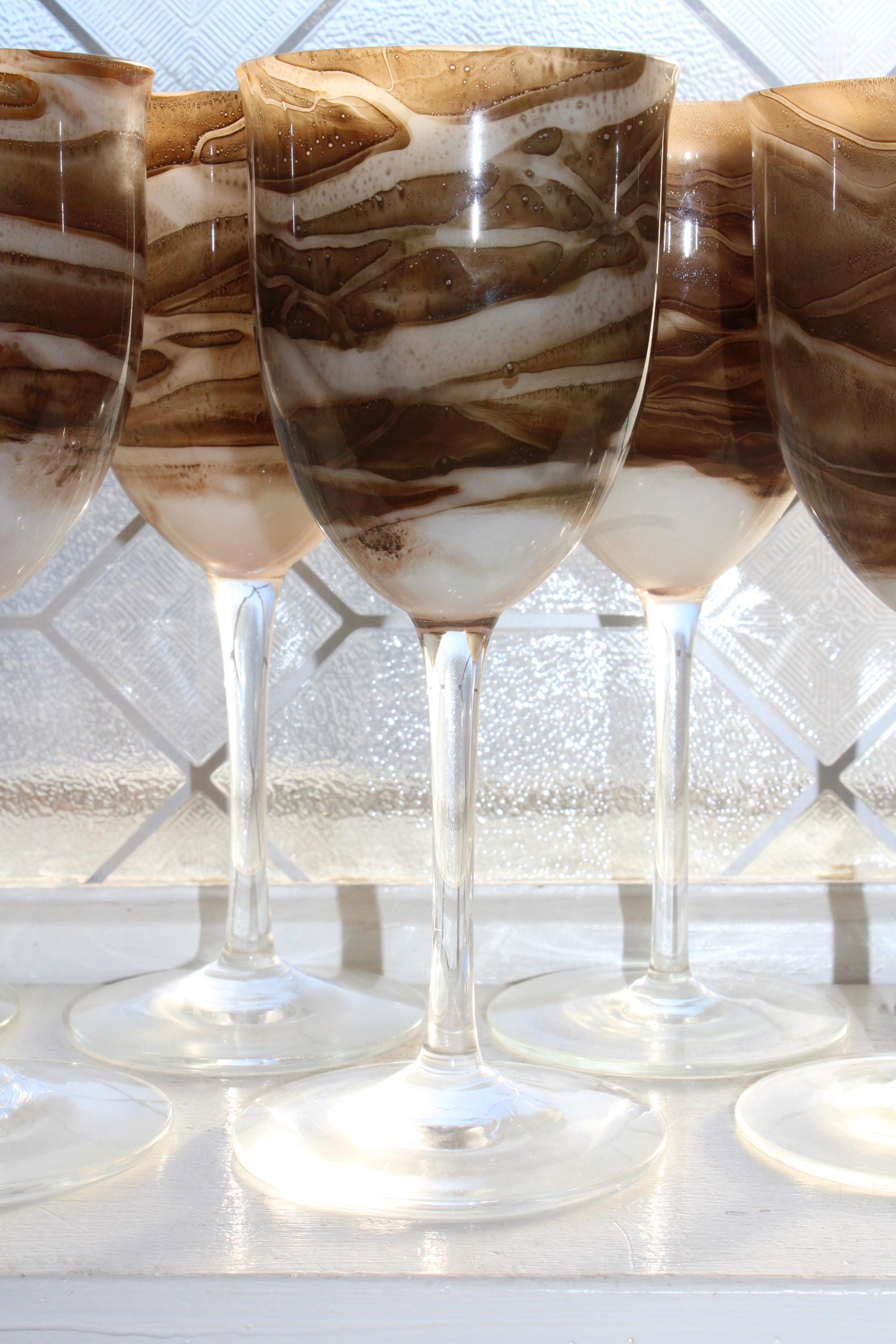 Set of 7 vintage Steven Maslach "Earth Art" glass wine goblets, in excellent condition. Each glass measures 7 3/4" high. They are signed and dated on the underside. No chips or cracks, perfect for use or display. Enjoy!