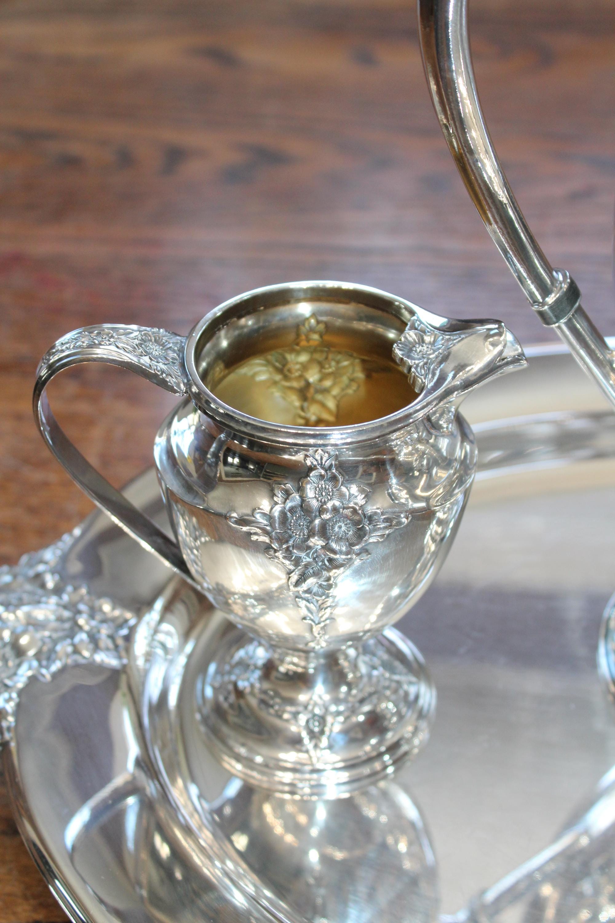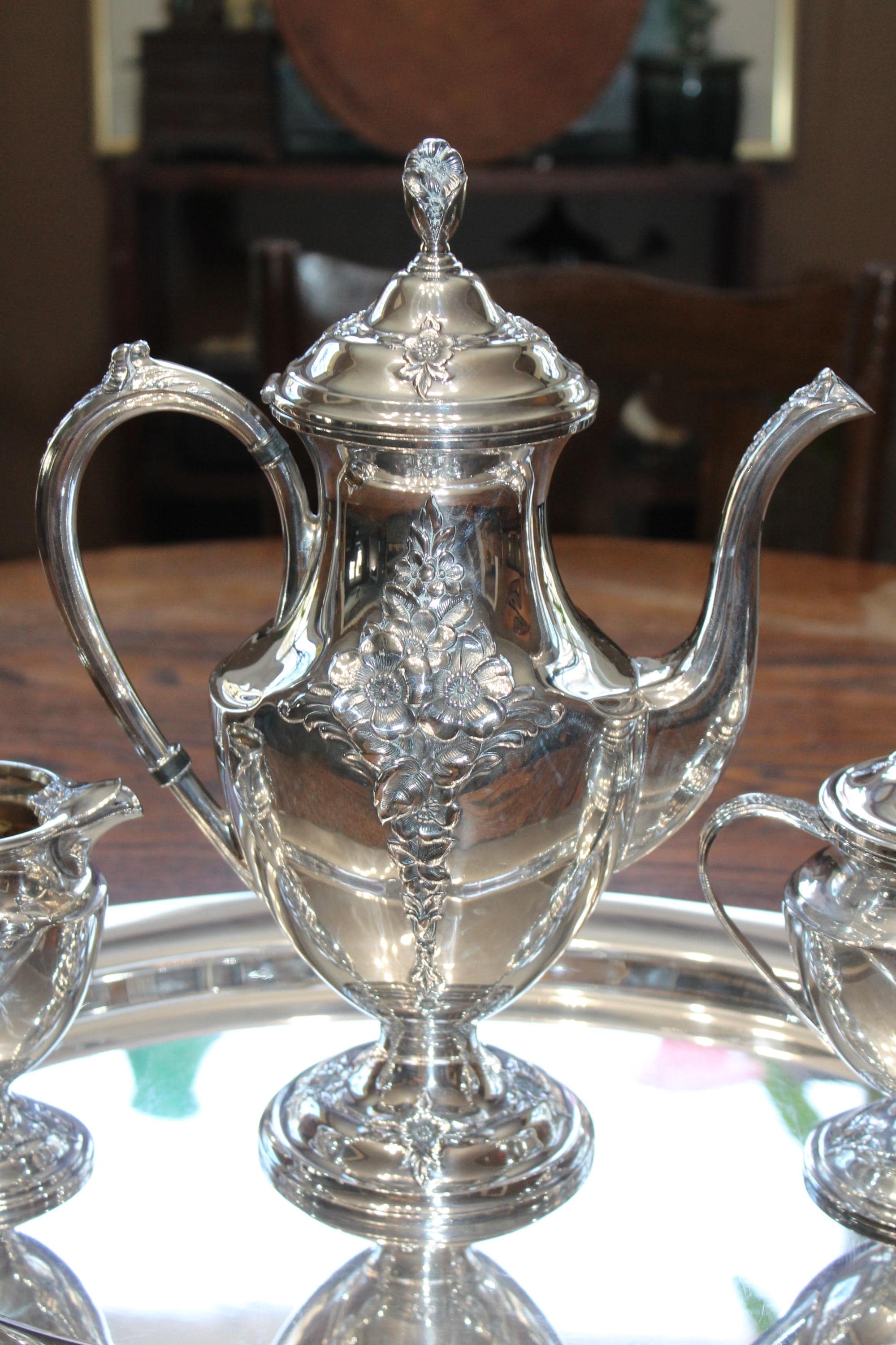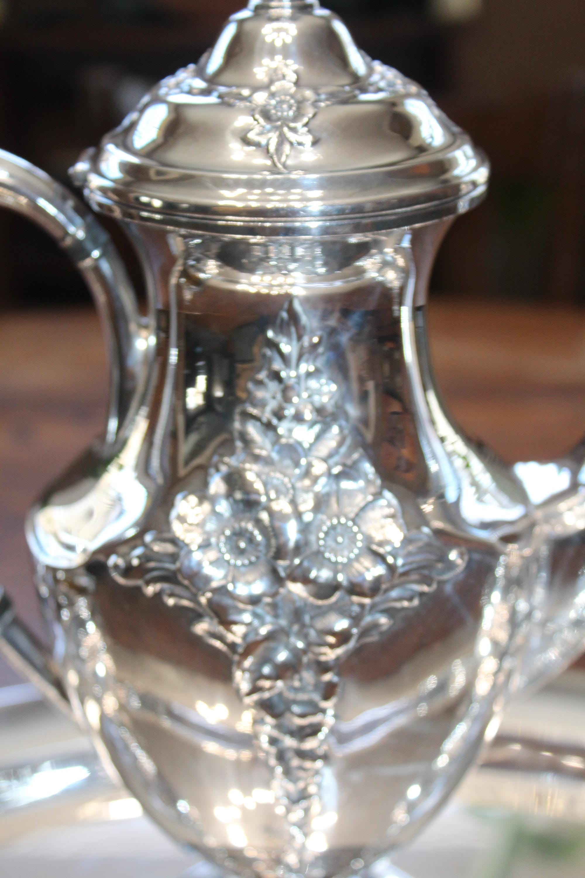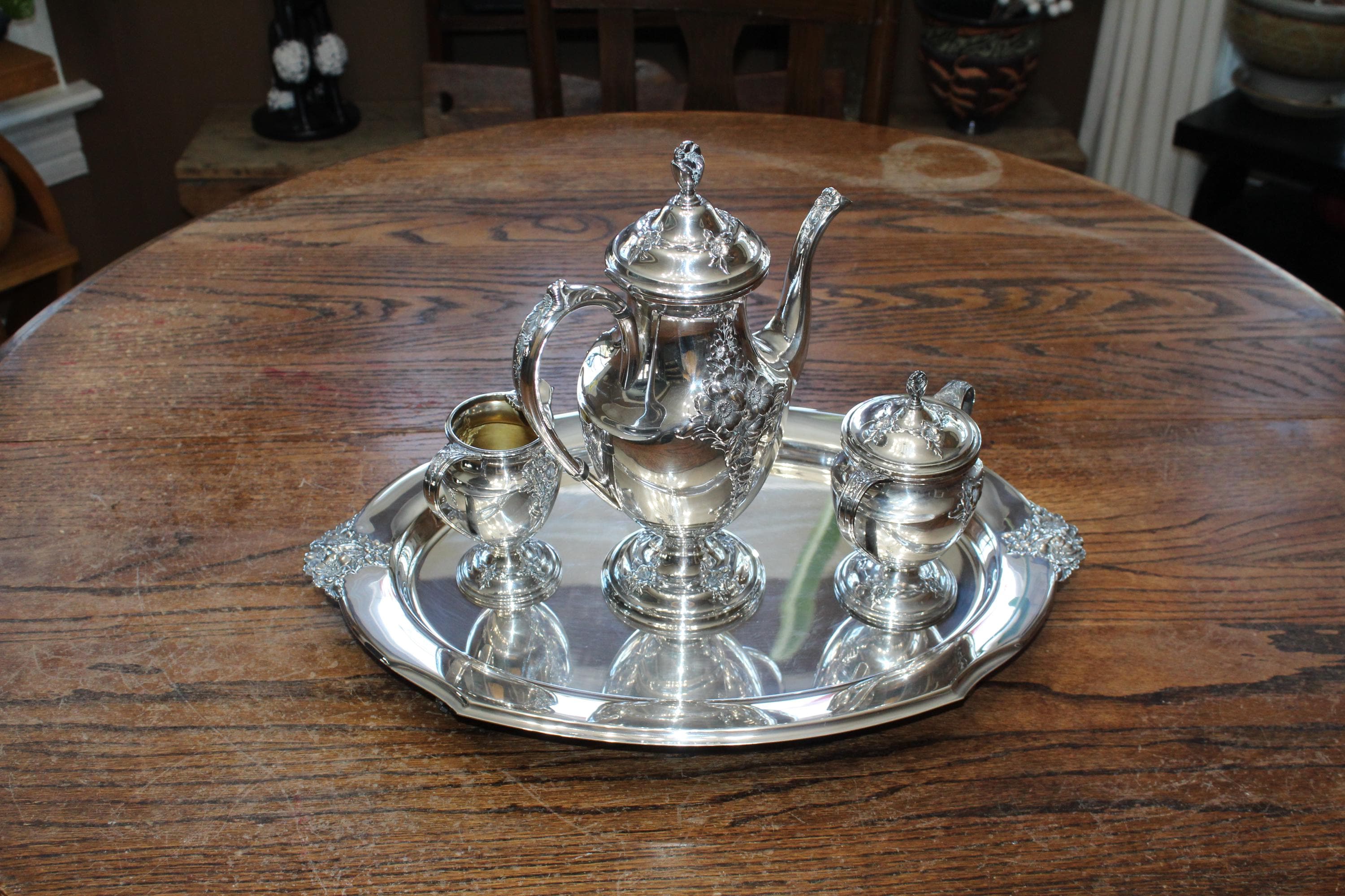 Vintage Holmes & Edwards International Silver Company Spring Garden silverplate coffee or tea service set. This gorgeous and ornate set is in very good condition. It includes a teapot/coffee pot, sugar bowl with lid, creamer and tray. The tray measures 19 3/4" x 13 1/4". Minimal wear to the pot, creamer and sugar, tray has age appropriate light scratching and displays very well. Enjoy!