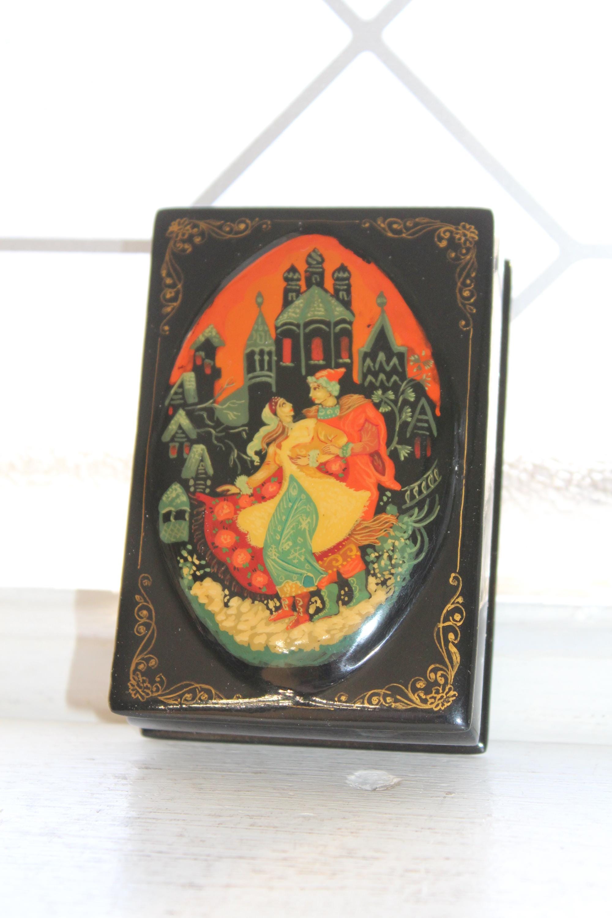 Vintage hand painted Russian lacquer box, in excellent condition. The box measures 3 1/2" x 2 3/8" x 1" high. Enjoy!