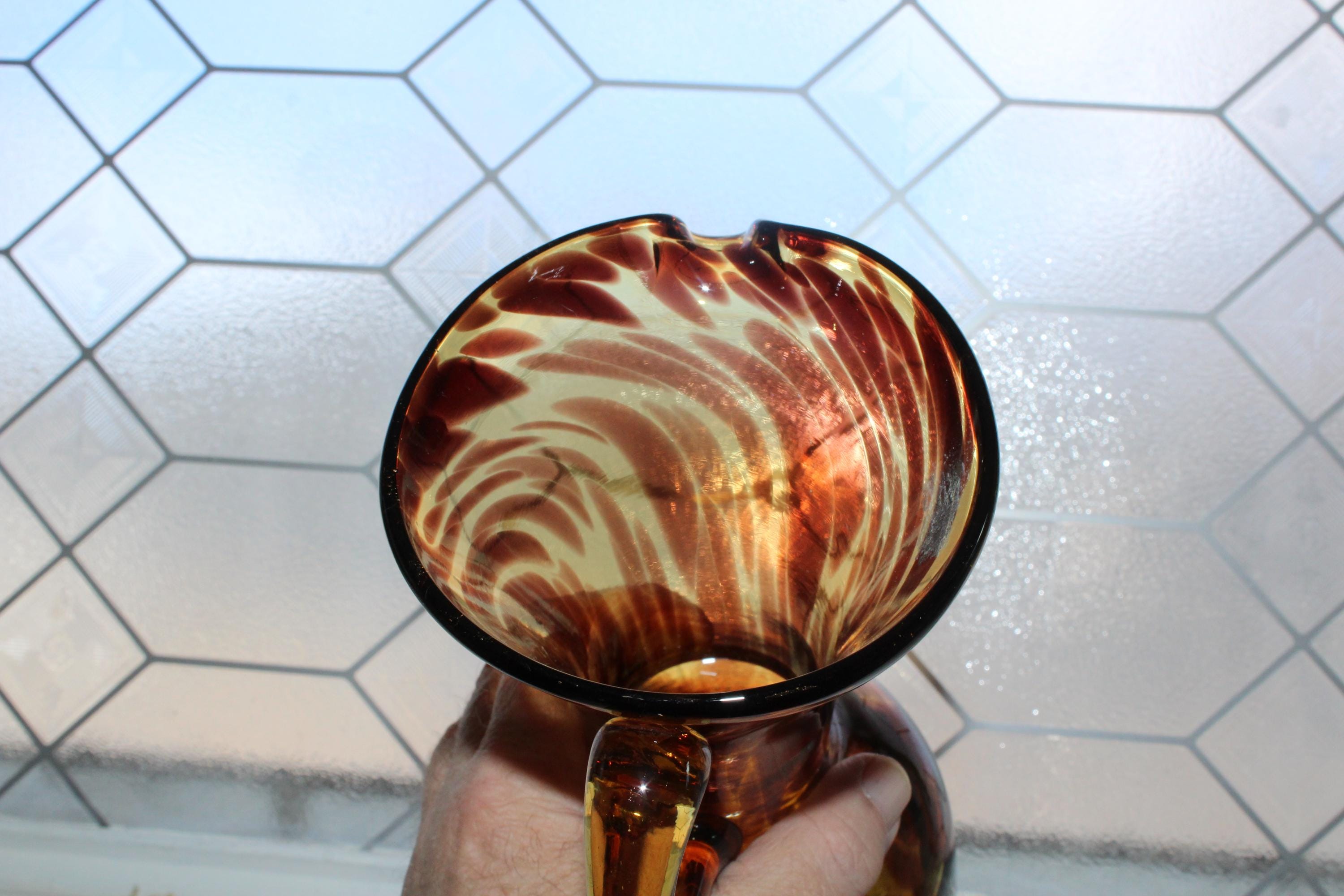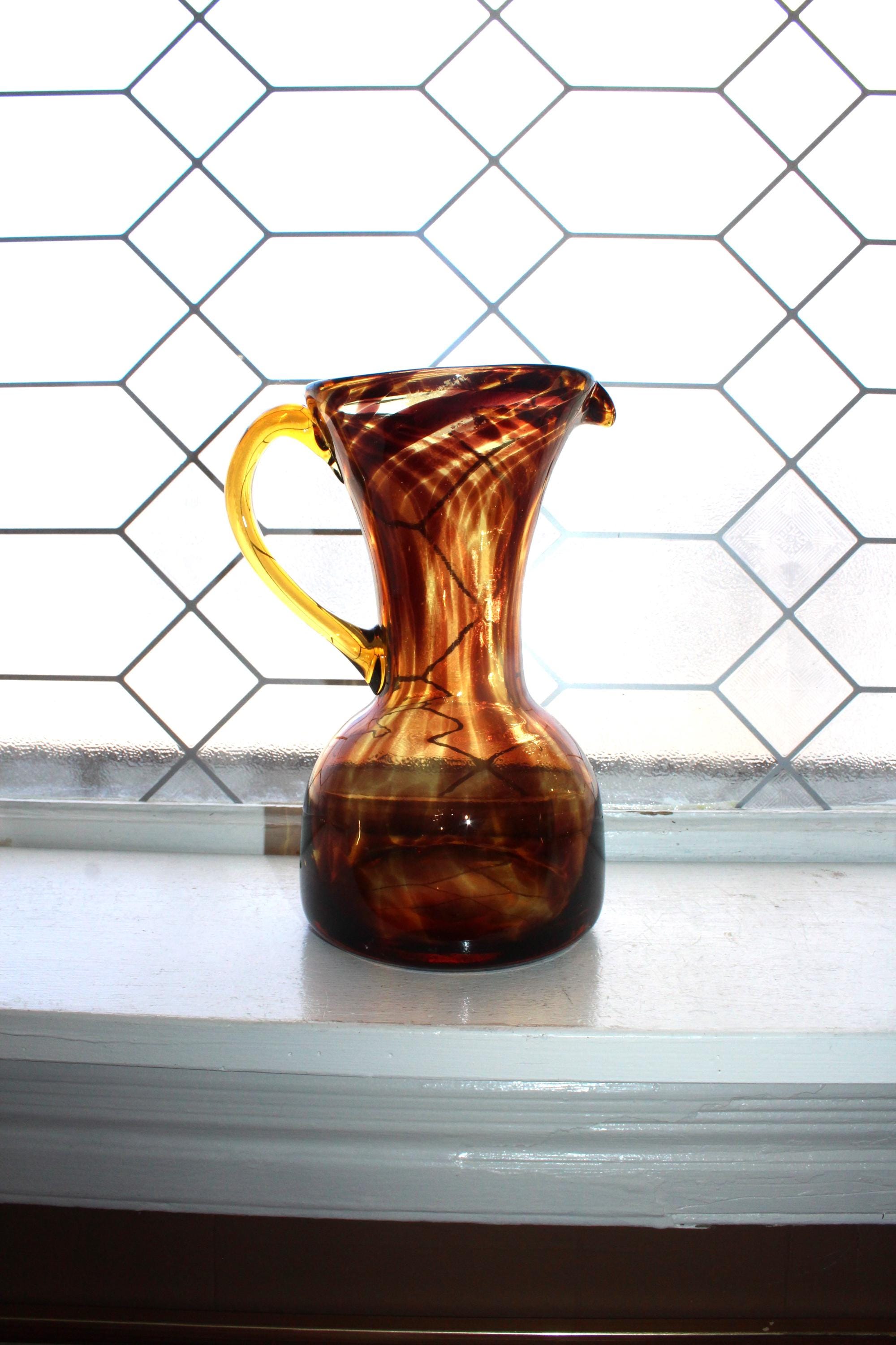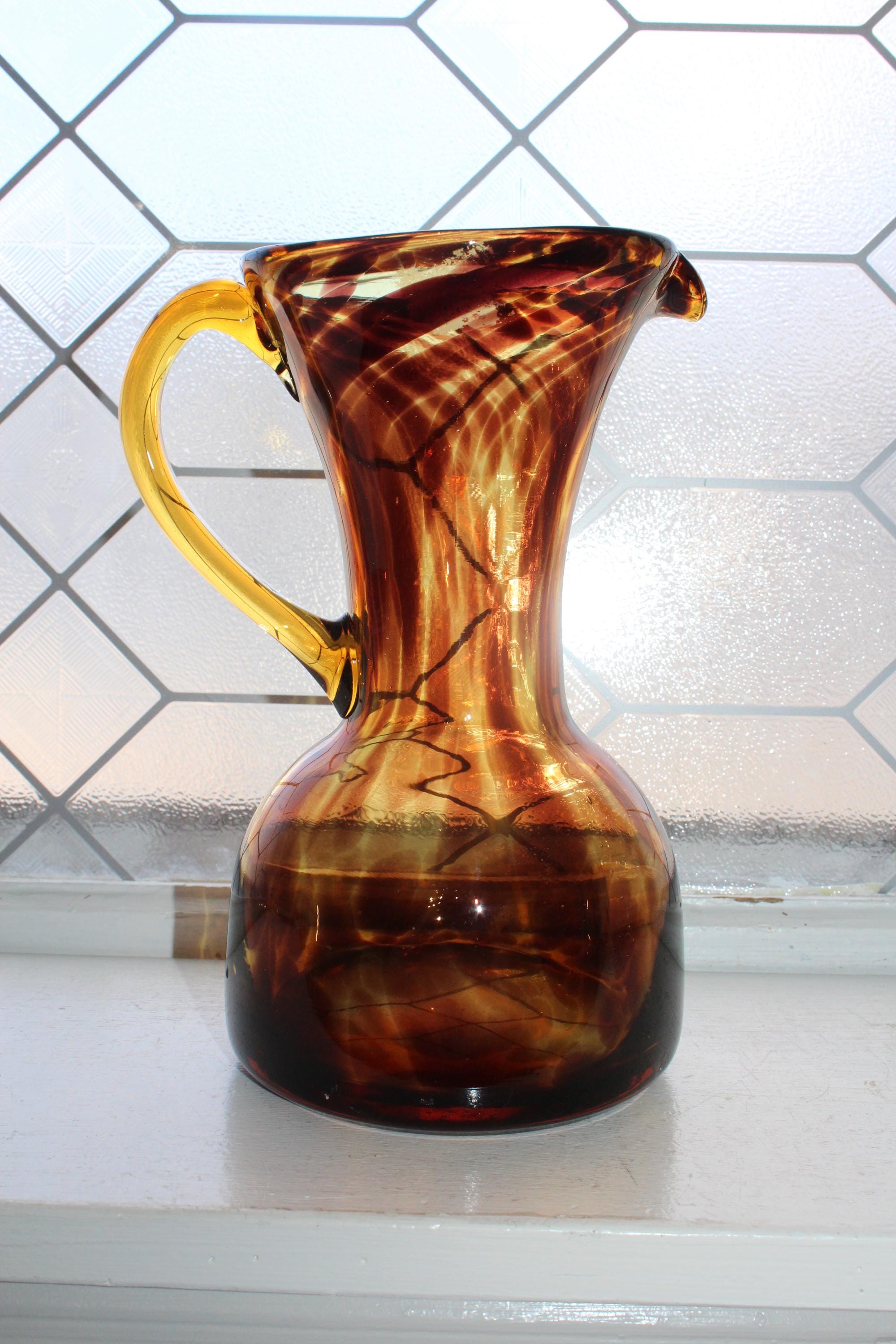 Vintage Mid Century tortoise shell art glass pitcher with applied amber glass handle, in good condition and perfect for martinis. The pitcher measures 8 1/2" high and has no chips or cracks. It displays very well. Enjoy!