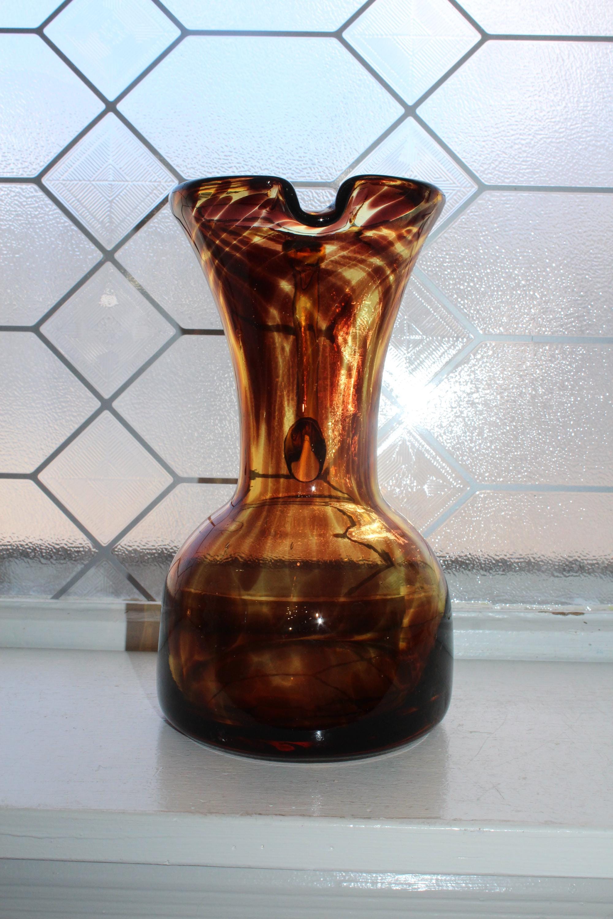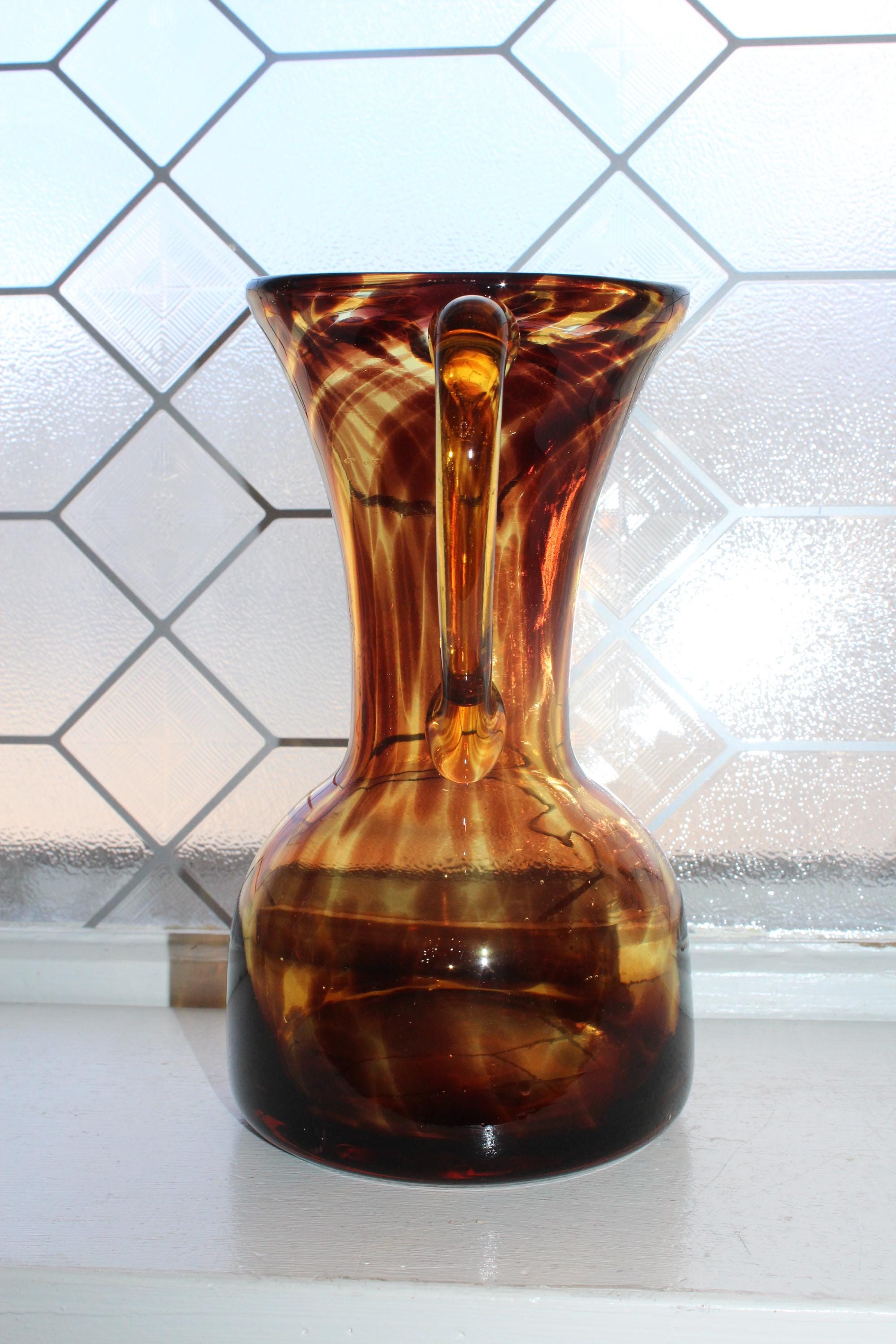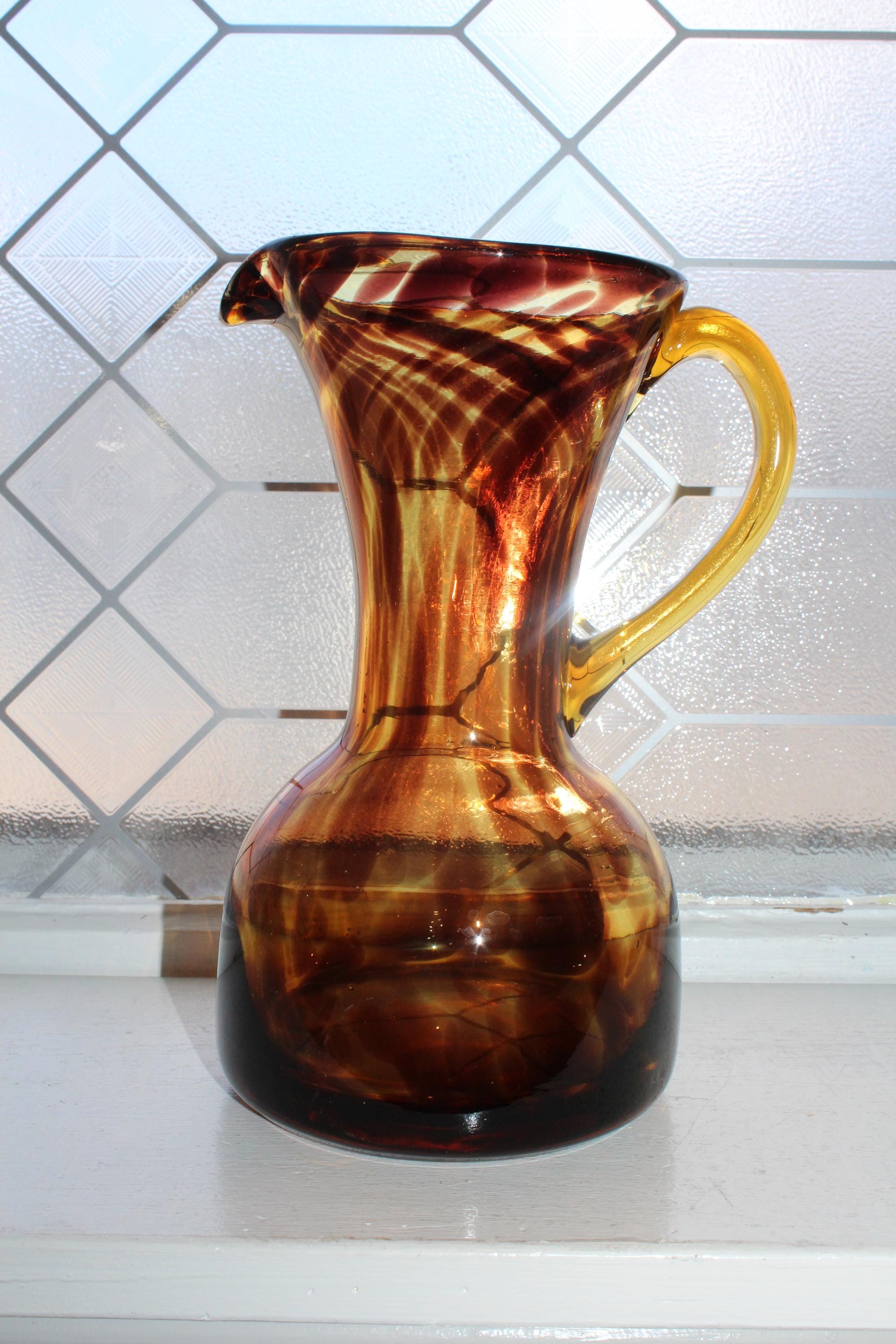 Vintage Mid Century tortoise shell art glass pitcher with applied amber glass handle, in good condition and perfect for martinis. The pitcher measures 8 1/2" high and has no chips or cracks. It displays very well. Enjoy!