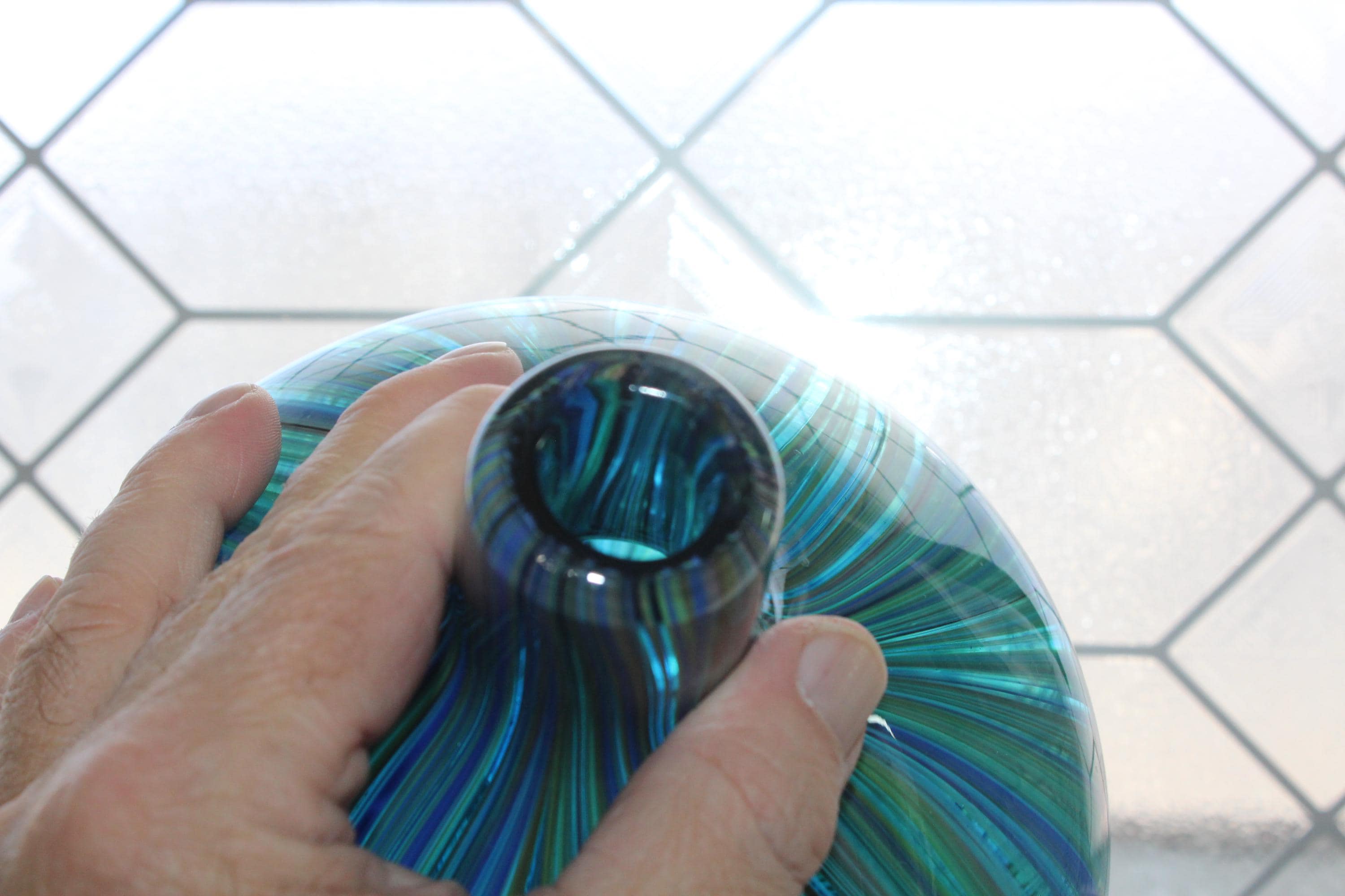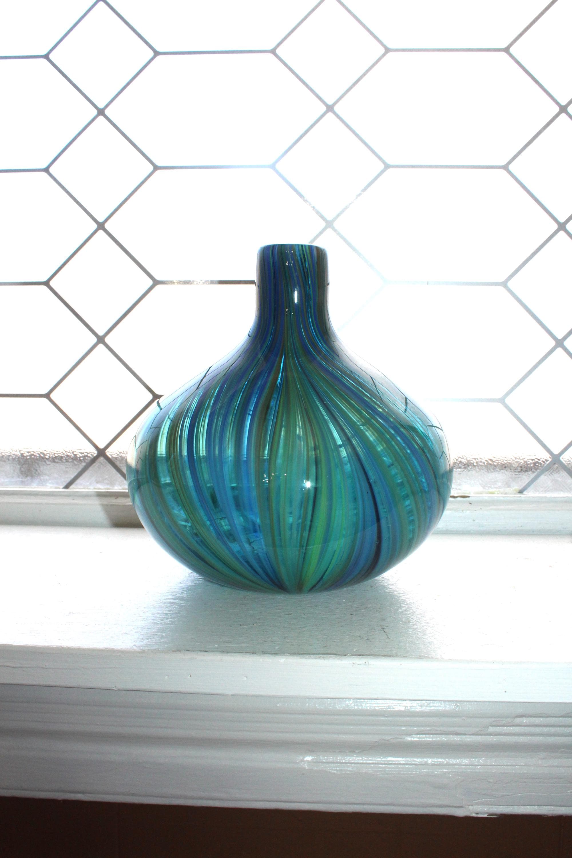 Vintage Italian Murano glass bulbous bottle vase with blue and green stripe swirls, in excellent condition. The vase measures 7" high, weighs 2 1/2 lbs. and has no chips or cracks, perfect for use or display. Enjoy!