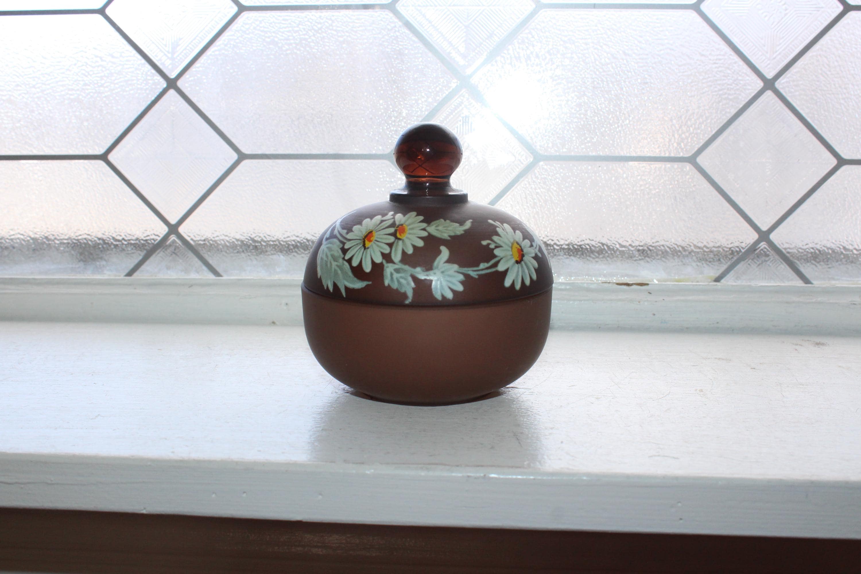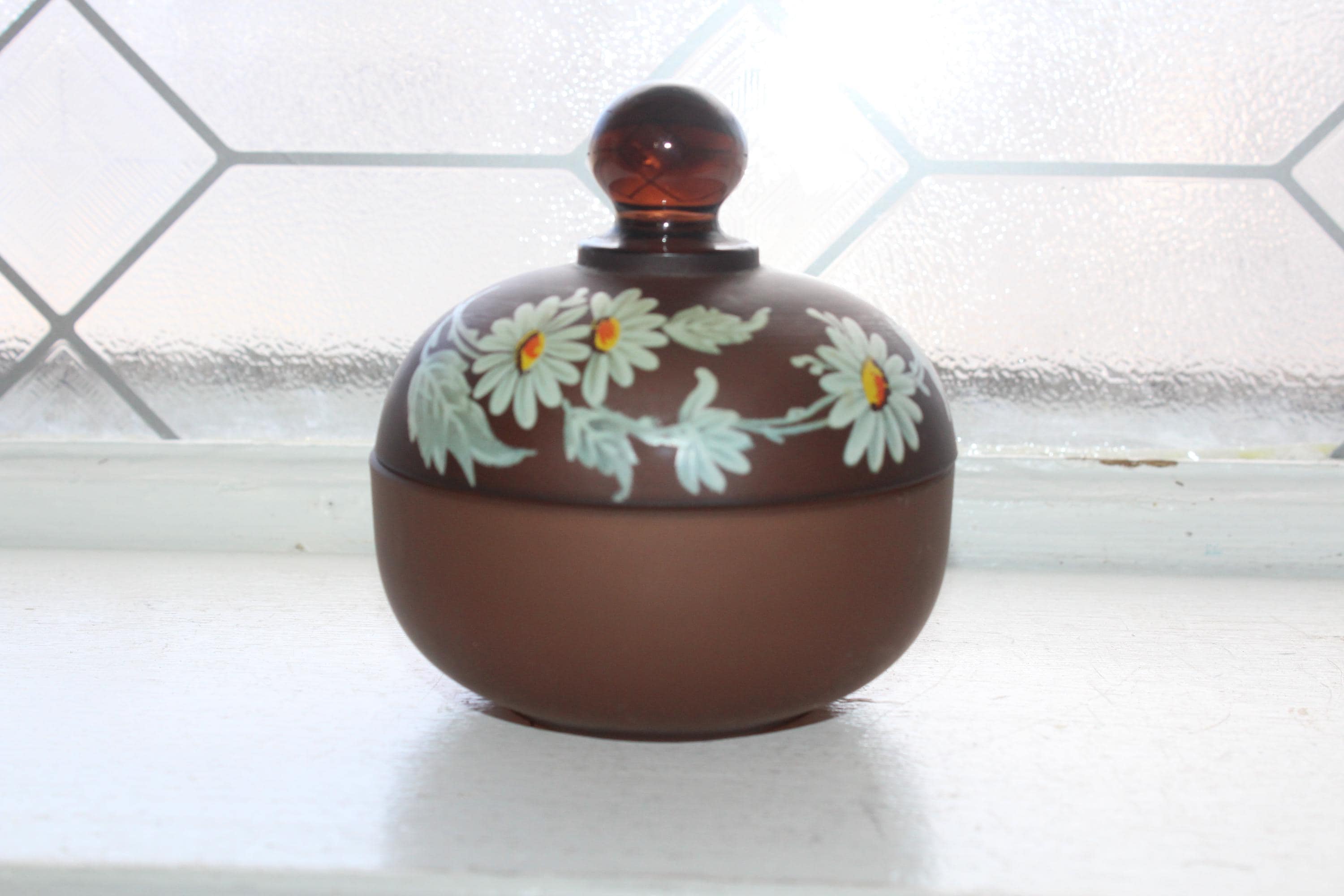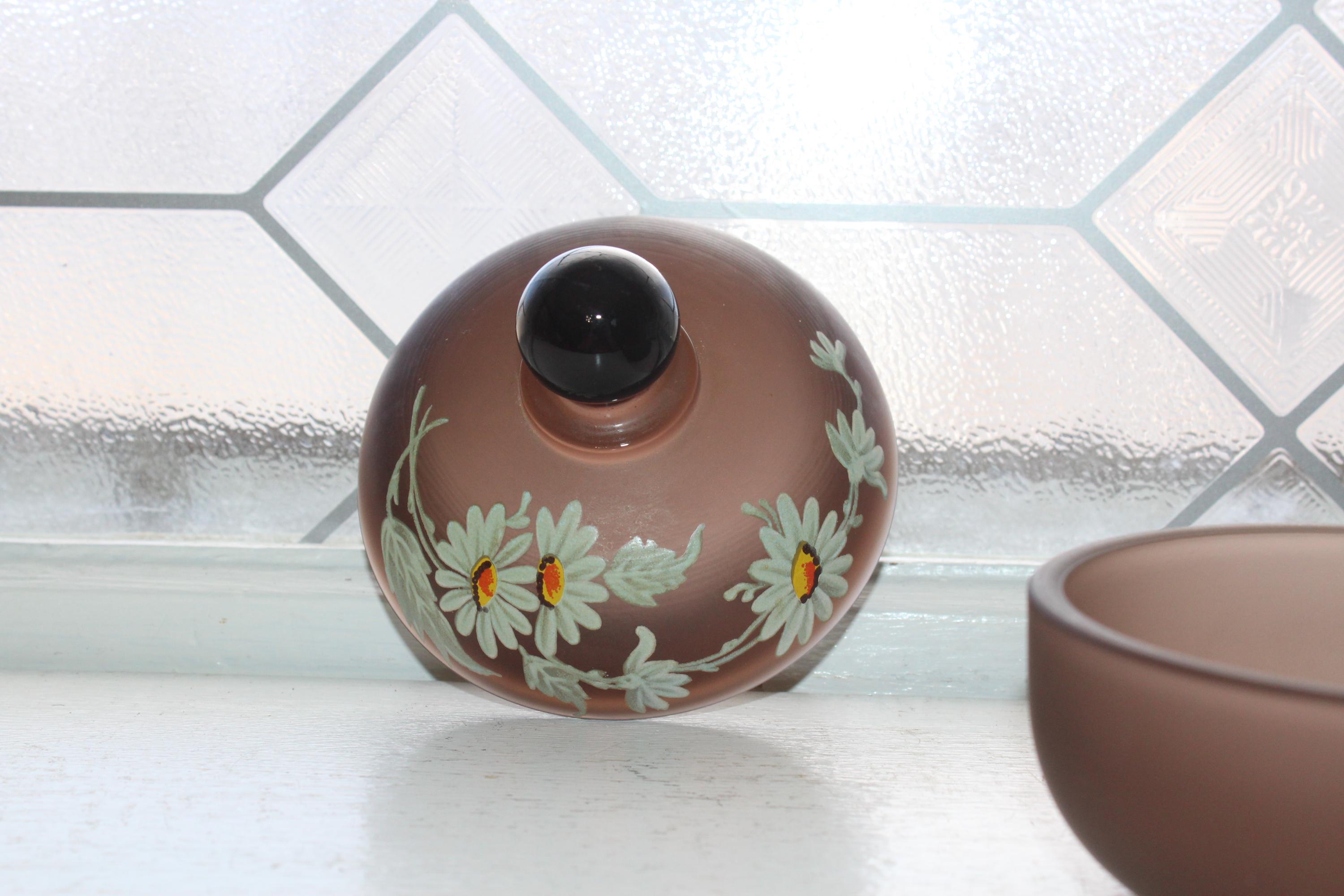 Vintage hand painted Westmoreland "Brown Mist" satin glass lidded bon bon candy dish, in excellent condition. The dish measures 4" high. No chips or cracks, perfect for use or display. Enjoy!