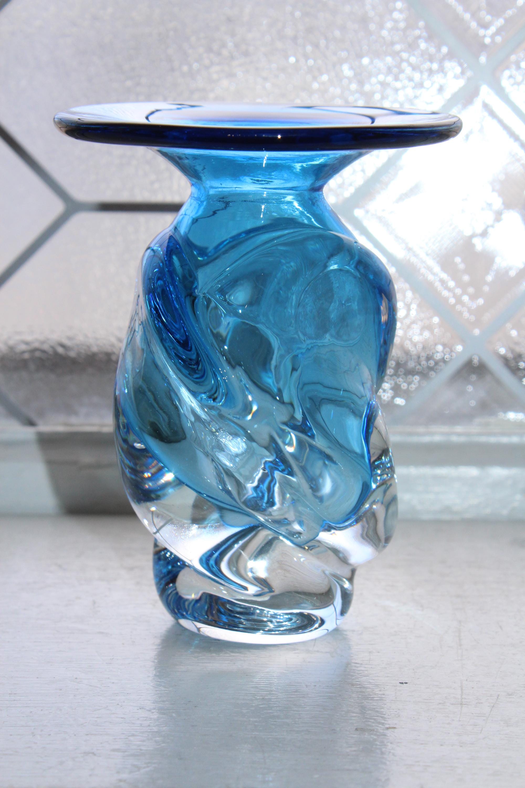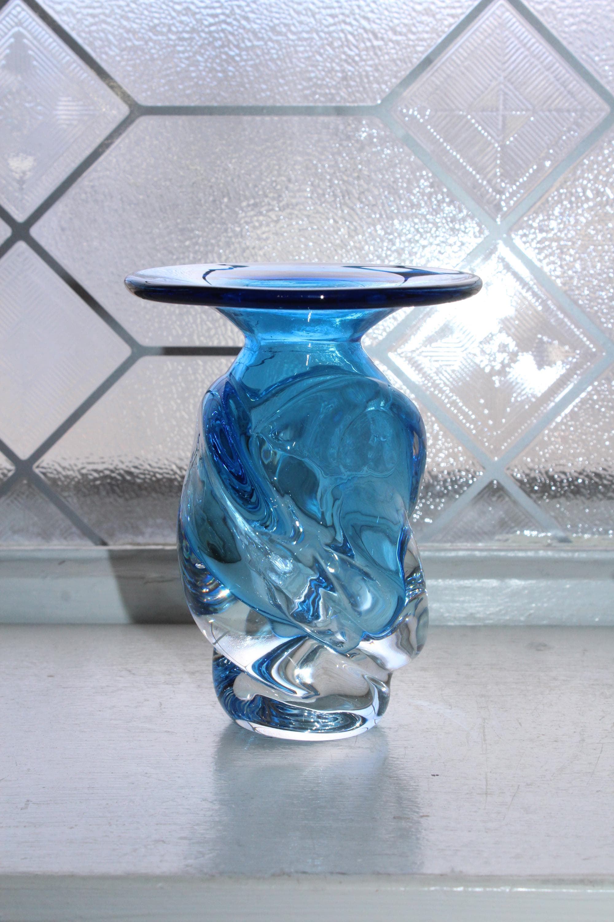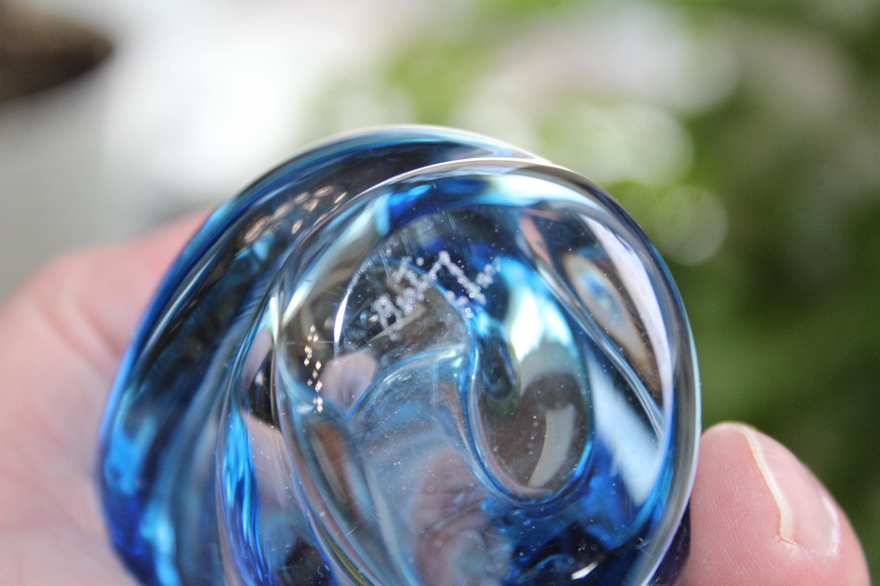 This is a fabulous artist signed studio art glass blue tornado vase with wide rim, in excellent condition. It measures 4 1/2" high x 3 3/8" wide at the rim and is signed on the underside. I can not read the signature. Enjoy!