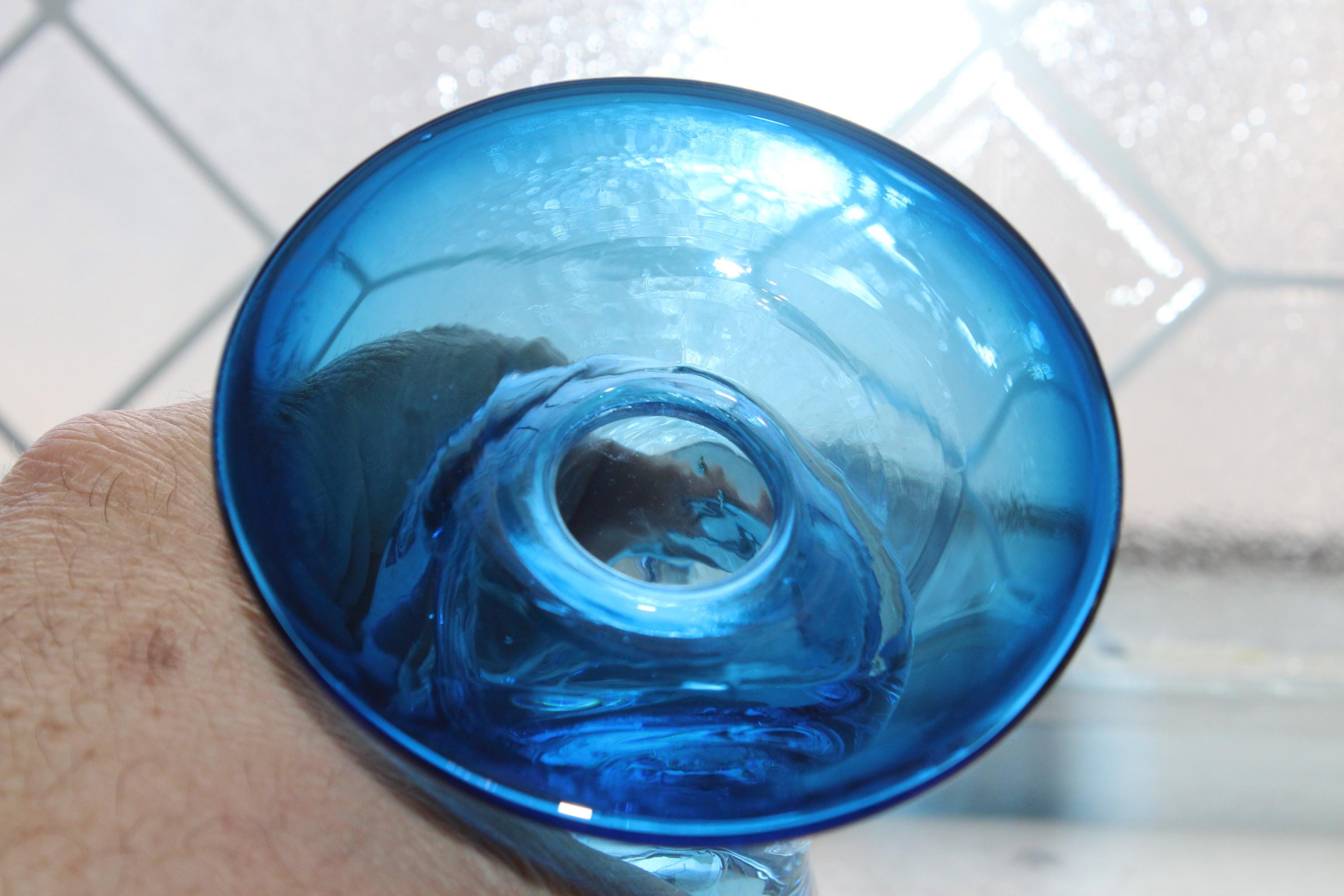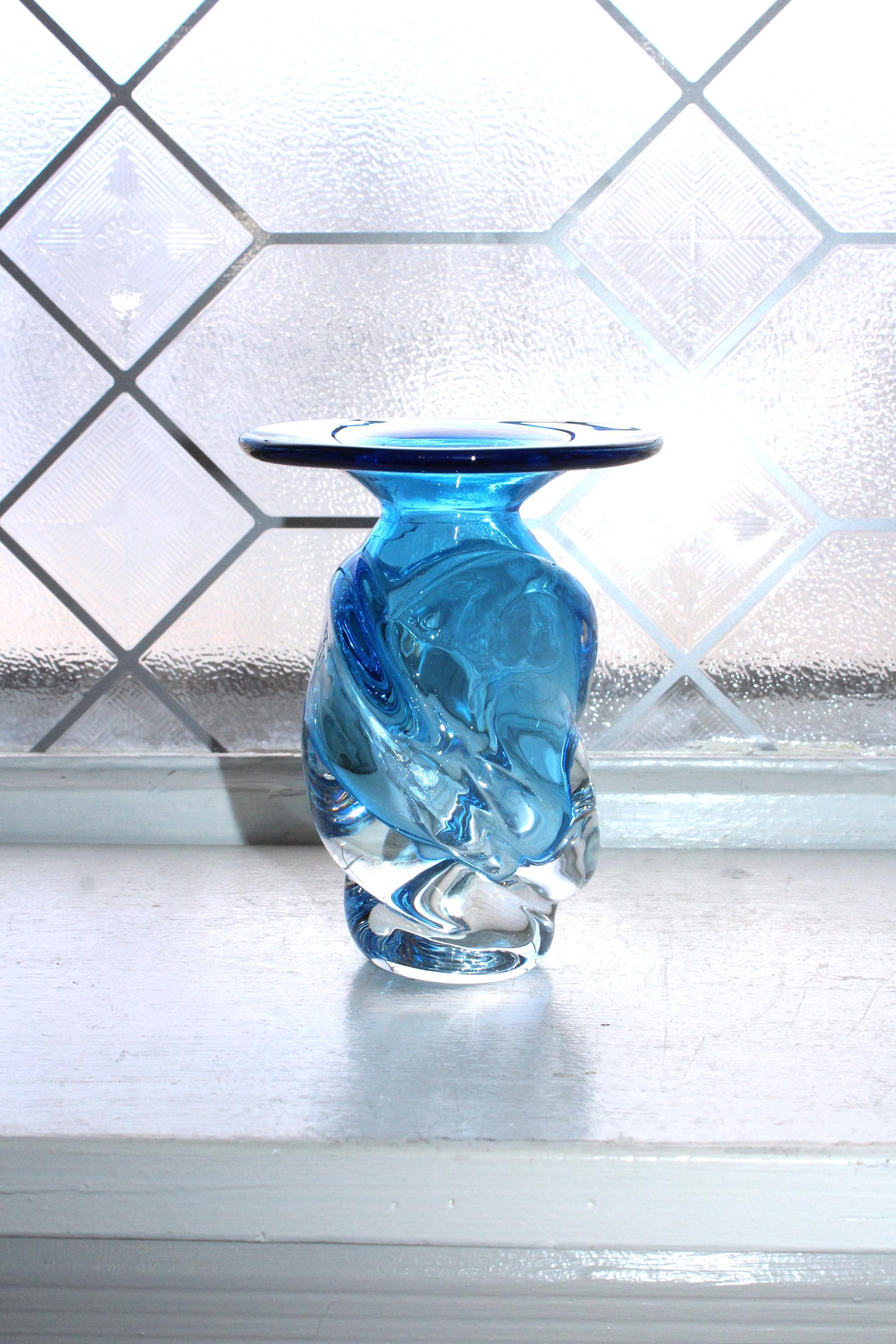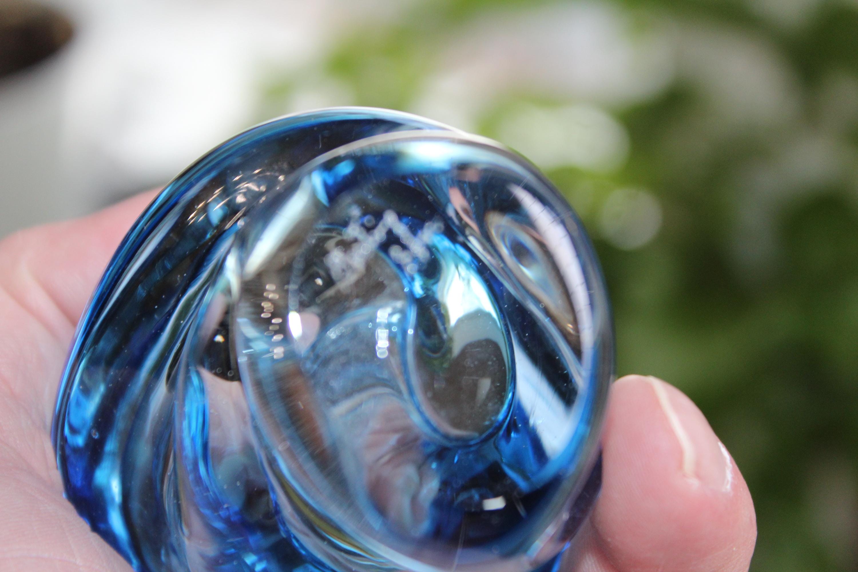 This is a fabulous artist signed studio art glass blue tornado vase with wide rim, in excellent condition. It measures 4 1/2" high x 3 3/8" wide at the rim and is signed on the underside. I can not read the signature. Enjoy!