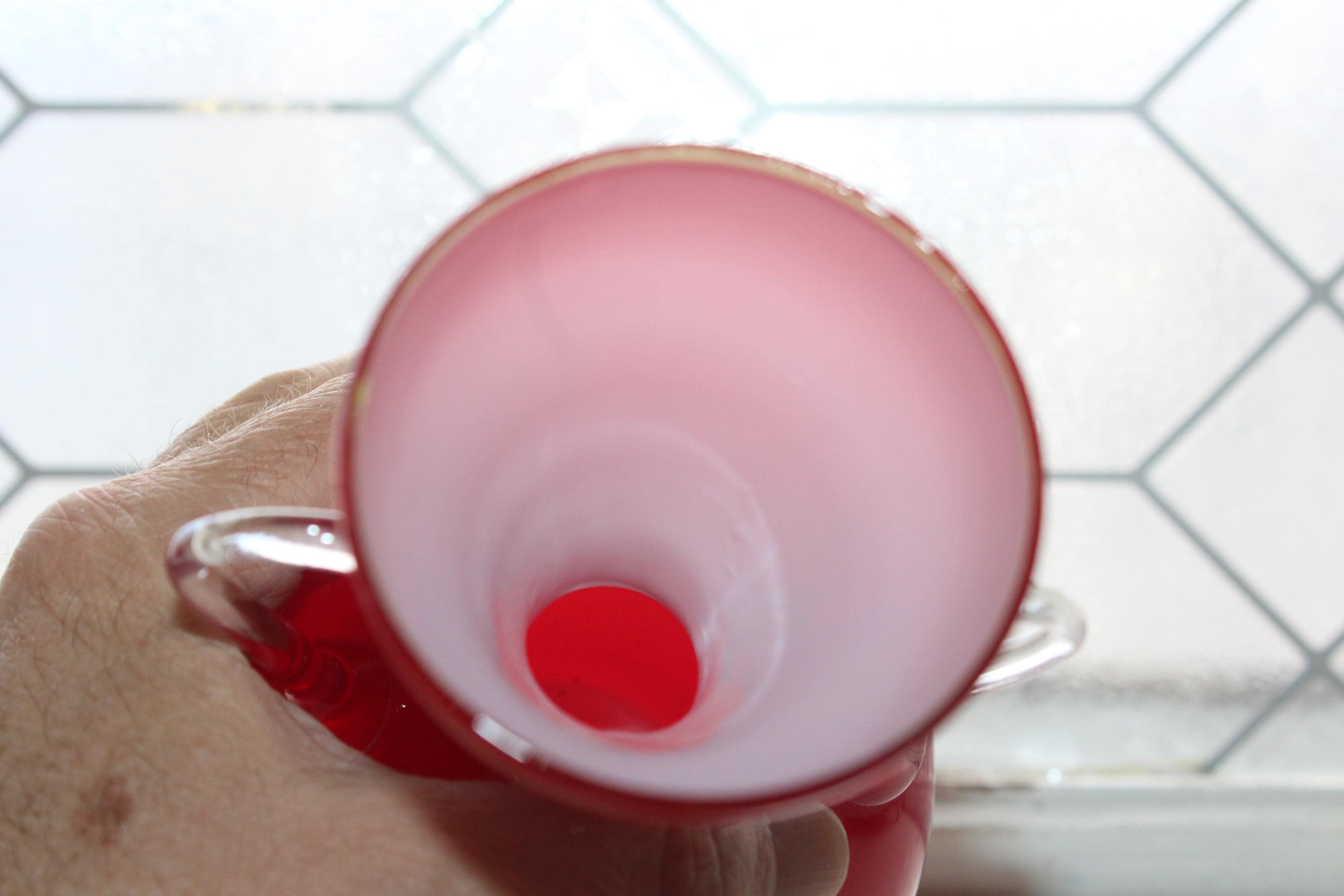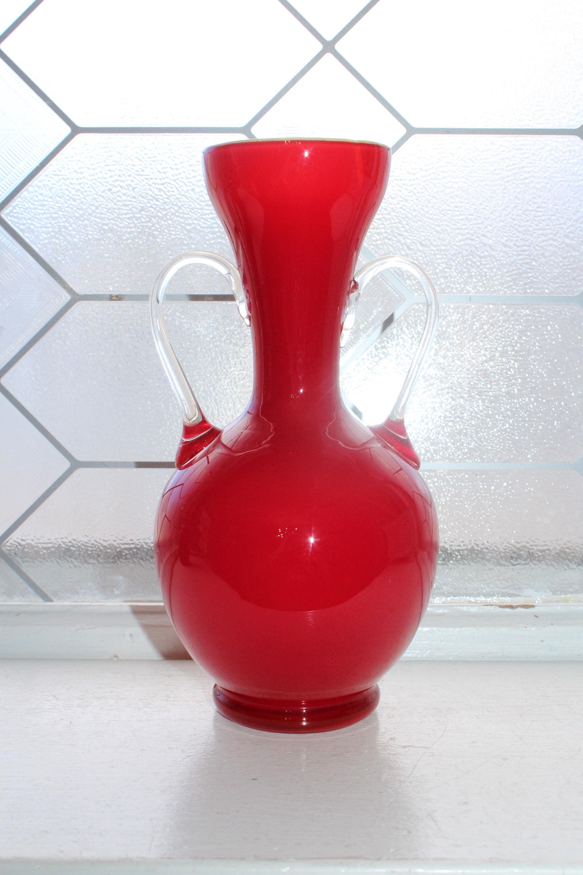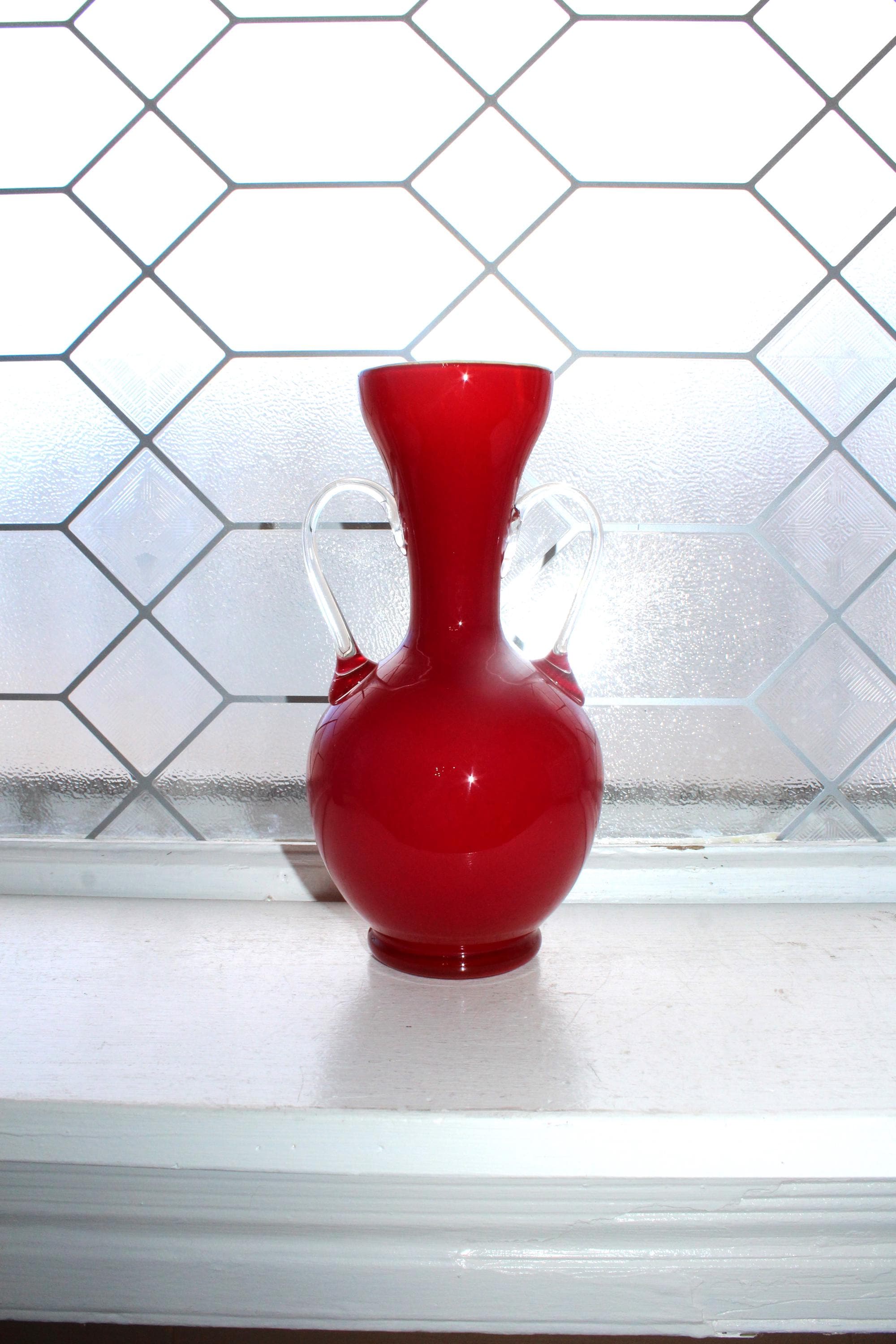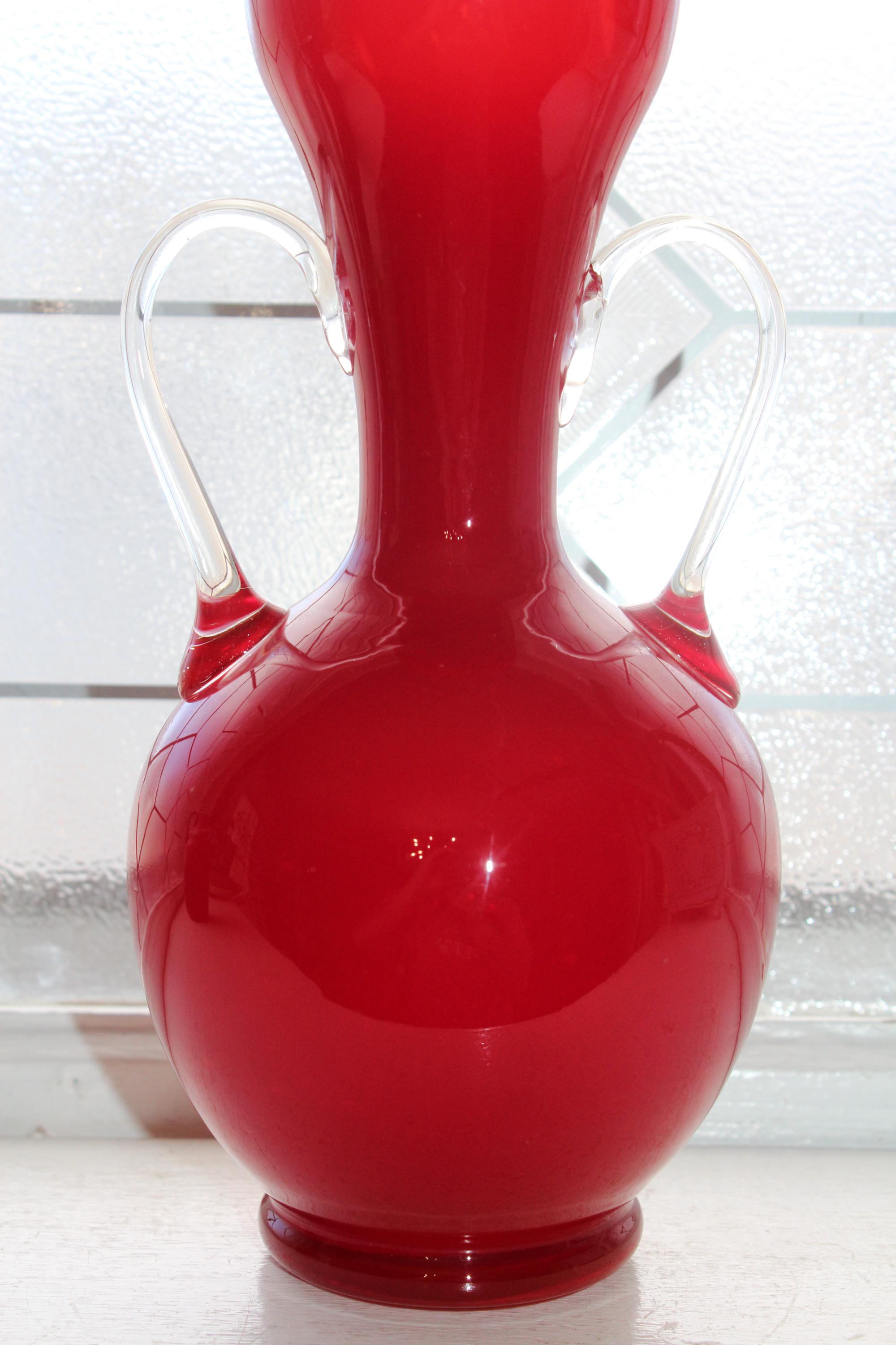 This is a vintage 1960s Mid Century Italian Stelvia Empoli Opalina Fiorentina red cased glass vase with clear handles, in excellent condition. The vase measures 8 1/4" high. No chips or cracks, displays very well. Enjoy!