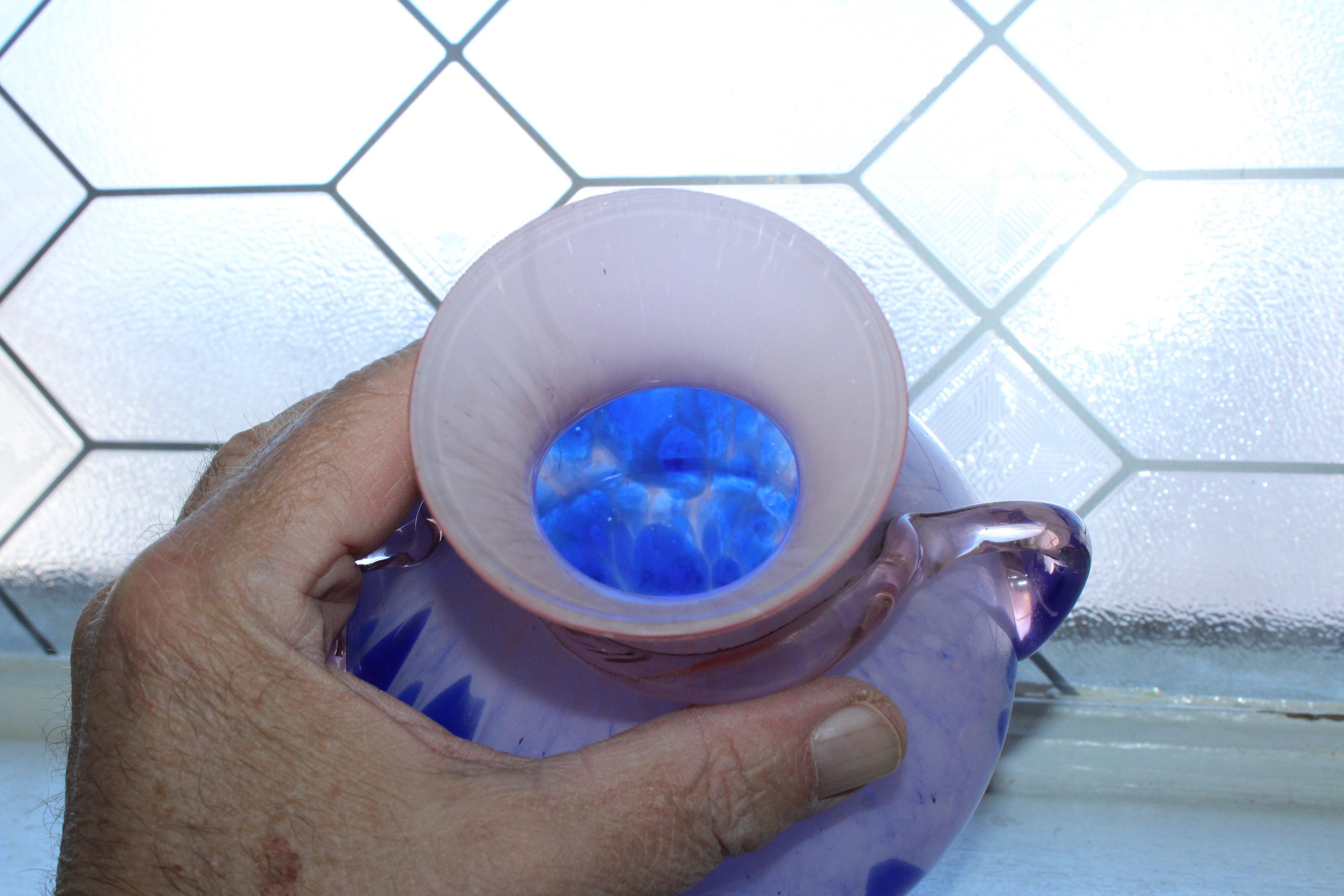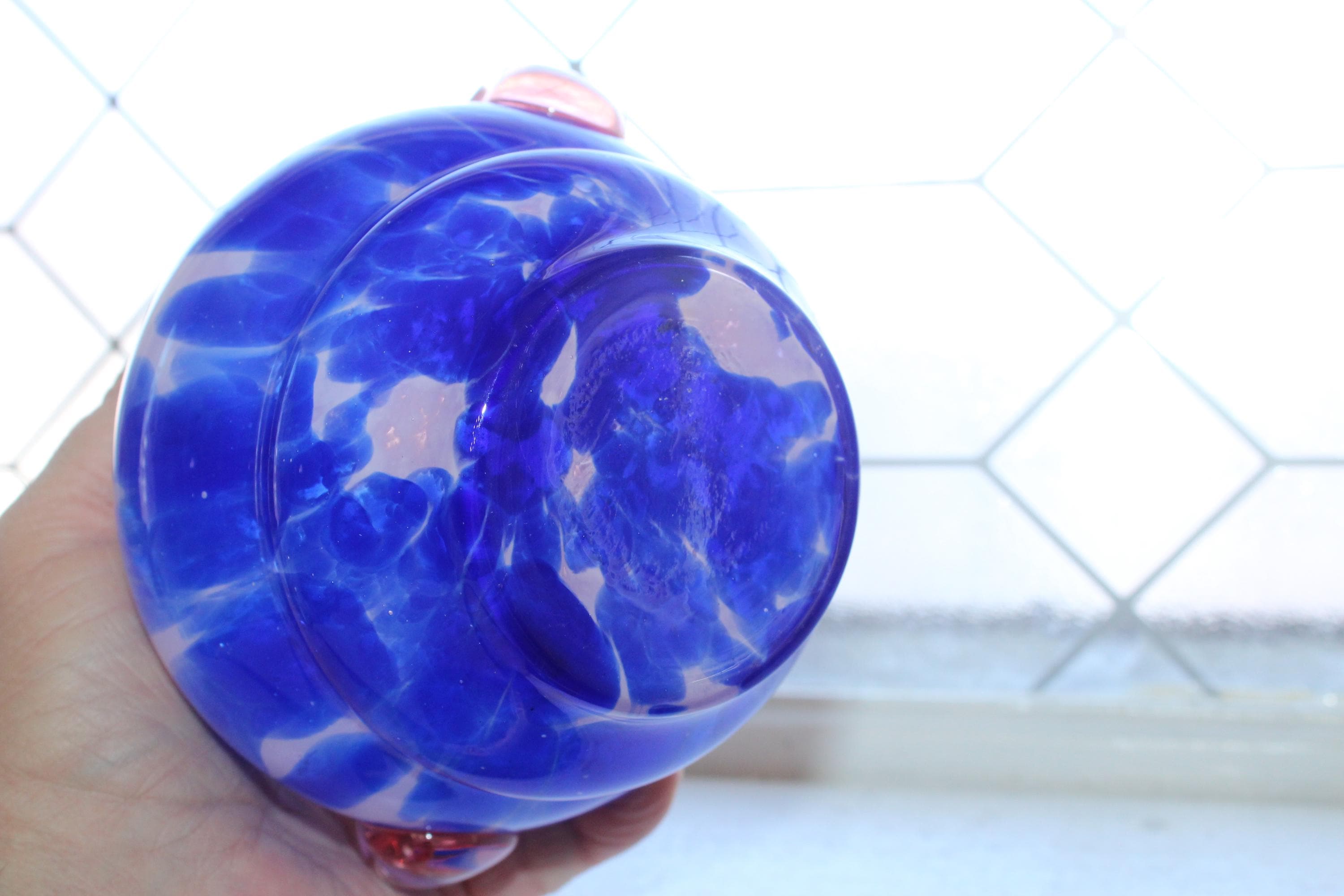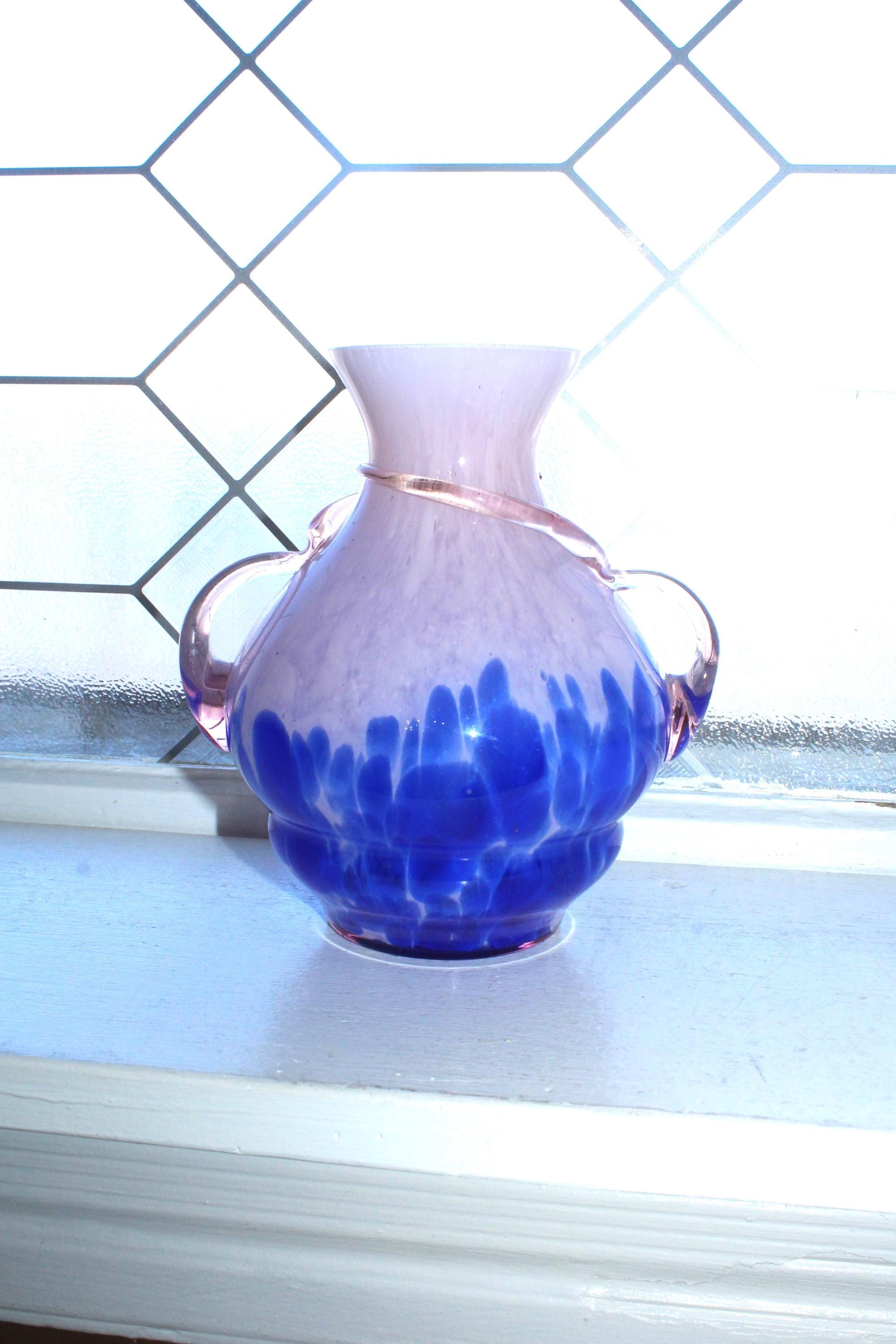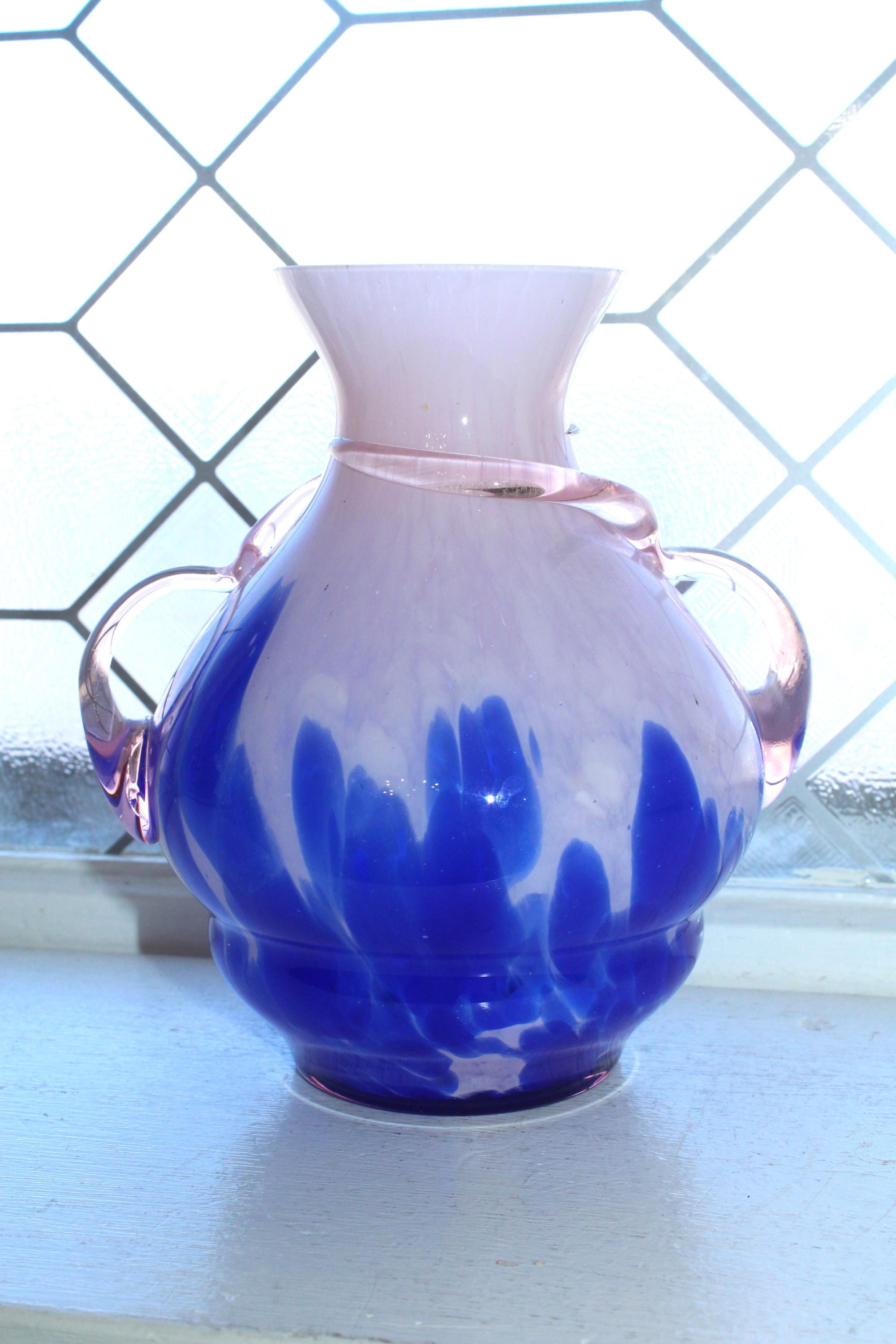This is an interesting vintage Venetian Empoli handmade art glass pink and cobalt blue vase with glass thread and handles, in excellent condition. It measures 6 1/2" high x 6" wide and has no chips or cracks, just some very minor rim roughness, great for use or display. Enjoy!
