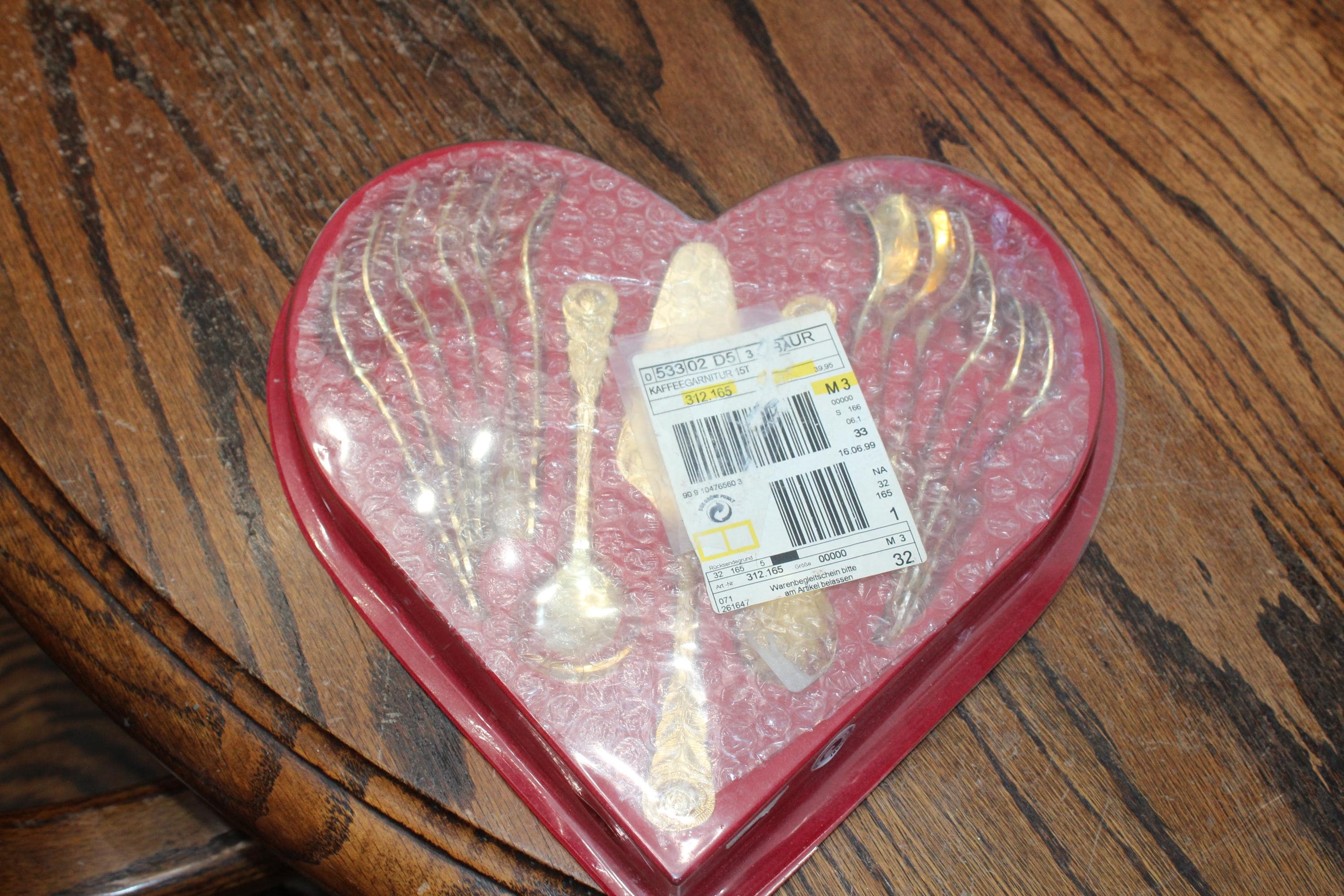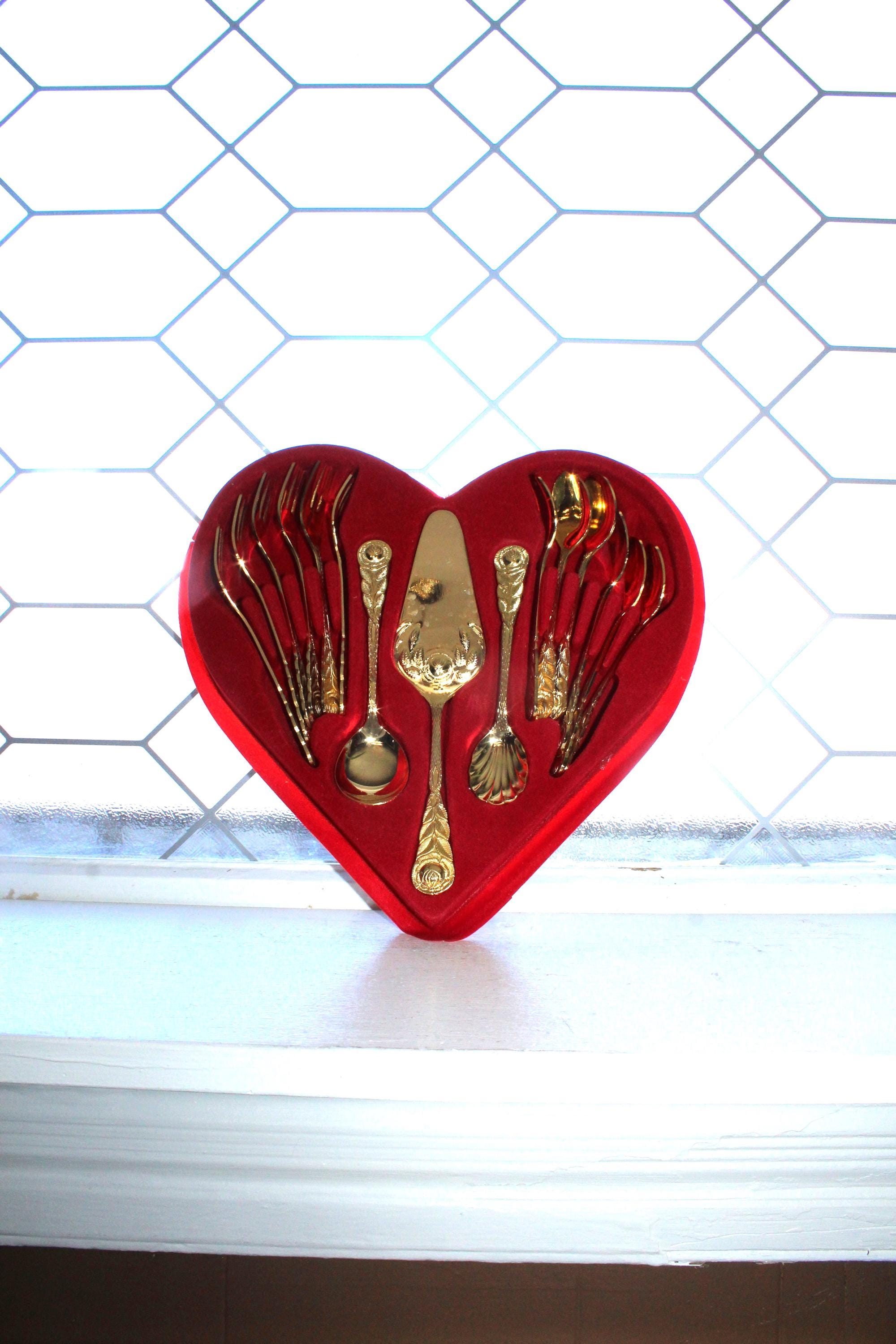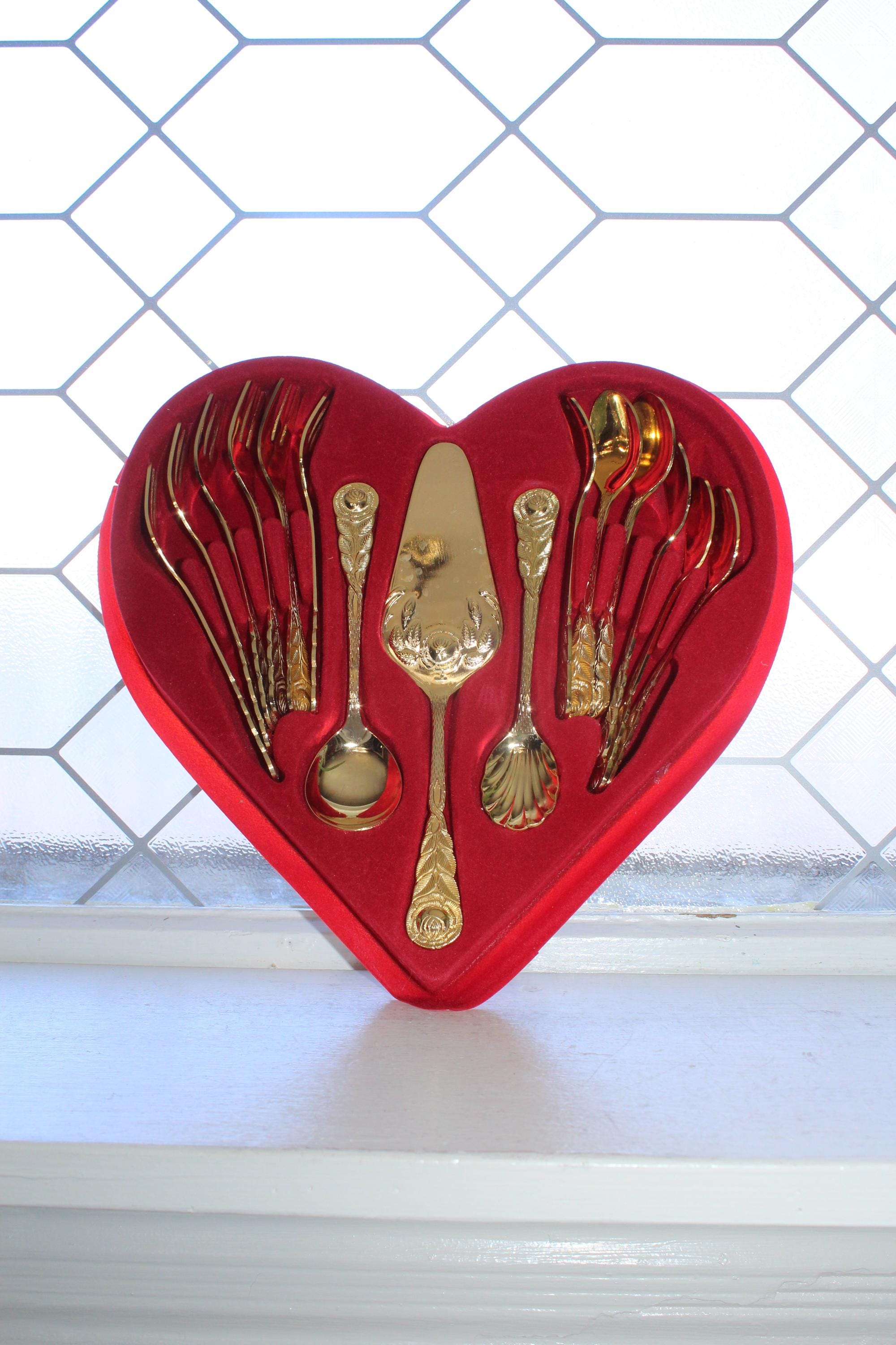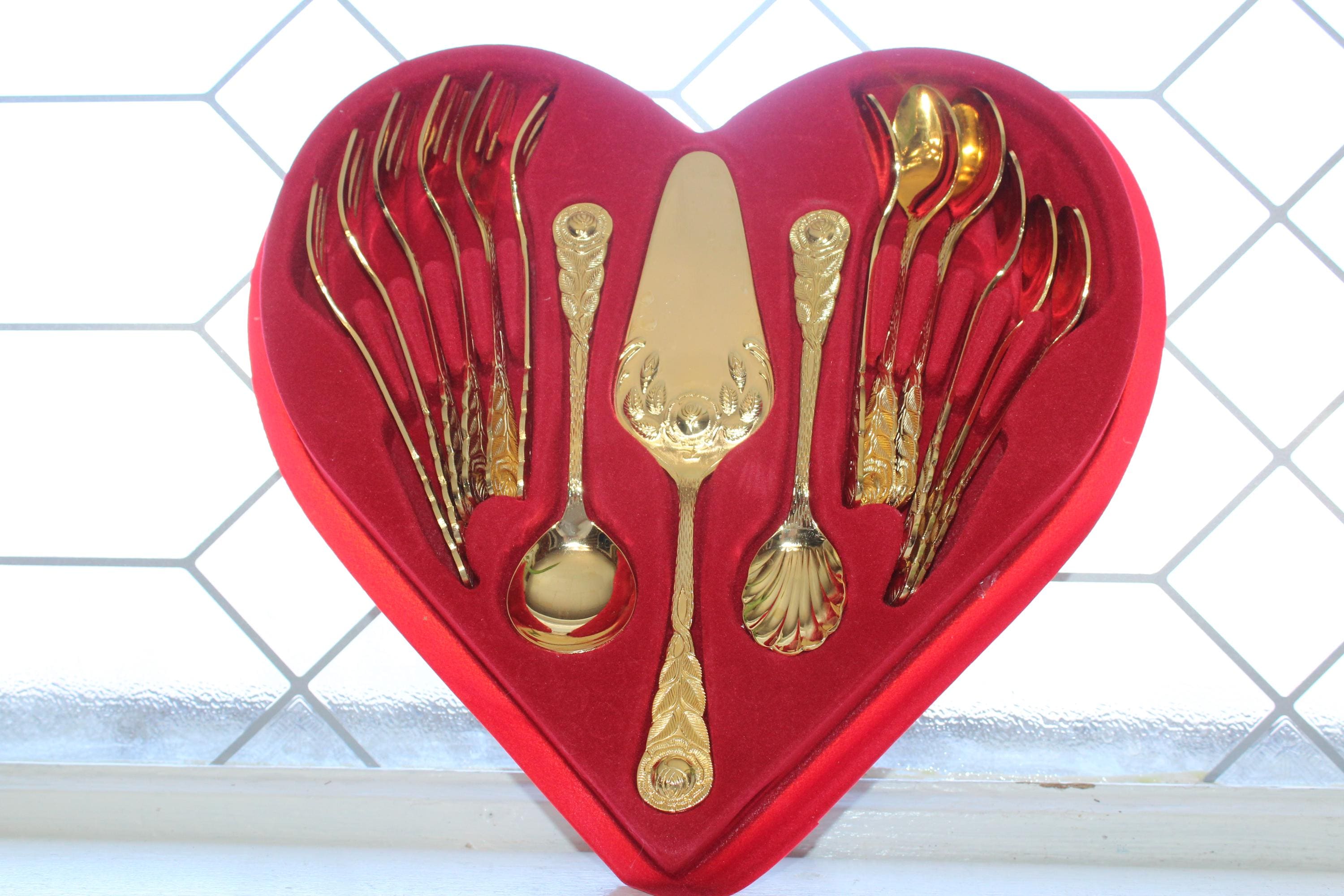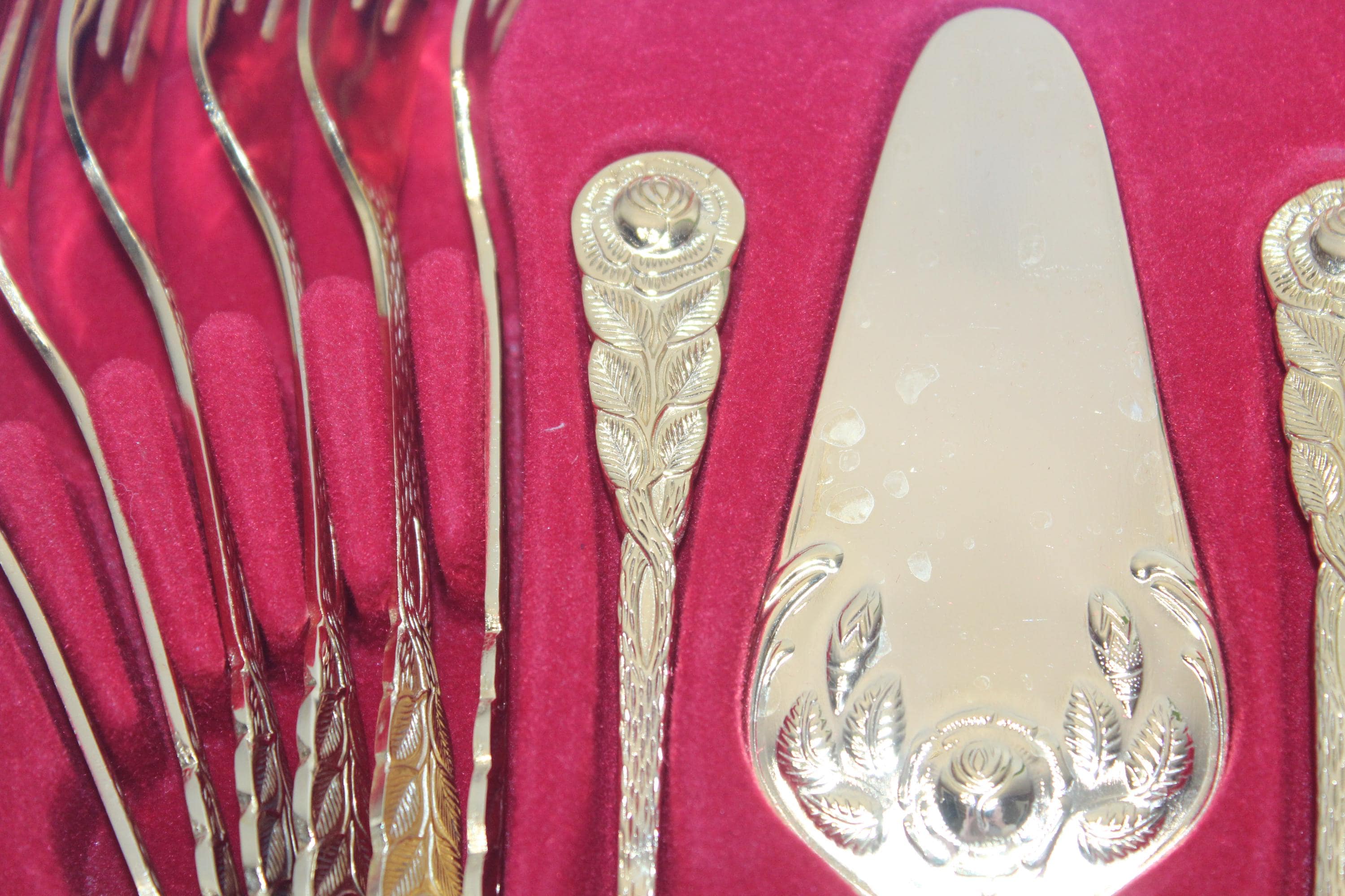 This is a boxed gold plated cake and coffee serving set for 6 in the Hildesheimer Rose pattern by Esmeyer, consisting of 6 spoons, 6 forks, 2 serving spoons and one cake/pastry server, in excellent condition. Enjoy!