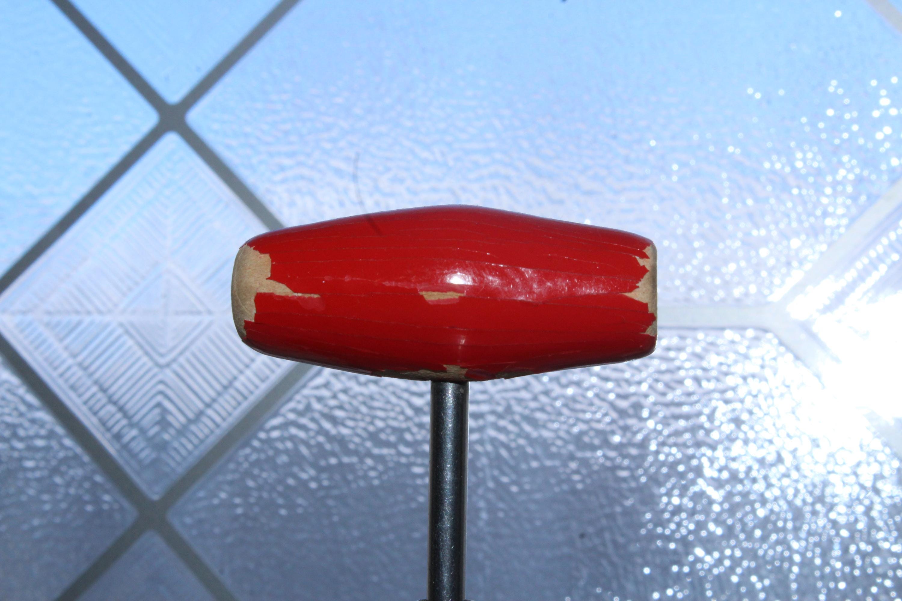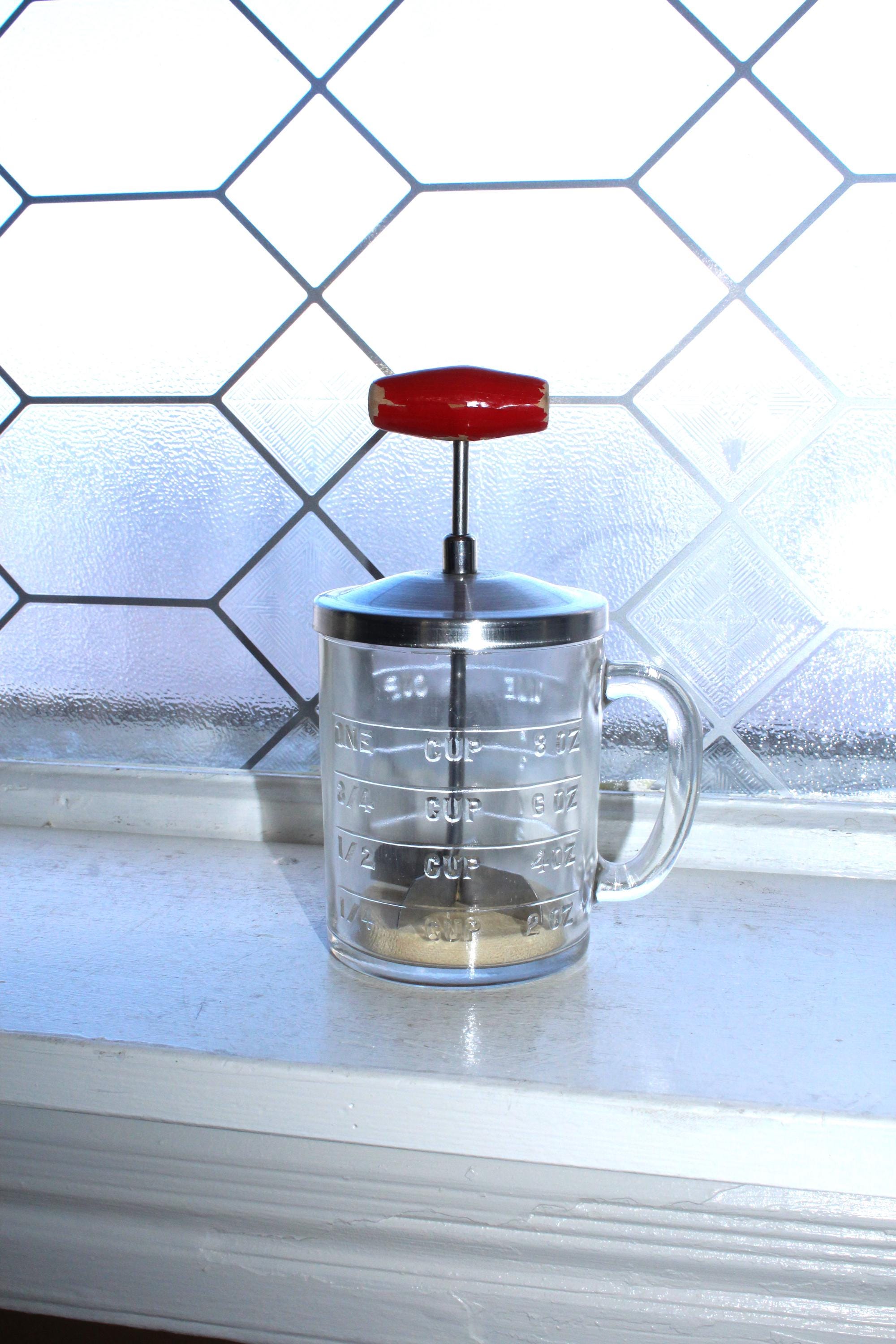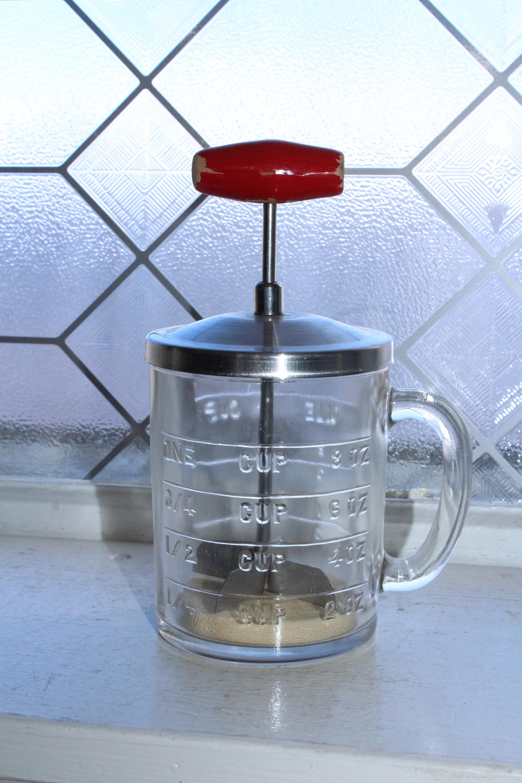 This is a 1950s Hazel Altas kitchen chopper in very good condition. It has a glass measuring cup with a metal lid and spring loaded chopper, with a red wooden knob handle. No cracks. It measures 4" to the top edge of the lid. Enjoy!
