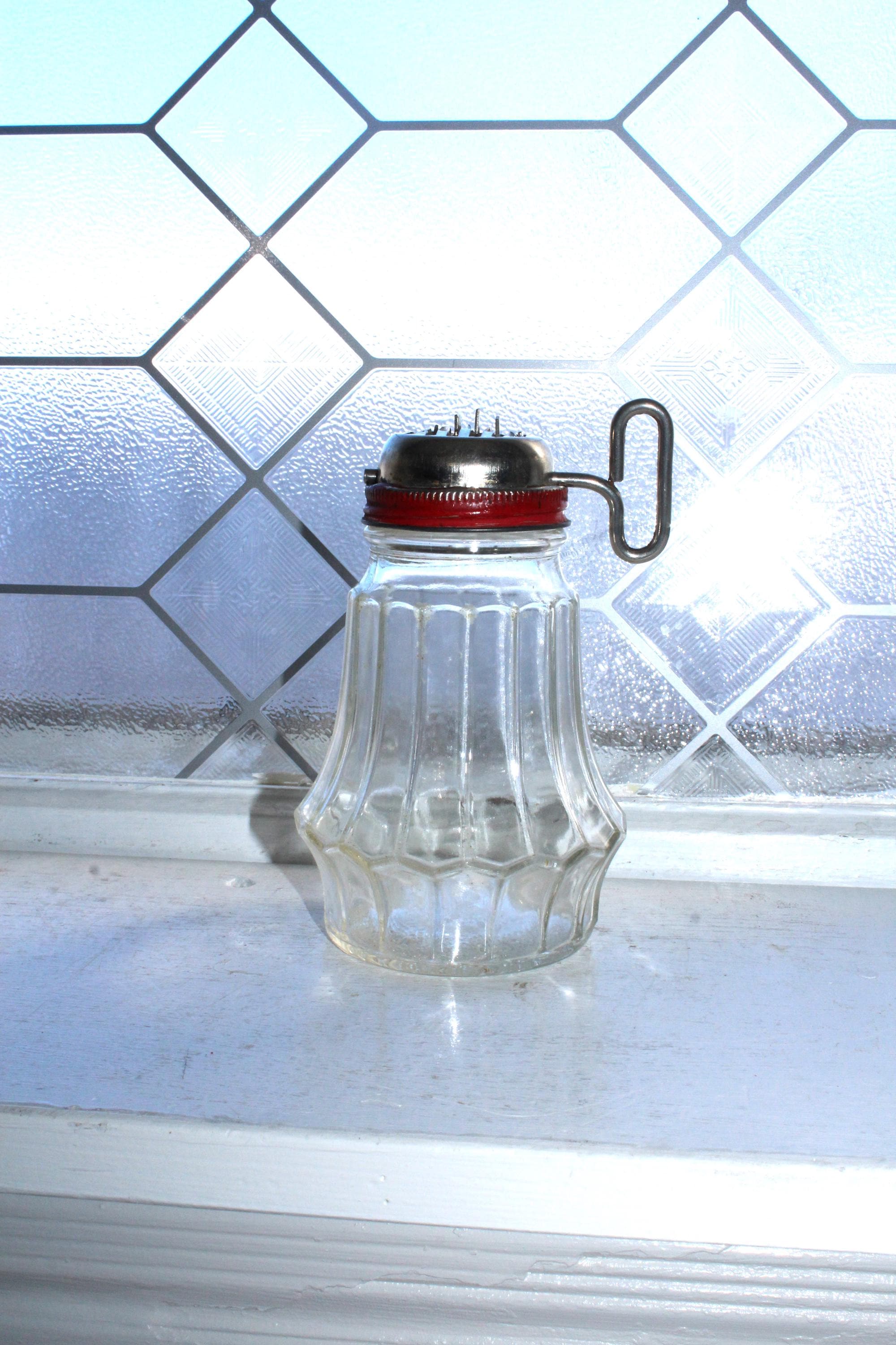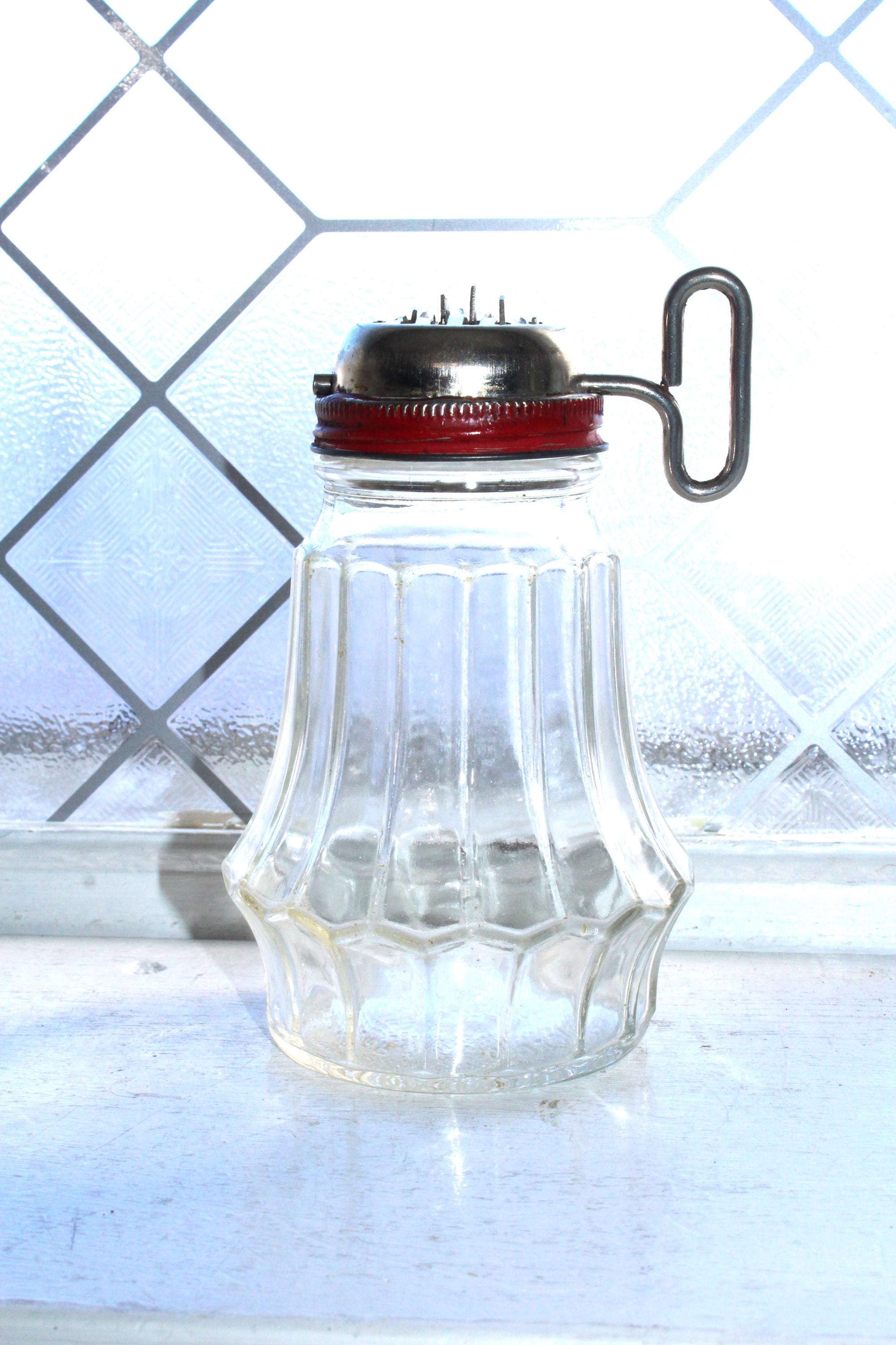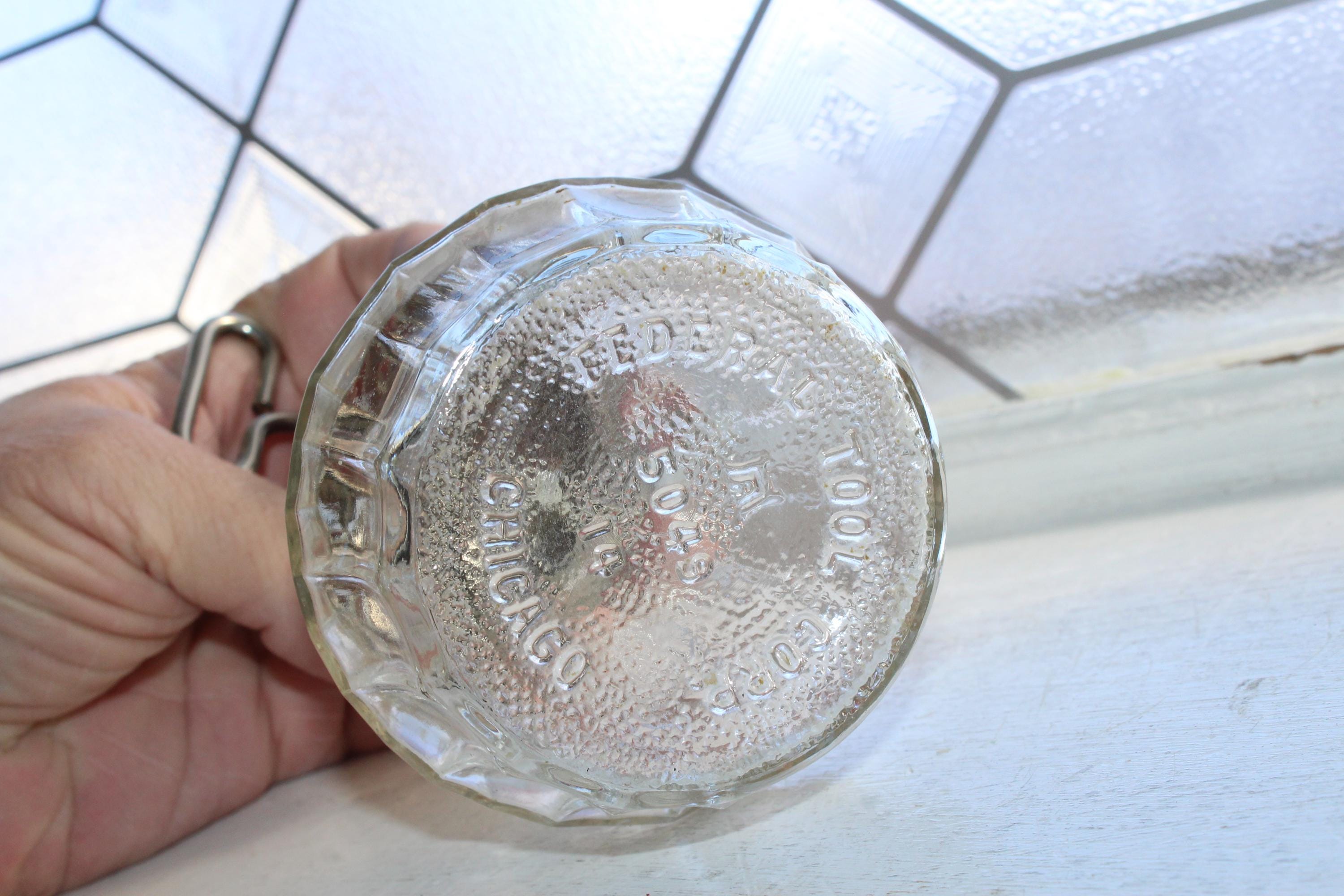 This is a vintage kitchen nut grinder made by Hazel Atlas and Federal Tool Corp., in good condition. It has a glass jar with a metal lid and grinder. No chips or cracks. It measures 5 1/2" to the top edge of the lid. Enjoy!