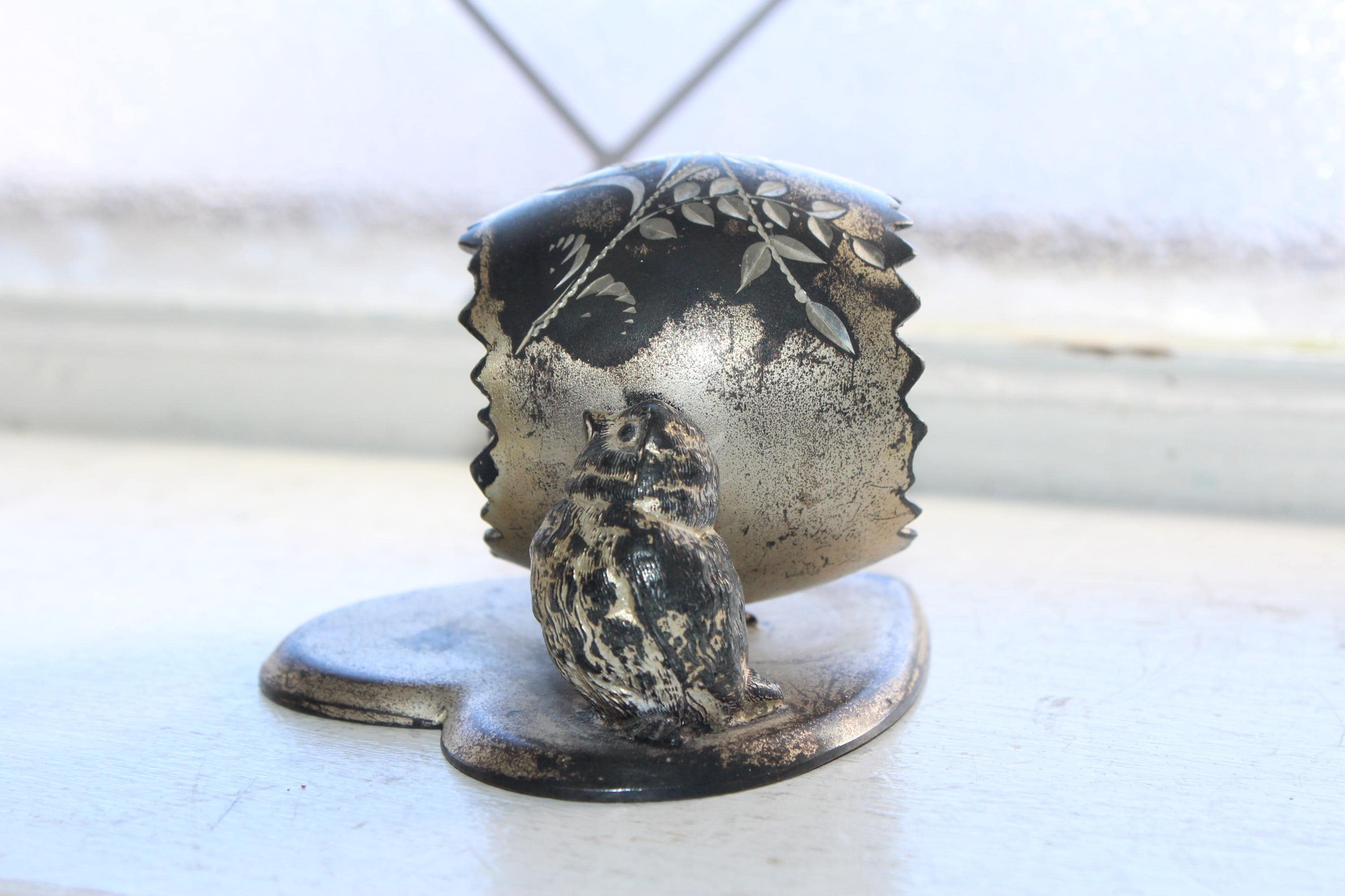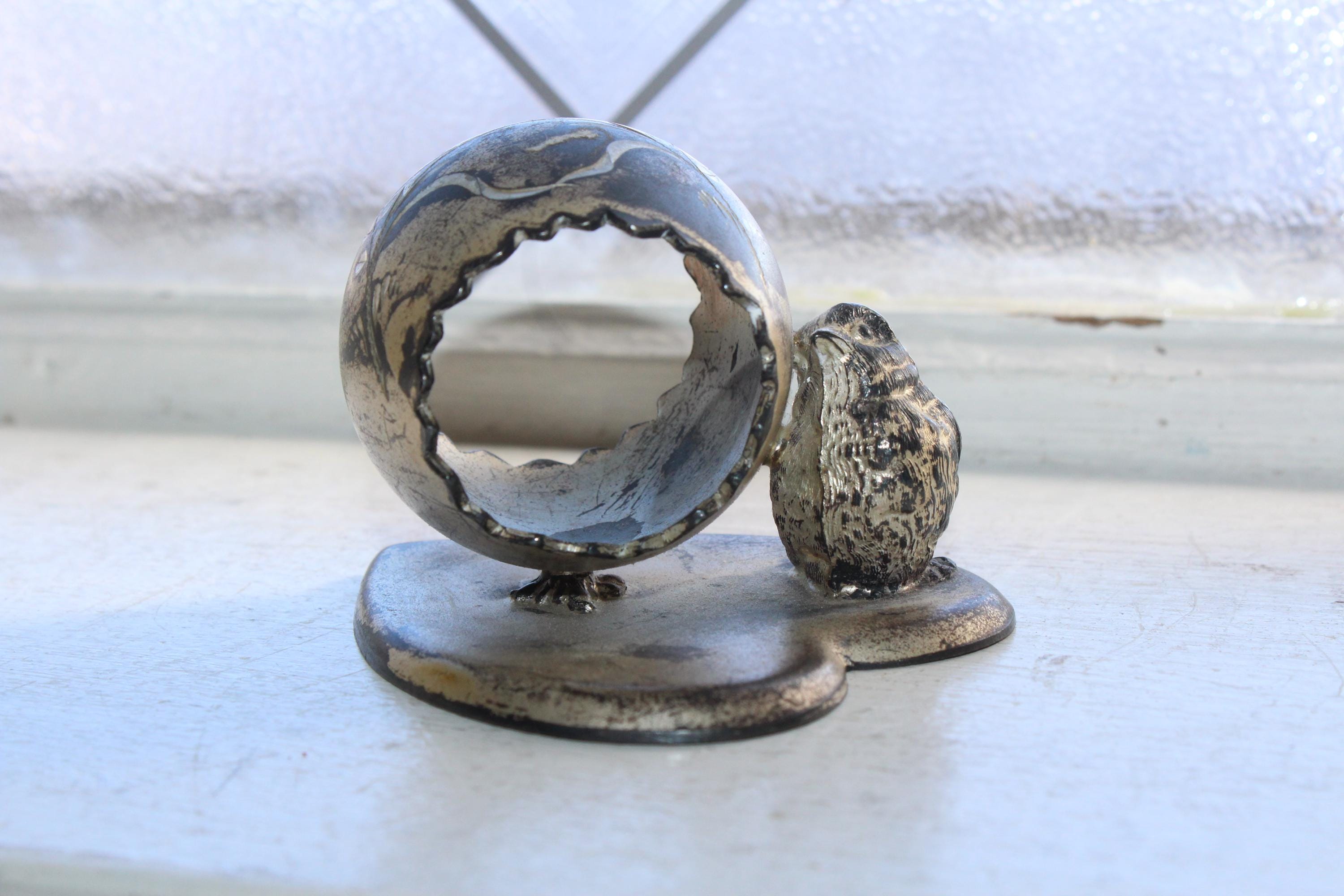 Antique silverplate figural napkin ring featuring a bird and heart, made by Rockford Silverplate, in fair condition. It measures 3 1/2" high. The finish is worn, but it still displays well. Enjoy!