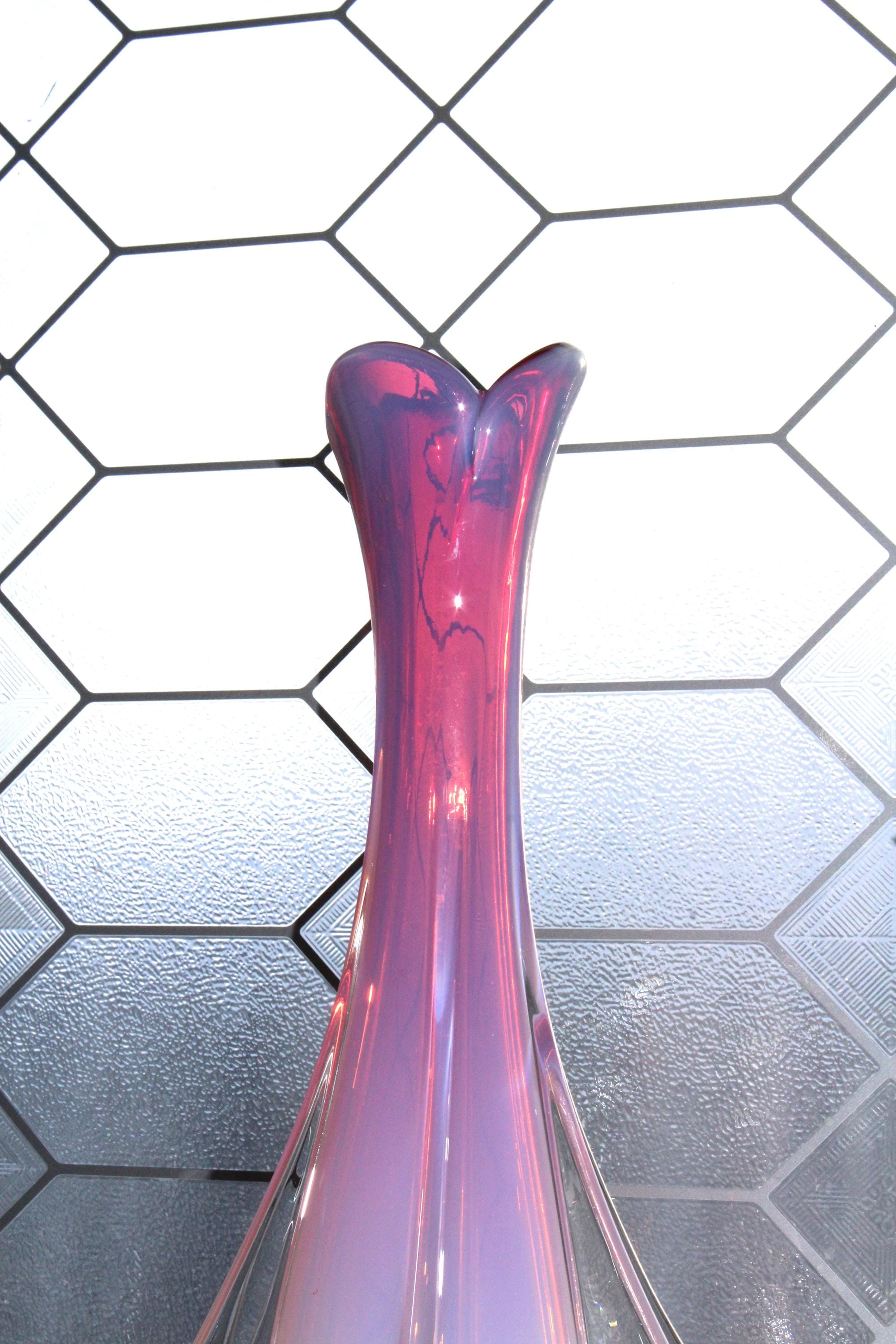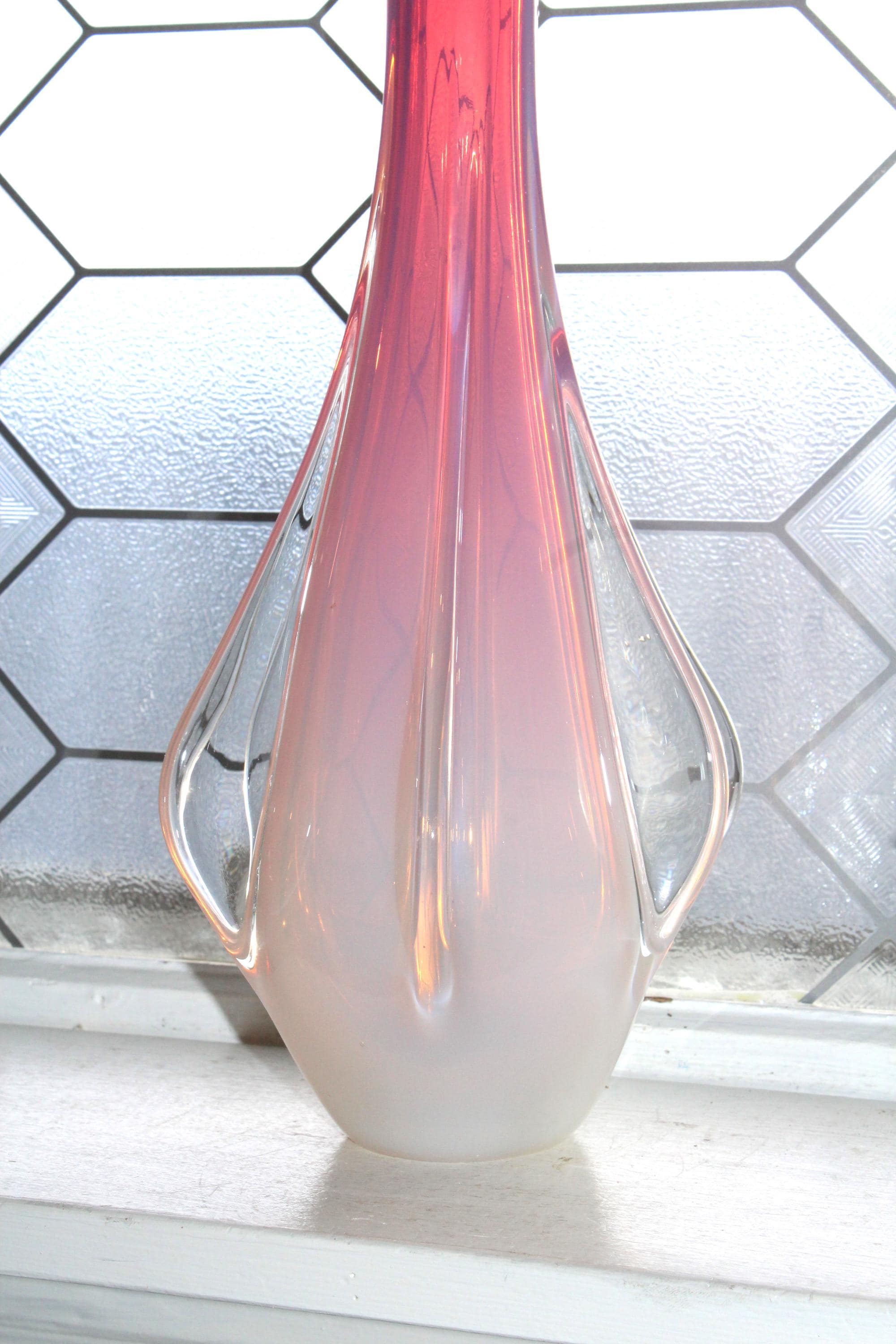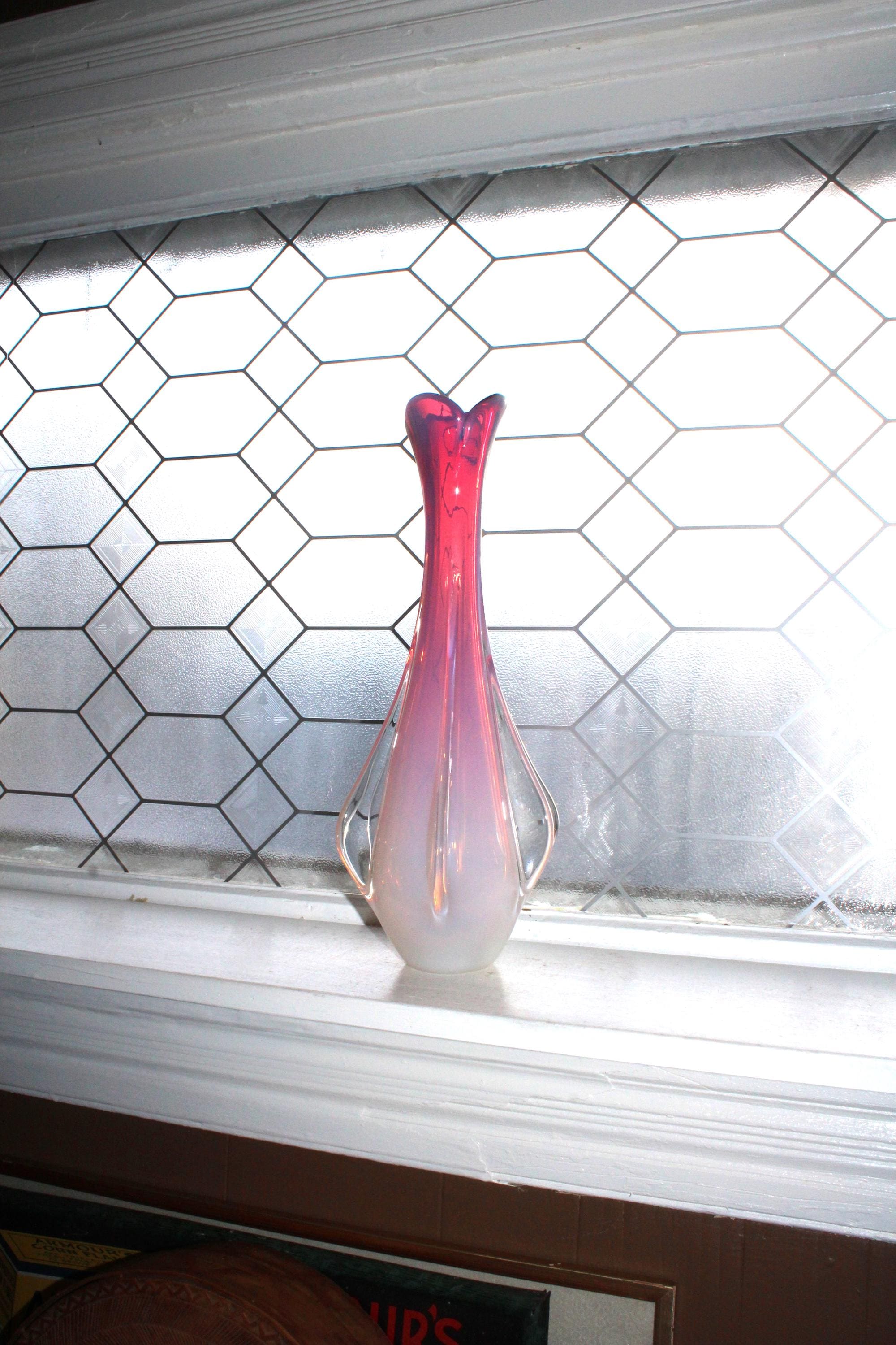 This is a rare vintage Fratelli Toso pink, opalescent and clear glass winged or finned torpedo vase circa 1950's by Fratelli Toso, 15 1/4" tall in beautiful colors, in excellent condition. There are no chips or scratches and it displays very well. It weighs 4 1/4 lbs. While this piece is not signed, the work is readily identifiable as Fratelli Toso. Enjoy!