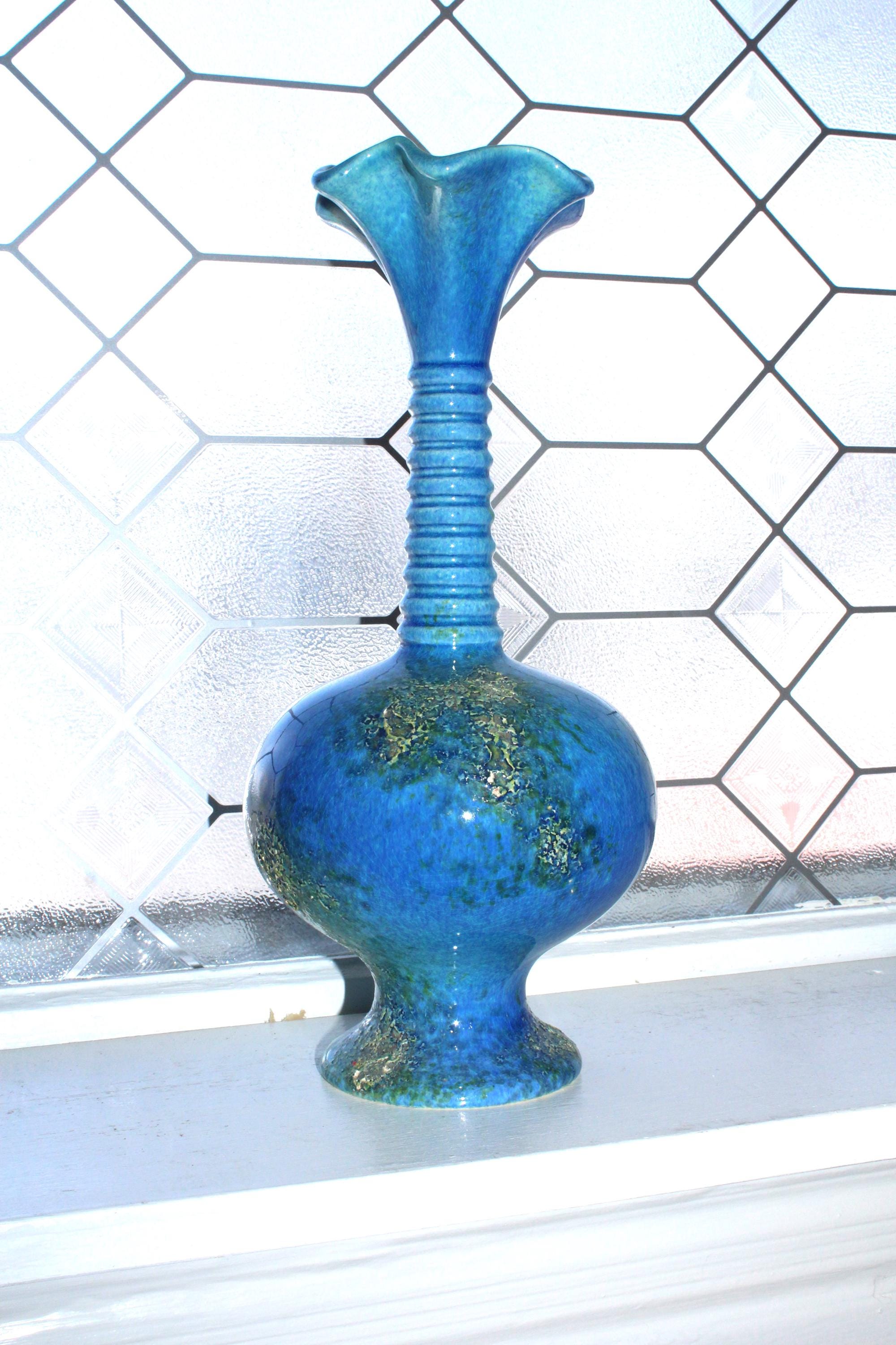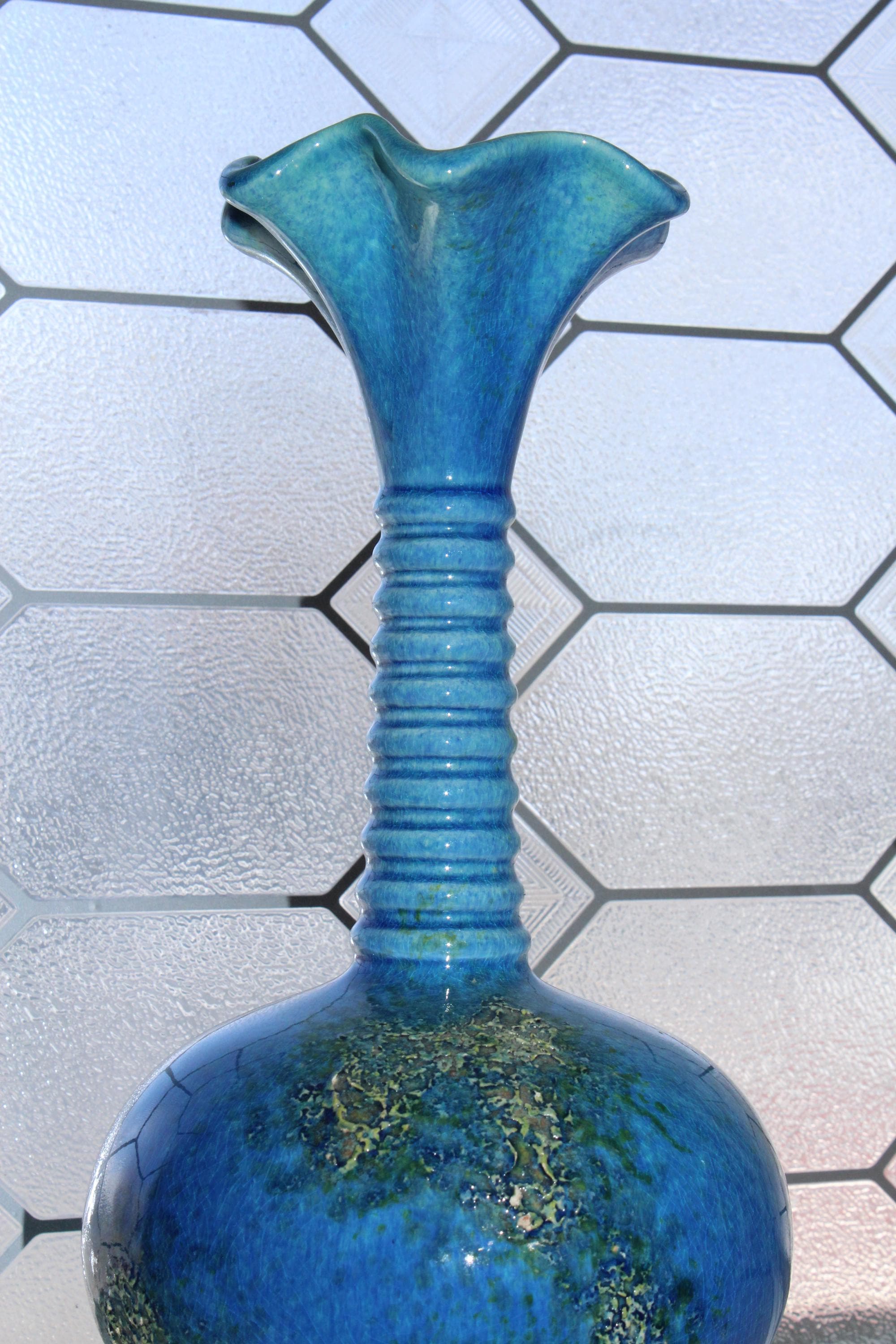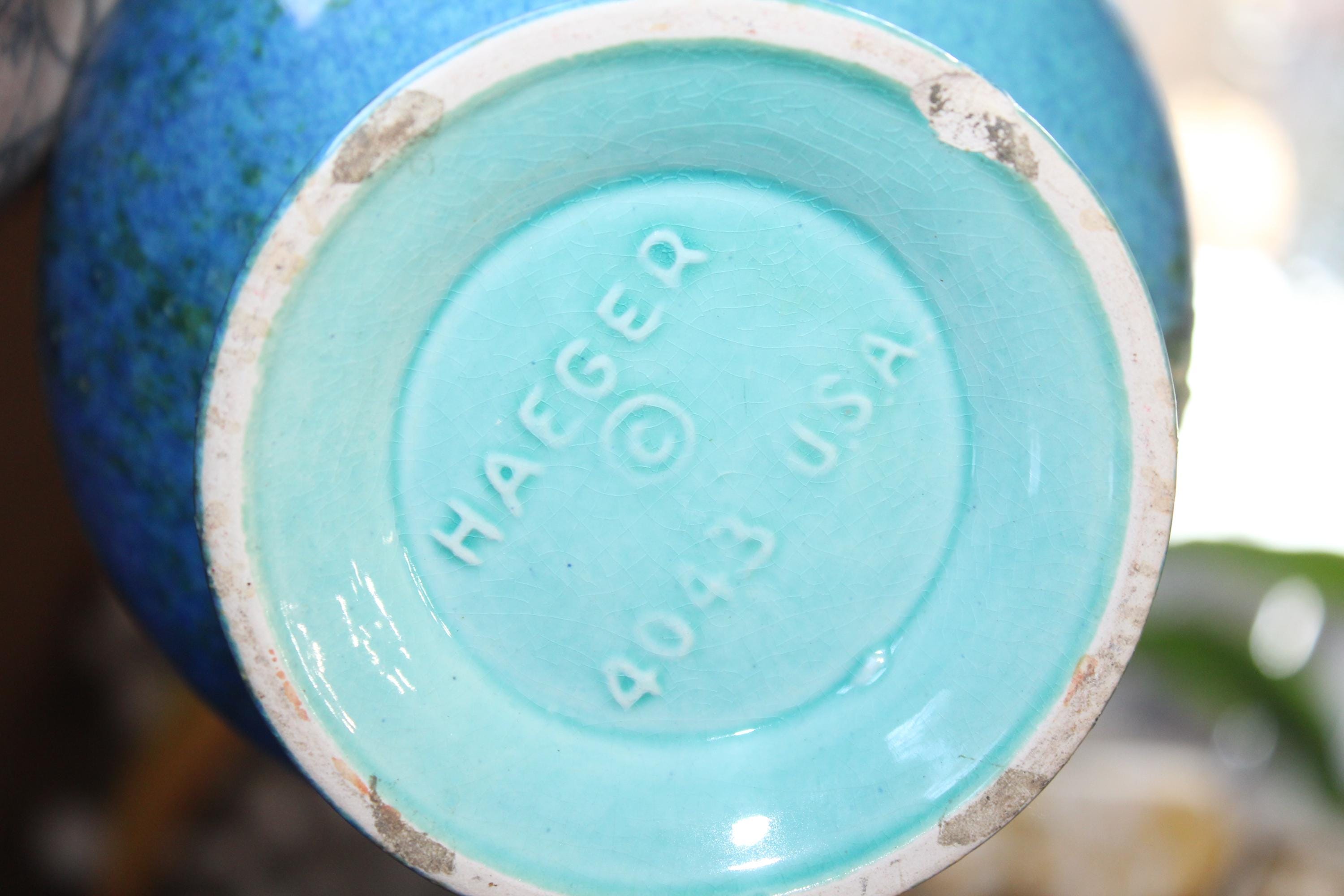 Large vintage Mid Century Royal Haeger pottery vase #4043 with blue green lava volcano/orange peel textured glaze. This gorgeous piece measures 12 1/2" high. It has one small base chip as shown in the photos, great for use or display. Enjoy!