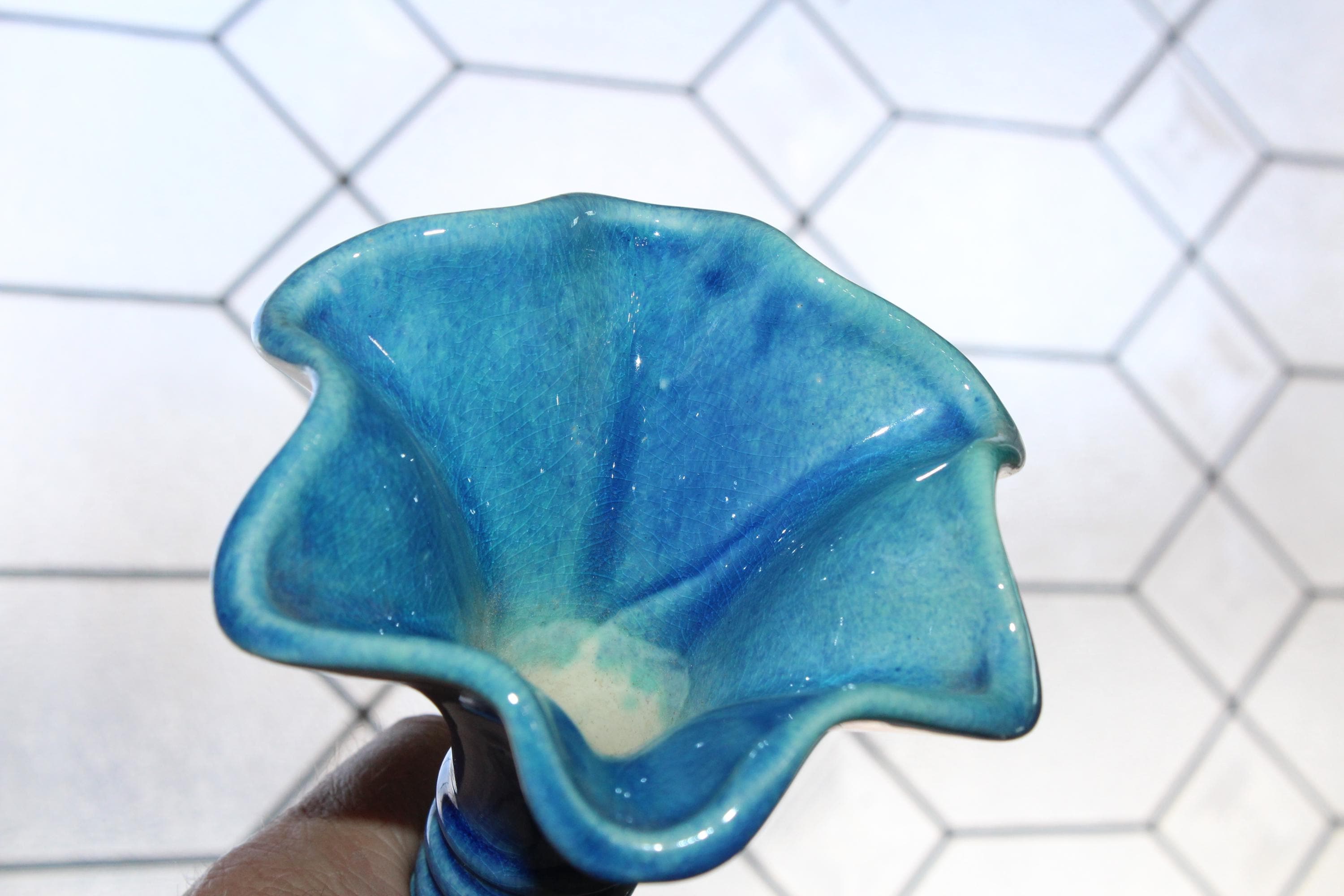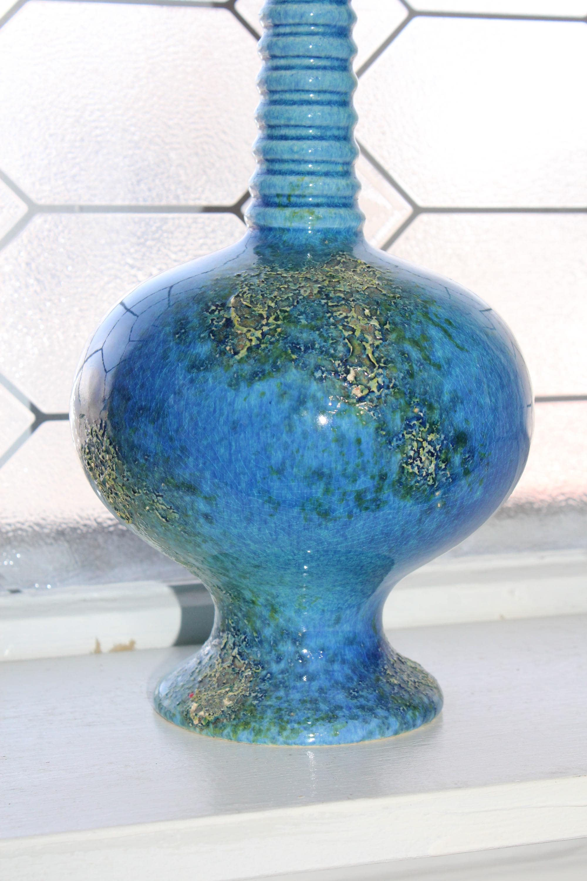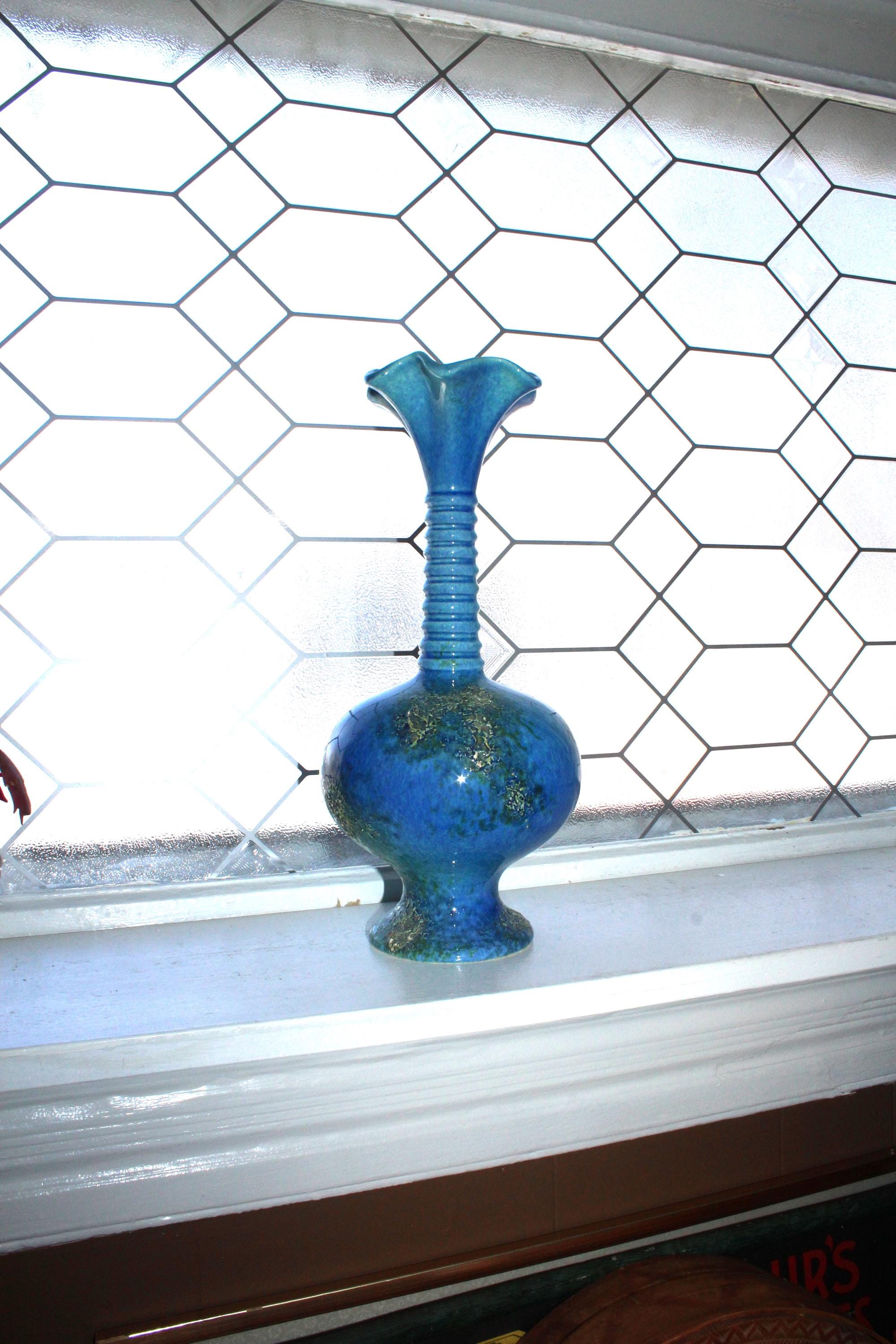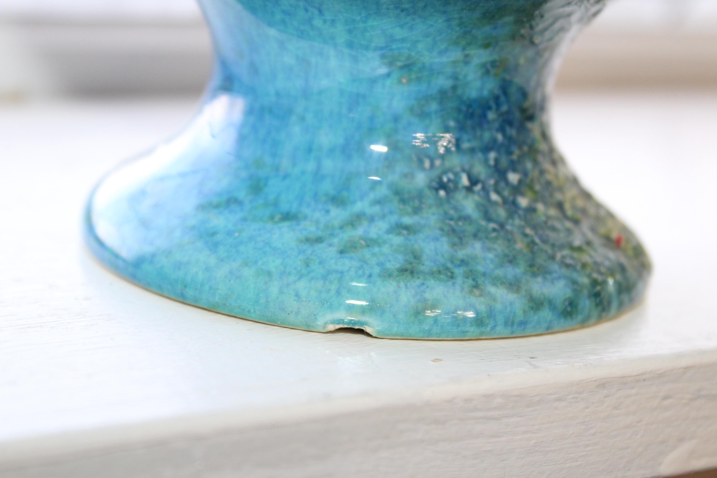 Large vintage Mid Century Royal Haeger pottery vase #4043 with blue green lava volcano/orange peel textured glaze. This gorgeous piece measures 12 1/2" high. It has one small base chip as shown in the photos, great for use or display. Enjoy!