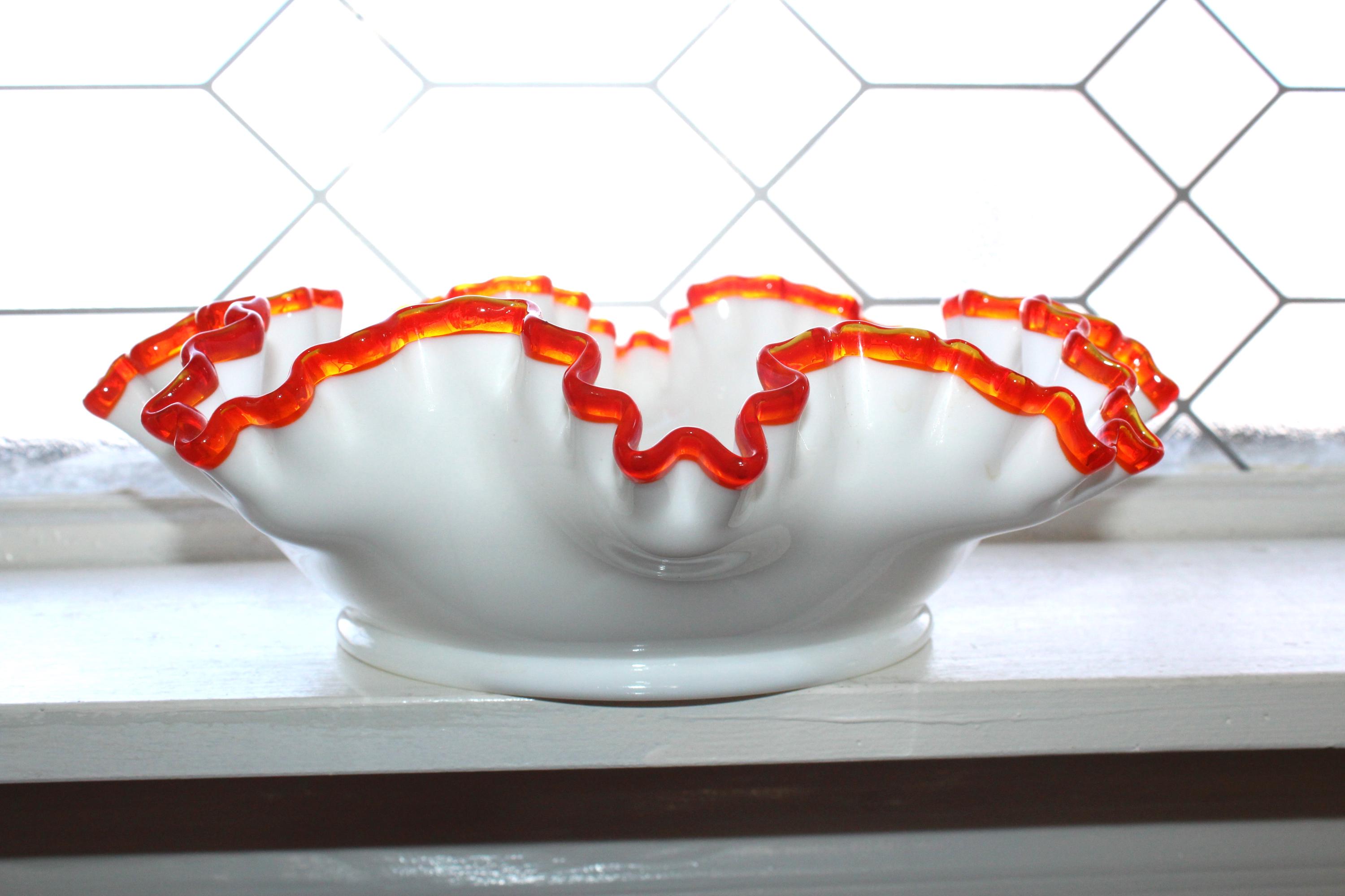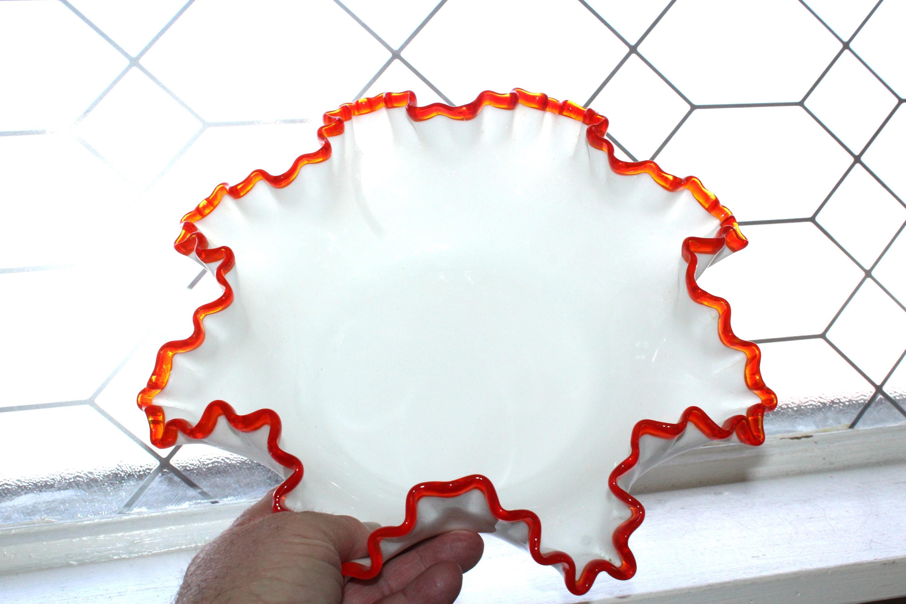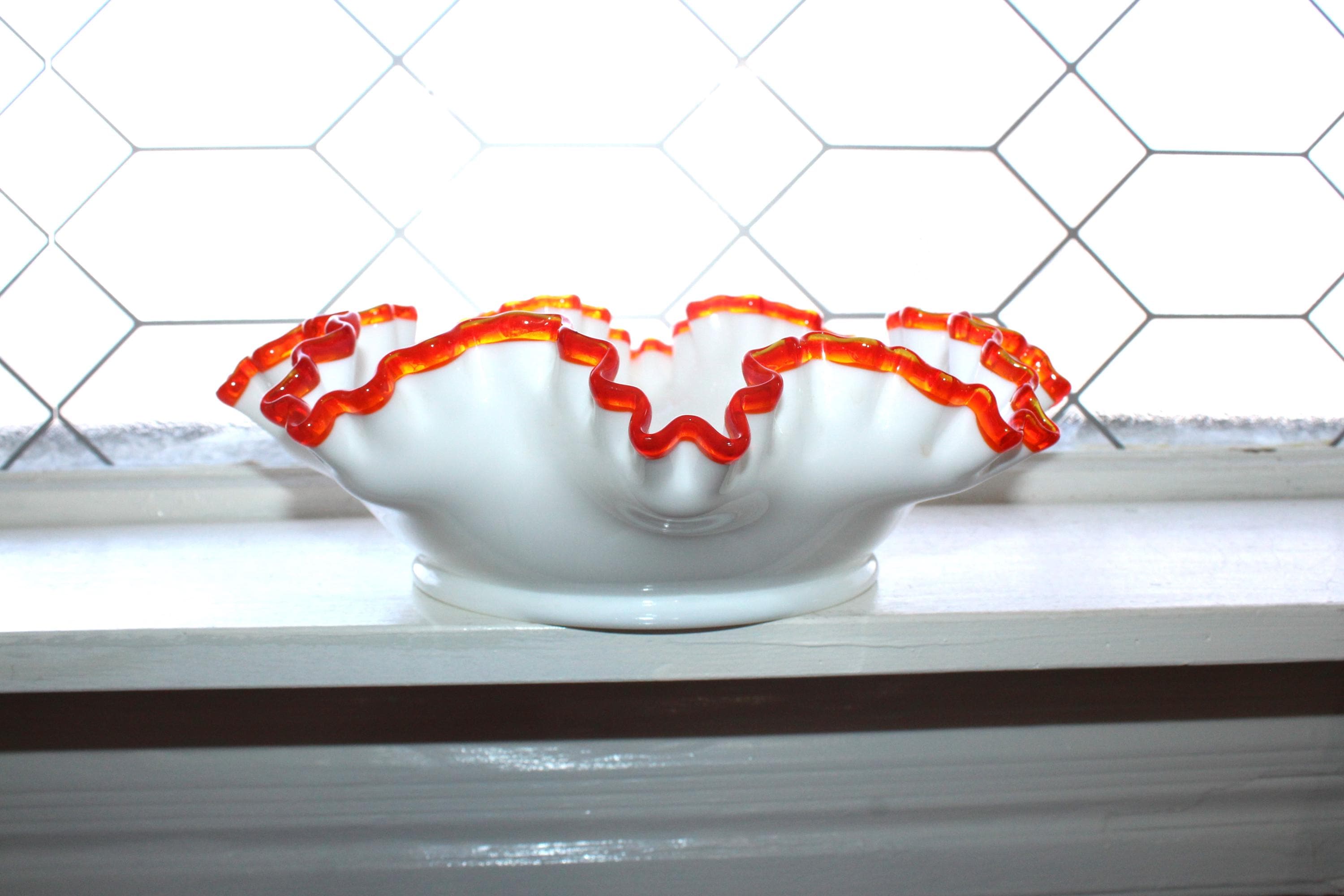 This is a large vintage 1963 Fenton glass Flame Crest ruffled rim bowl, in excellent condition. It measures 11 1/2" wide x 3 3/4" high and has no chips or cracks, perfect for use and display. Enjoy!