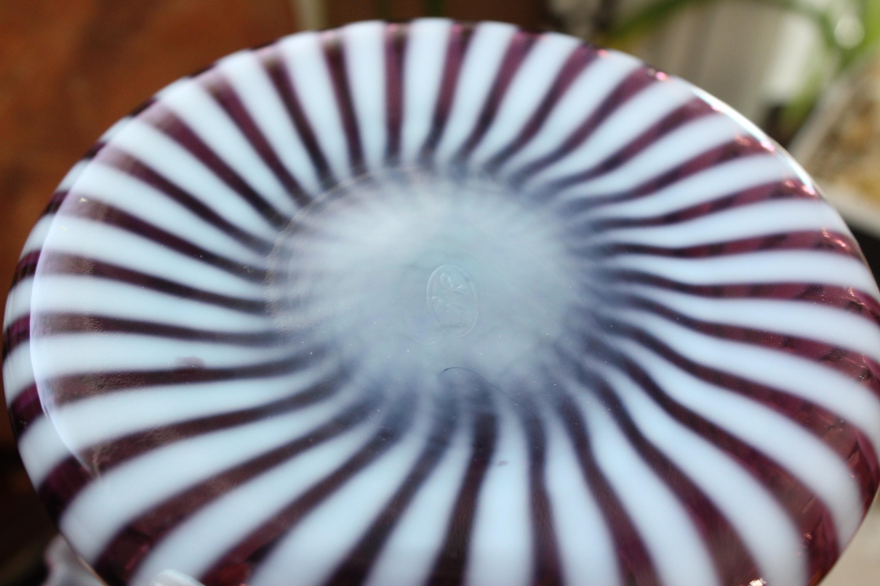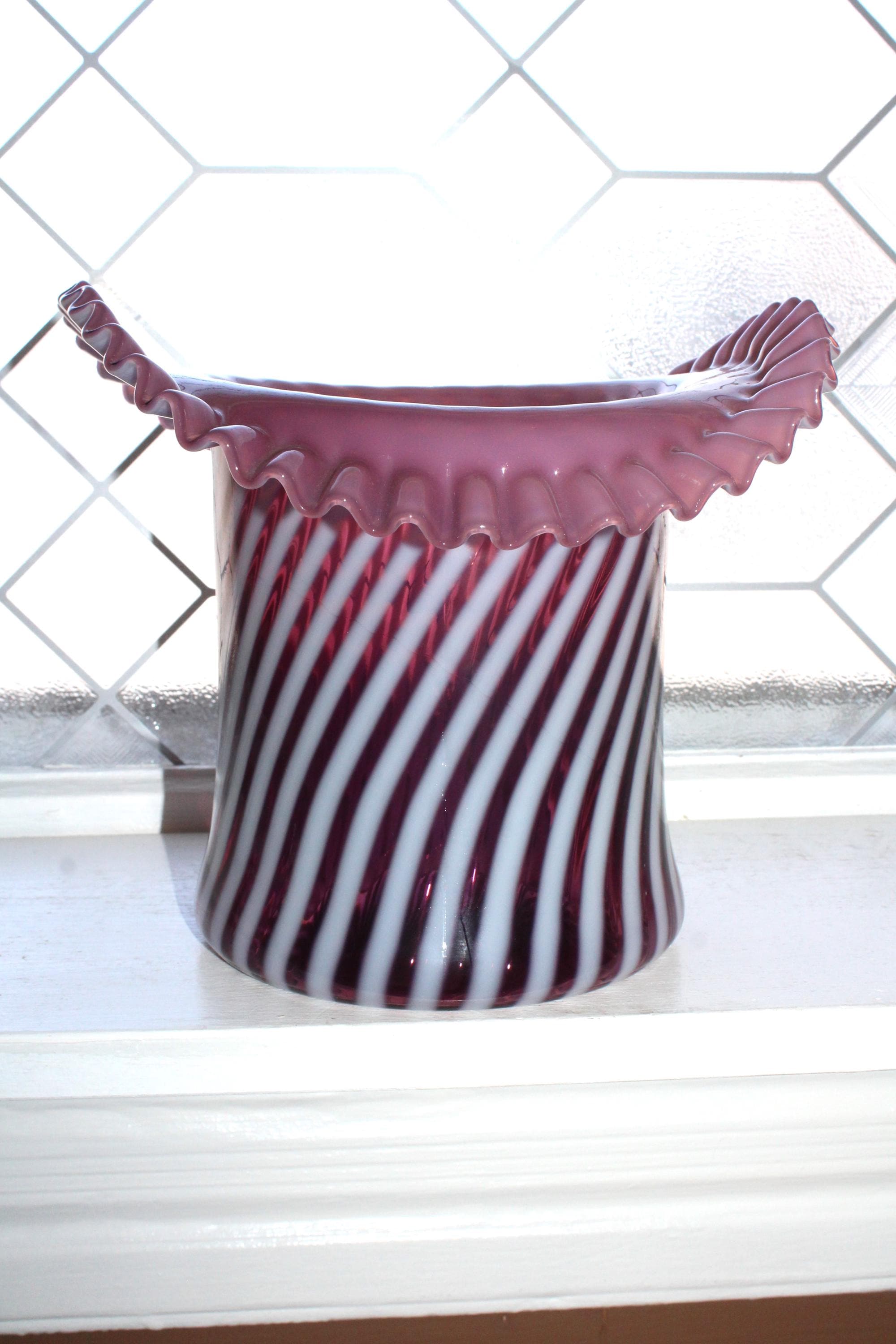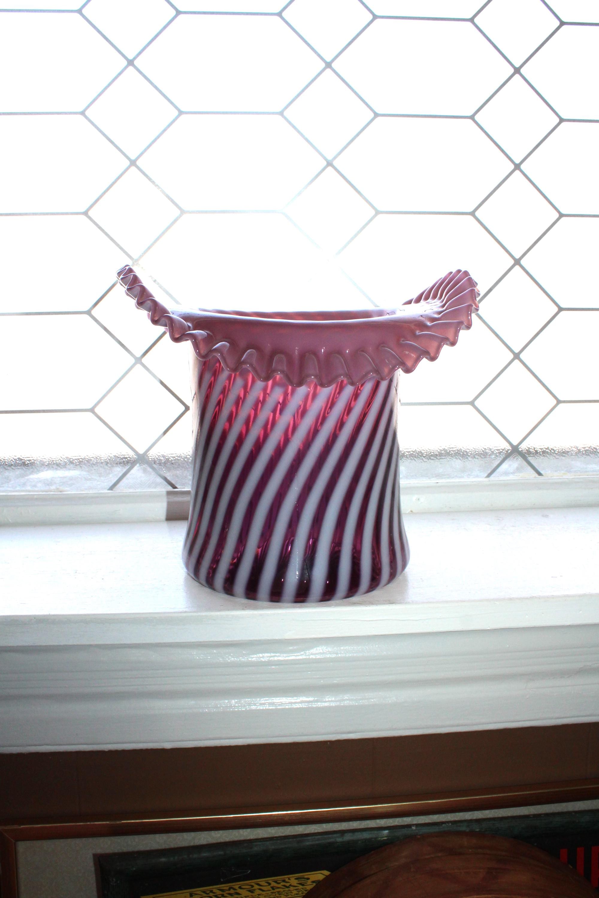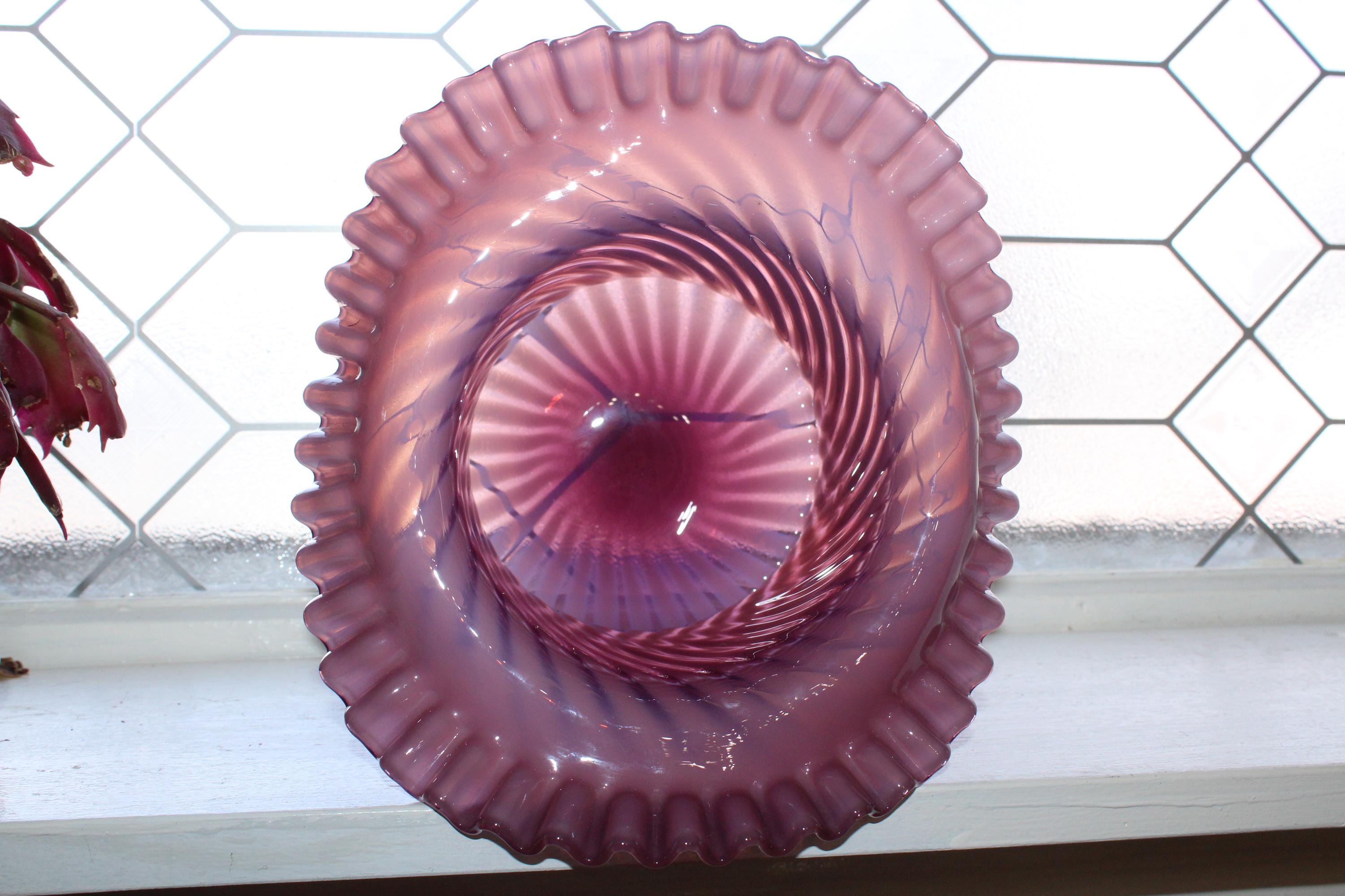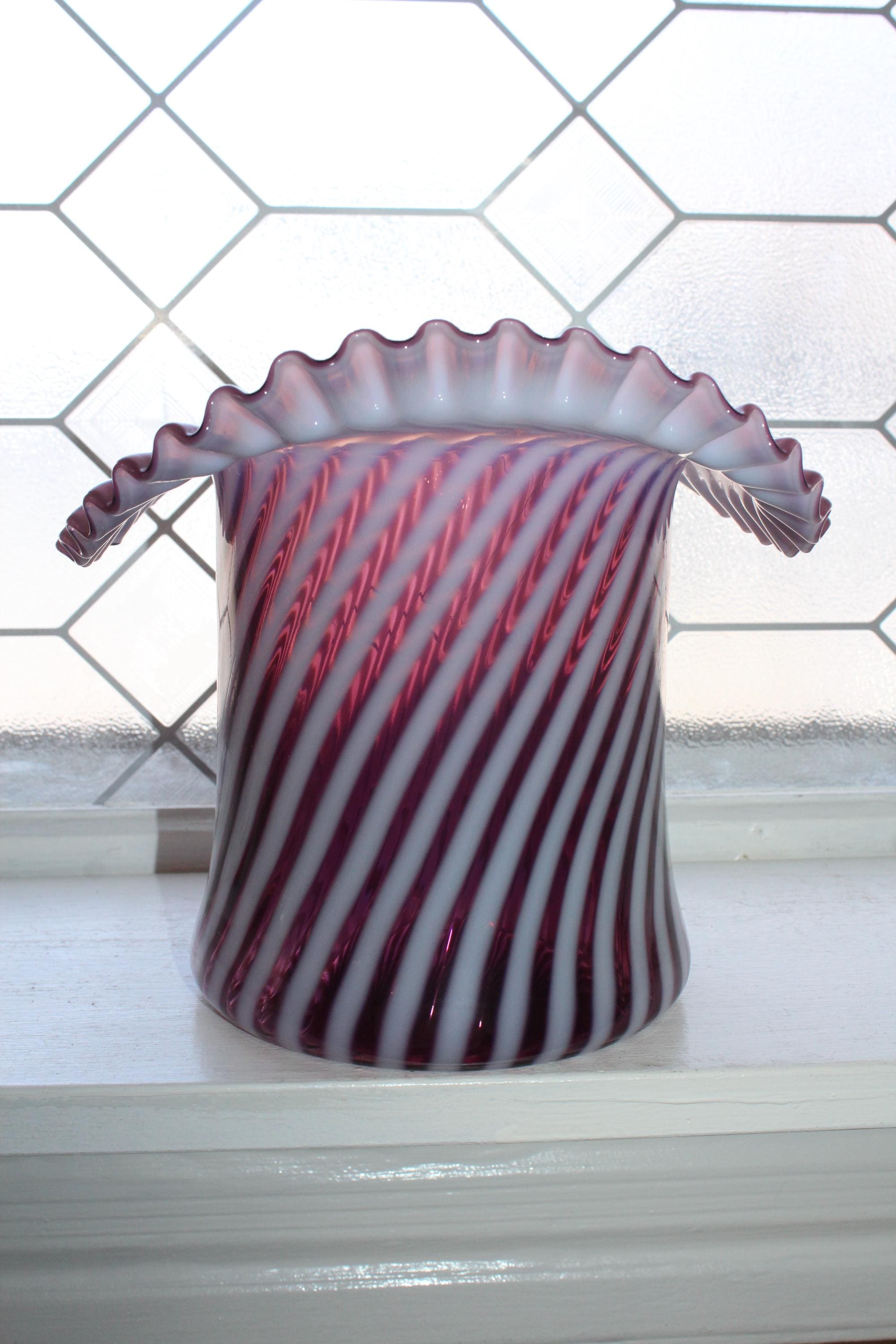 Vintage Fenton glass large plum spiral top hat vase, in excellent condition. The vase measures 7 1/2" high and looks fabulous. No chips or cracks, perfect for use or display. Enjoy!