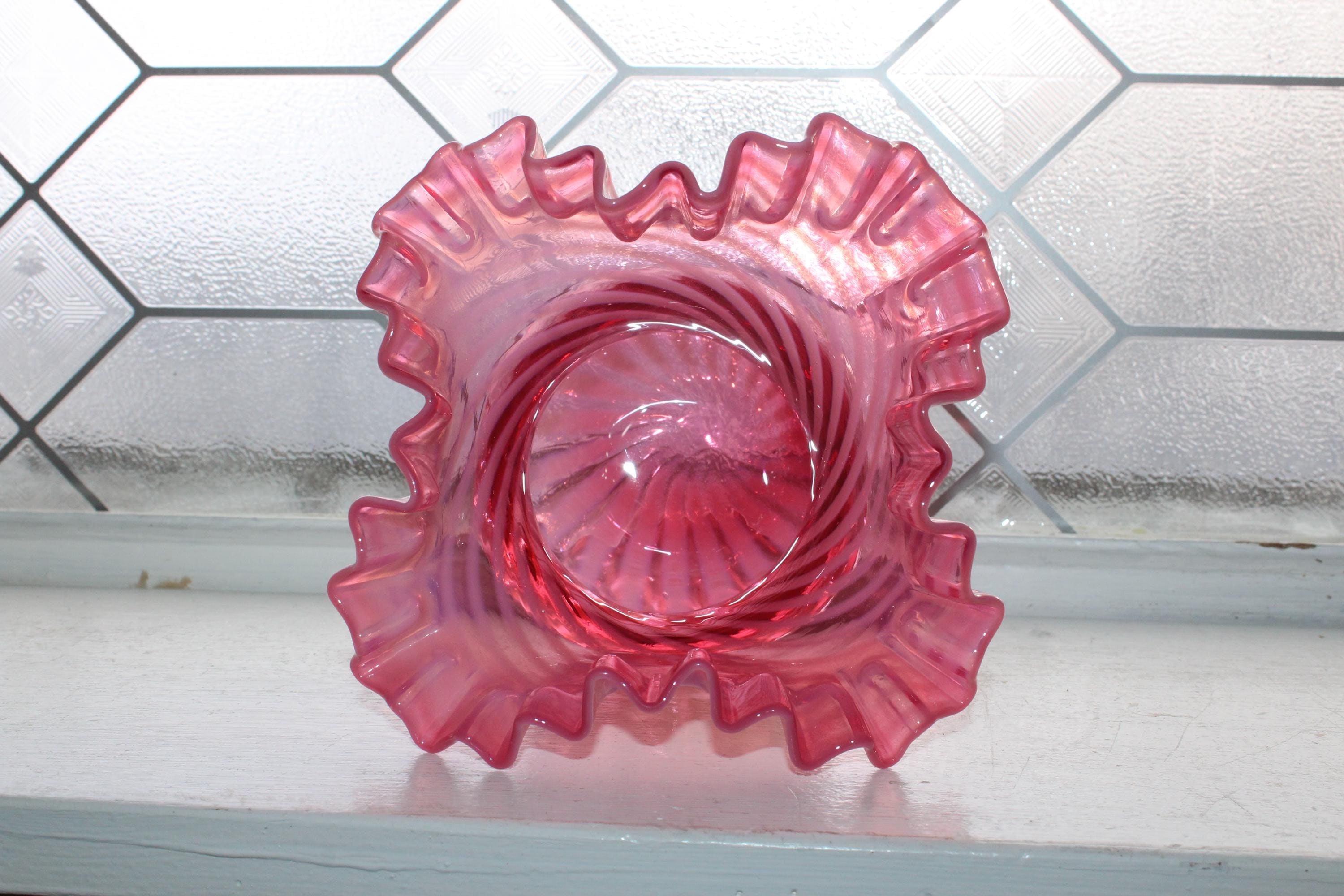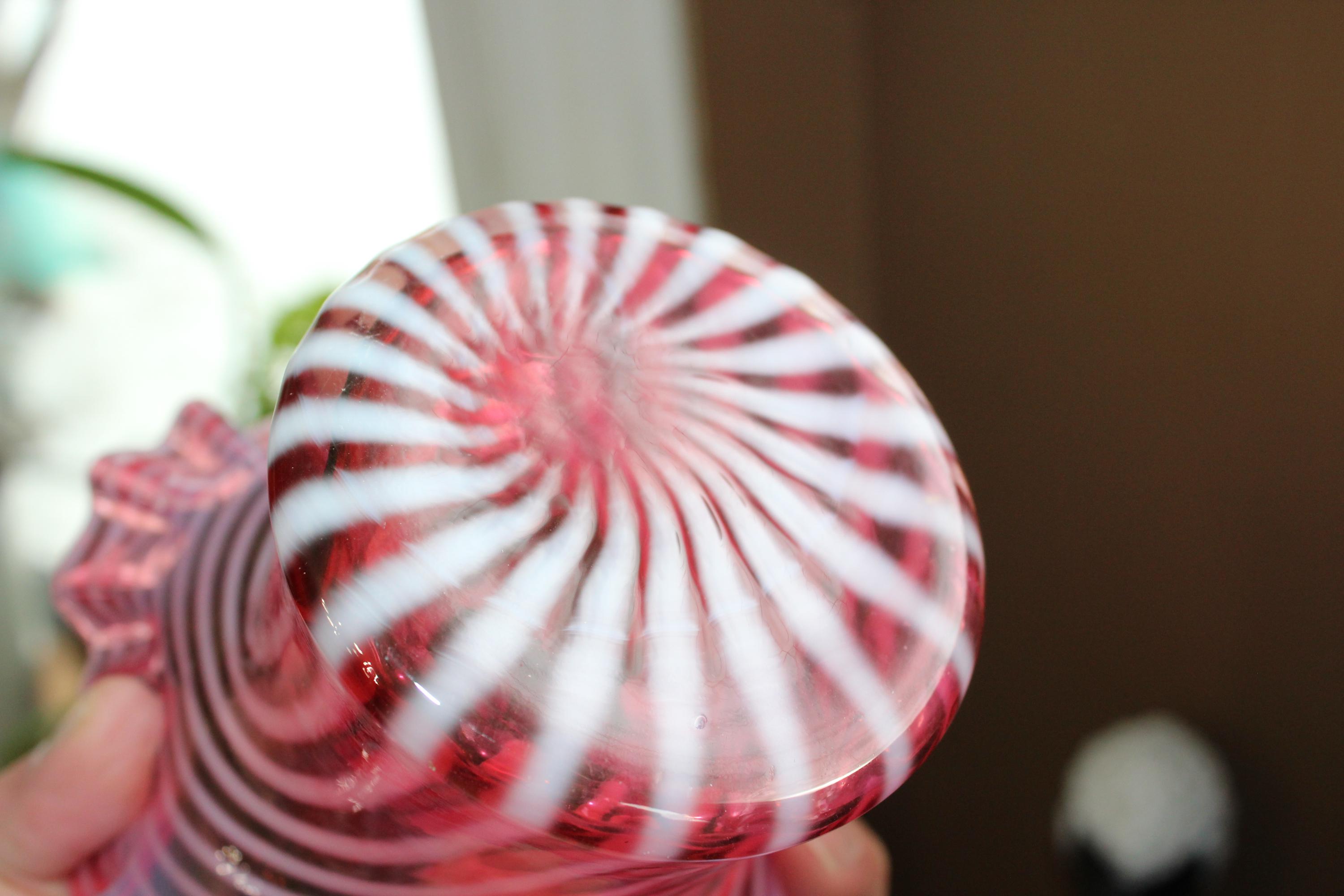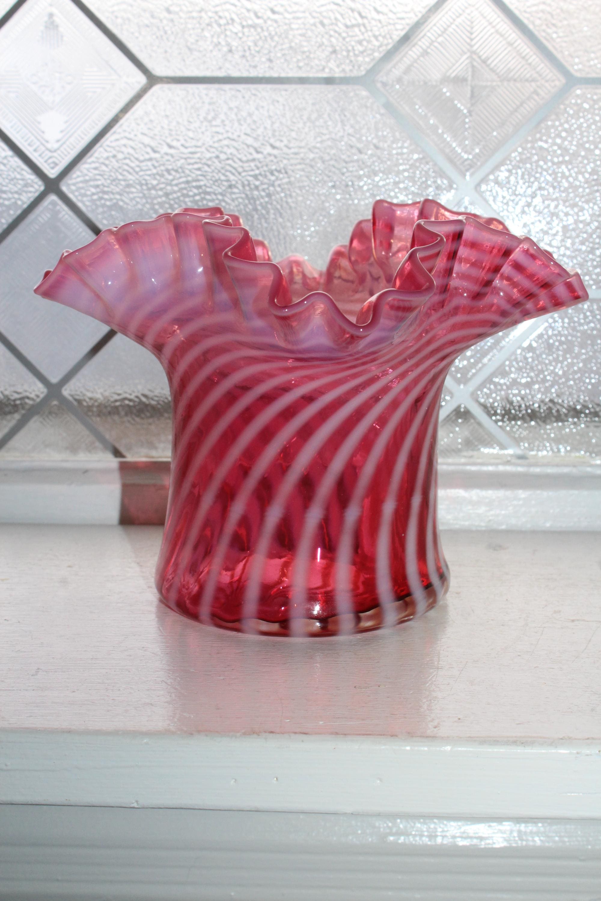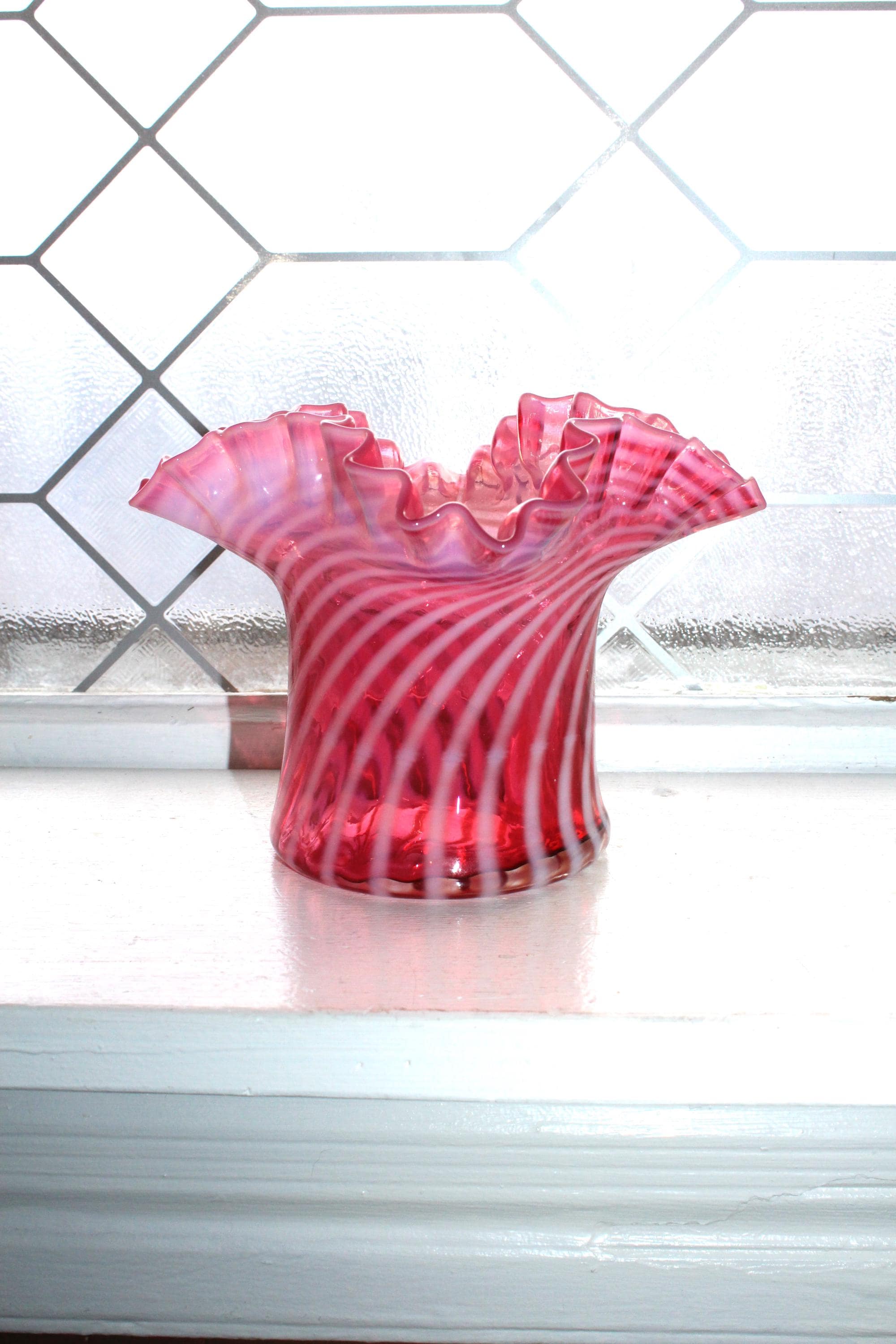 Vintage Fenton glass cranberry opalescent spiral top hat vase, in excellent condition. The vase measures 4 1/2" high x 5 1/2" wide and looks fabulous. No chips or cracks, perfect for use or display. Enjoy!