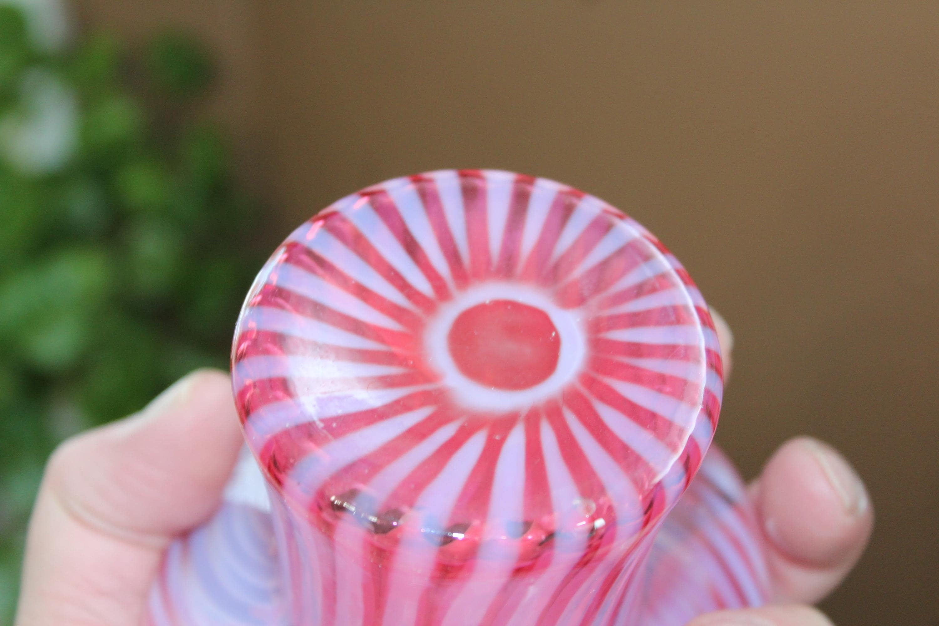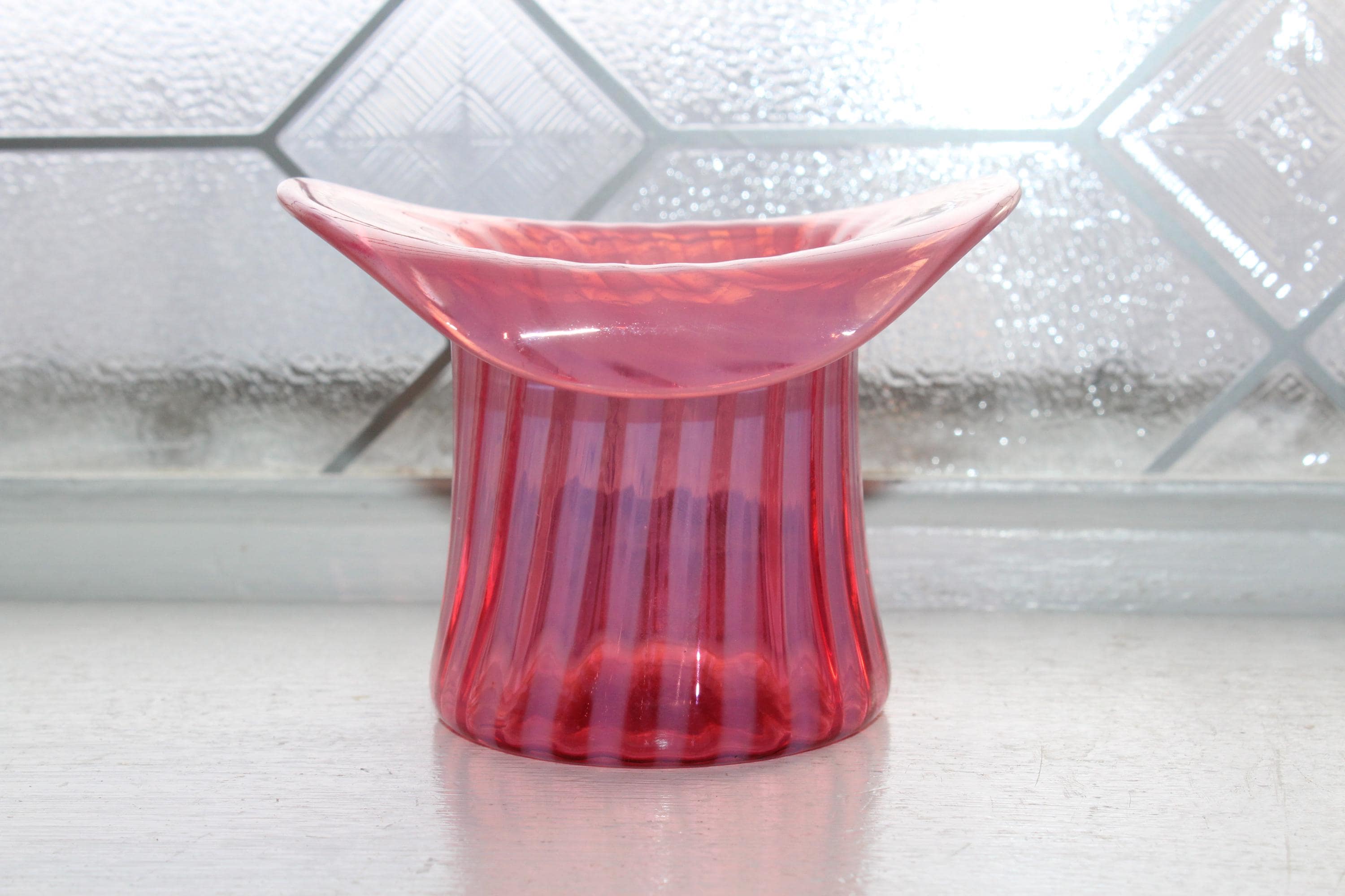 Vintage Fenton glass cranberry opalescent spiral top hat vase, in excellent condition. The vase measures 3 1/8" high x 4 1/4" wide and looks fabulous. No chips or cracks, perfect for use or display. Enjoy!