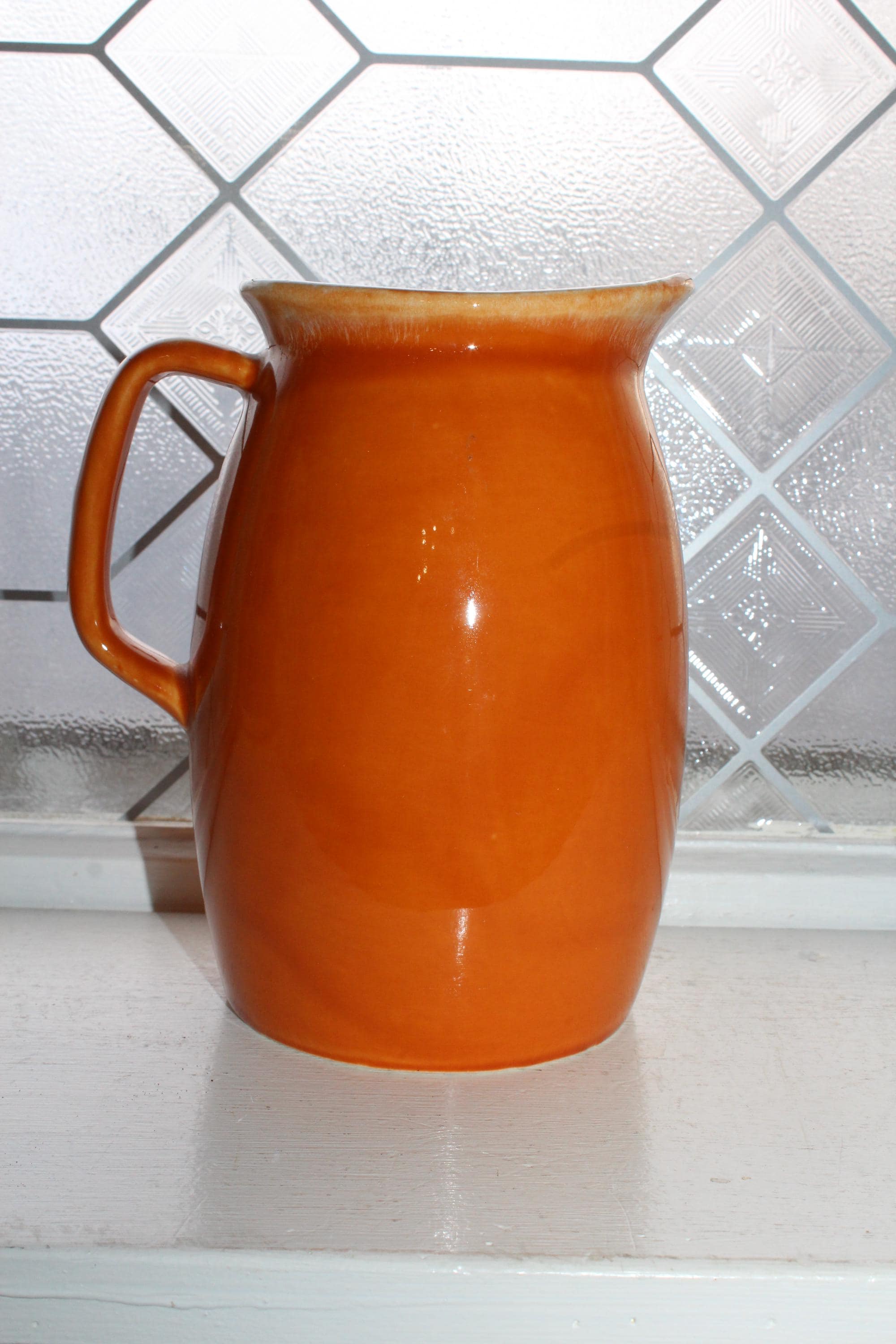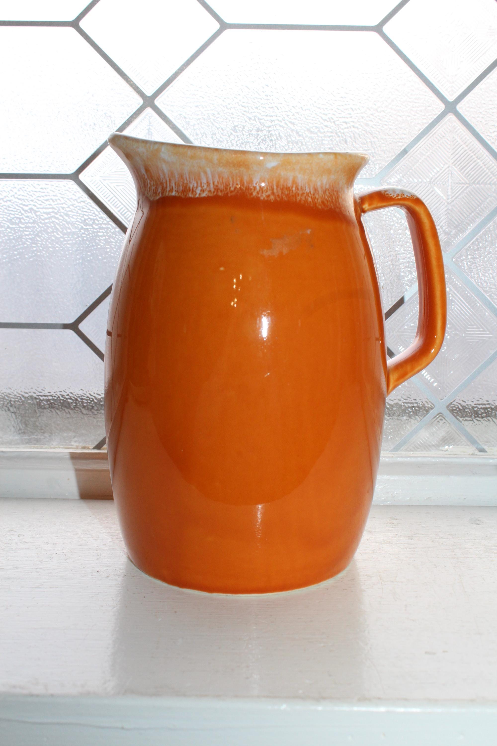 Vintage Hull Oven Proof orange drip pitcher, in excellent condition. The pitcher measures 6 3/4" high. No chips or cracks. Enjoy!