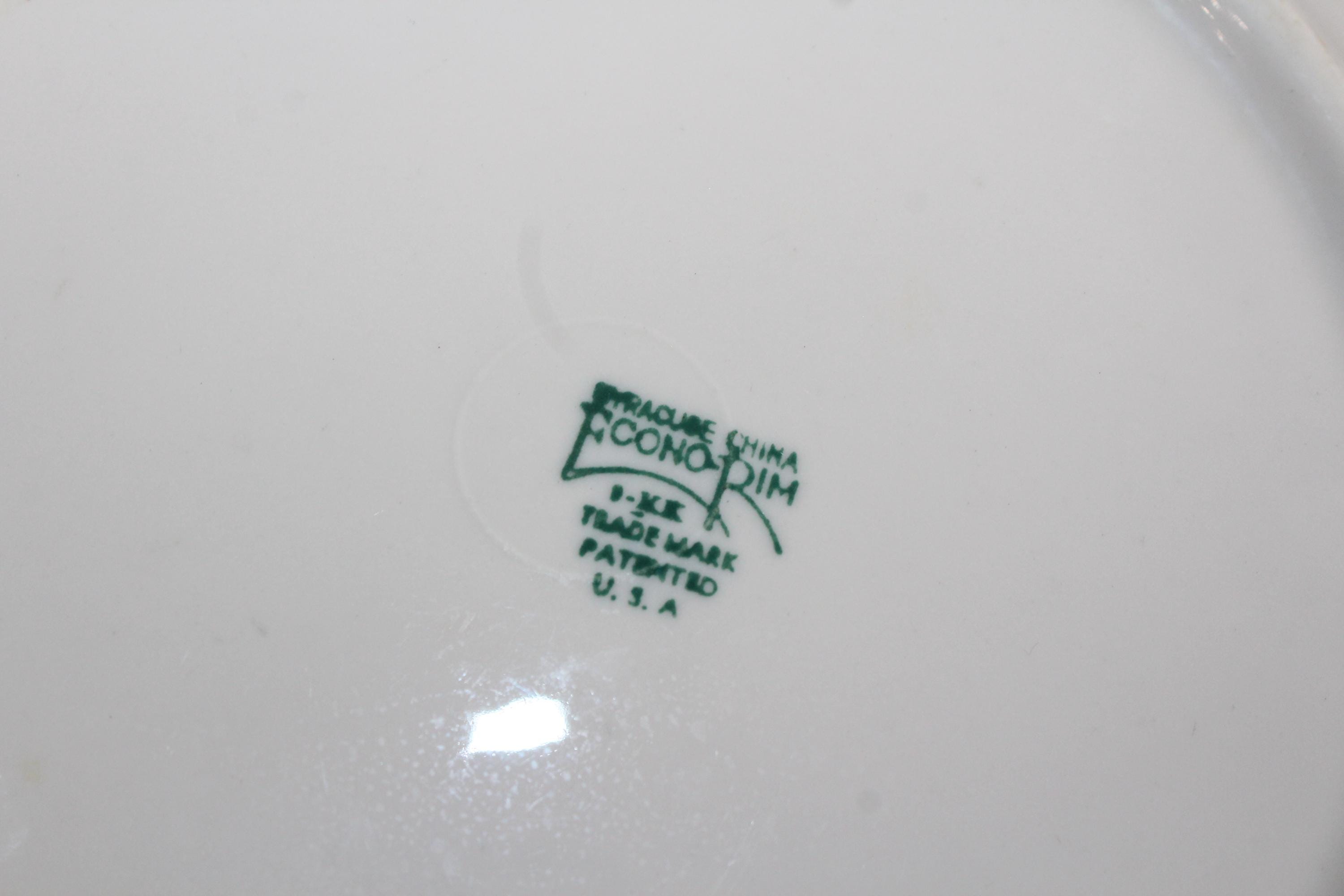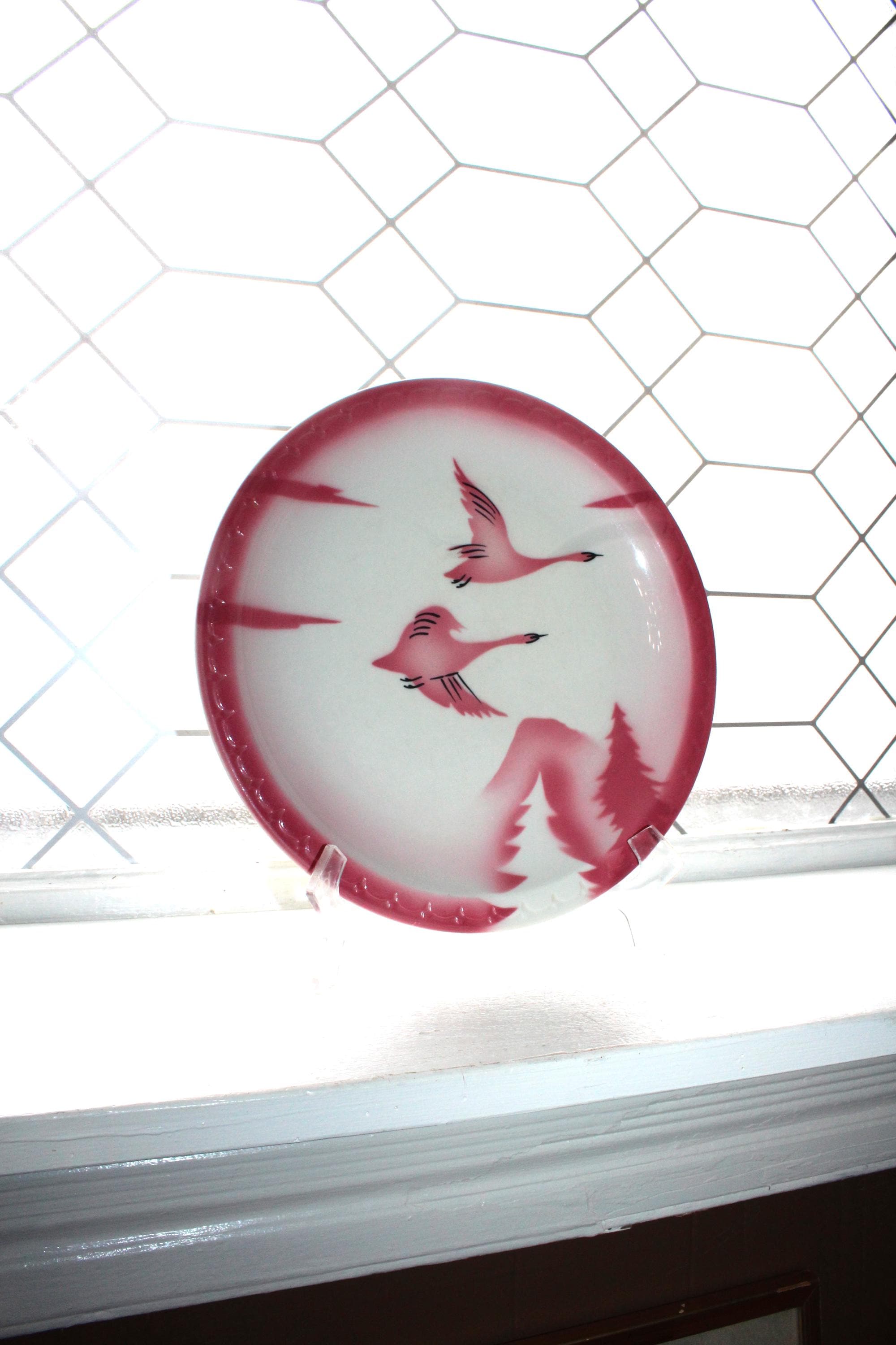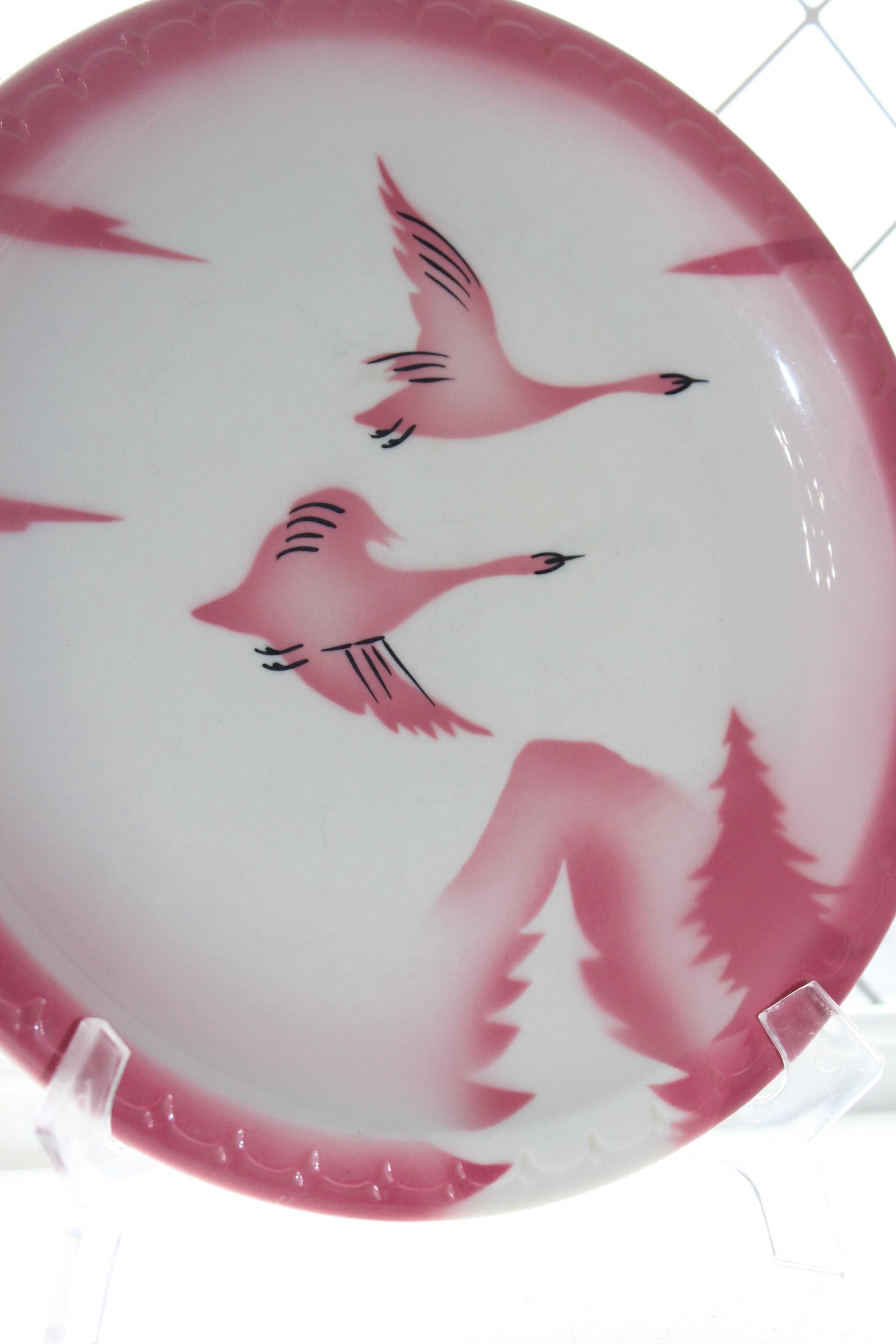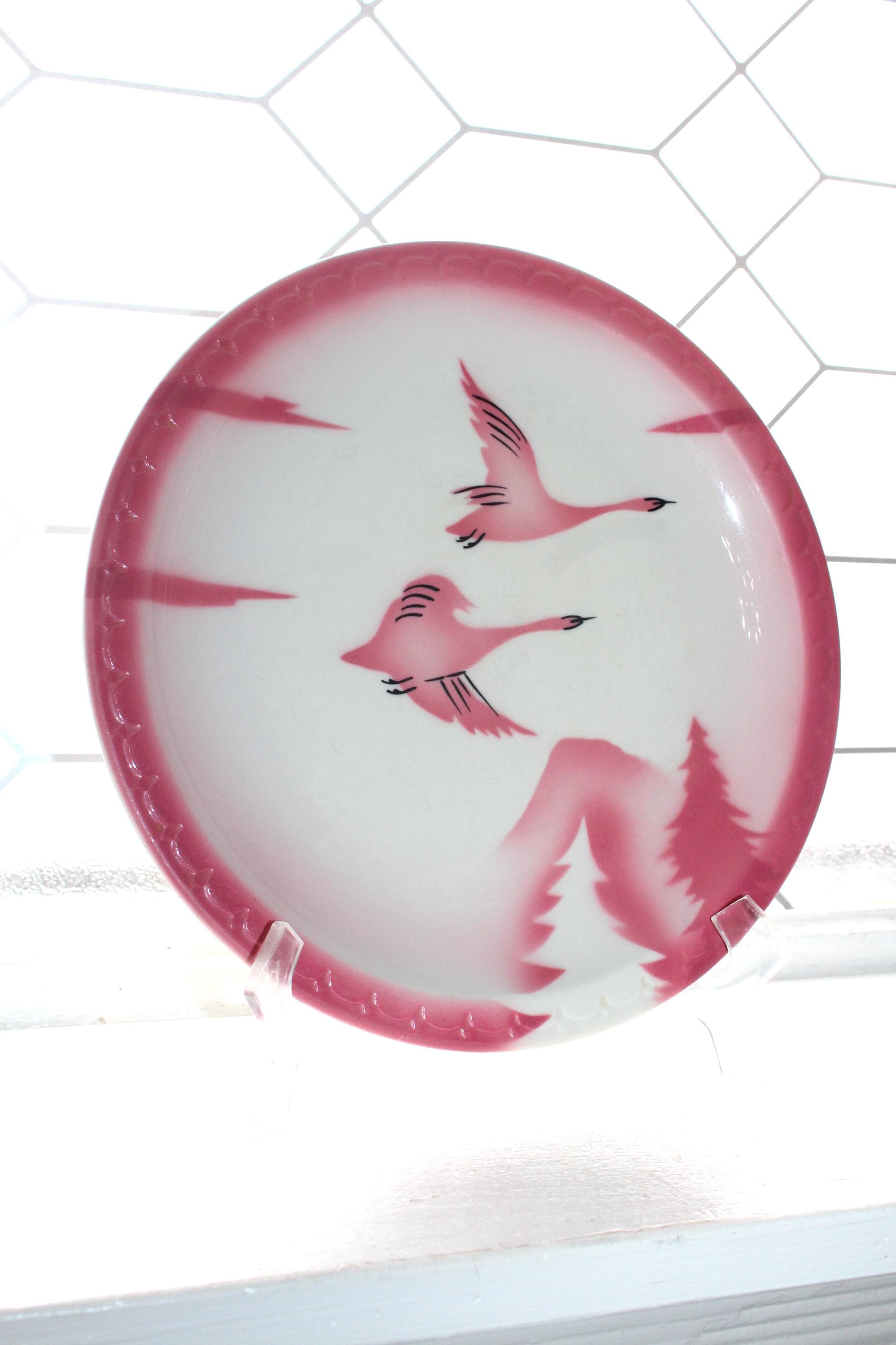 Vintage Syracuse China “The Traveler” restaurant ware dinner plate featuring a flying goose and mountains in pink and white, in good condition. These were made specifically for Milwaukee Road railroad dining cars. It measures 9 1/2" wide, shows age appropriate wear to the finish but no chips or cracks and displays very well. I have several other pieces of this pattern available in my shop. Enjoy!