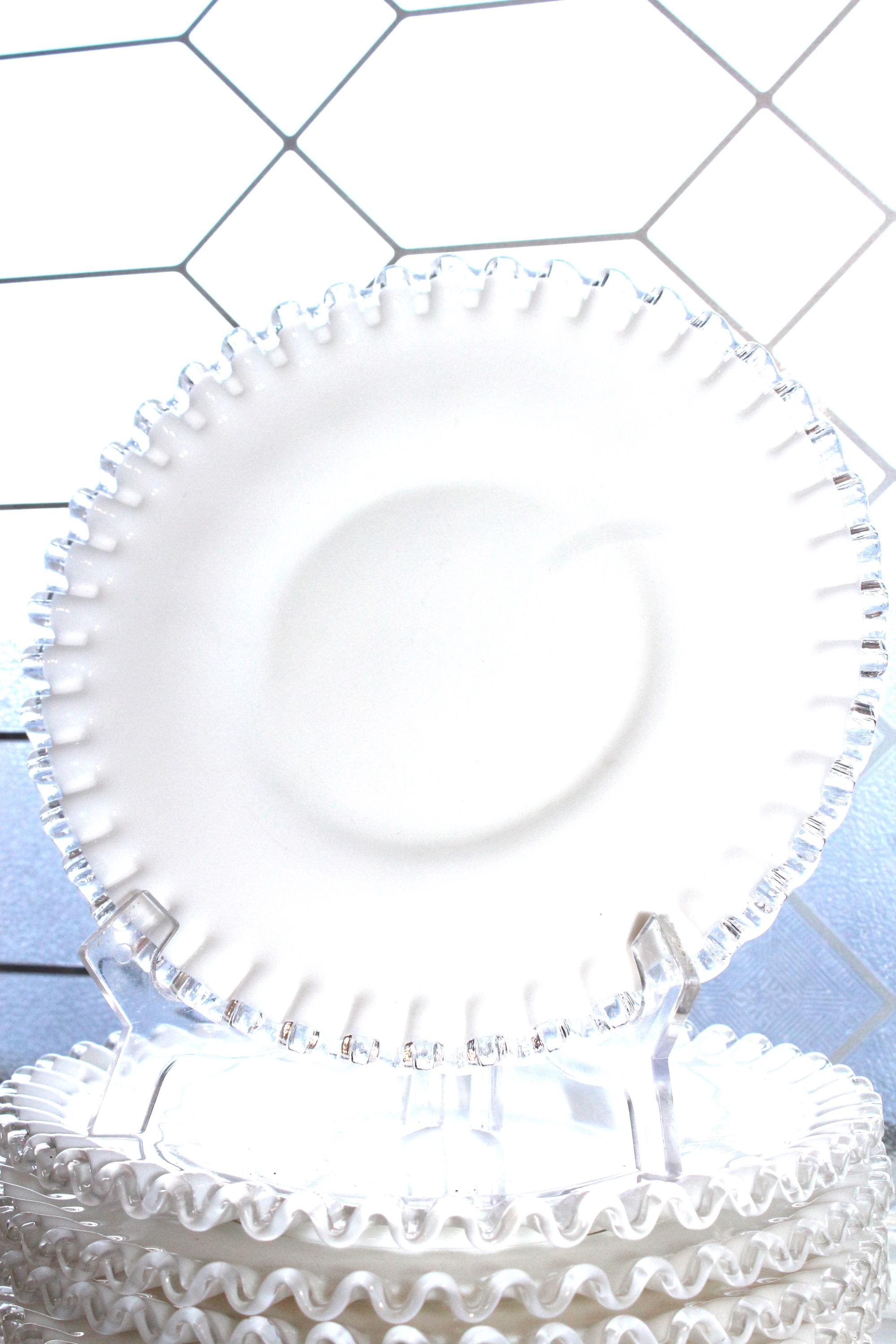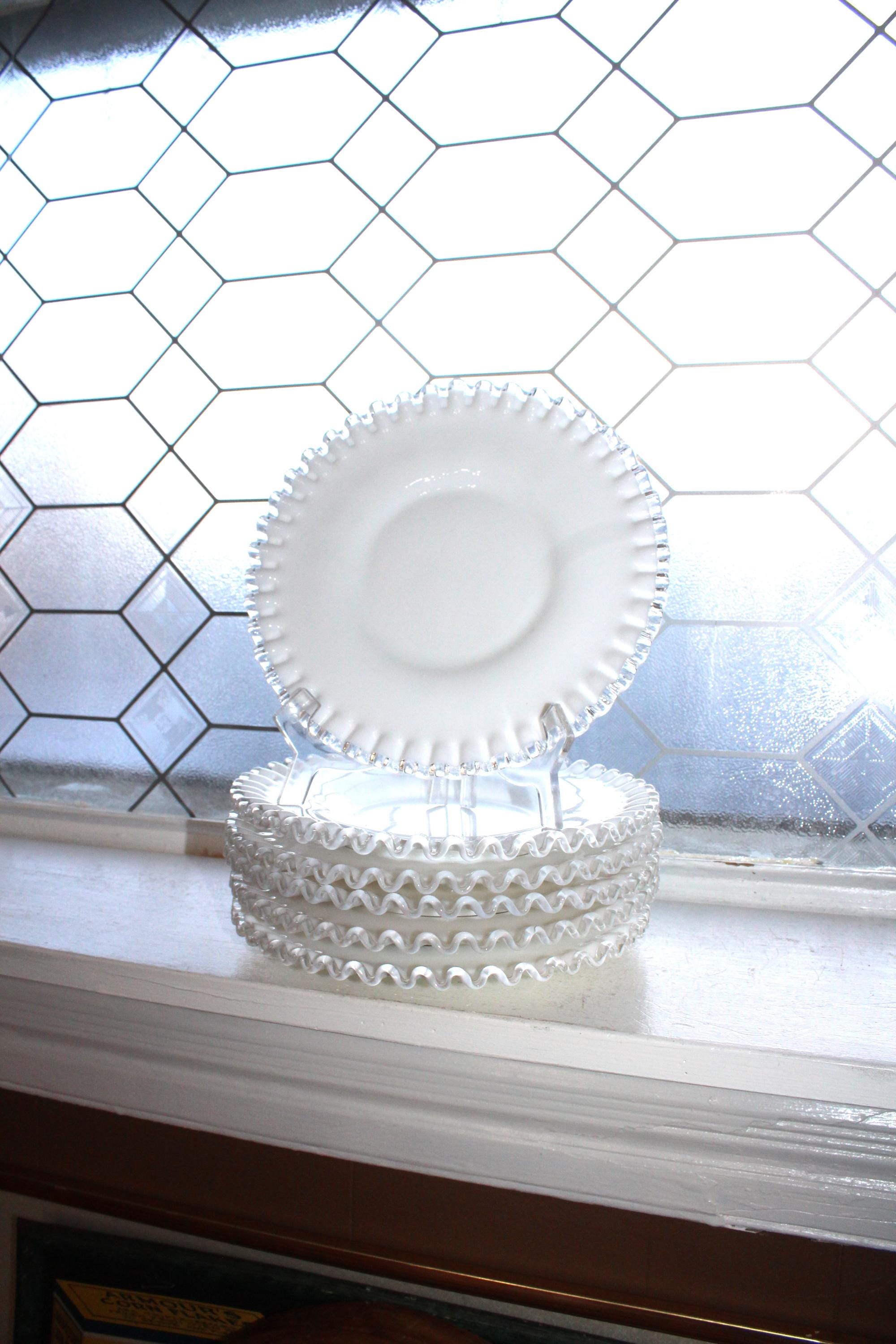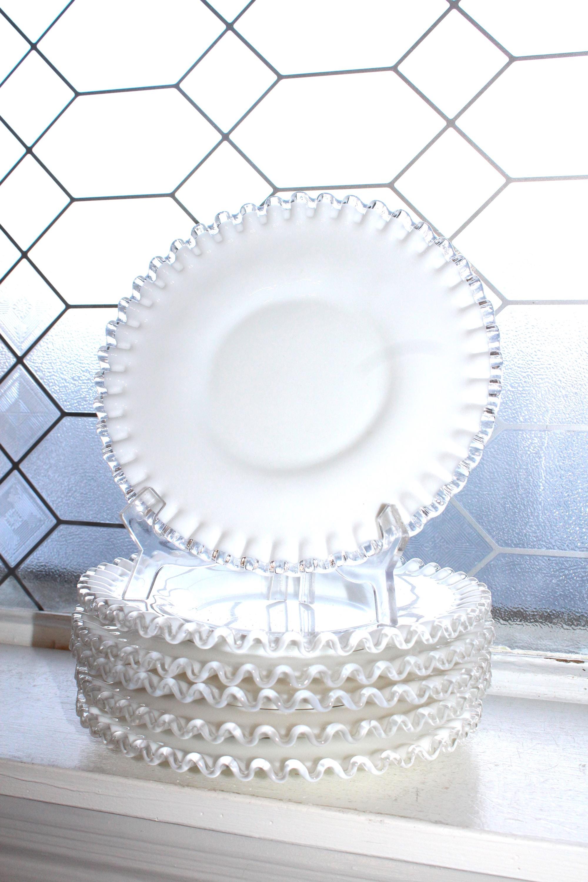 This is a gorgeous set of 6 vintage Fenton Silver Crest milk glass dessert/luncheon/salad plates, in excellent condition. Each one measures 8 1/2" wide. No chips or cracks, perfect for use or display. They feature the typical Silver Crest pattern of a clear glass rim on a milk glass base. Enjoy!