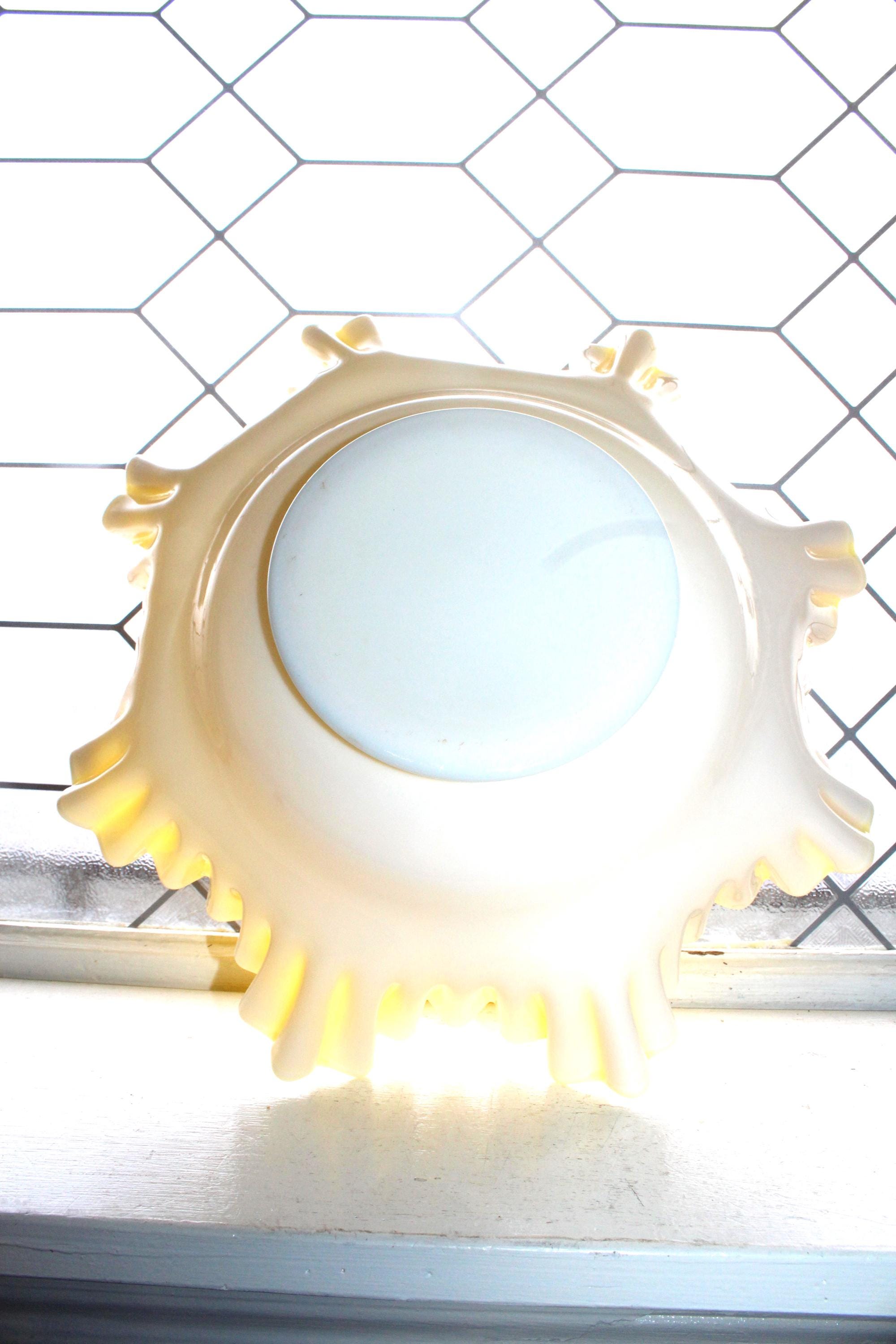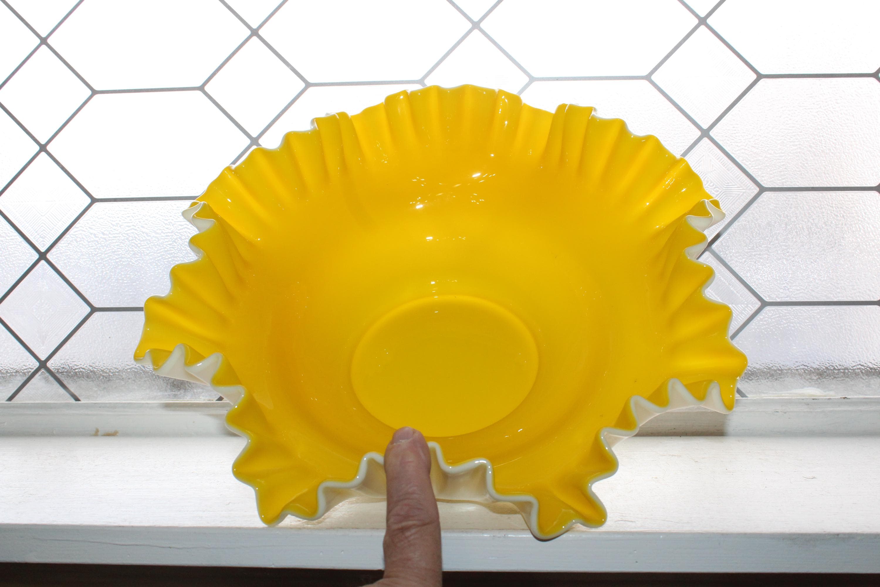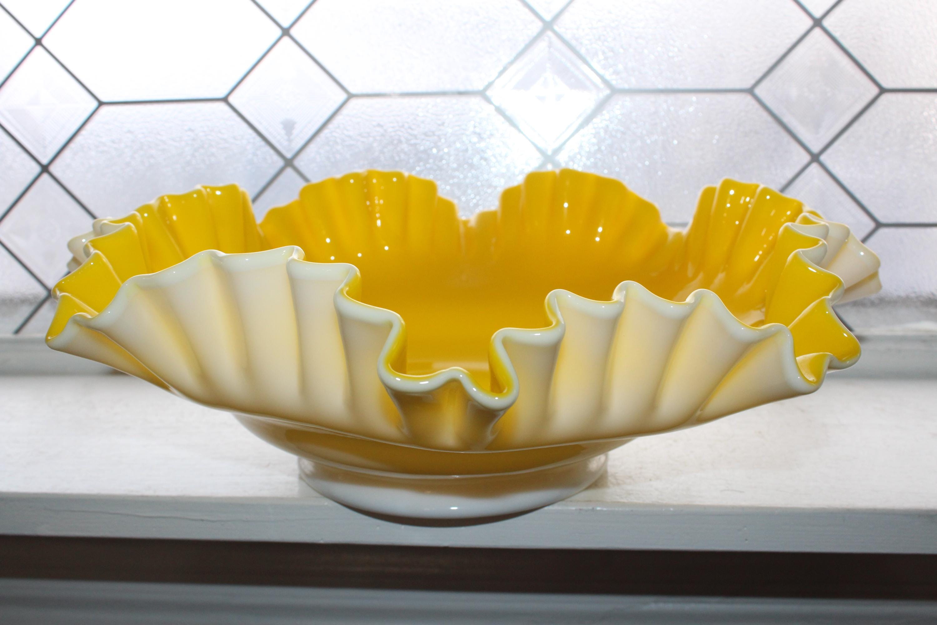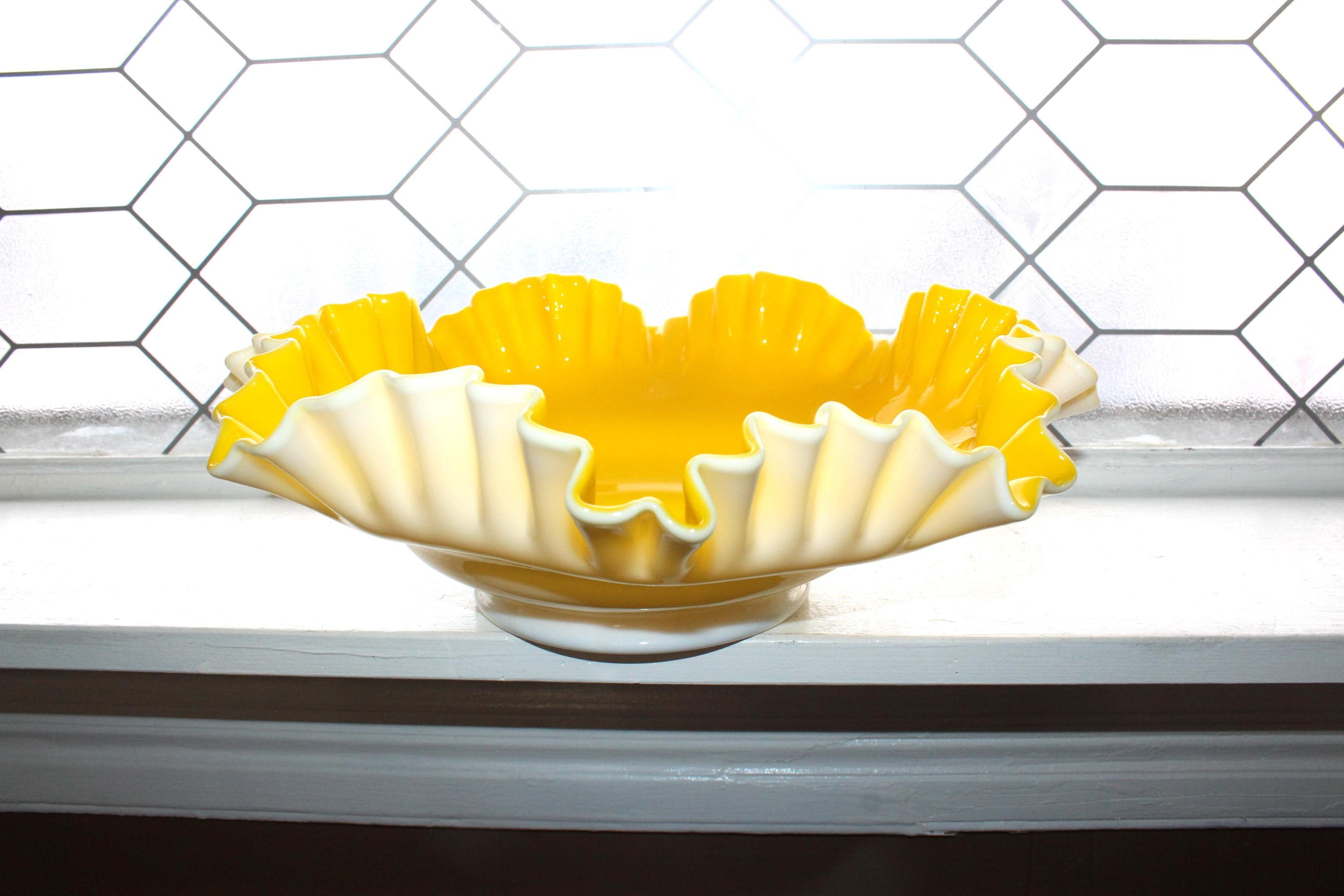 Large vintage Fenton Glass Goldenrod ruffled rim bowl in yellow and white overlay, in excellent condition. The bowl measures 13 1/2" wide x 4 3/4" high. No chips or cracks, perfect for use or display. Enjoy!
