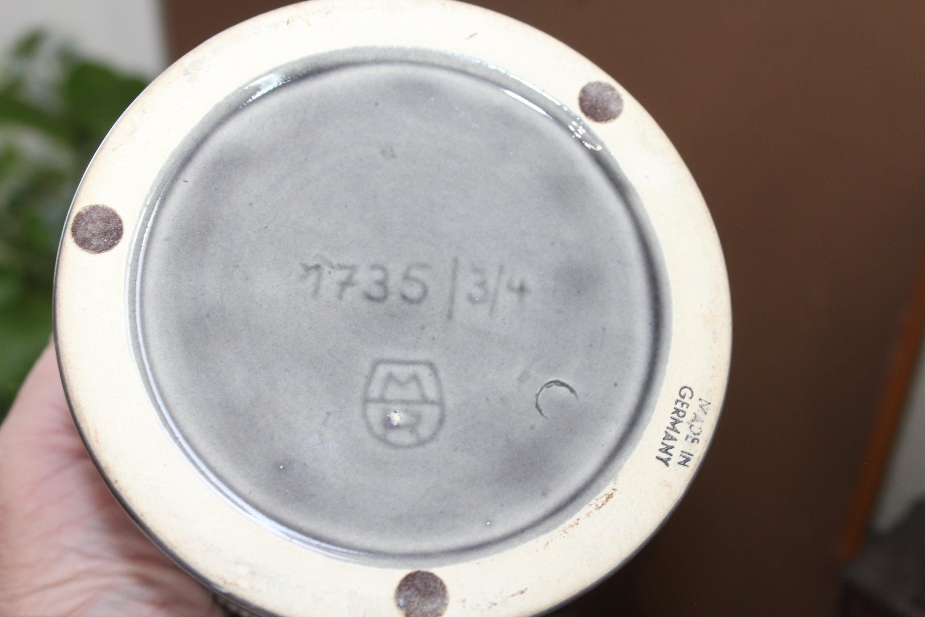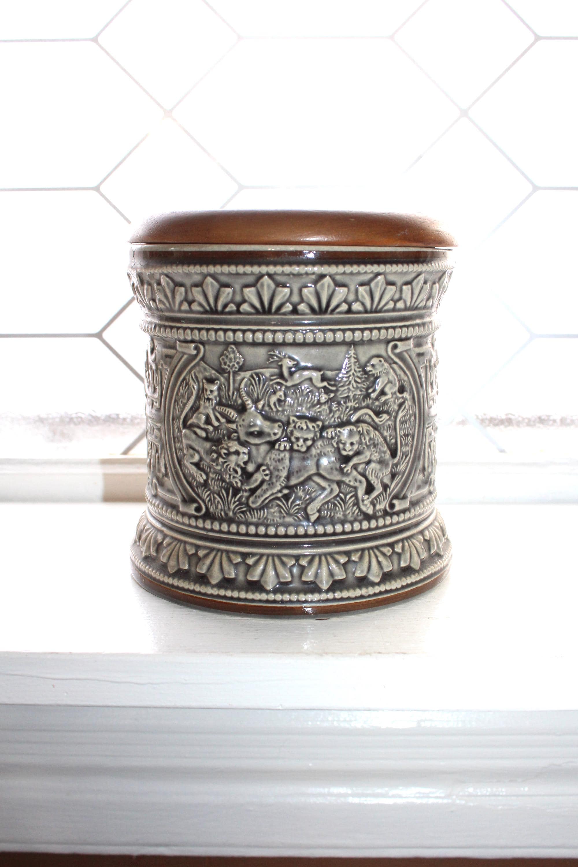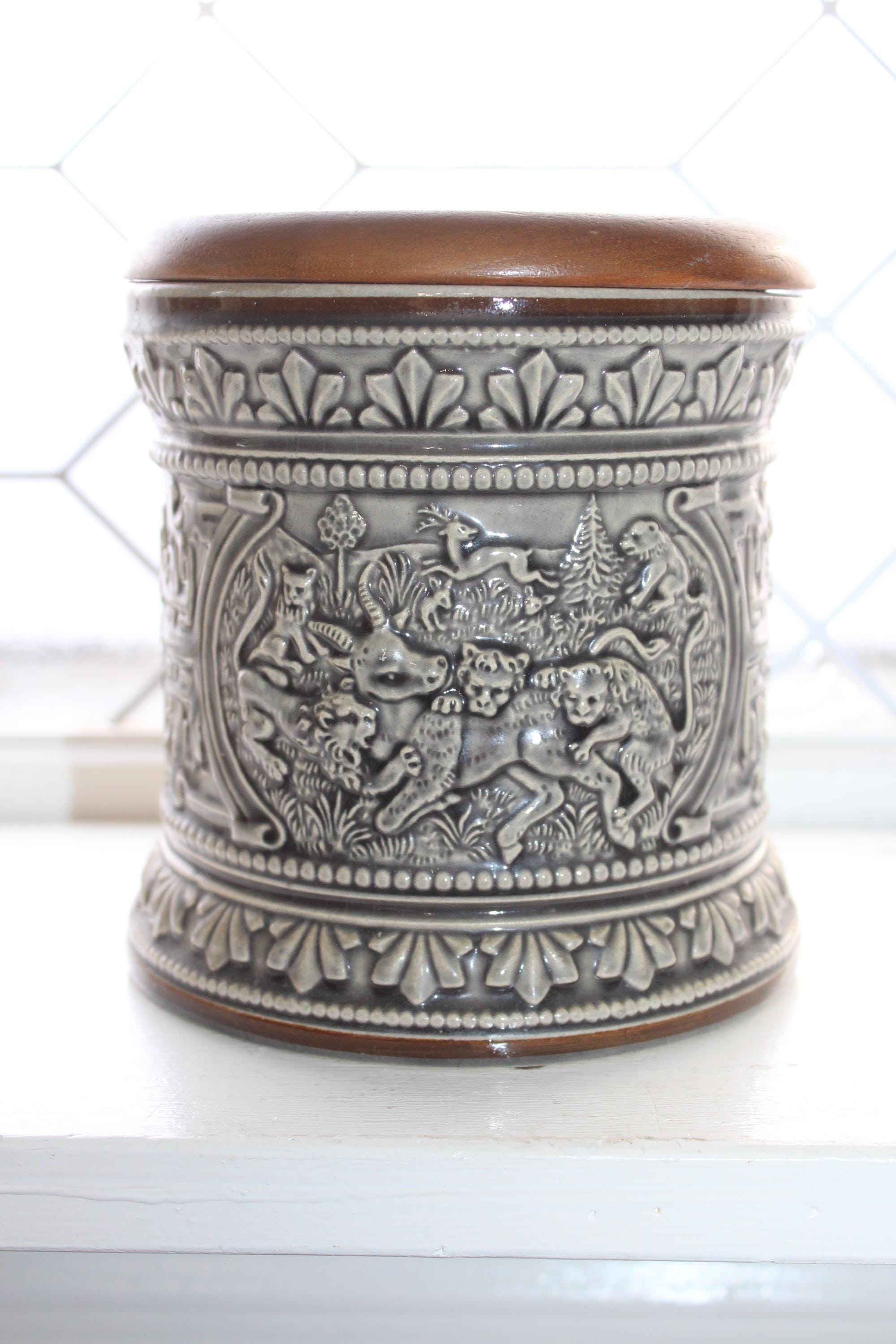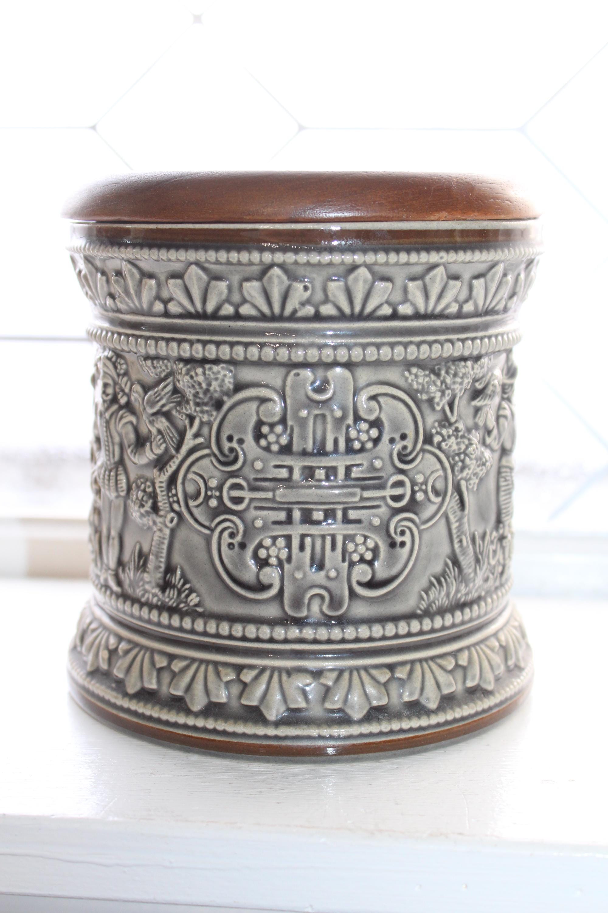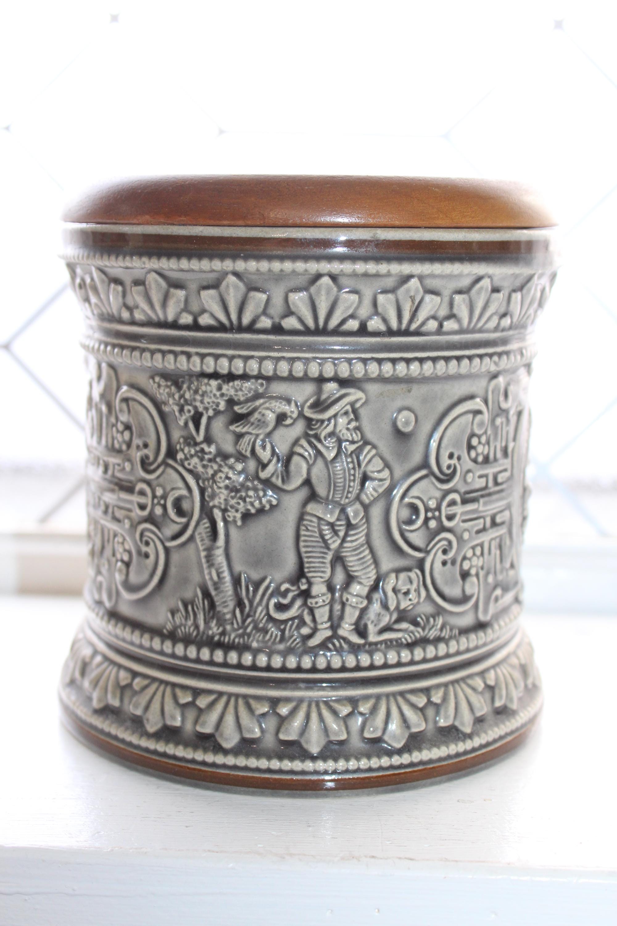 Vintage German Marzi and Remy stoneware tobacco humidor jar with relief molded scenes, model #1735, in excellent condition with the original wood lid. It measures 5 1/4" high x 5" wide and has no chips or cracks, perfect for display. Enjoy!